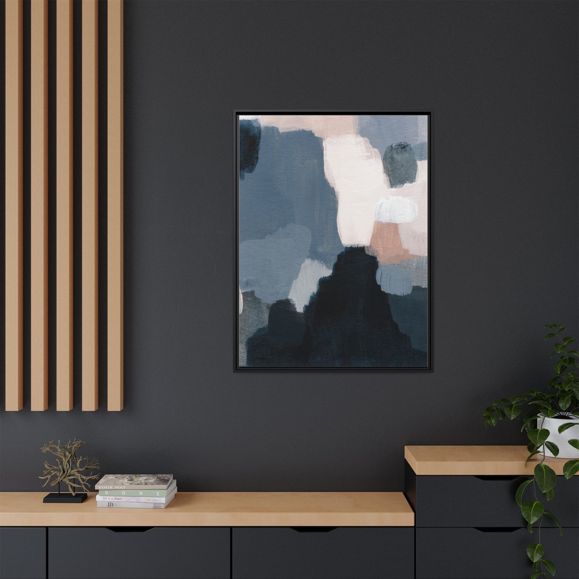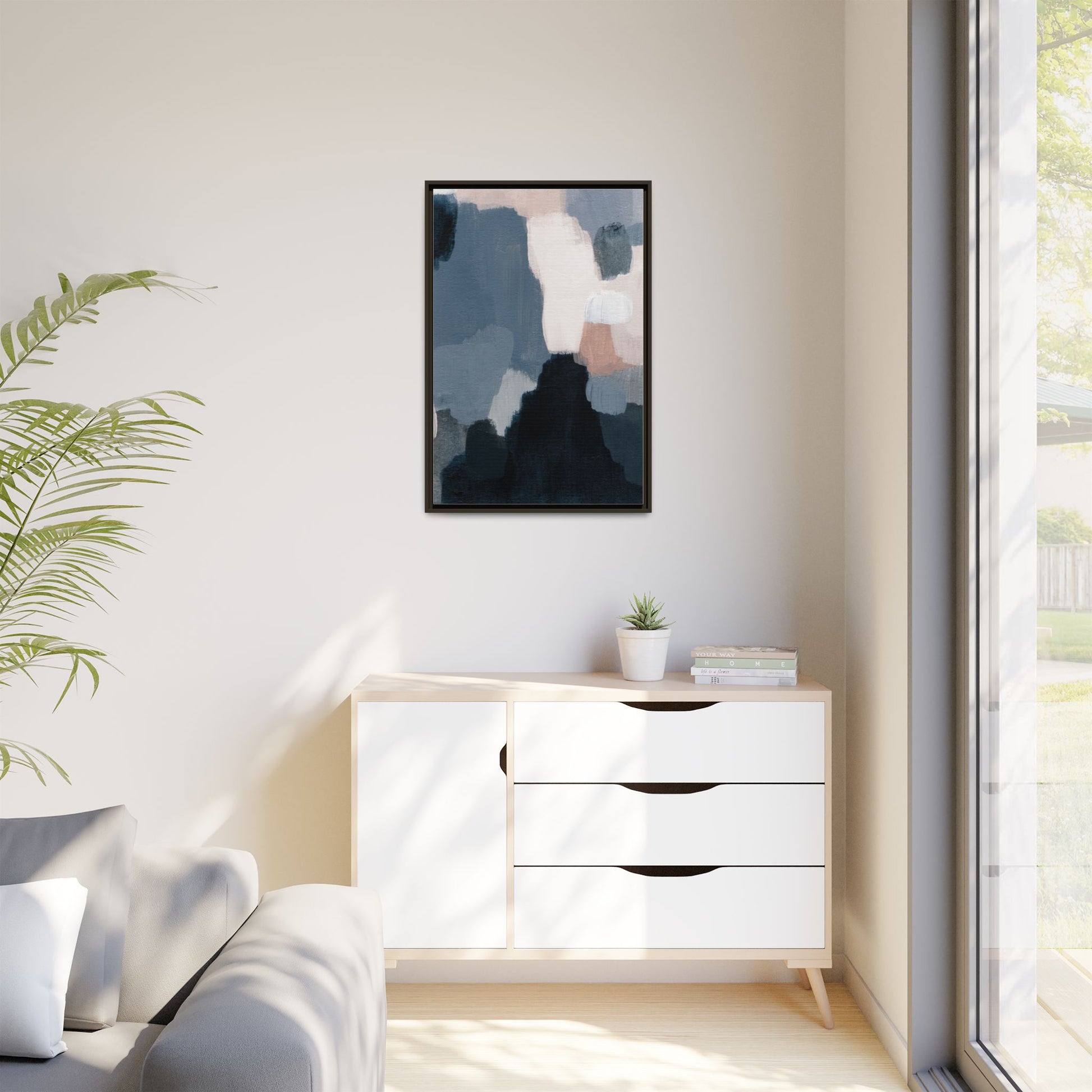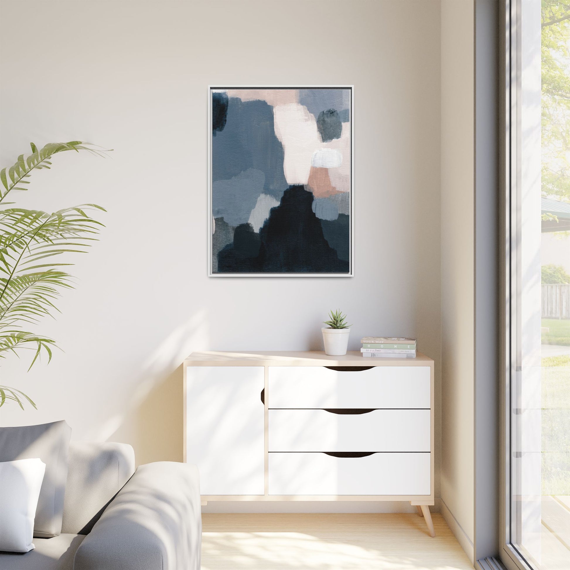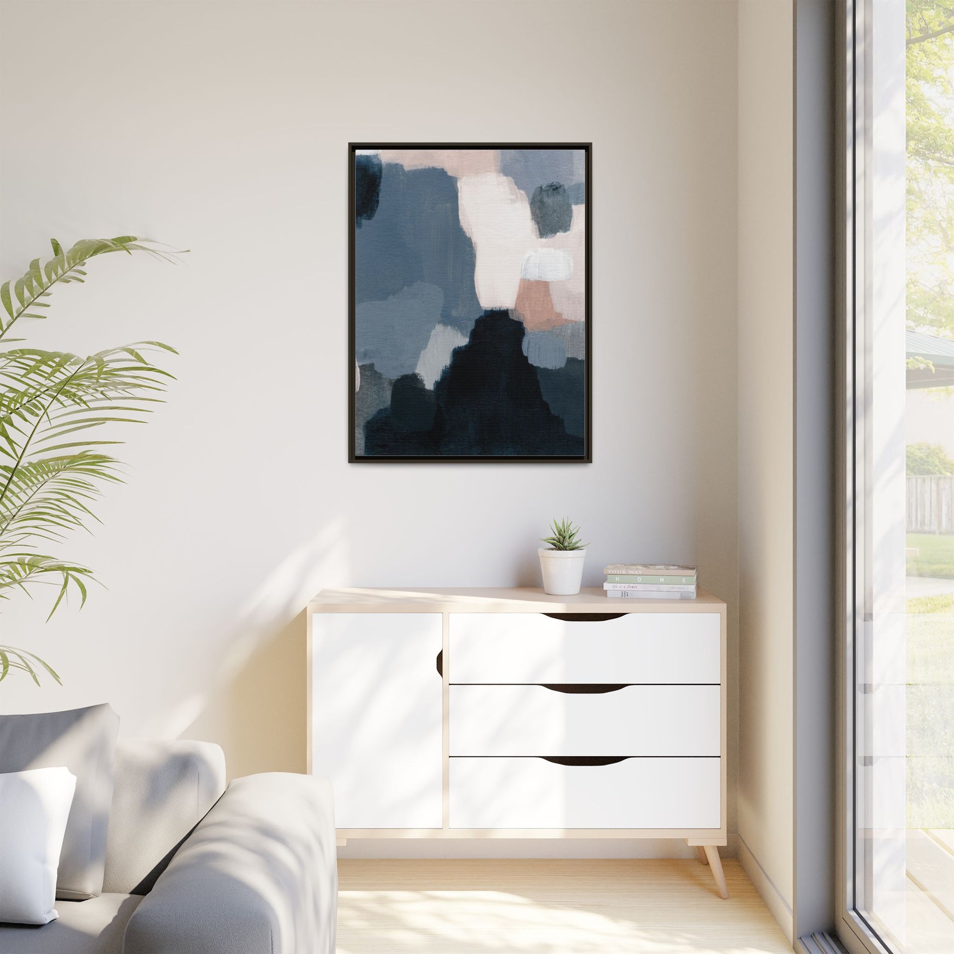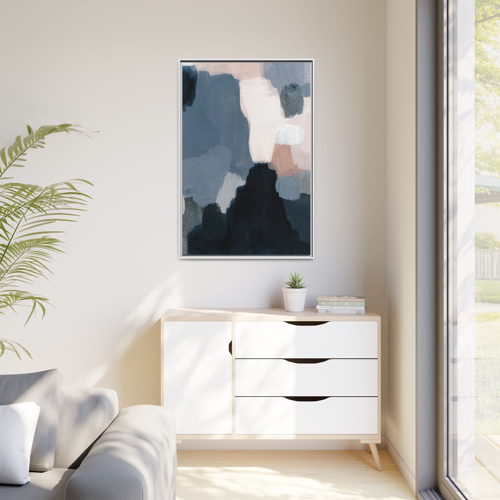 This abstract painting features a serene color palette of deep navy blues, soft grays, muted blush tones, and crisp white hues. The artwork appears to be created with acrylic or watercolor, showcasing loose, layered brushstrokes that create organic, overlapping shapes and forms. Textural brushwork gives the piece a sense of depth and movement, with each color block blending softly into the next, creating a contemplative and balanced composition. The image evokes a sense of landscape or atmospheric elements, with the colors and shapes suggestive of clouds, horizons, or geological formations. The painting's style is minimalist and contemporary, utilizing a restrained color scheme to create a sense of calm and visual harmony.
