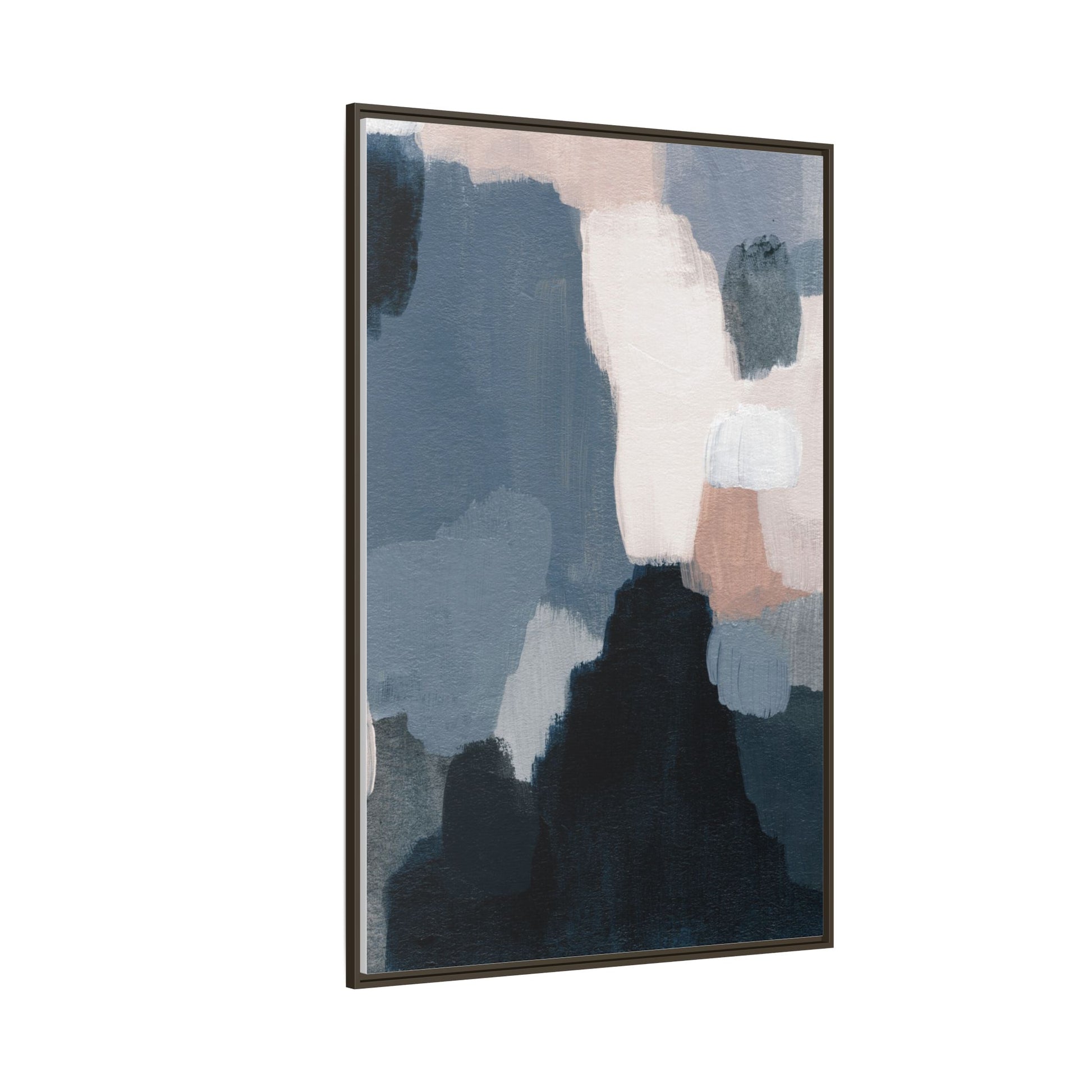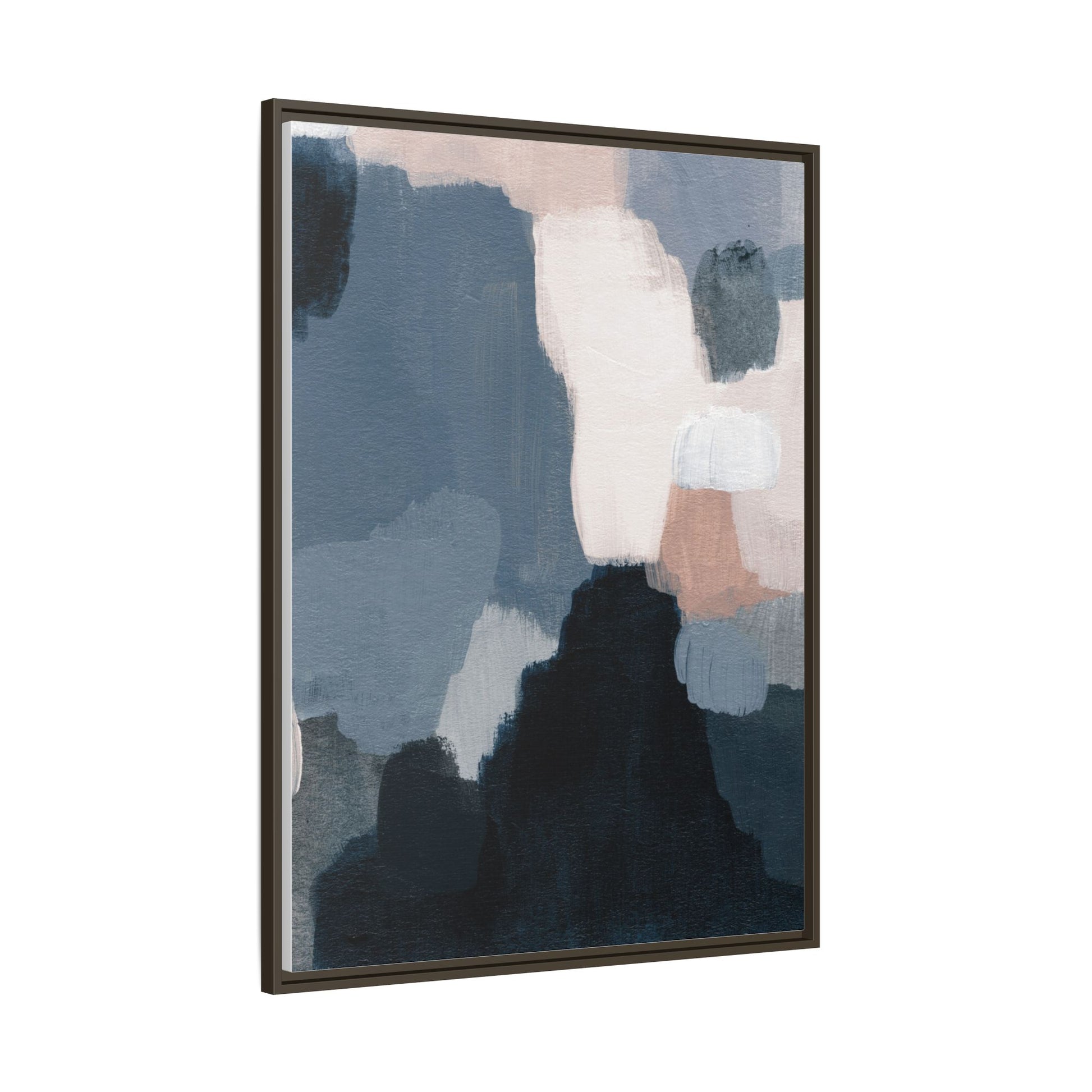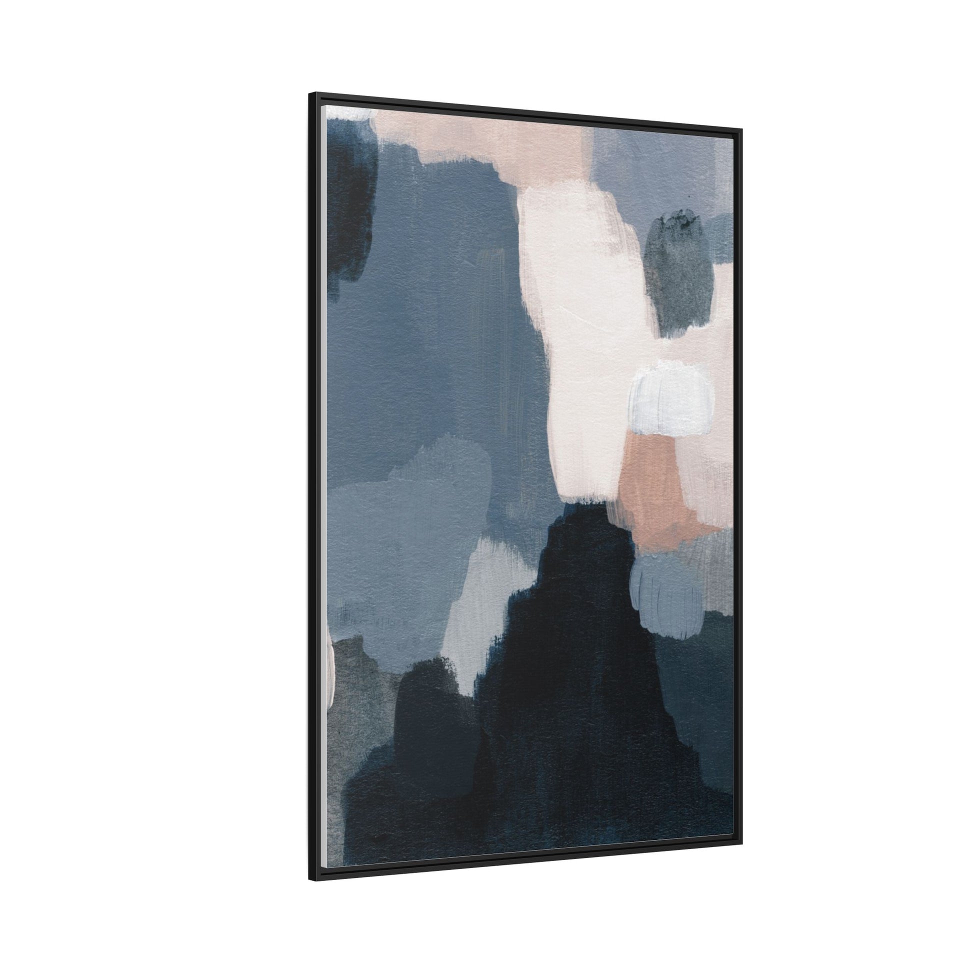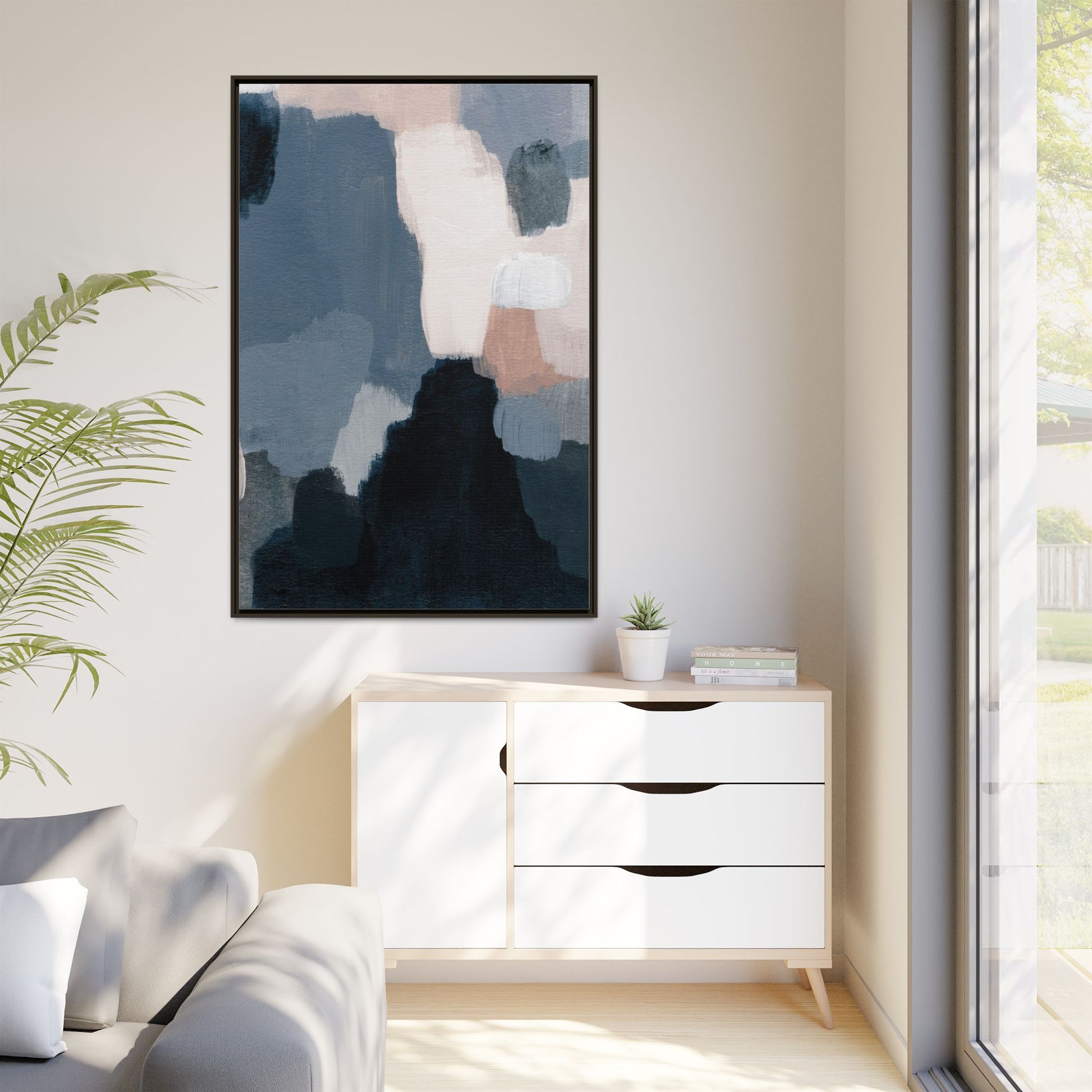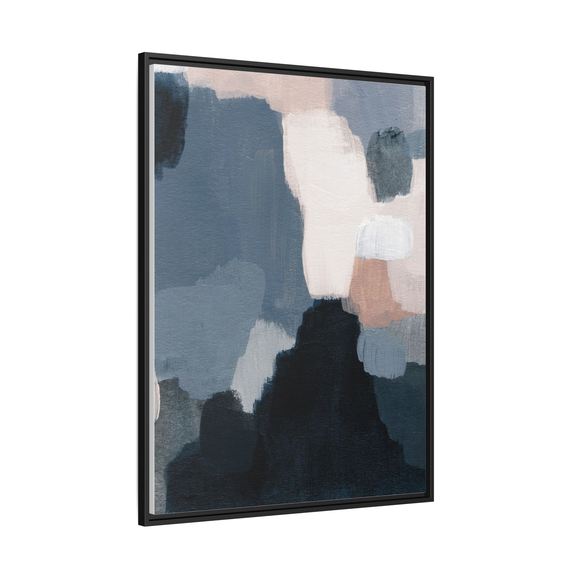 This abstract painting features a serene color palette of deep navy blues, soft grays, muted blush tones, and crisp white hues. The artwork appears to be created with acrylic or watercolor, showcasing loose, layered brushstrokes that create organic, overlapping shapes and forms. Textural brushwork gives the piece a sense of depth and movement, with each color block blending softly into the next, creating a contemplative and balanced composition. The image evokes a sense of landscape or atmospheric elements, with the colors and shapes suggestive of clouds, horizons, or geological formations. The painting's style is minimalist and contemporary, utilizing a restrained color scheme to create a sense of calm and visual harmony.