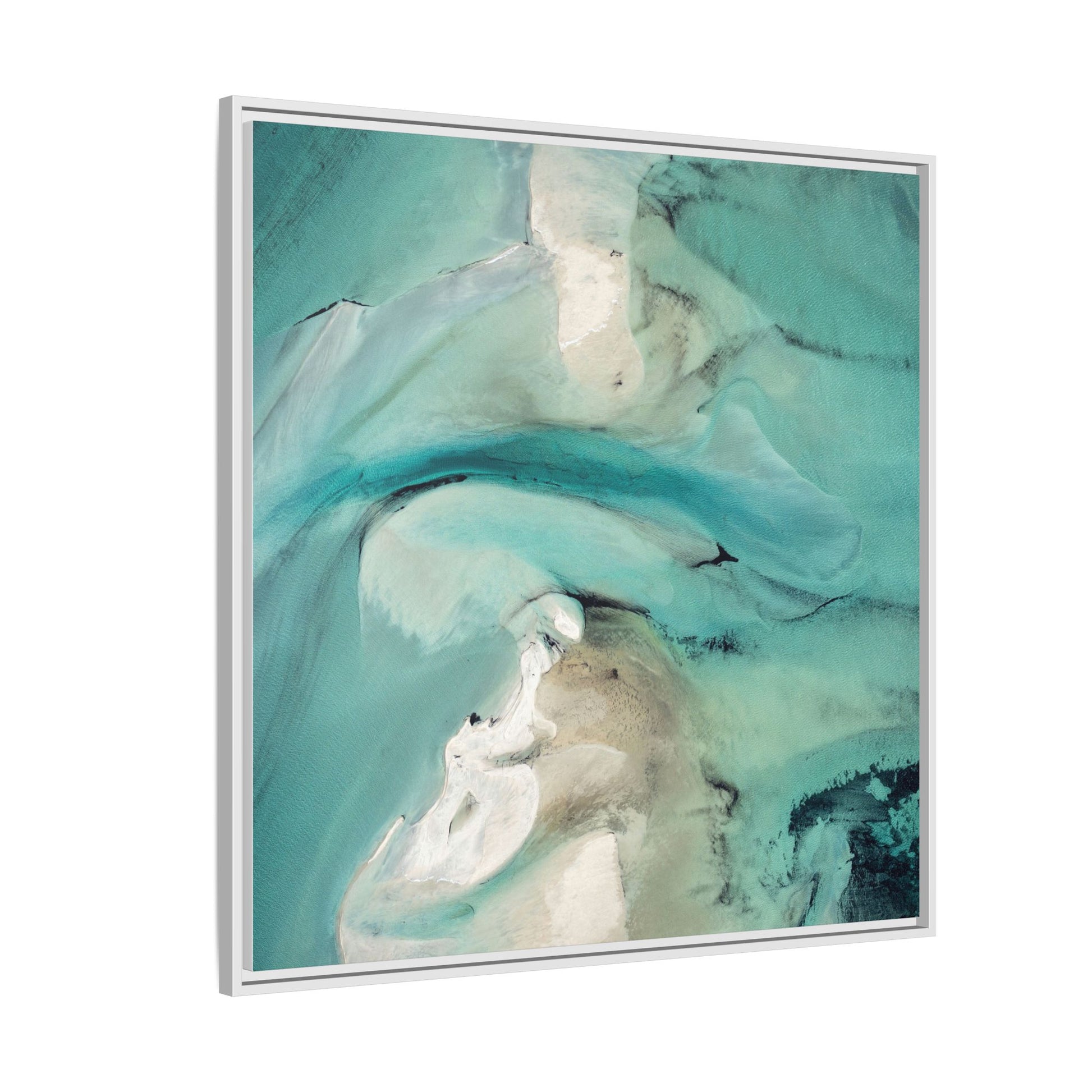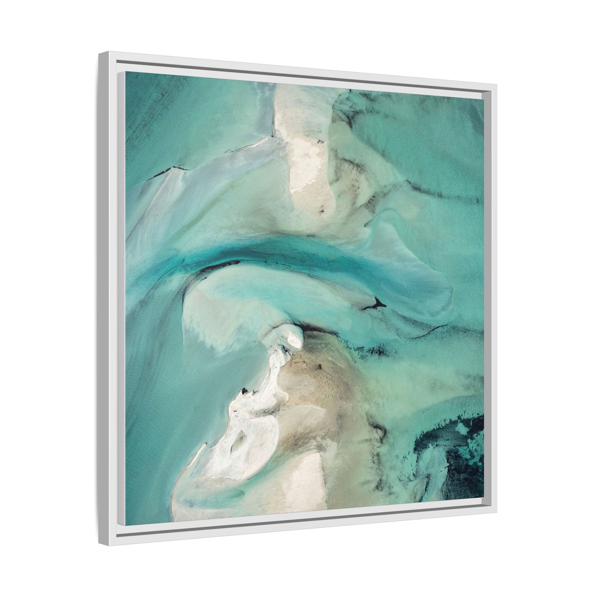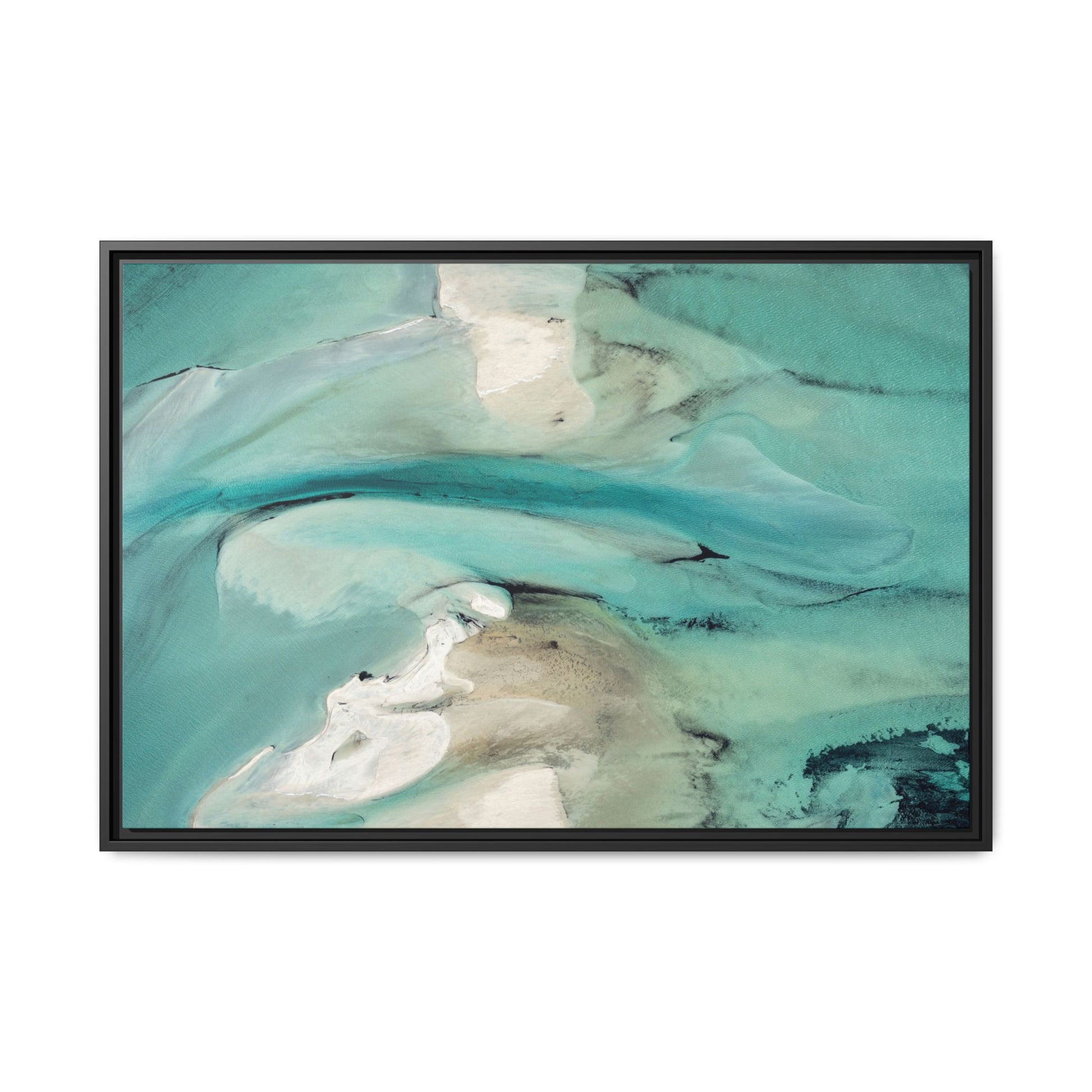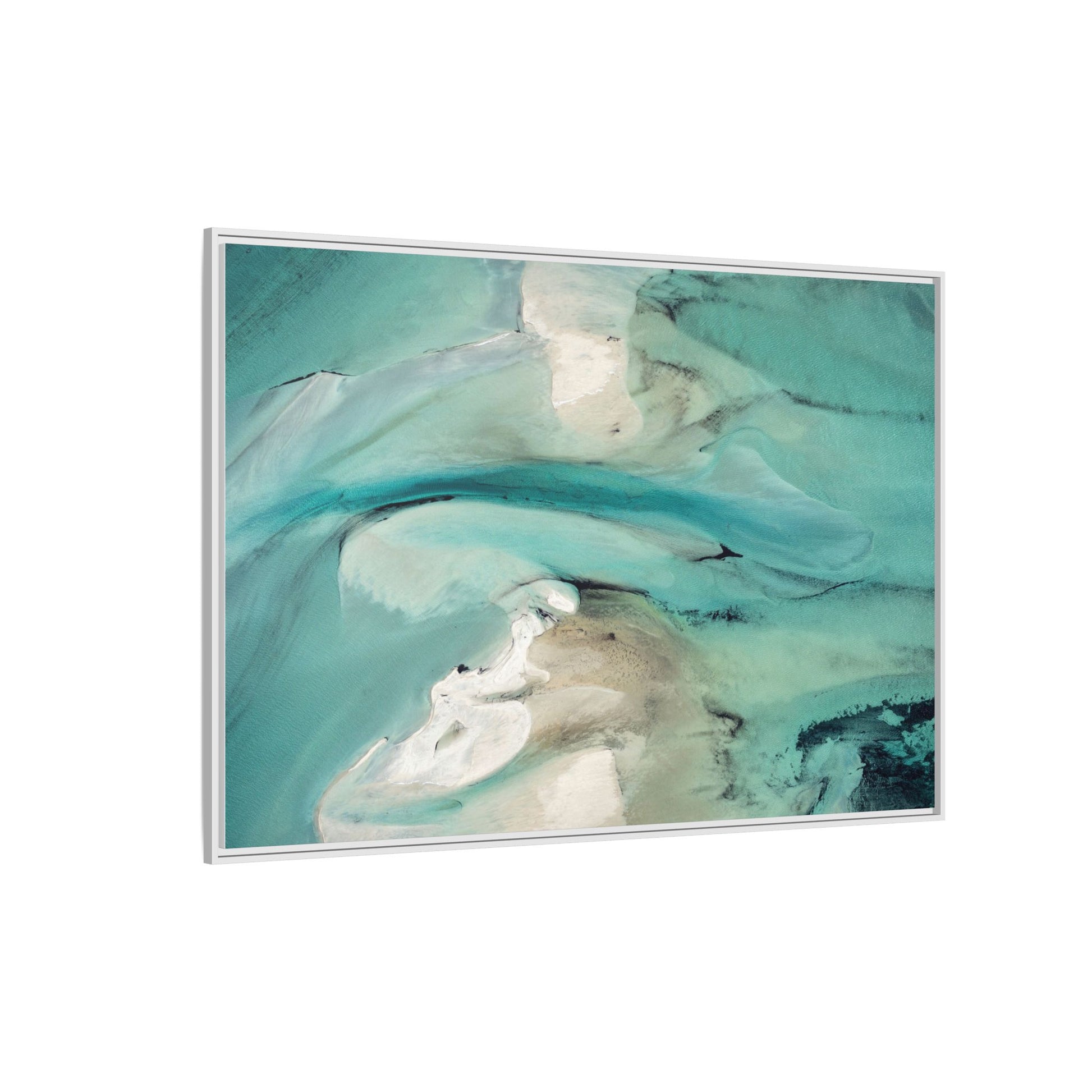 This stunning aerial image captures a mesmerizing coastal landscape in soft, ethereal shades of turquoise, white, and pale green. The photograph appears to be a satellite or drone view of a complex shoreline, featuring intricate water patterns, sandy beaches, and subtle geological formations. Swirling currents and gentle waves create organic, fluid shapes that blend seamlessly between the aquamarine waters and the lighter coastal areas. The abstract quality of the image transforms the geographical scene into an almost painterly composition, with delicate gradients and textural variations that suggest movement and depth. A small dark shape, possibly a boat or marine feature, can be glimpsed within the tranquil blue-green expanse, adding a subtle point of contrast to the dreamy maritime landscape.
