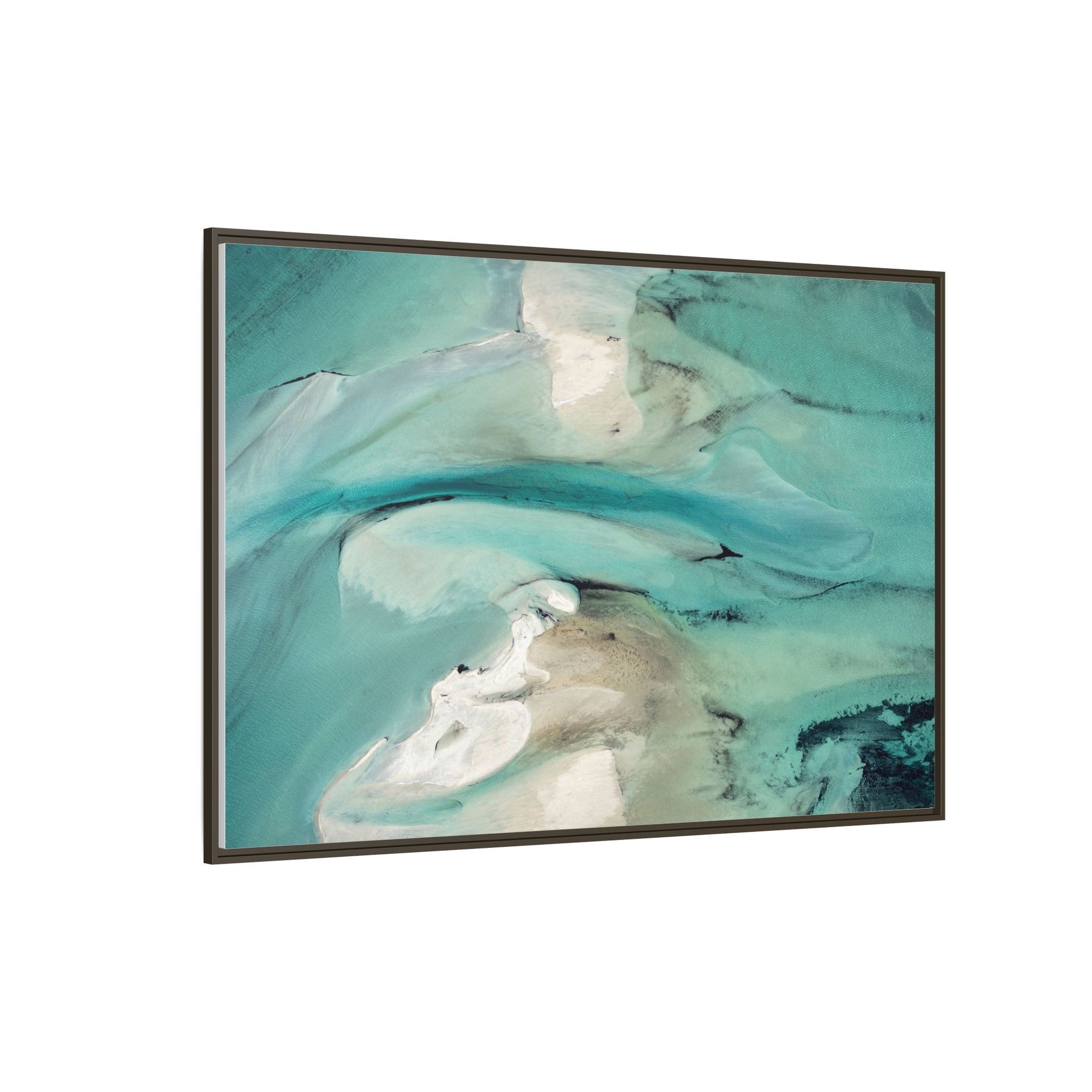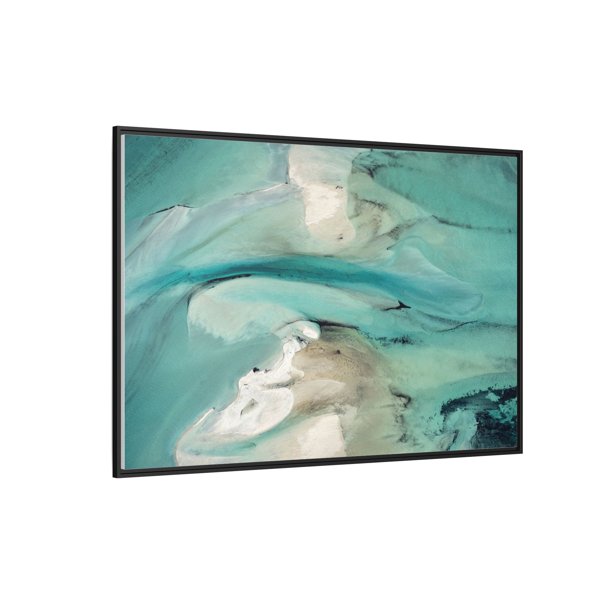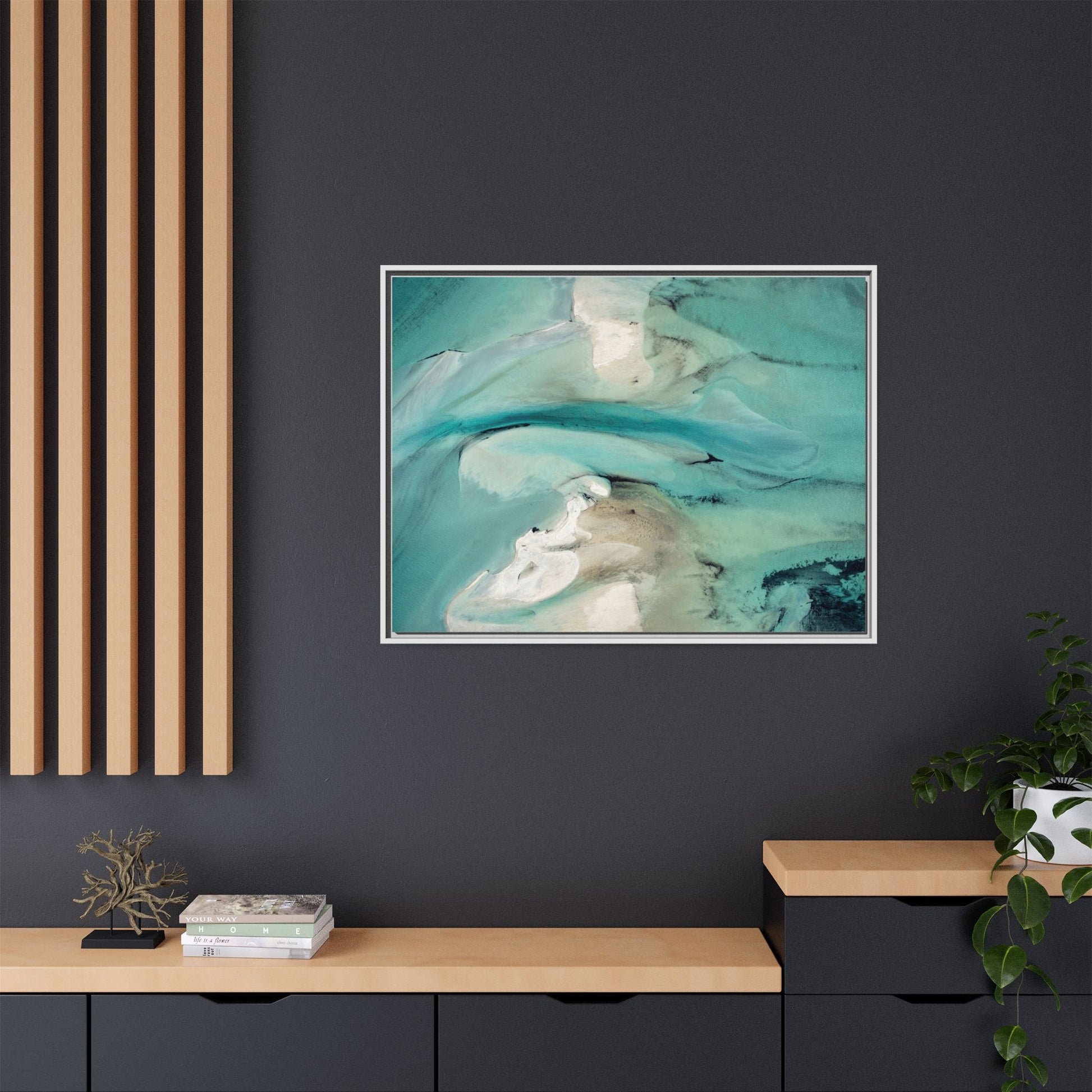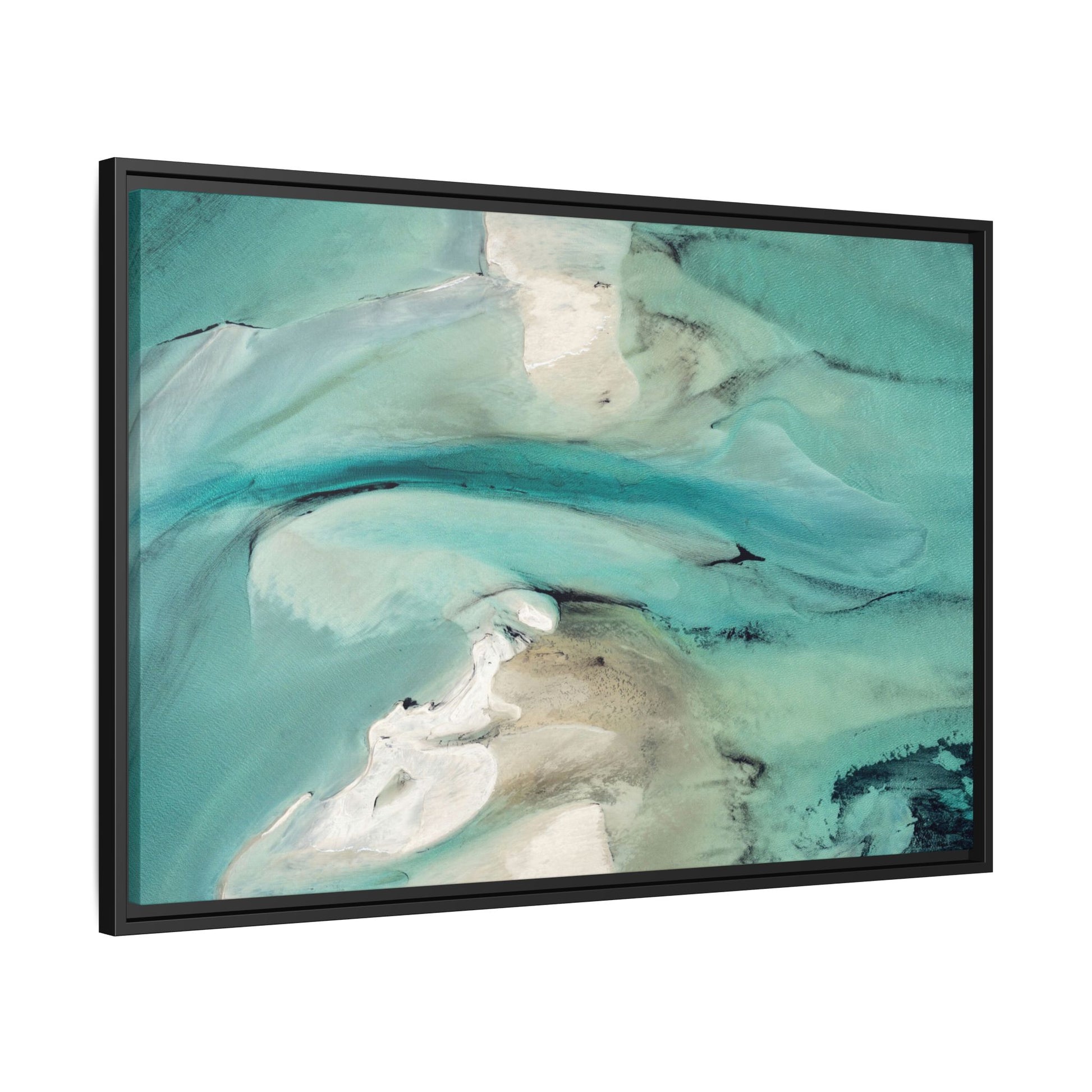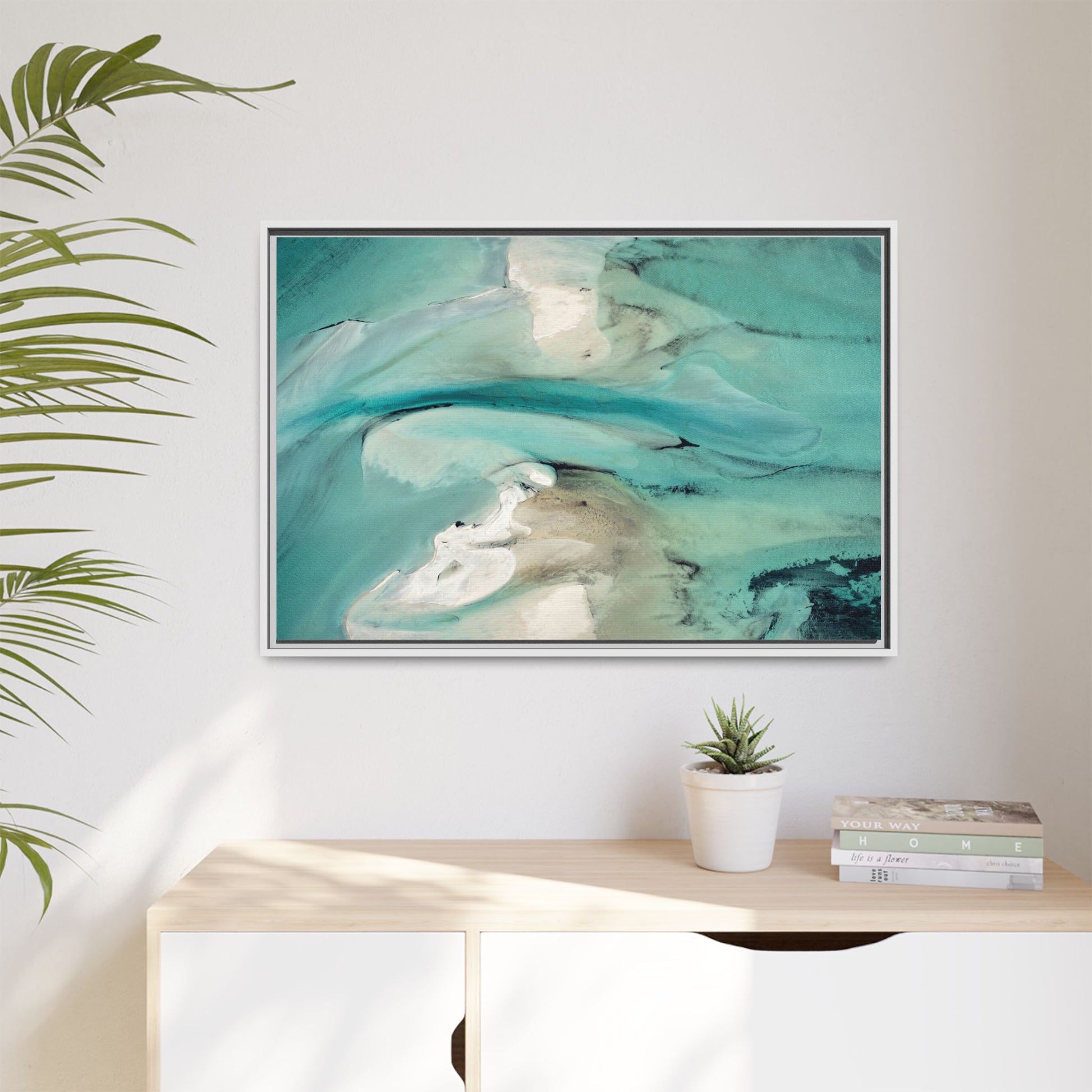 This stunning aerial image captures a mesmerizing coastal landscape in soft, ethereal shades of turquoise, white, and pale green. The photograph appears to be a satellite or drone view of a complex shoreline, featuring intricate water patterns, sandy beaches, and subtle geological formations. Swirling currents and gentle waves create organic, fluid shapes that blend seamlessly between the aquamarine waters and the lighter coastal areas. The abstract quality of the image transforms the geographical scene into an almost painterly composition, with delicate gradients and textural variations that suggest movement and depth. A small dark shape, possibly a boat or marine feature, can be glimpsed within the tranquil blue-green expanse, adding a subtle point of contrast to the dreamy maritime landscape.