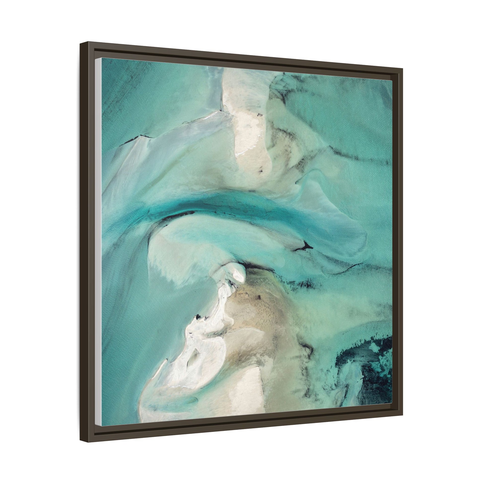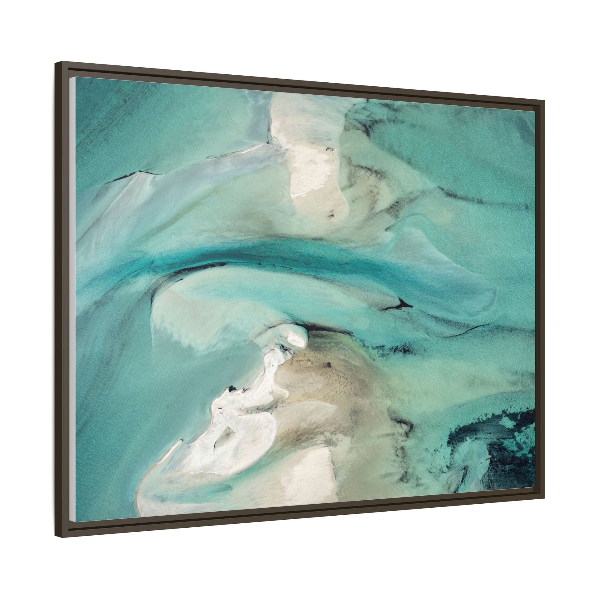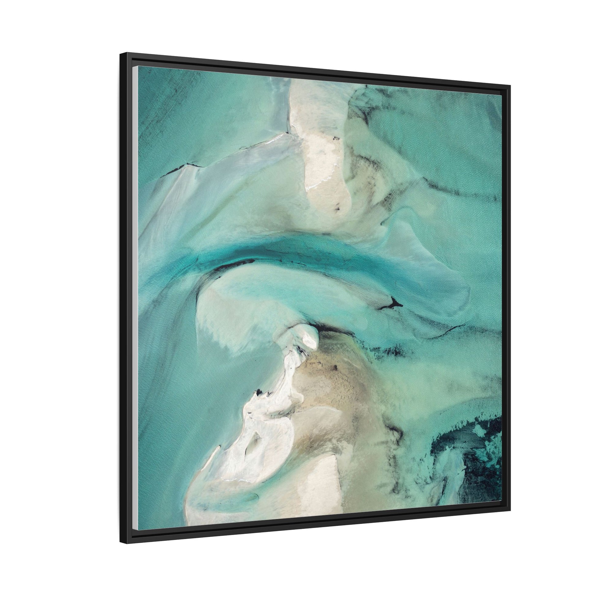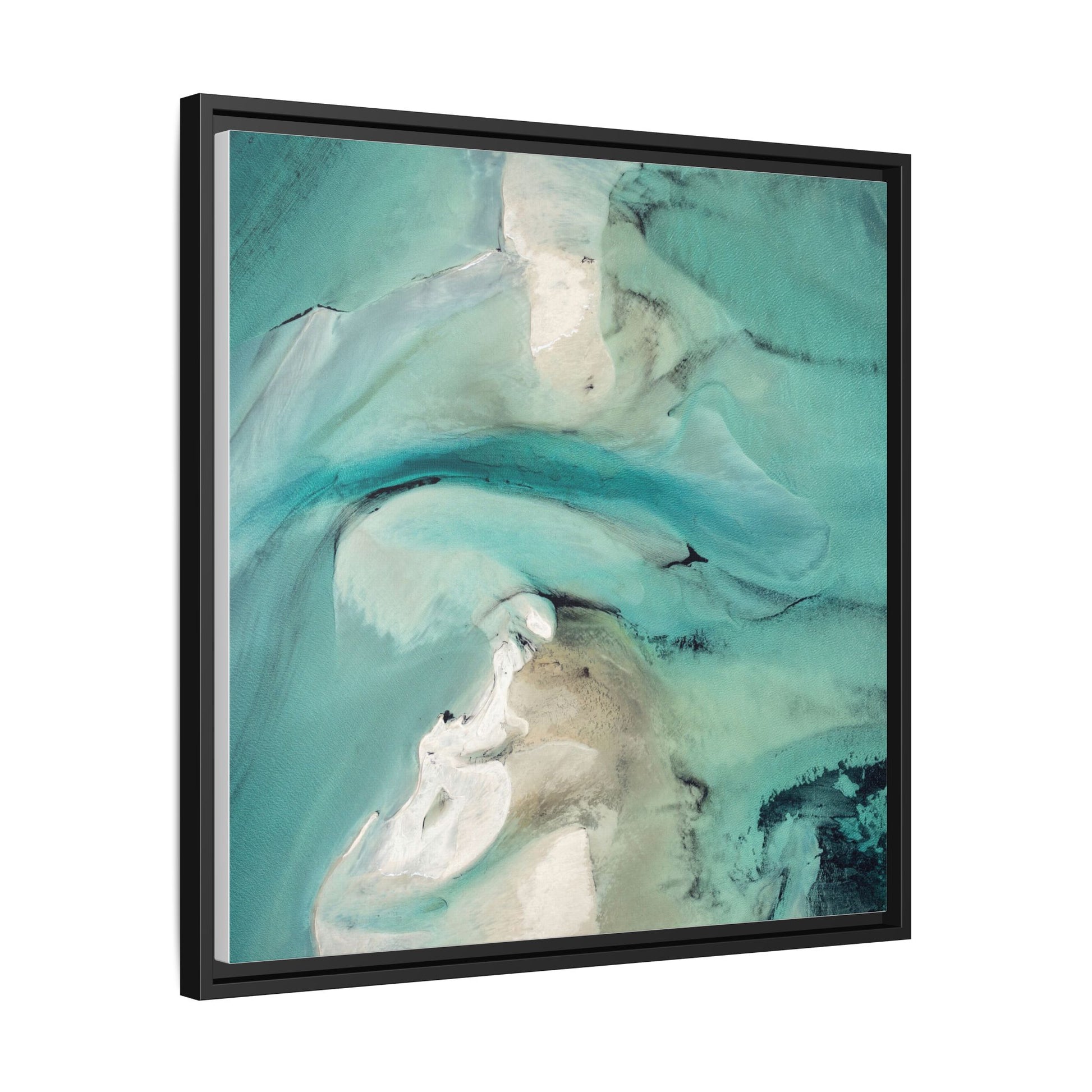 This stunning aerial image captures a mesmerizing coastal landscape in soft, ethereal shades of turquoise, white, and pale green. The photograph appears to be a satellite or drone view of a complex shoreline, featuring intricate water patterns, sandy beaches, and subtle geological formations. Swirling currents and gentle waves create organic, fluid shapes that blend seamlessly between the aquamarine waters and the lighter coastal areas. The abstract quality of the image transforms the geographical scene into an almost painterly composition, with delicate gradients and textural variations that suggest movement and depth. A small dark shape, possibly a boat or marine feature, can be glimpsed within the tranquil blue-green expanse, adding a subtle point of contrast to the dreamy maritime landscape.