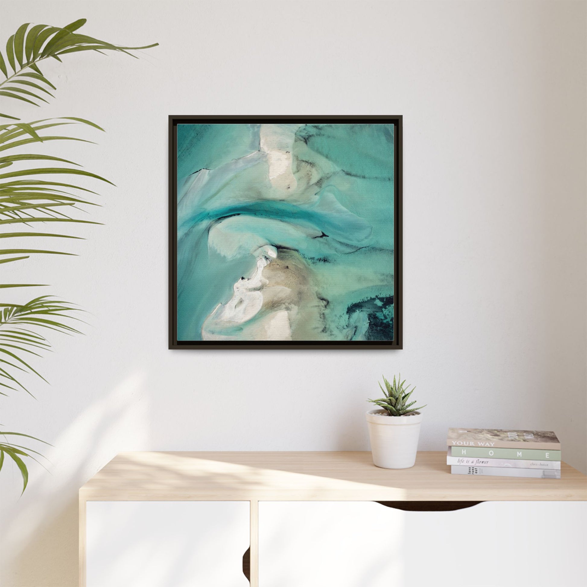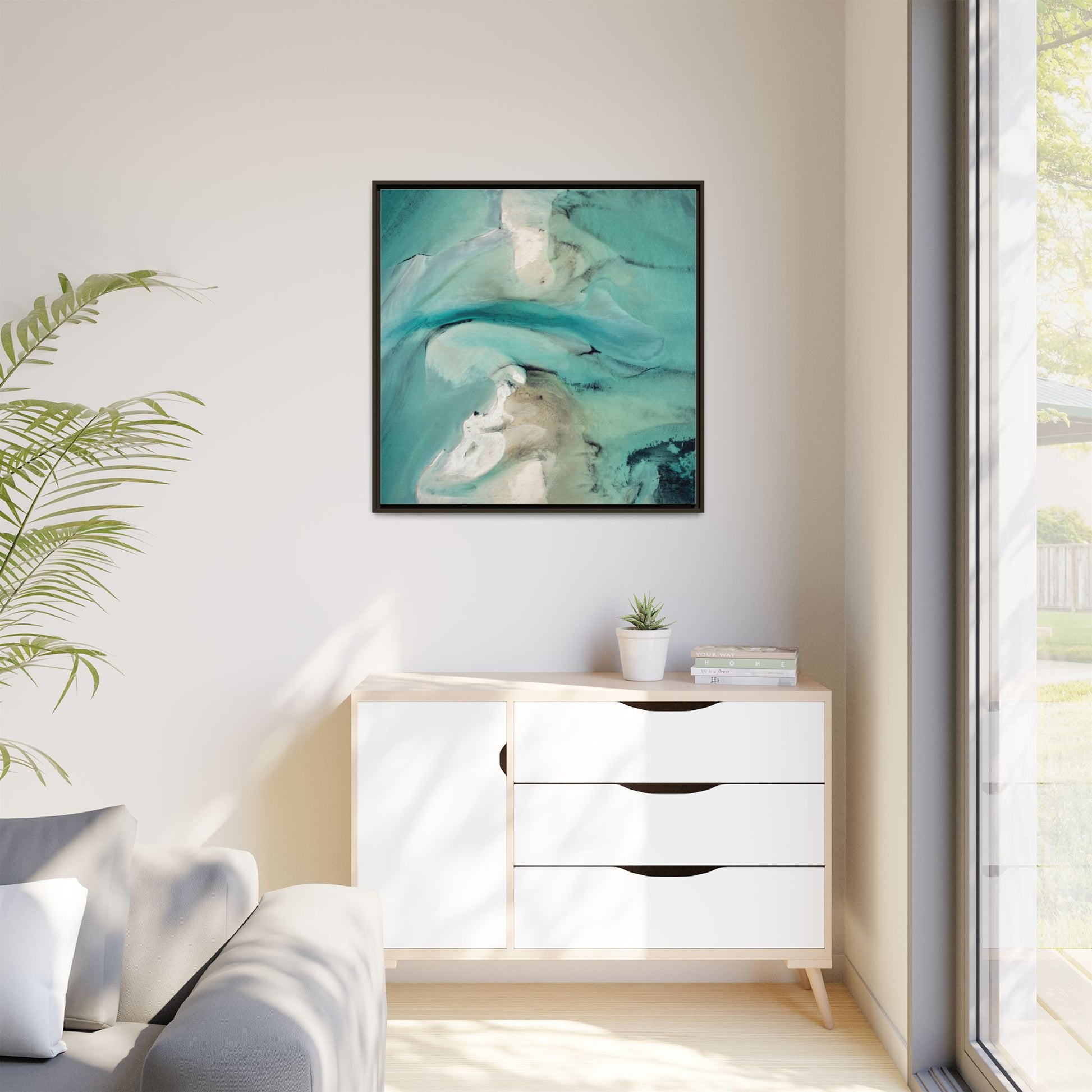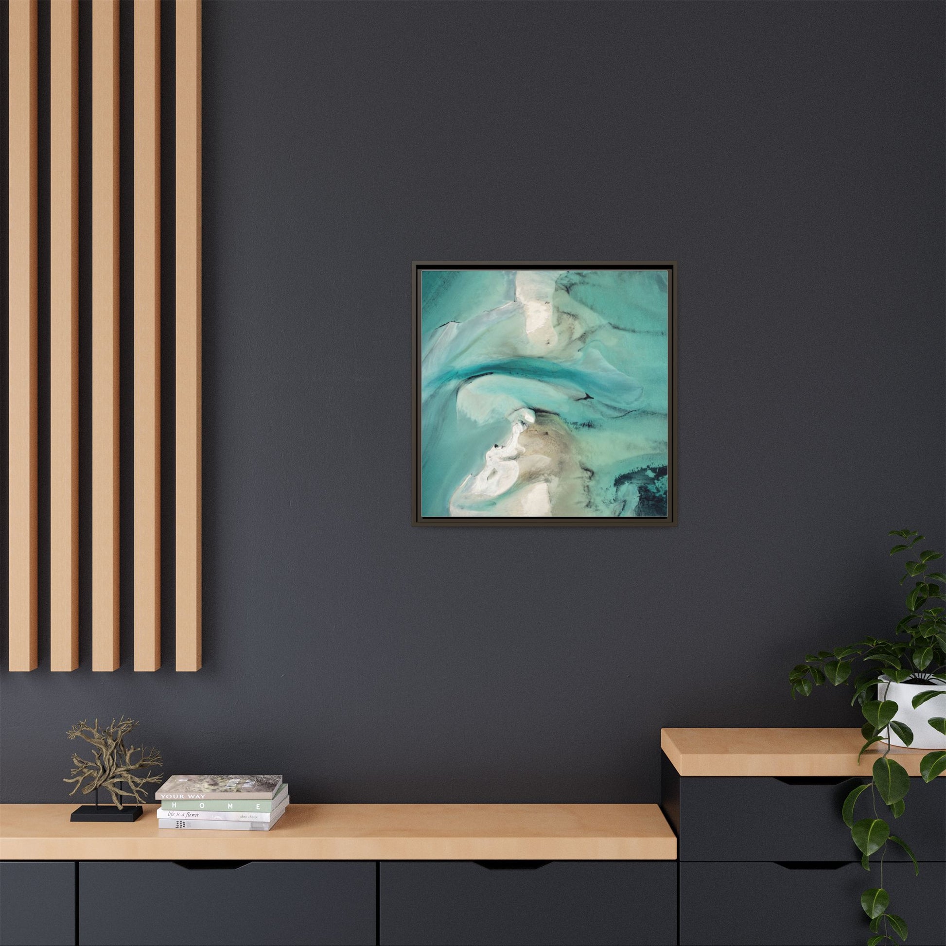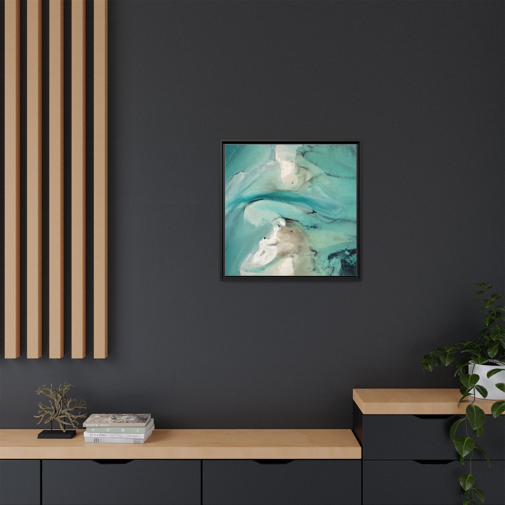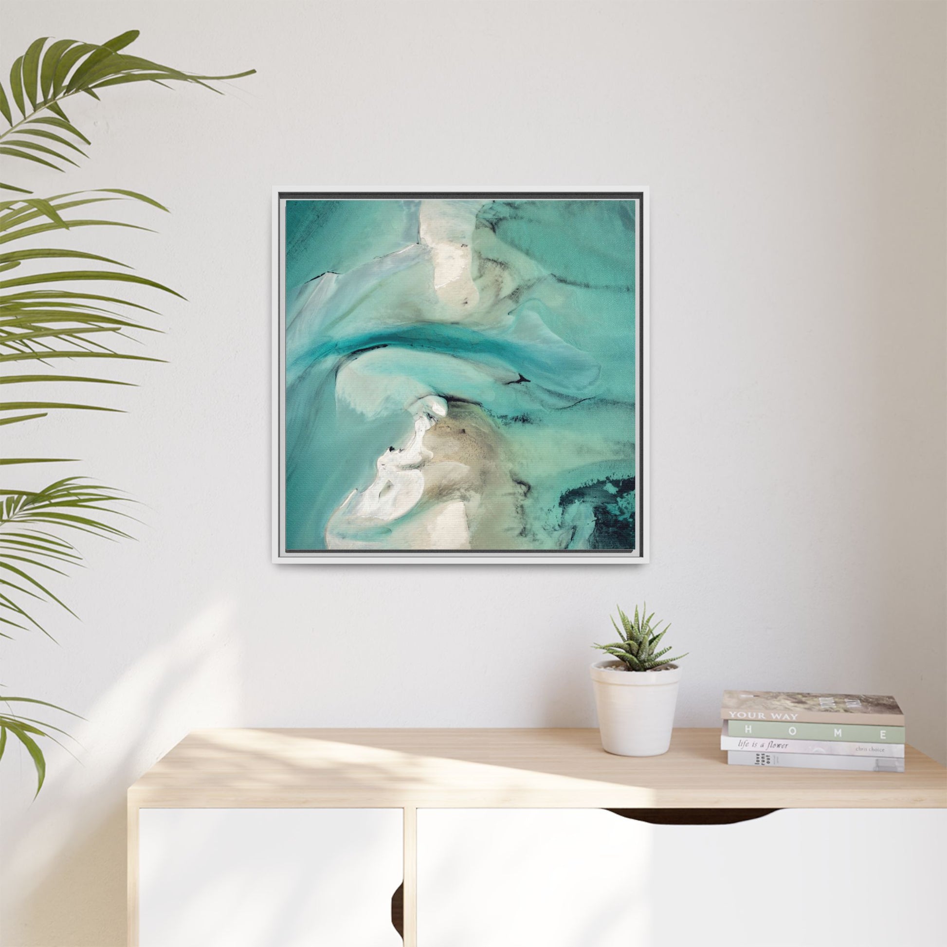 This stunning aerial image captures a mesmerizing coastal landscape in soft, ethereal shades of turquoise, white, and pale green. The photograph appears to be a satellite or drone view of a complex shoreline, featuring intricate water patterns, sandy beaches, and subtle geological formations. Swirling currents and gentle waves create organic, fluid shapes that blend seamlessly between the aquamarine waters and the lighter coastal areas. The abstract quality of the image transforms the geographical scene into an almost painterly composition, with delicate gradients and textural variations that suggest movement and depth. A small dark shape, possibly a boat or marine feature, can be glimpsed within the tranquil blue-green expanse, adding a subtle point of contrast to the dreamy maritime landscape.