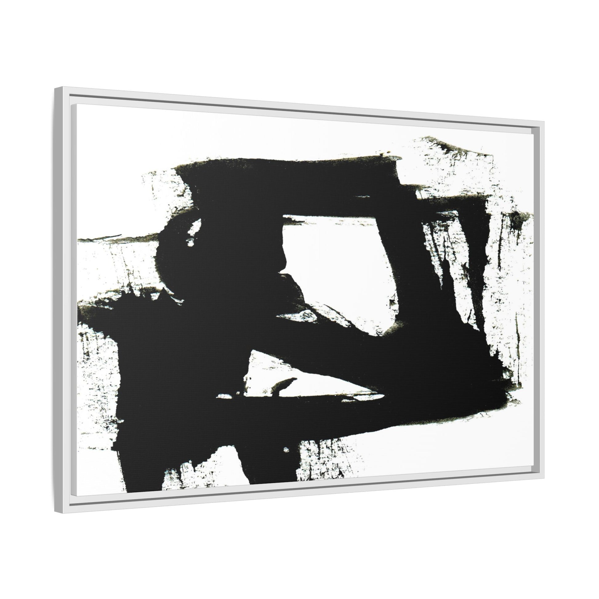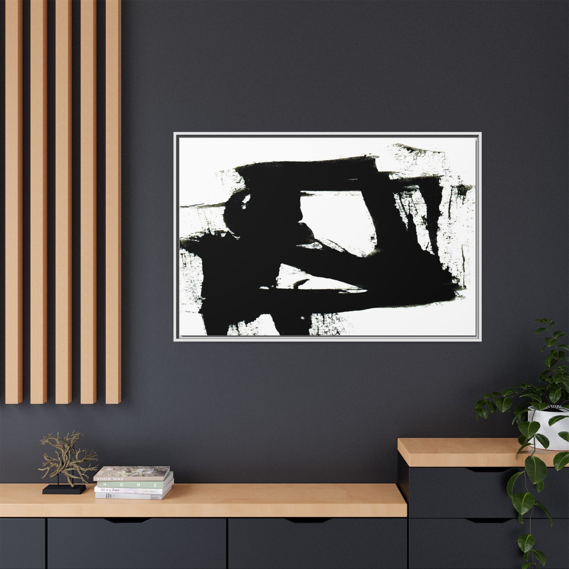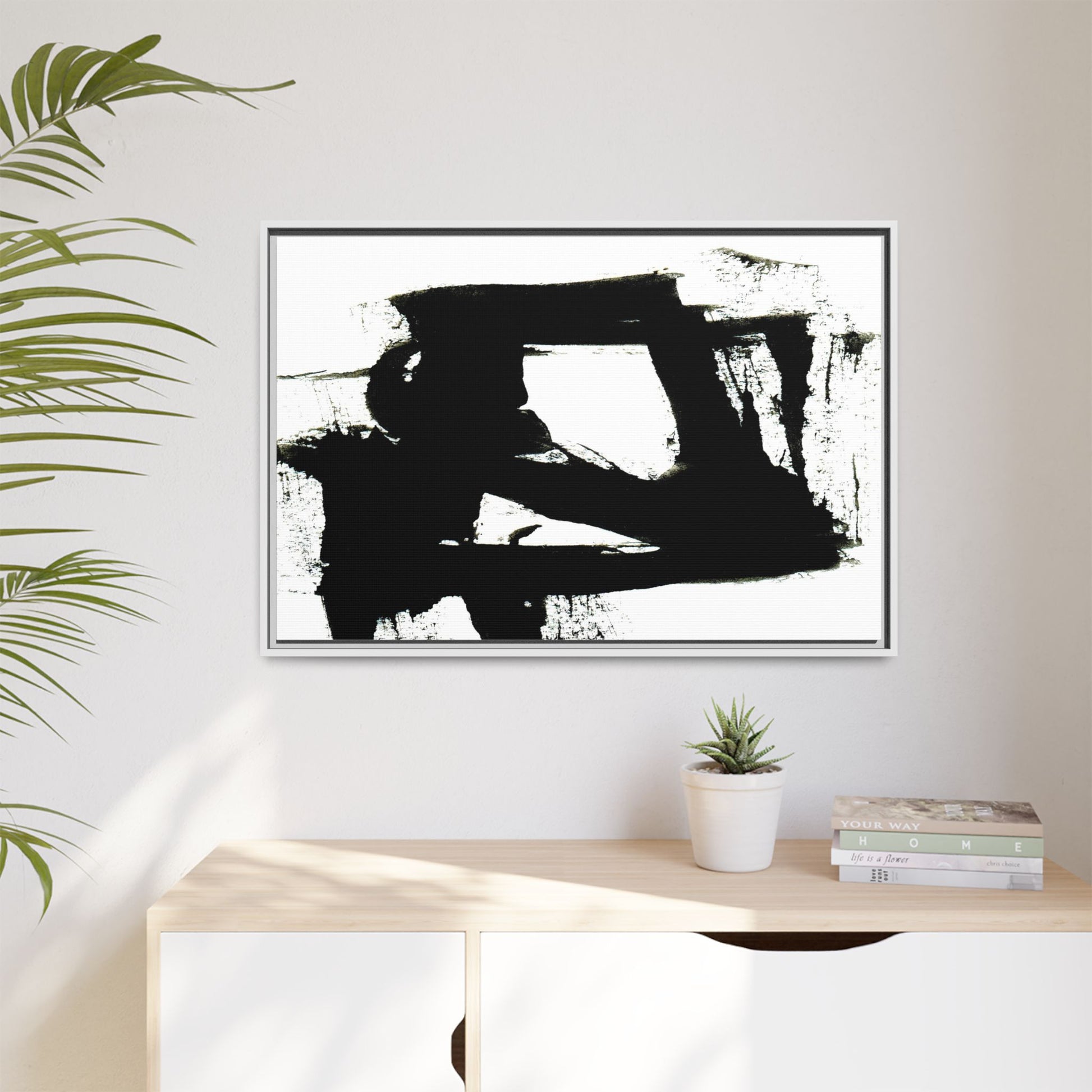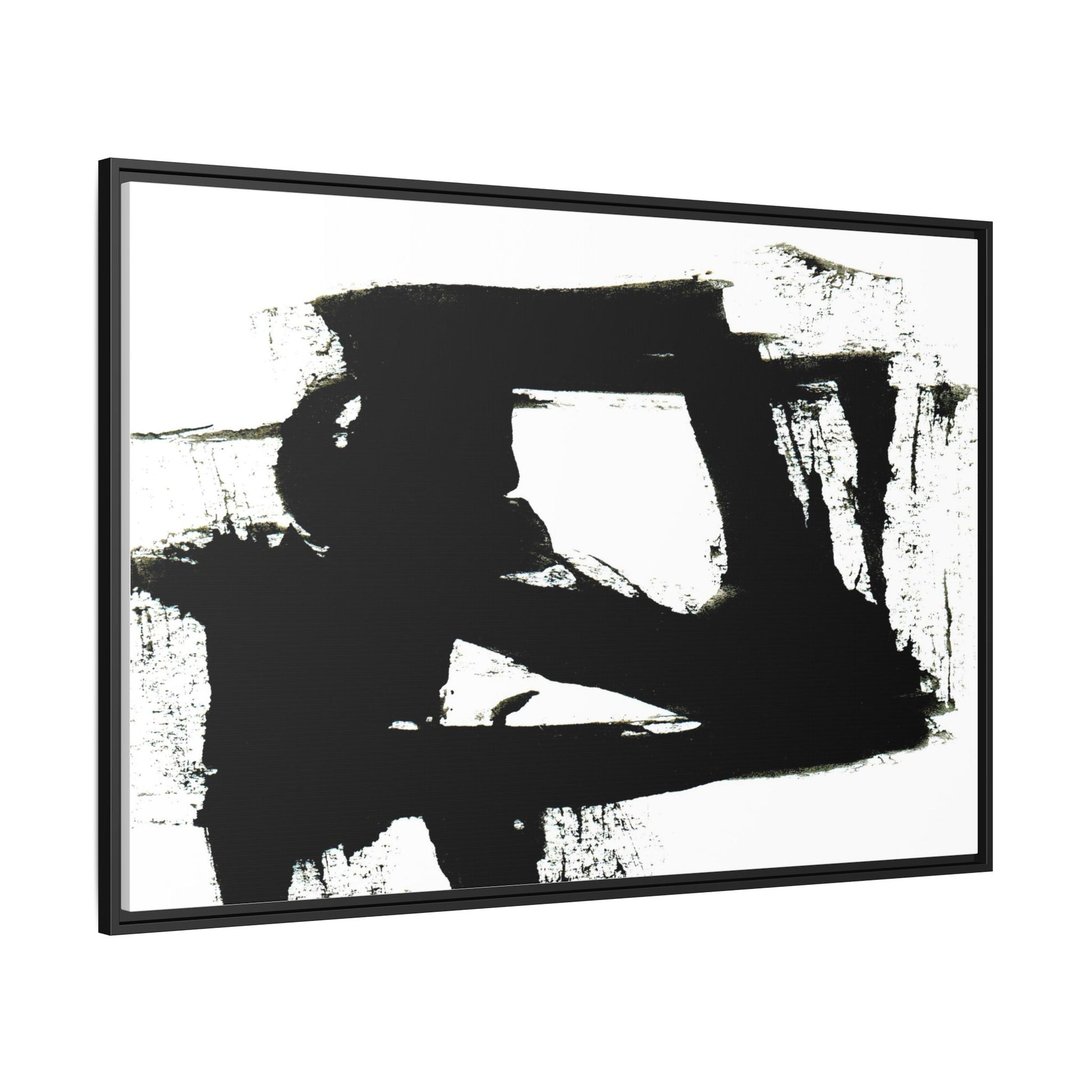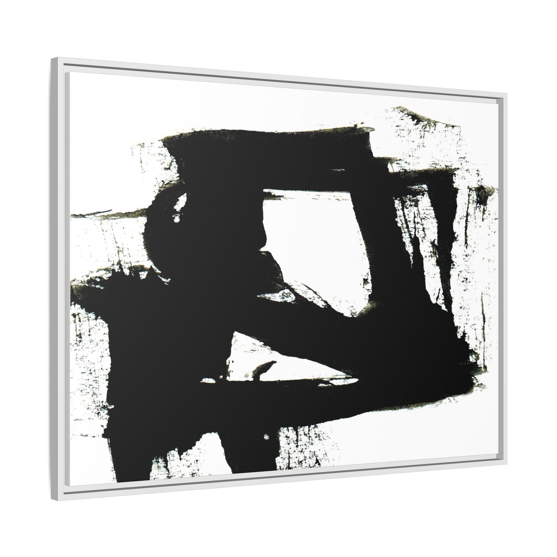 This black and white abstract image showcases a dynamic and expressive artistic composition featuring bold, gestural brushstrokes. The artwork is characterized by deep black markings that create sweeping, angular shapes against a stark white background, creating a high-contrast visual effect. The brushwork appears spontaneous and energetic, with rough, textured edges that suggest movement and emotional intensity. Layers of black paint overlap and intersect, forming geometric and organic shapes that seem to flow and collide across the image plane. The minimalist color palette and abstract style evoke a sense of raw artistic expression, reminiscent of abstract expressionist painting techniques.