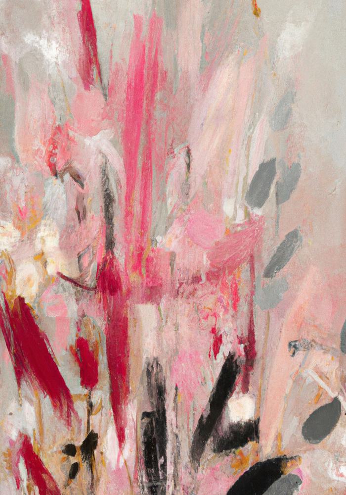 A vibrant interplay between red and pink hues, this abstract piece evokes the energy of blossoming life amidst a storm of emotions.
