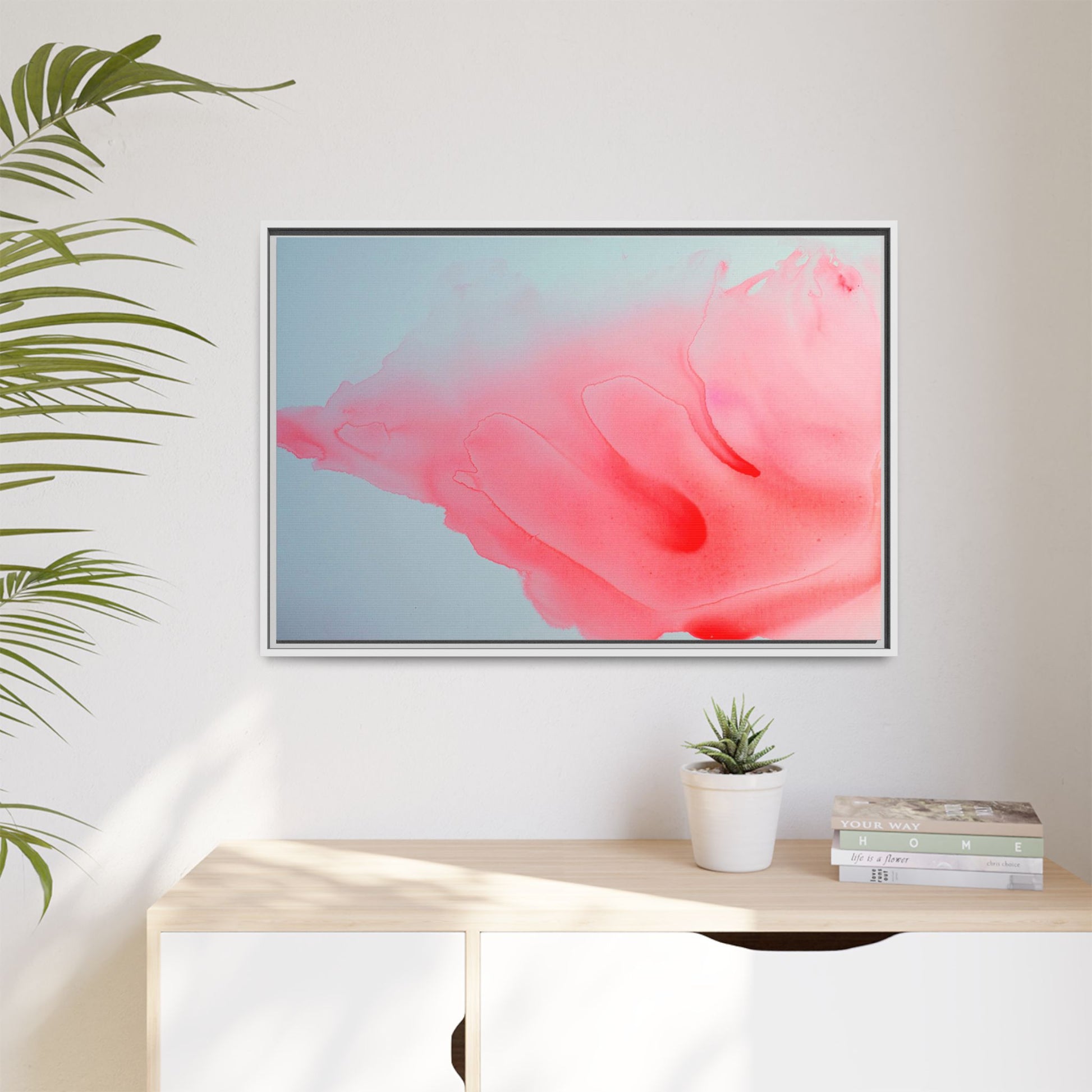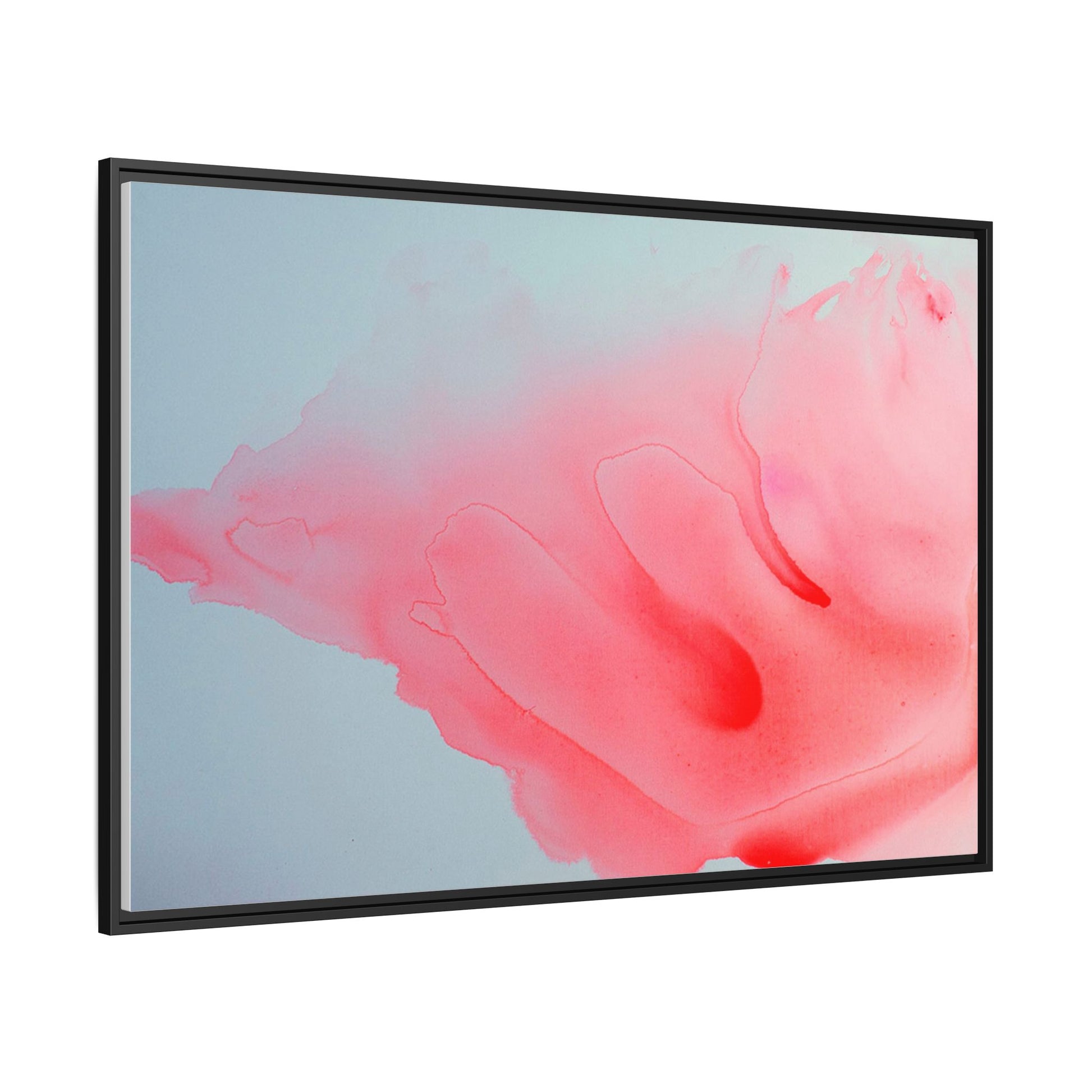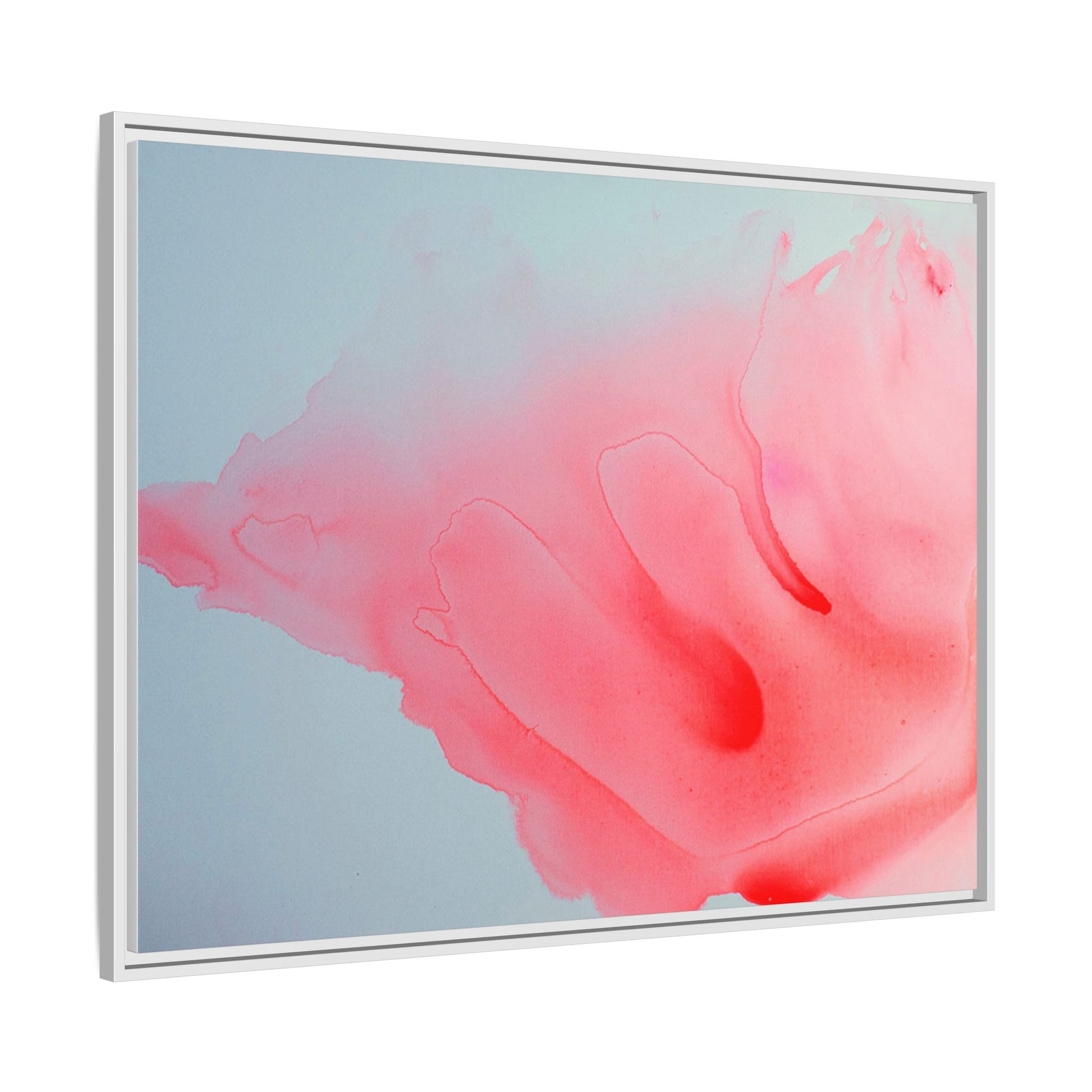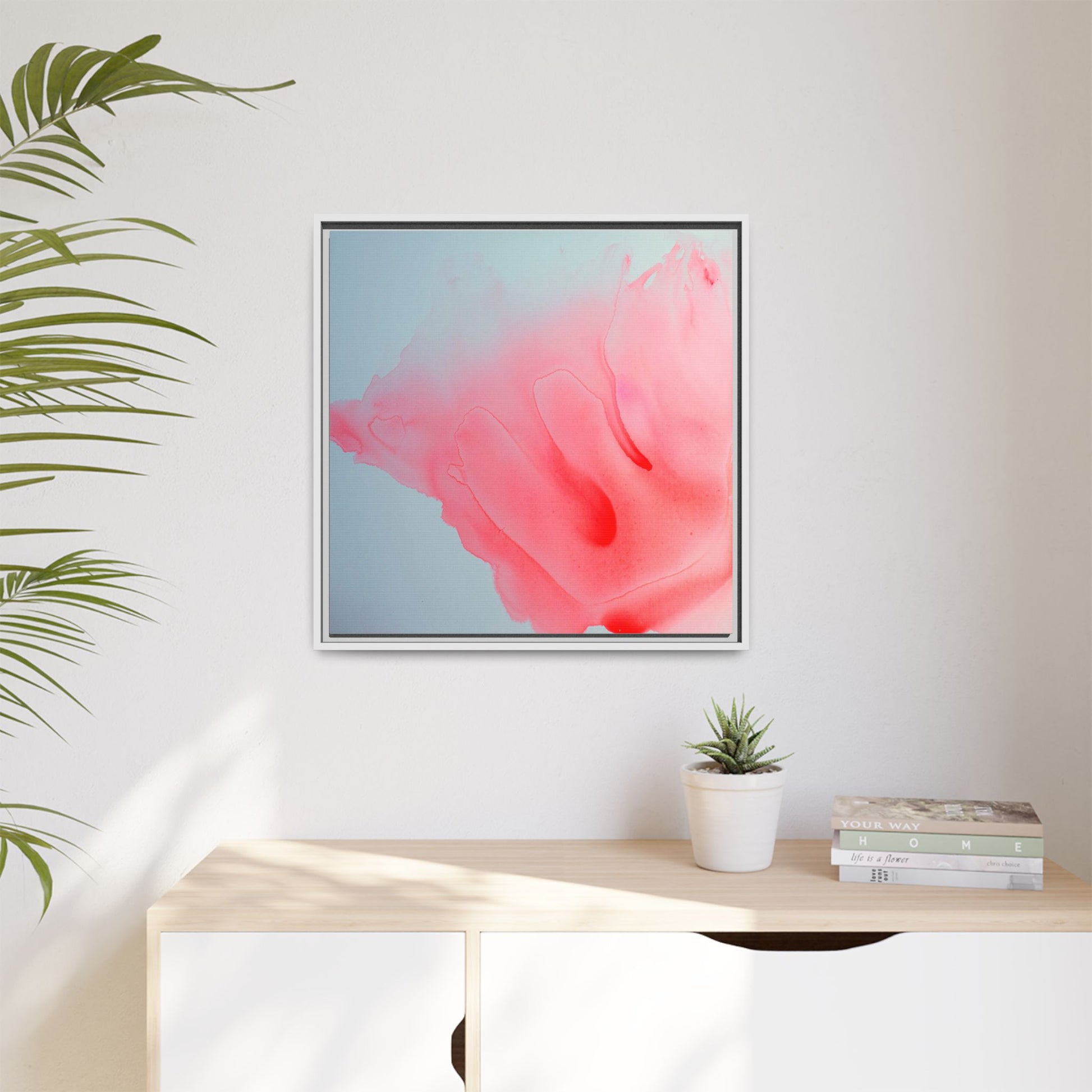 This captivating abstract image features a soft, ethereal watercolor-like composition dominated by delicate shades of pink and pale blue-green. The watercolor pigments blend and flow organically, creating fluid shapes with soft, feathered edges that seem to drift and merge across the canvas. Deeper crimson and bright coral tones concentrate in certain areas, creating visual depth and intensity against the lighter background. Subtle gradients and translucent layers give the artwork a sense of movement and depth, with the colors appearing to dissolve and reconstitute across the image plane. The overall effect is reminiscent of a delicate, dreamy landscape or a microscopic view of a biological form, inviting contemplation and interpretation.