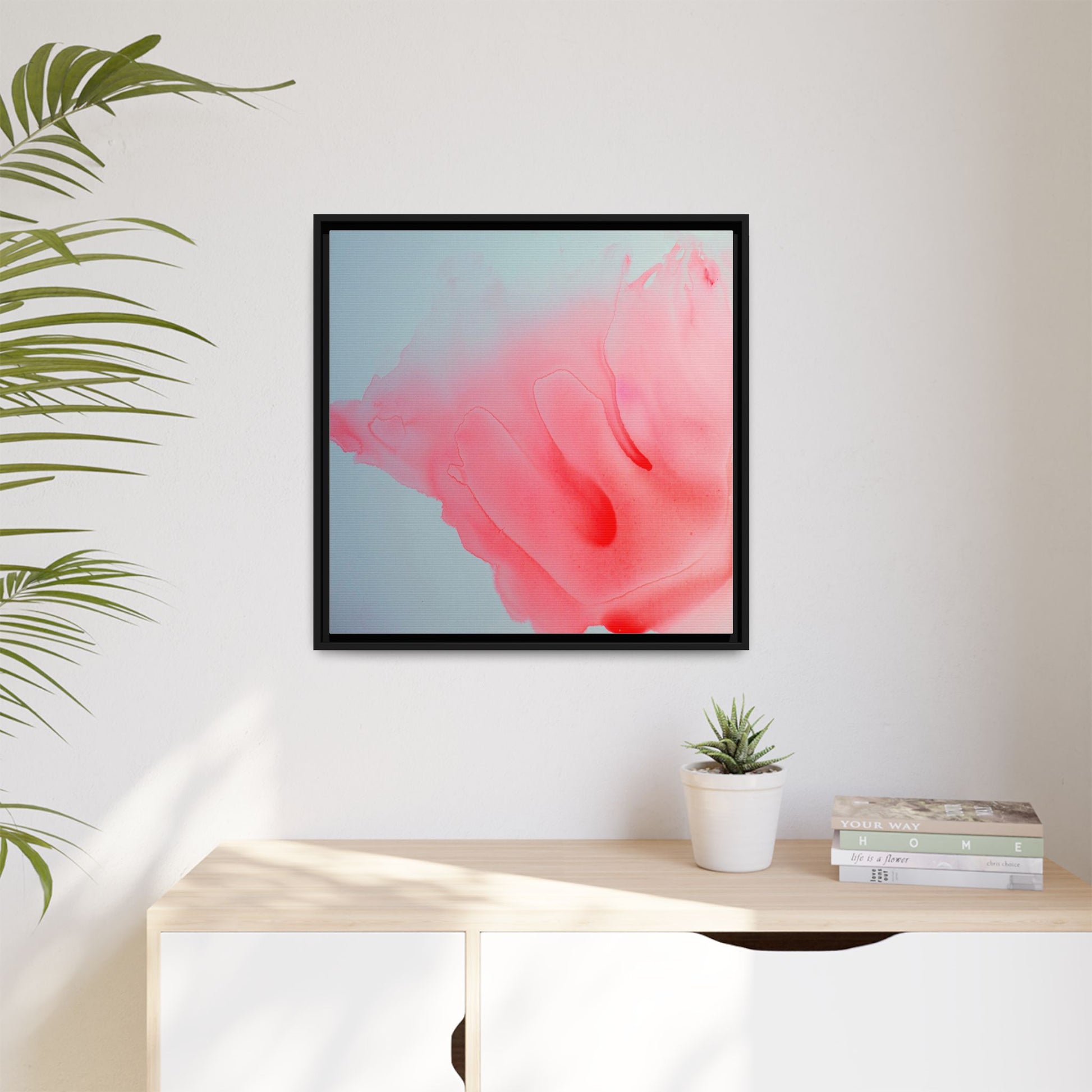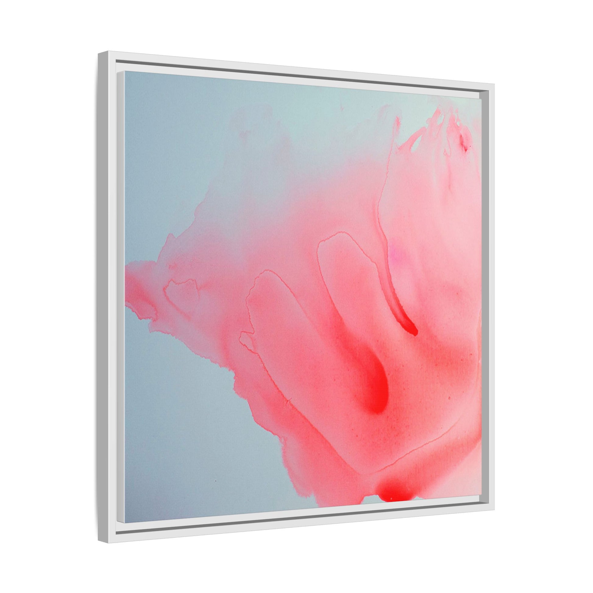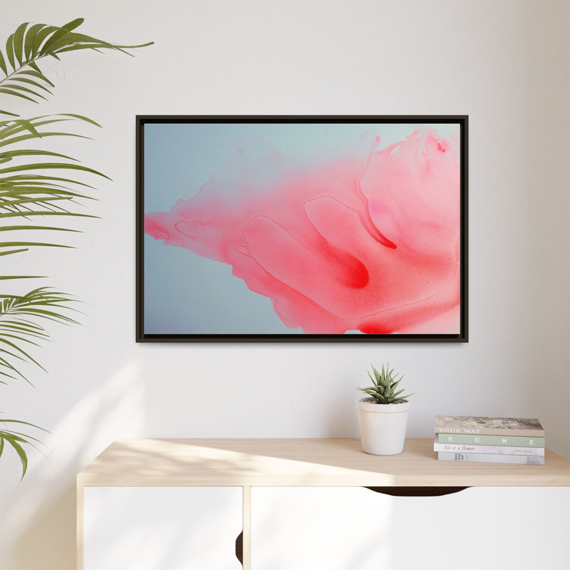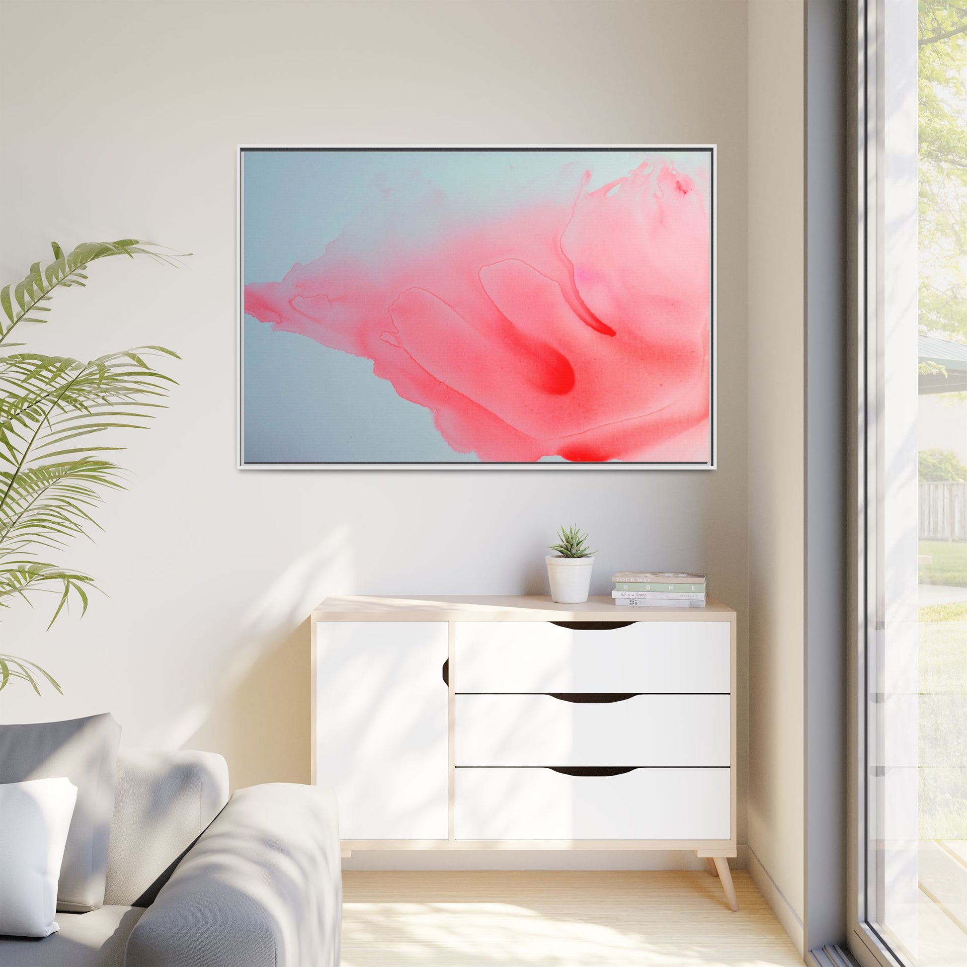 This captivating abstract image features a soft, ethereal watercolor-like composition dominated by delicate shades of pink and pale blue-green. The watercolor pigments blend and flow organically, creating fluid shapes with soft, feathered edges that seem to drift and merge across the canvas. Deeper crimson and bright coral tones concentrate in certain areas, creating visual depth and intensity against the lighter background. Subtle gradients and translucent layers give the artwork a sense of movement and depth, with the colors appearing to dissolve and reconstitute across the image plane. The overall effect is reminiscent of a delicate, dreamy landscape or a microscopic view of a biological form, inviting contemplation and interpretation.