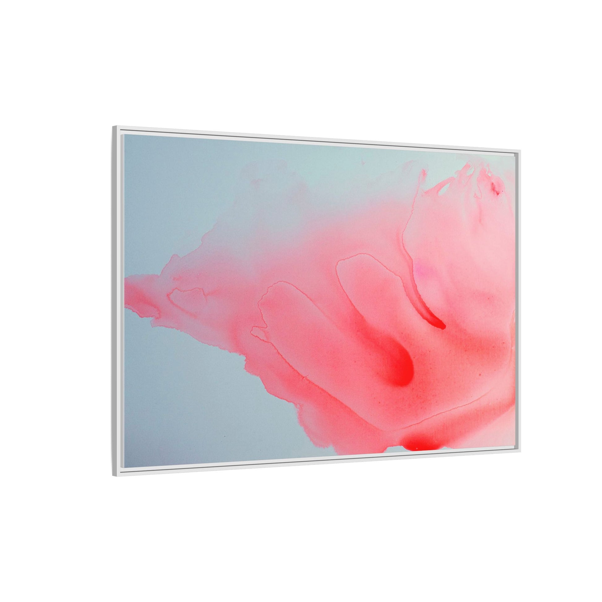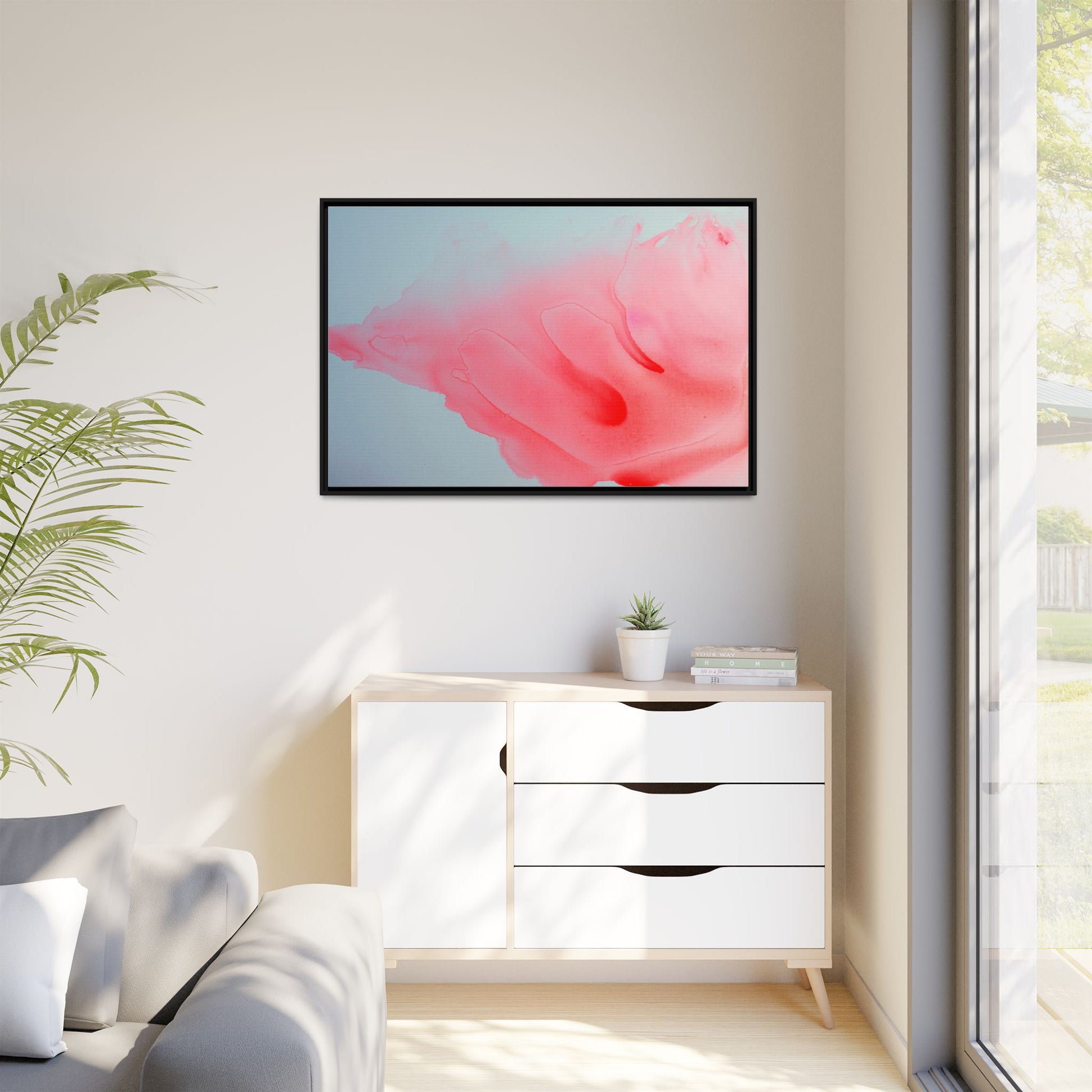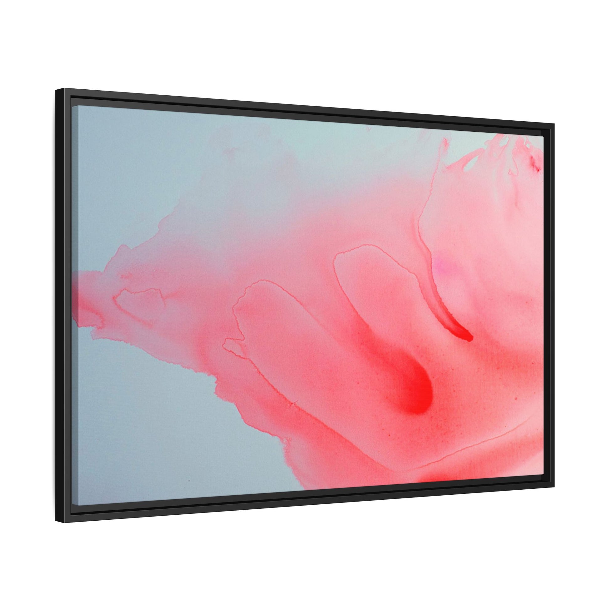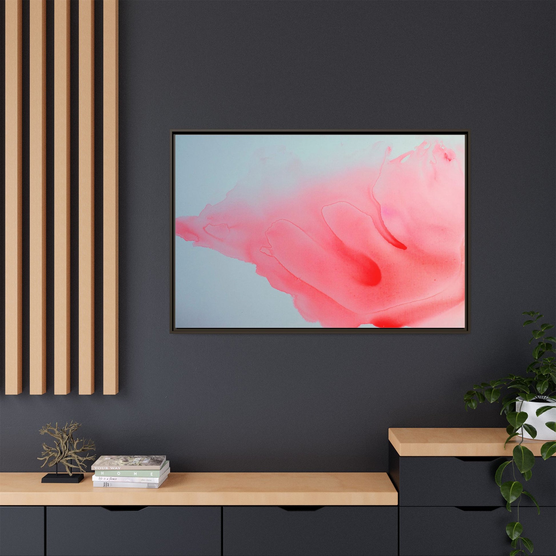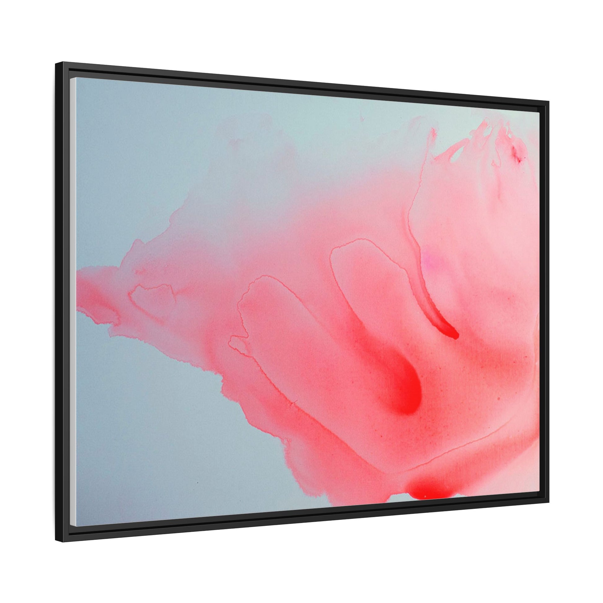 This captivating abstract image features a soft, ethereal watercolor-like composition dominated by delicate shades of pink and pale blue-green. The watercolor pigments blend and flow organically, creating fluid shapes with soft, feathered edges that seem to drift and merge across the canvas. Deeper crimson and bright coral tones concentrate in certain areas, creating visual depth and intensity against the lighter background. Subtle gradients and translucent layers give the artwork a sense of movement and depth, with the colors appearing to dissolve and reconstitute across the image plane. The overall effect is reminiscent of a delicate, dreamy landscape or a microscopic view of a biological form, inviting contemplation and interpretation.