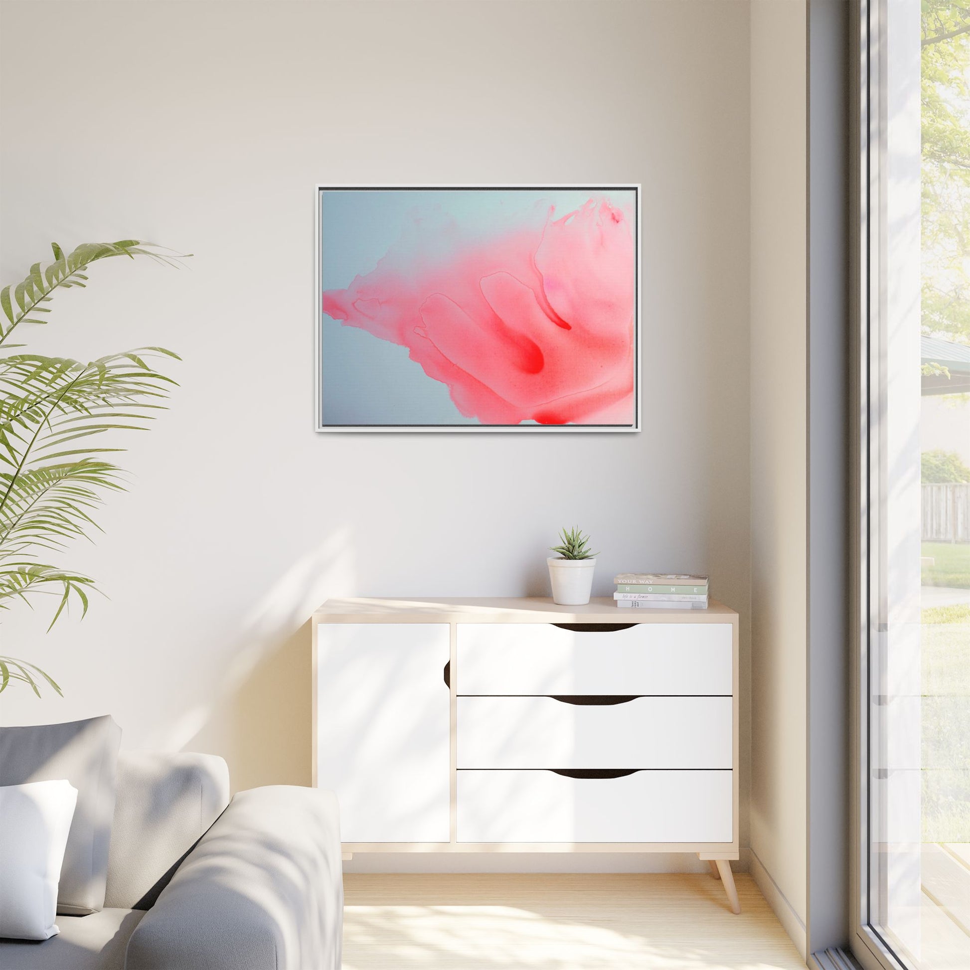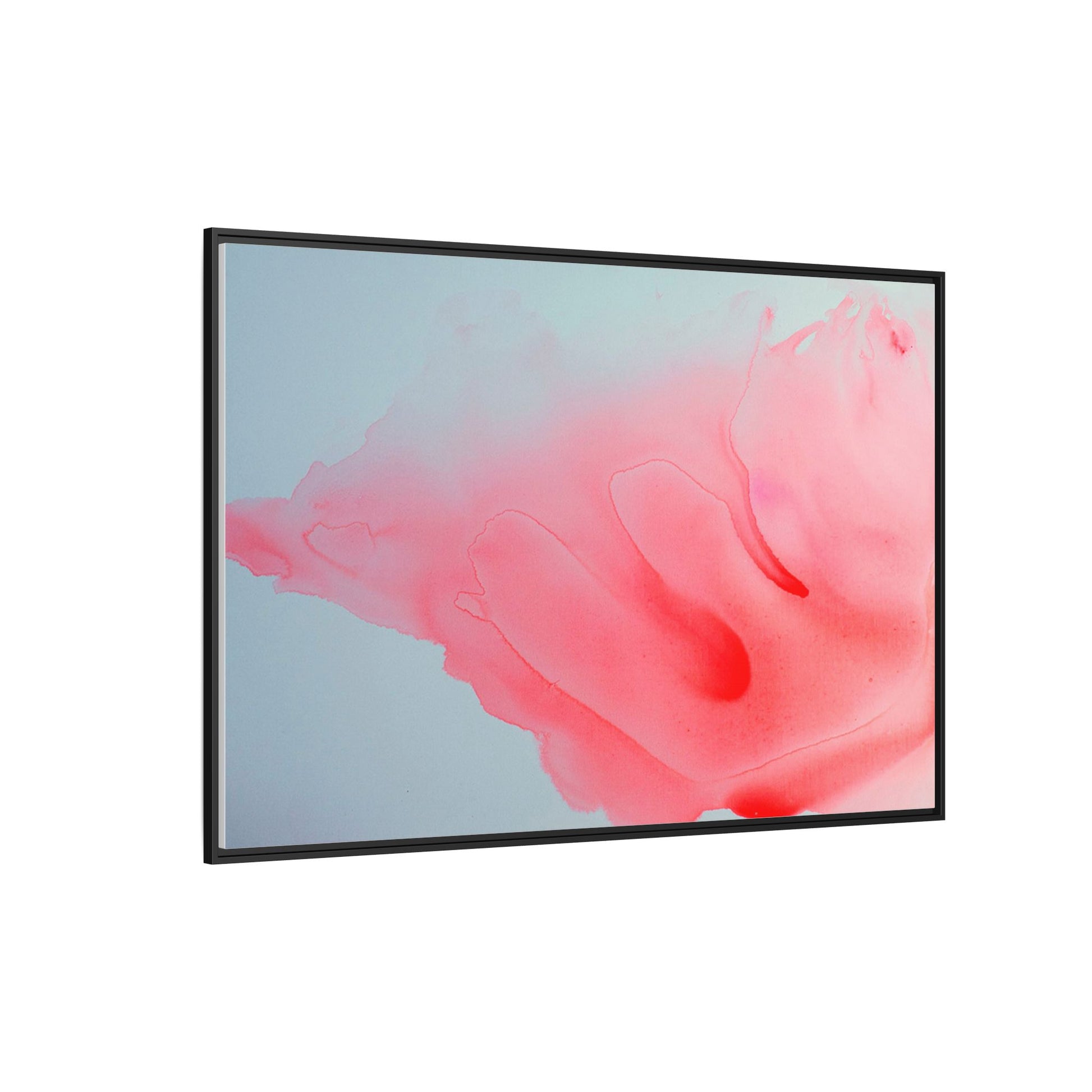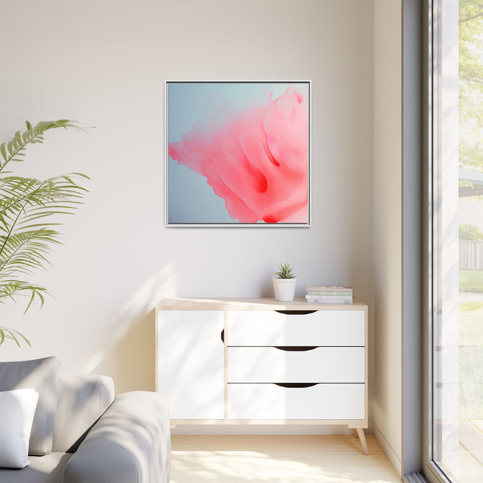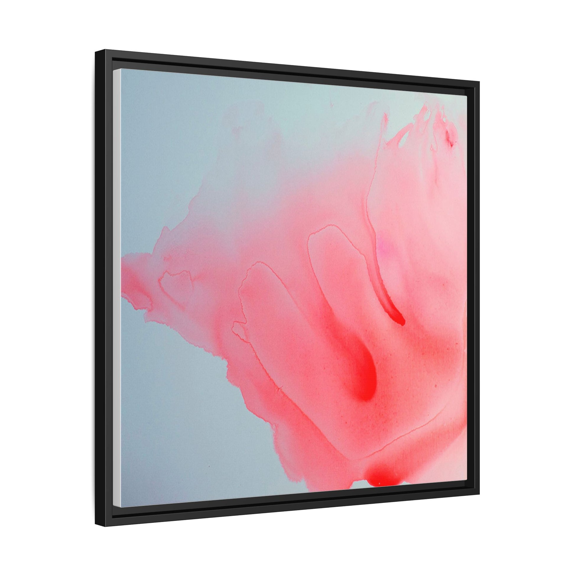 This captivating abstract image features a soft, ethereal watercolor-like composition dominated by delicate shades of pink and pale blue-green. The watercolor pigments blend and flow organically, creating fluid shapes with soft, feathered edges that seem to drift and merge across the canvas. Deeper crimson and bright coral tones concentrate in certain areas, creating visual depth and intensity against the lighter background. Subtle gradients and translucent layers give the artwork a sense of movement and depth, with the colors appearing to dissolve and reconstitute across the image plane. The overall effect is reminiscent of a delicate, dreamy landscape or a microscopic view of a biological form, inviting contemplation and interpretation.