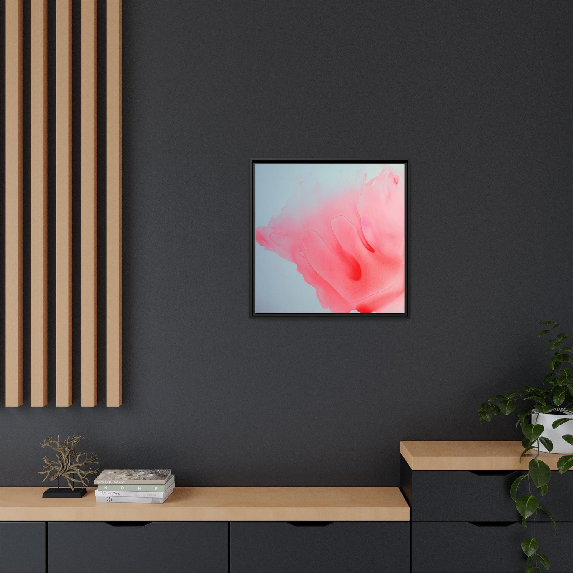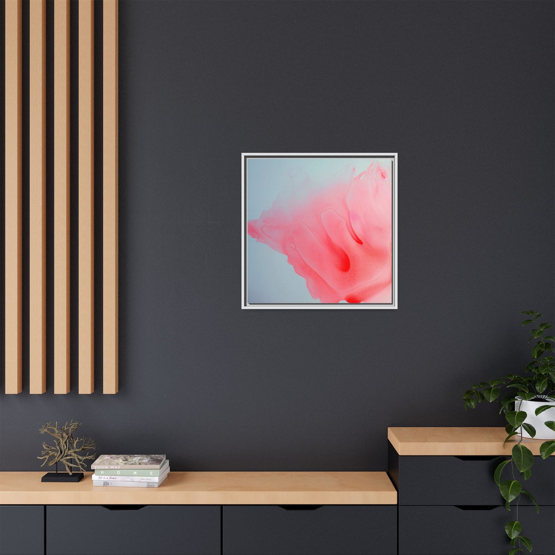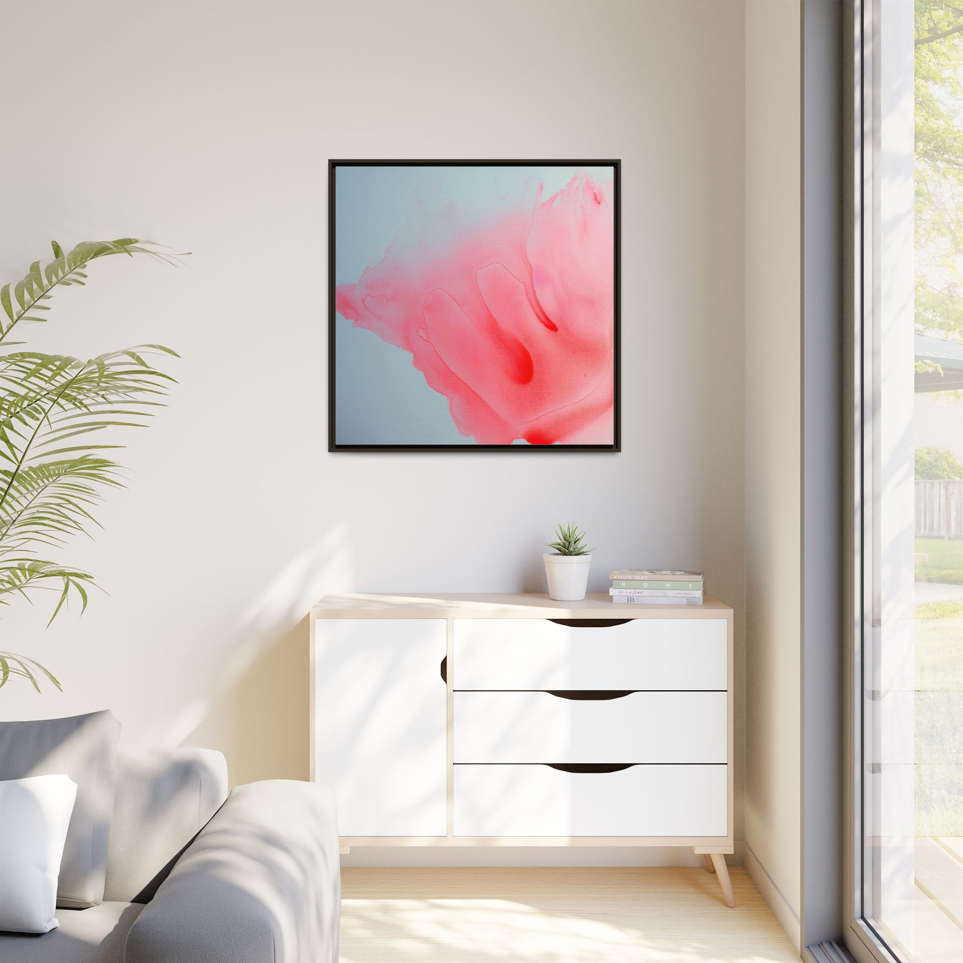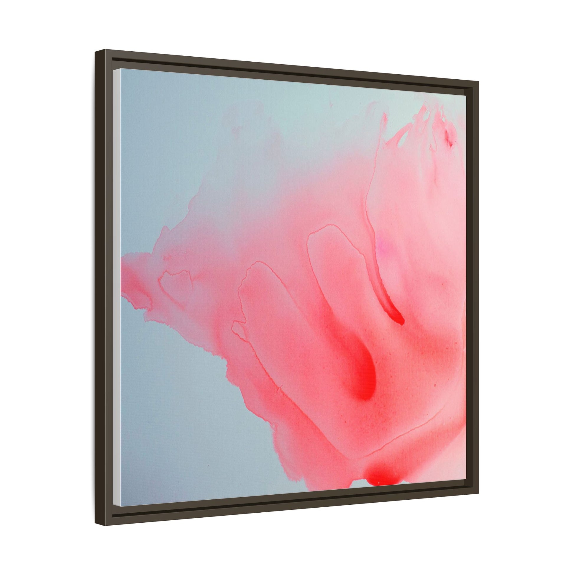 This captivating abstract image features a soft, ethereal watercolor-like composition dominated by delicate shades of pink and pale blue-green. The watercolor pigments blend and flow organically, creating fluid shapes with soft, feathered edges that seem to drift and merge across the canvas. Deeper crimson and bright coral tones concentrate in certain areas, creating visual depth and intensity against the lighter background. Subtle gradients and translucent layers give the artwork a sense of movement and depth, with the colors appearing to dissolve and reconstitute across the image plane. The overall effect is reminiscent of a delicate, dreamy landscape or a microscopic view of a biological form, inviting contemplation and interpretation.