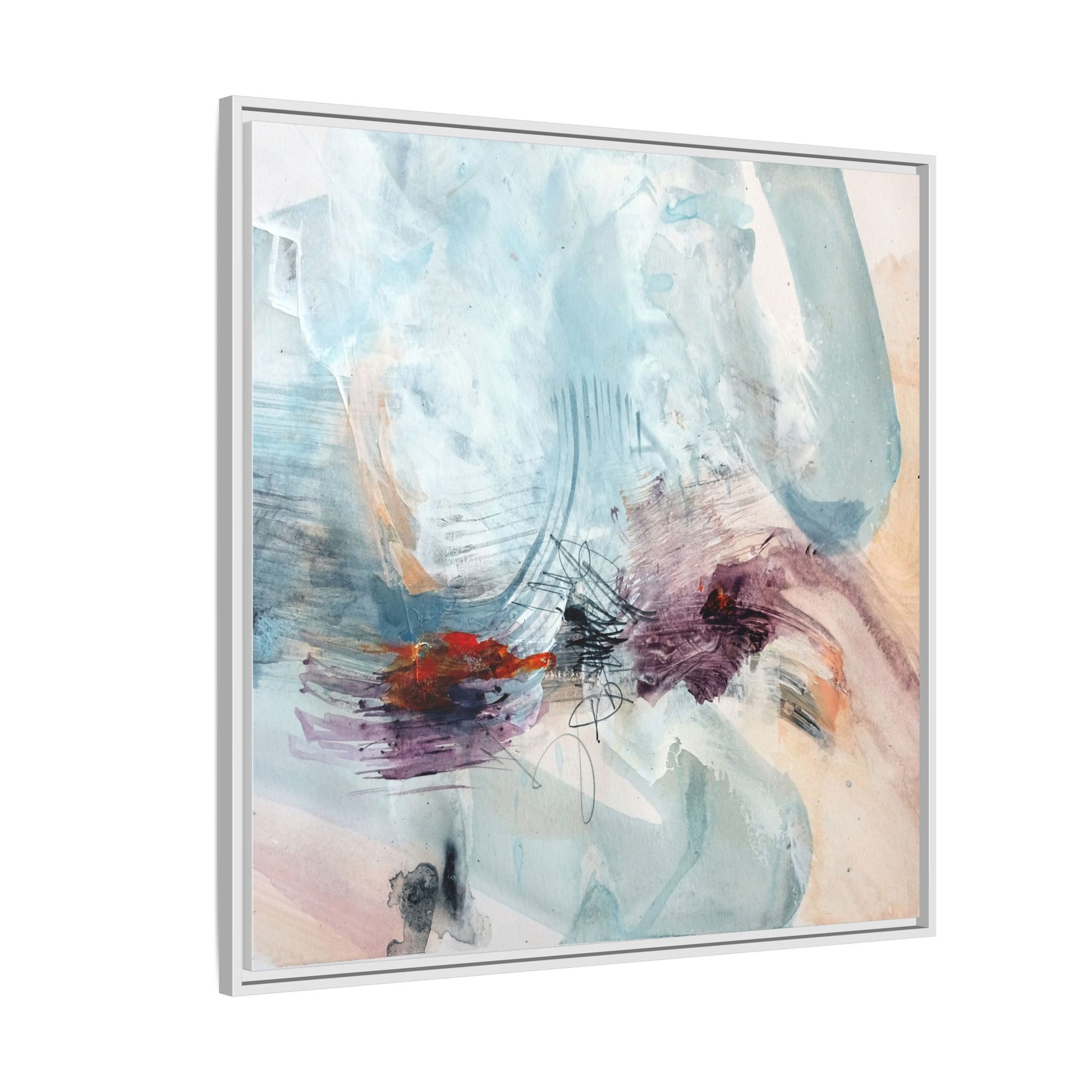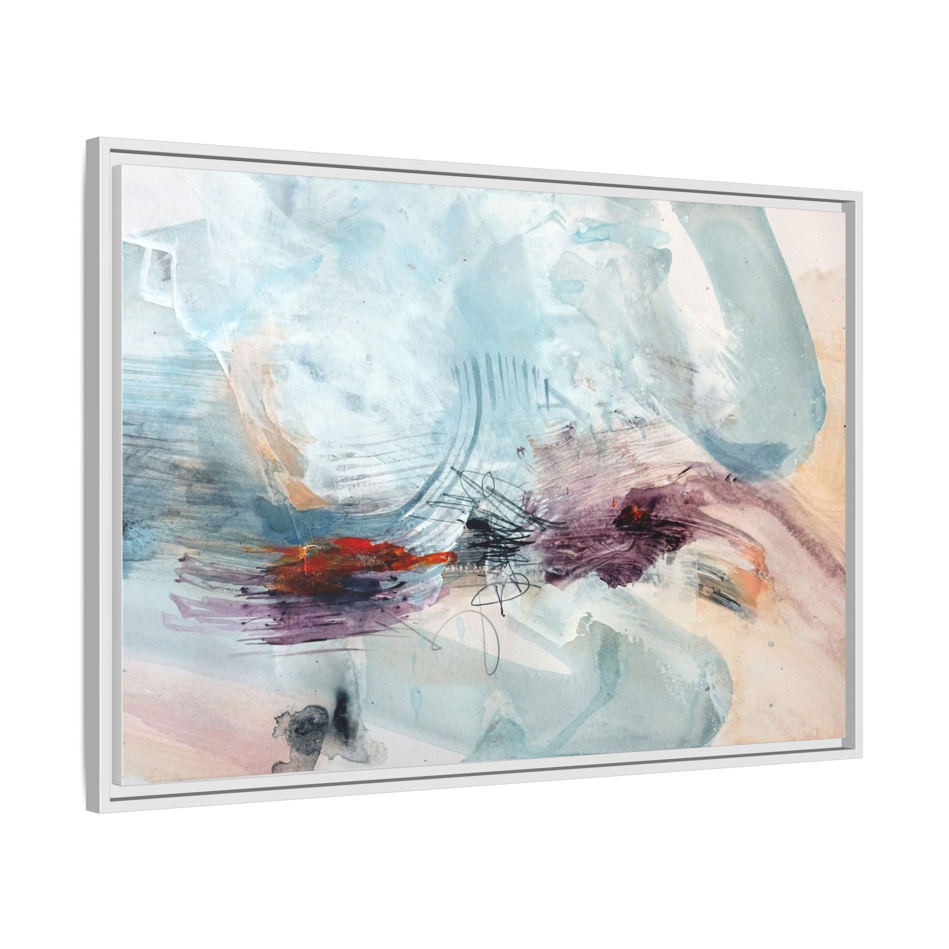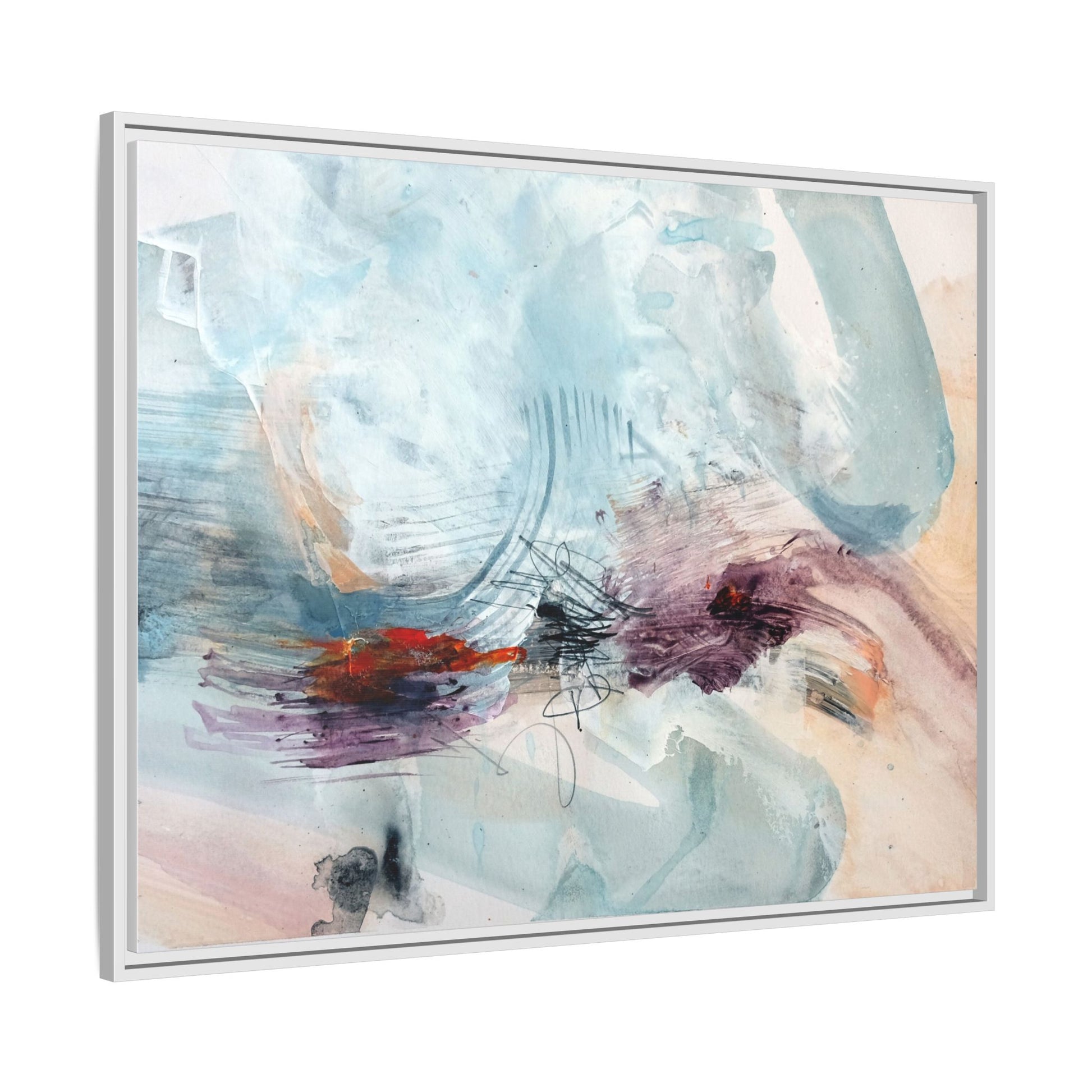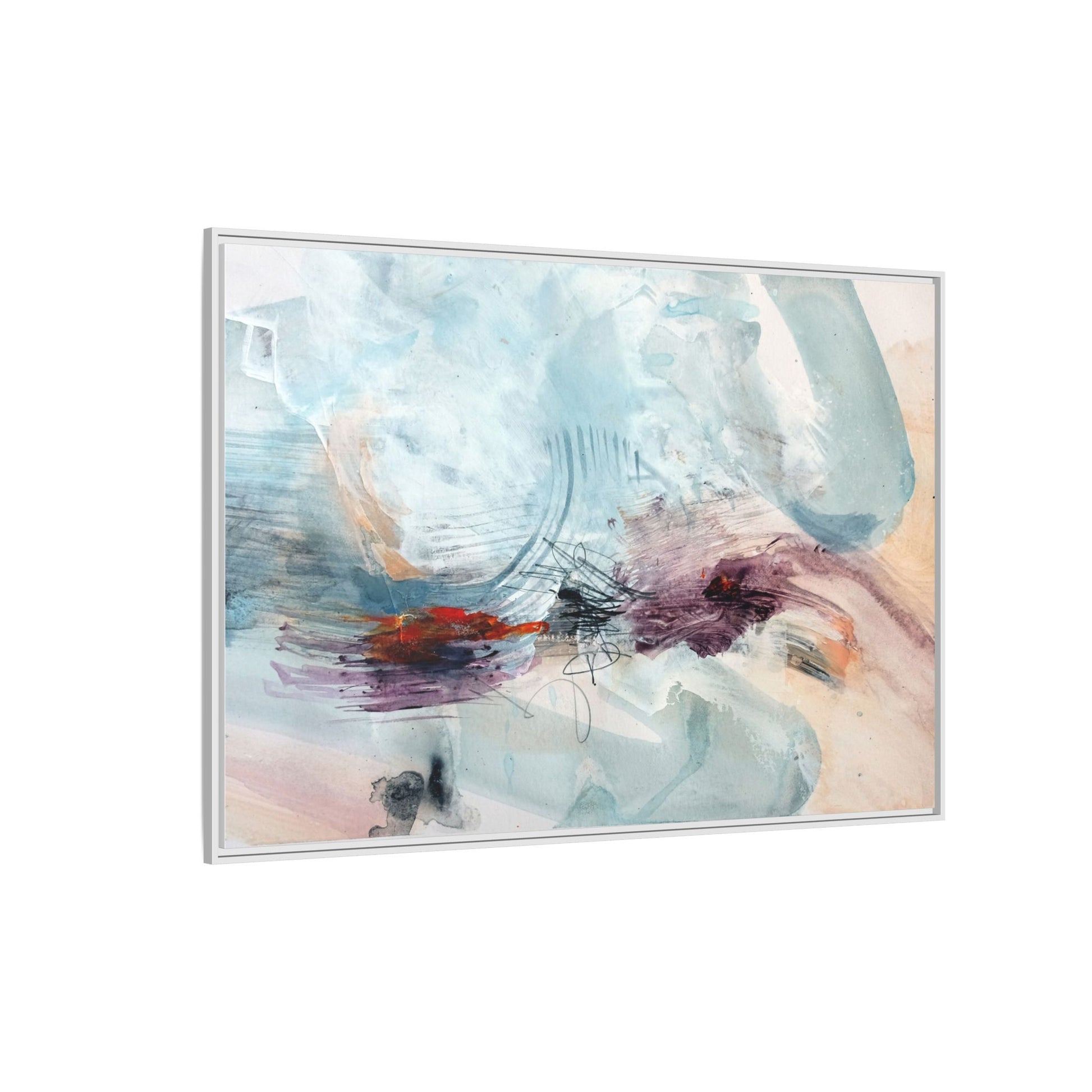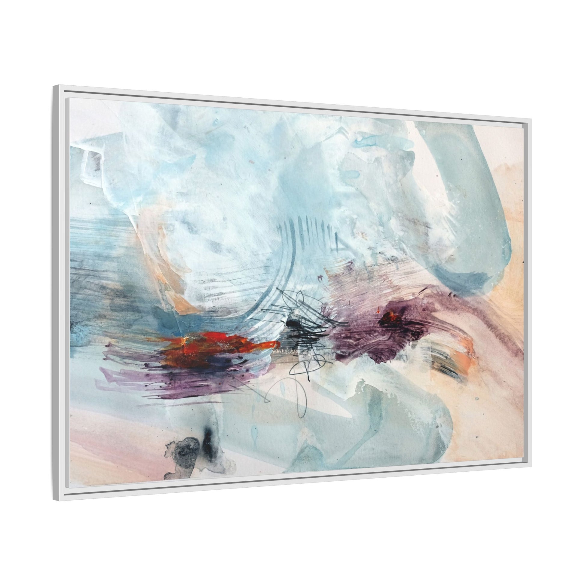 This captivating abstract watercolor painting features a delicate composition of soft blue, white, and blush tones intermingled with vibrant touches of red and purple. The artwork showcases fluid, organic brushstrokes that create a sense of movement and ethereal depth across the canvas. Textured layers of translucent watercolor blend and overlap, creating intricate visual passages that draw the viewer's eye through the composition. Bold splashes of crimson and deep purple provide striking contrast against the predominantly cool, pastel background. Gestural line work and subtle graphite marks add additional texture and visual interest to this evocative, contemporary abstract piece.