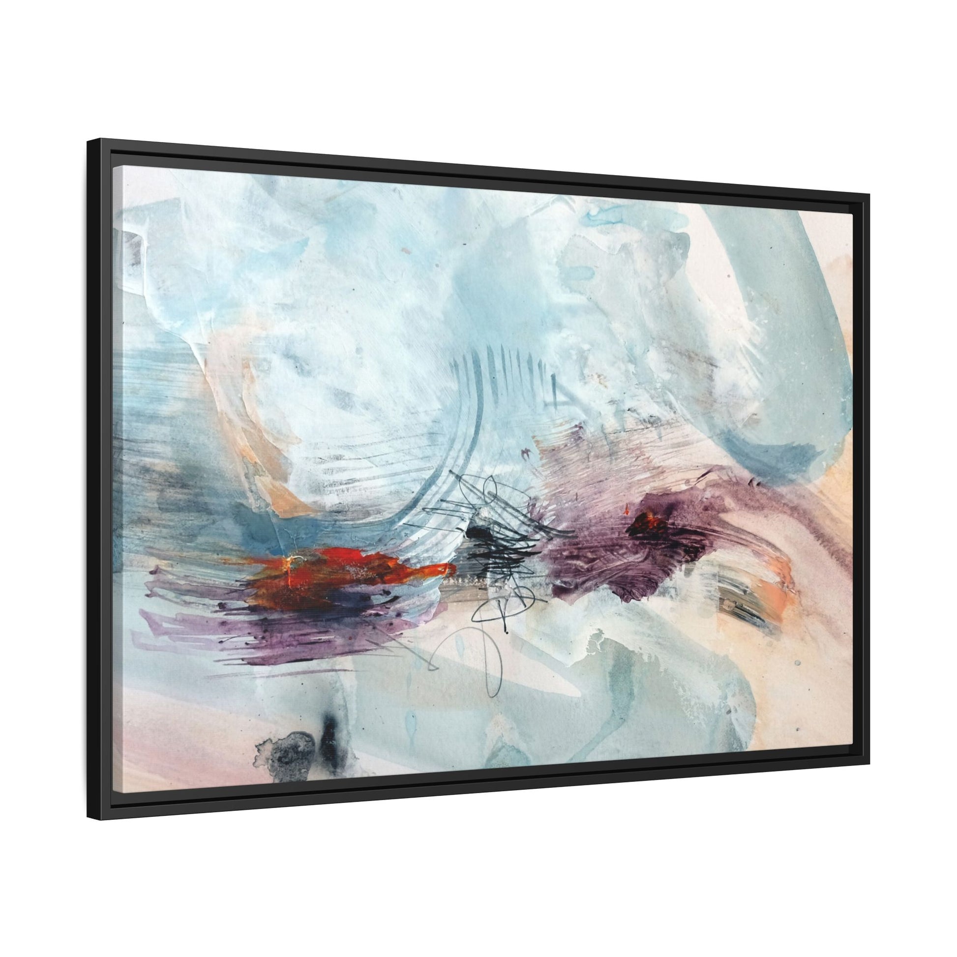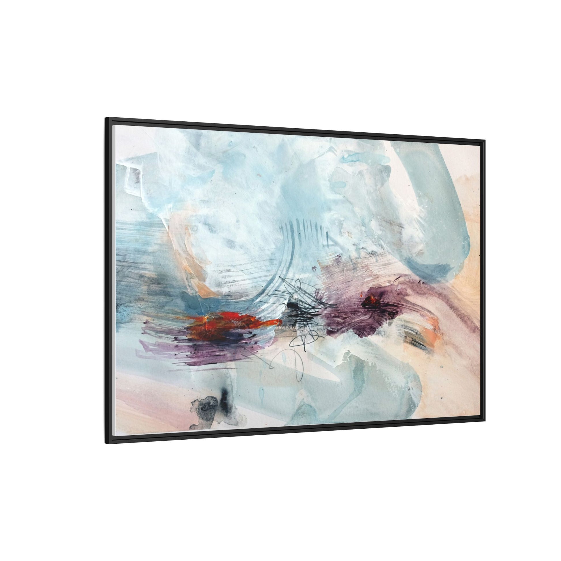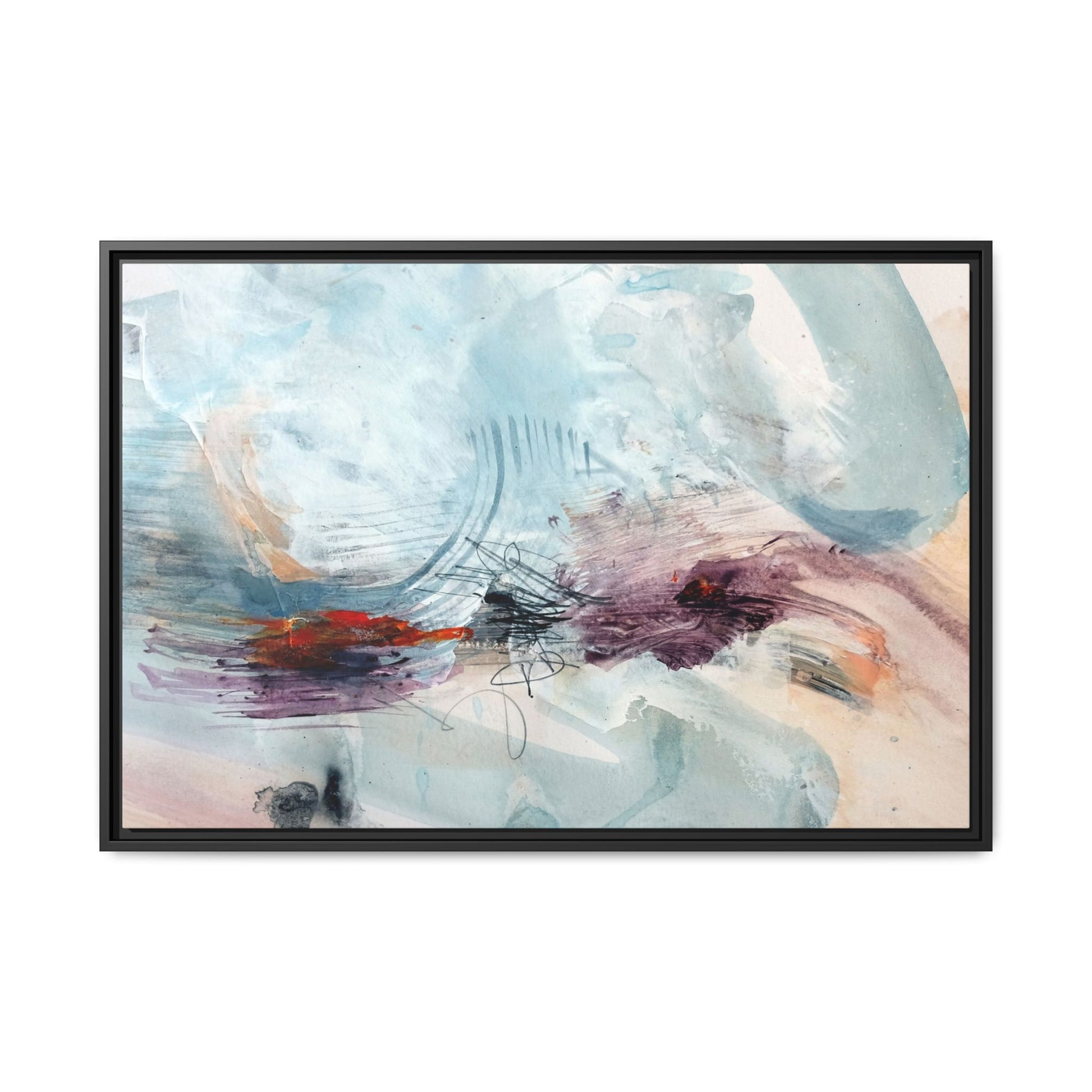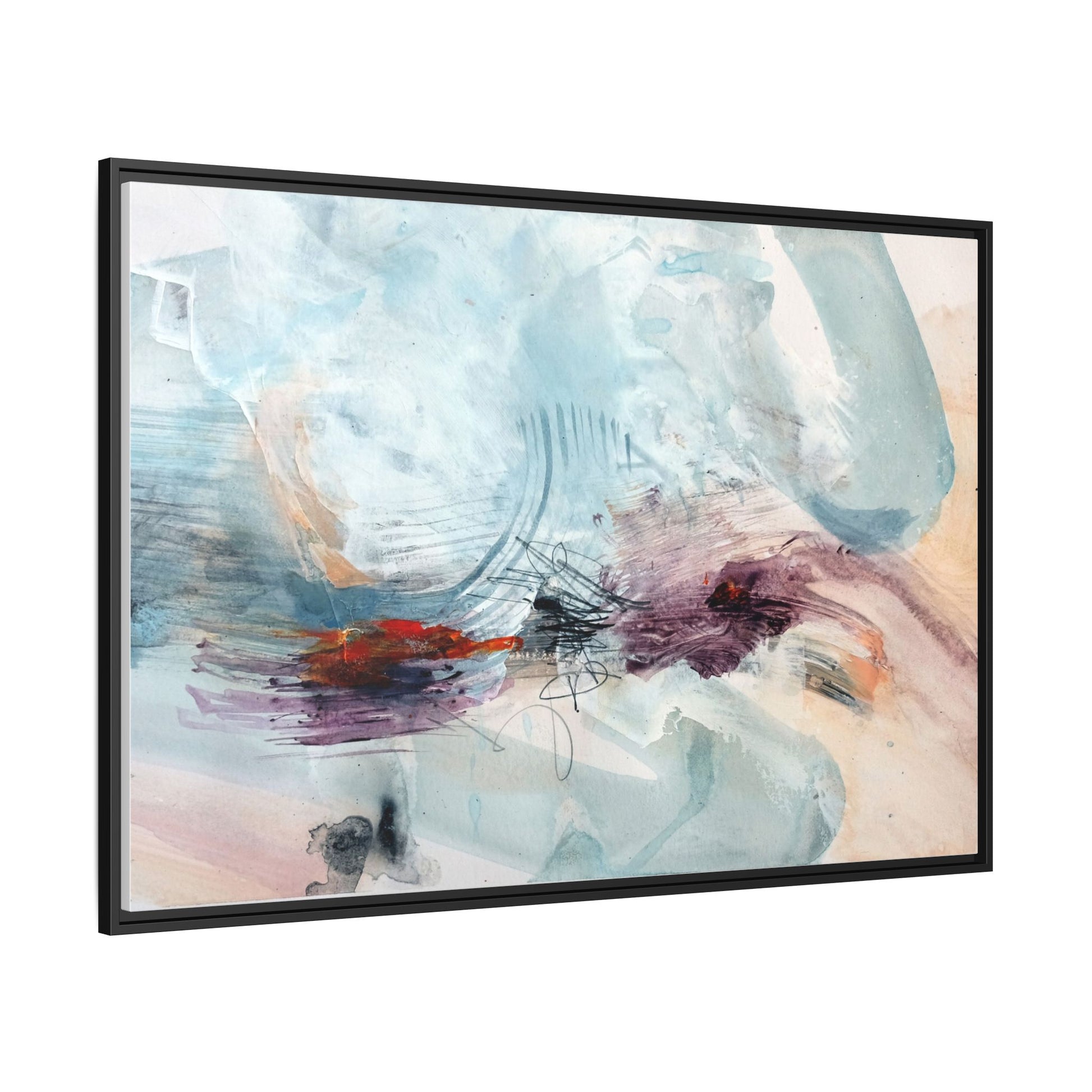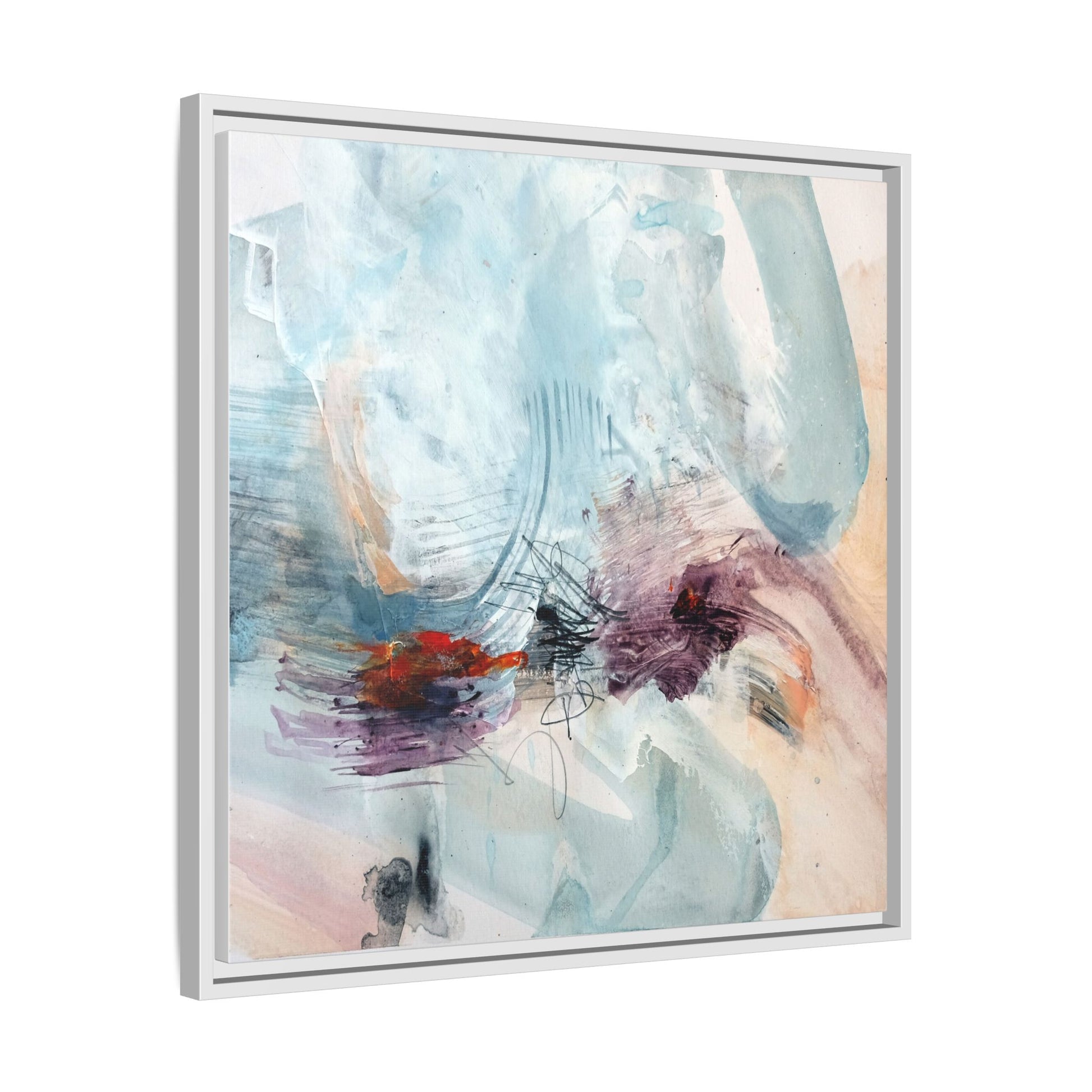 This captivating abstract watercolor painting features a delicate composition of soft blue, white, and blush tones intermingled with vibrant touches of red and purple. The artwork showcases fluid, organic brushstrokes that create a sense of movement and ethereal depth across the canvas. Textured layers of translucent watercolor blend and overlap, creating intricate visual passages that draw the viewer's eye through the composition. Bold splashes of crimson and deep purple provide striking contrast against the predominantly cool, pastel background. Gestural line work and subtle graphite marks add additional texture and visual interest to this evocative, contemporary abstract piece.