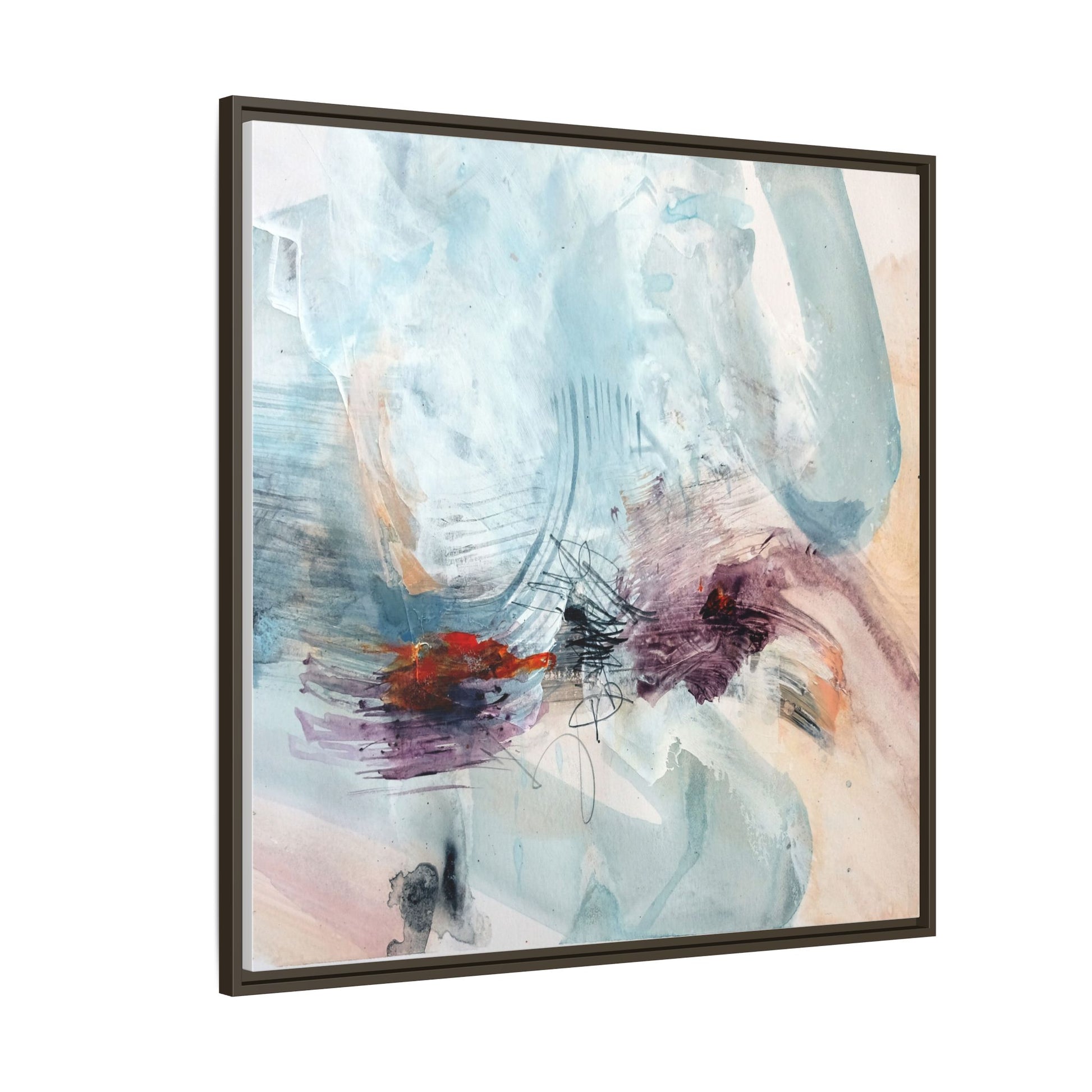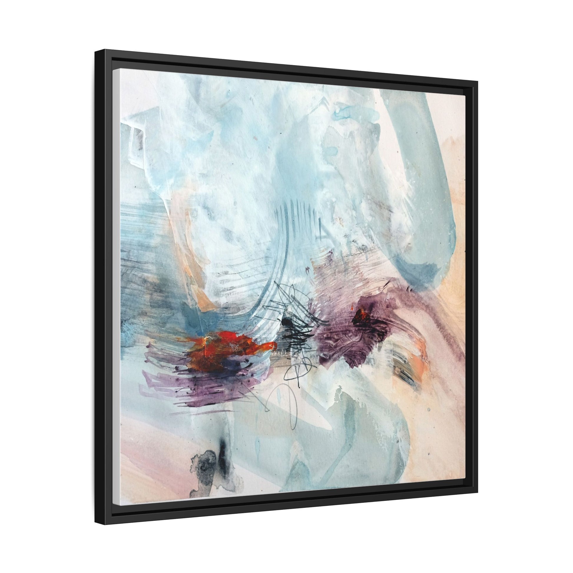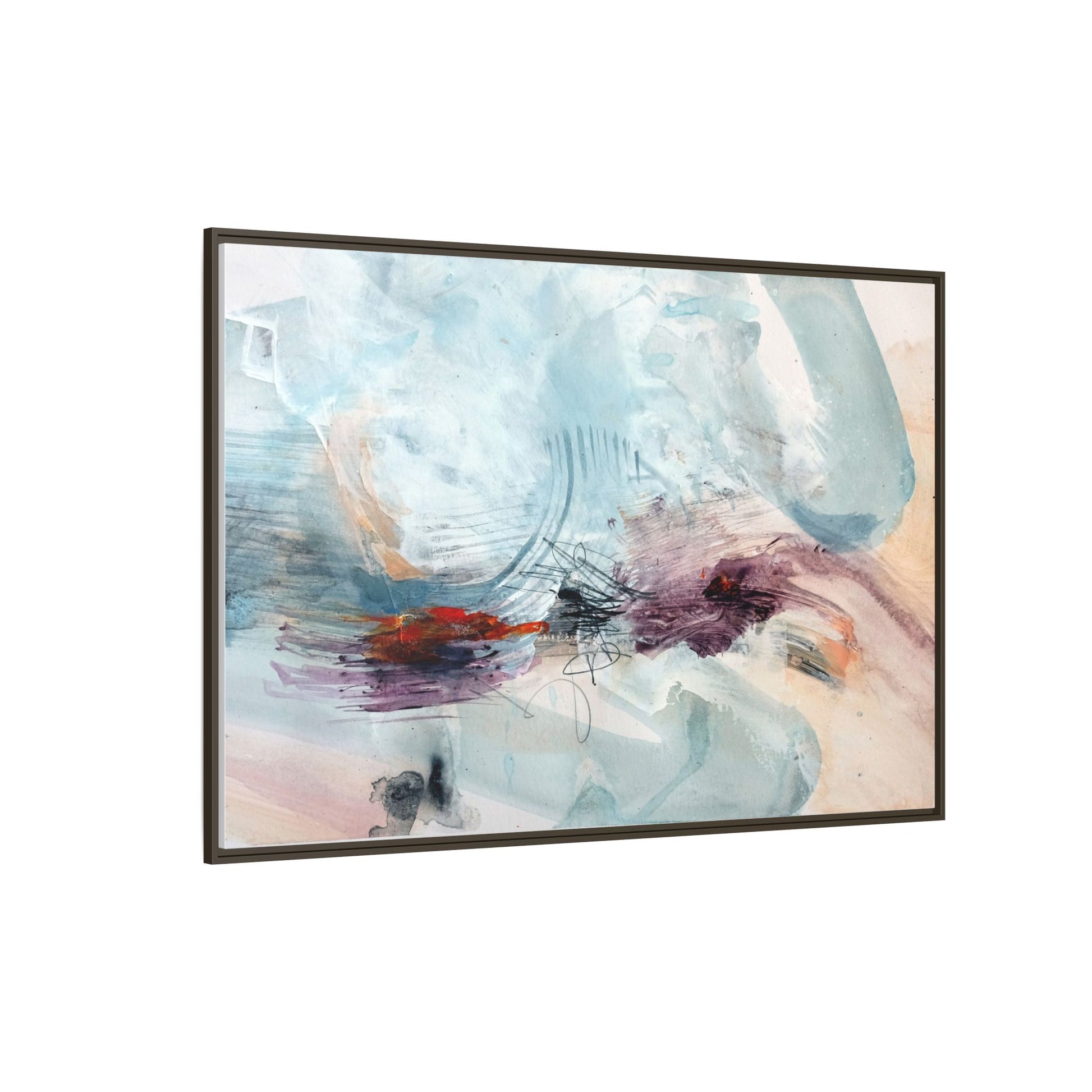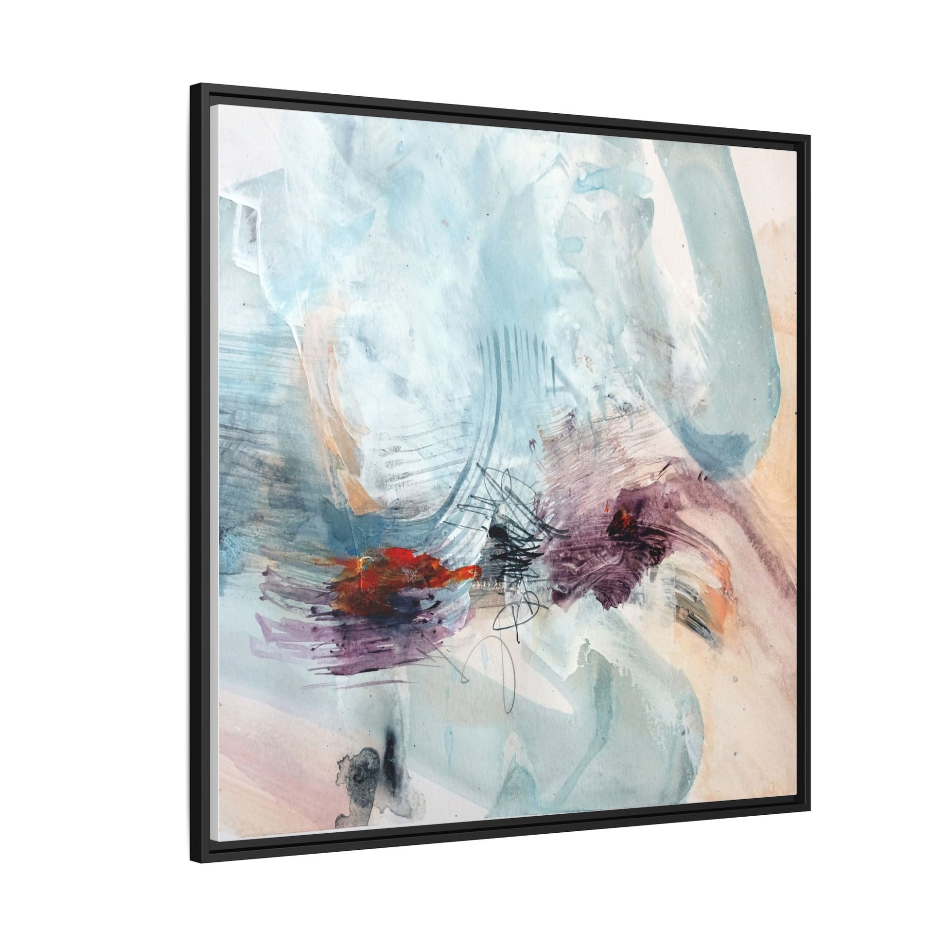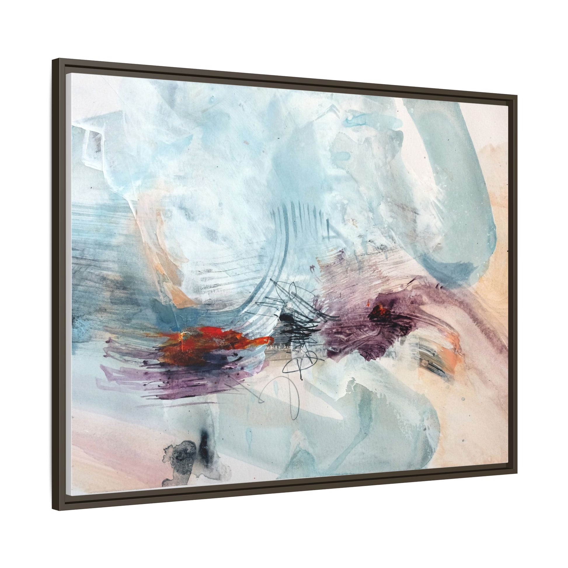 This captivating abstract watercolor painting features a delicate composition of soft blue, white, and blush tones intermingled with vibrant touches of red and purple. The artwork showcases fluid, organic brushstrokes that create a sense of movement and ethereal depth across the canvas. Textured layers of translucent watercolor blend and overlap, creating intricate visual passages that draw the viewer's eye through the composition. Bold splashes of crimson and deep purple provide striking contrast against the predominantly cool, pastel background. Gestural line work and subtle graphite marks add additional texture and visual interest to this evocative, contemporary abstract piece.