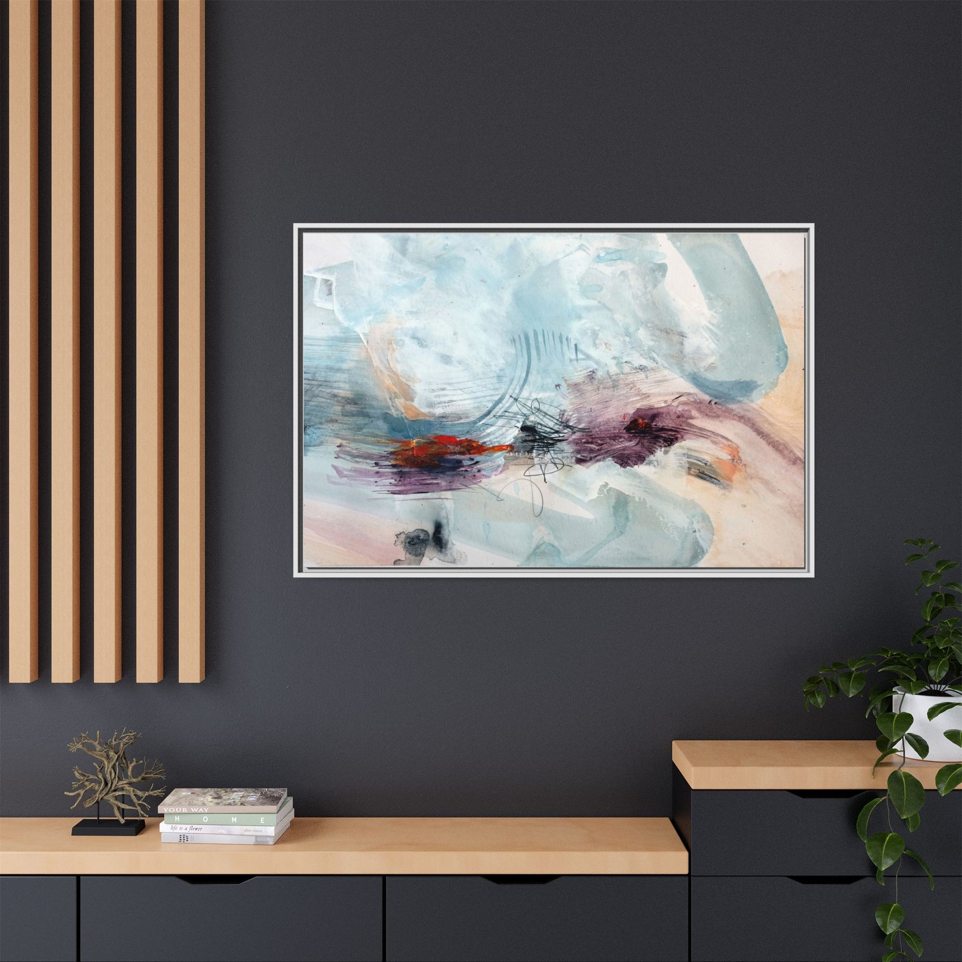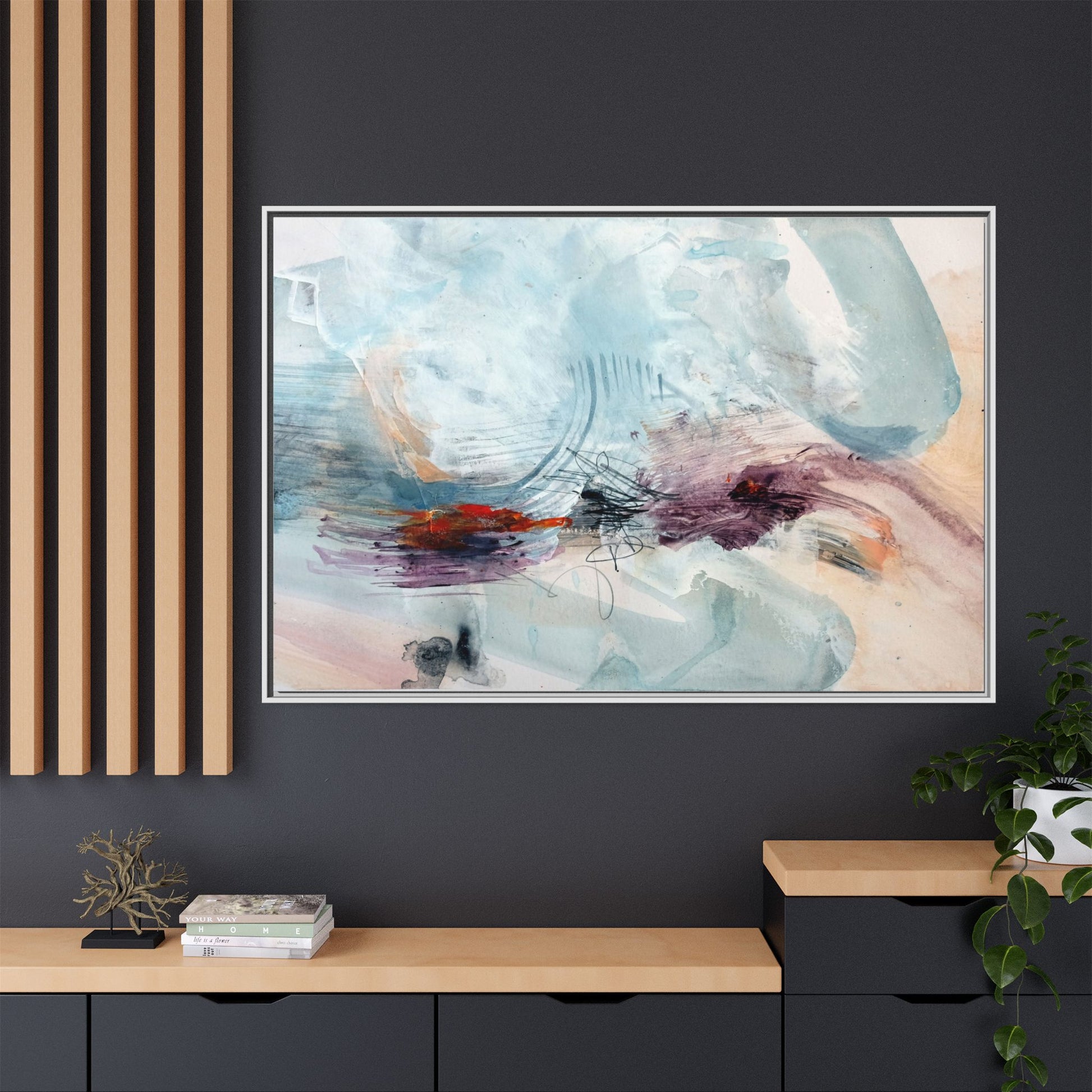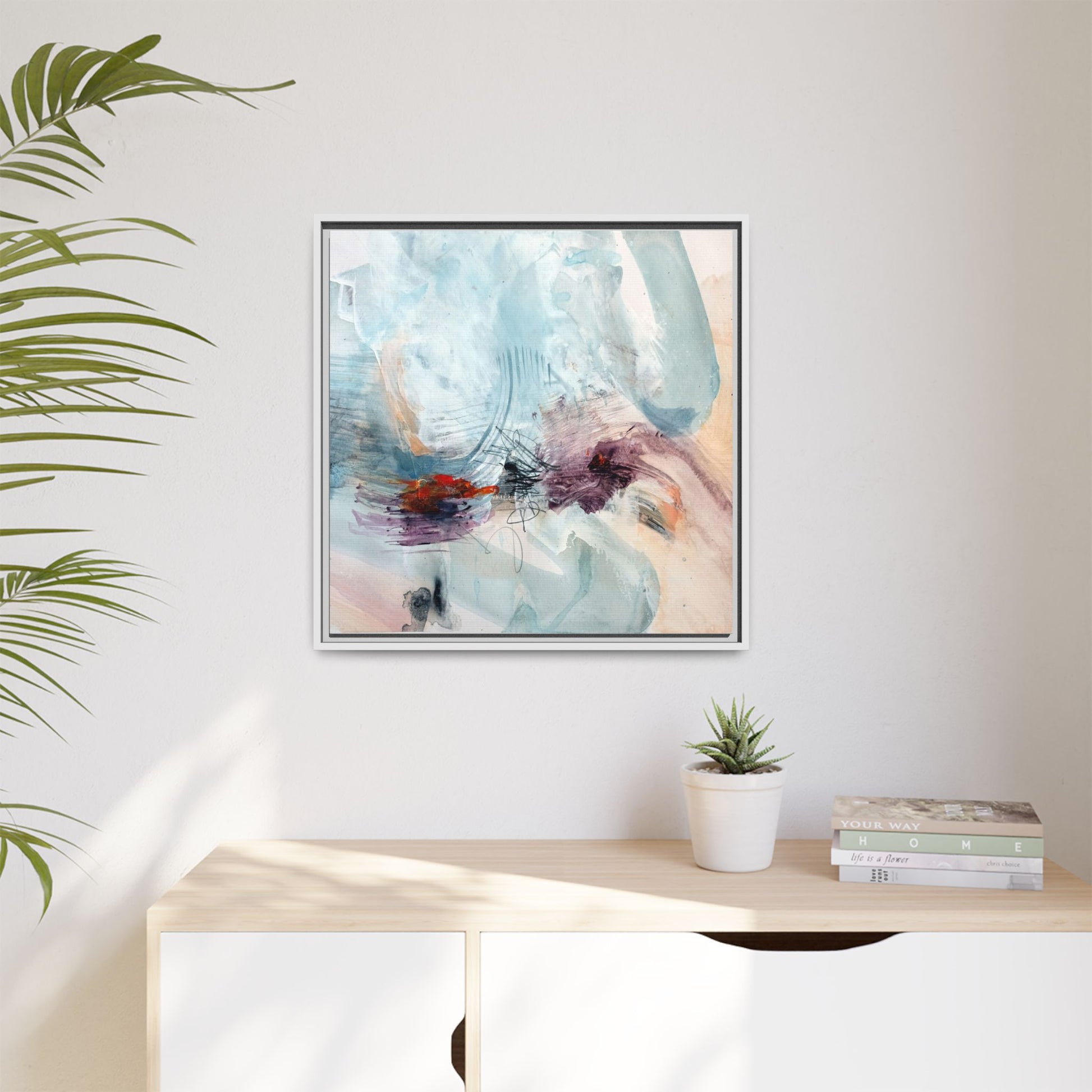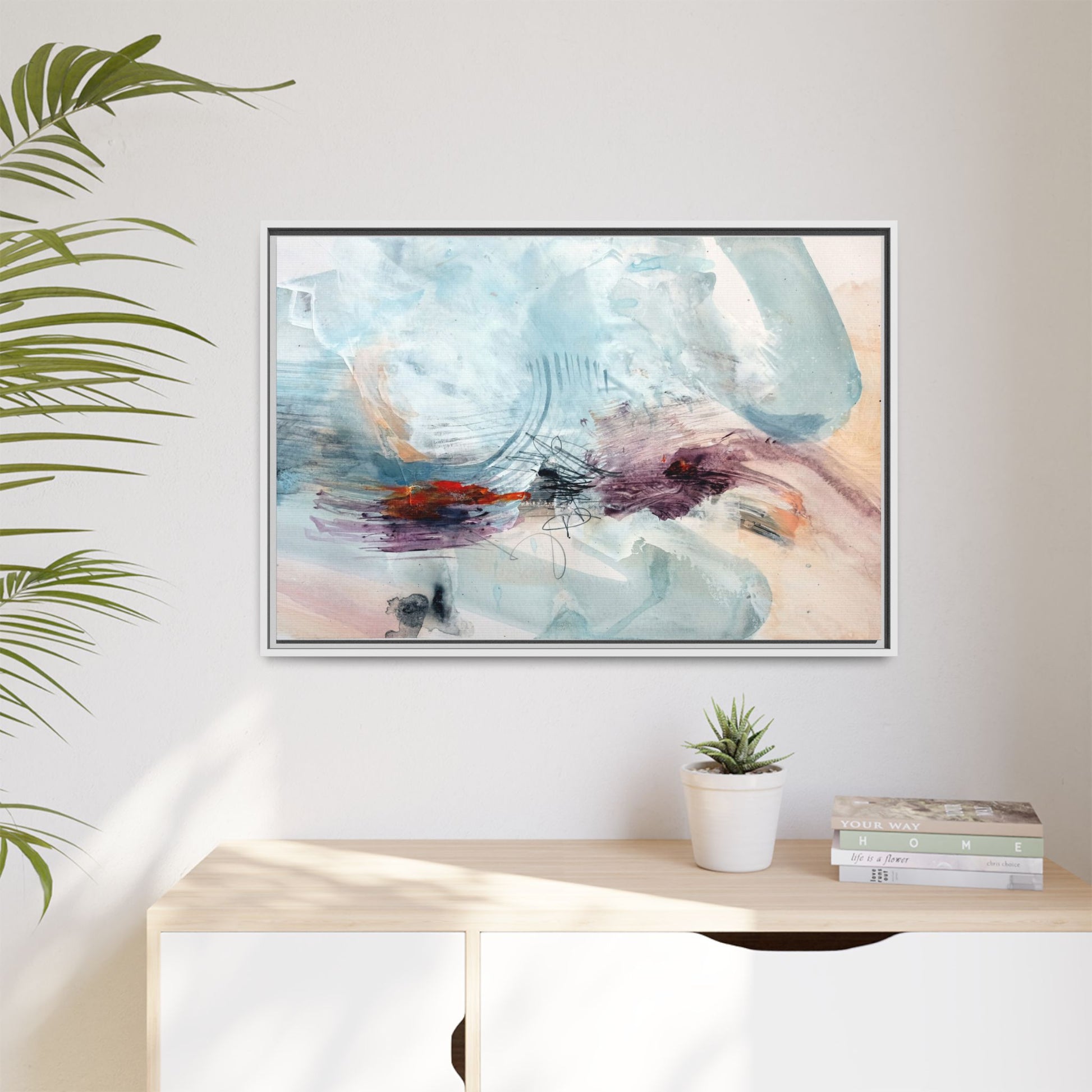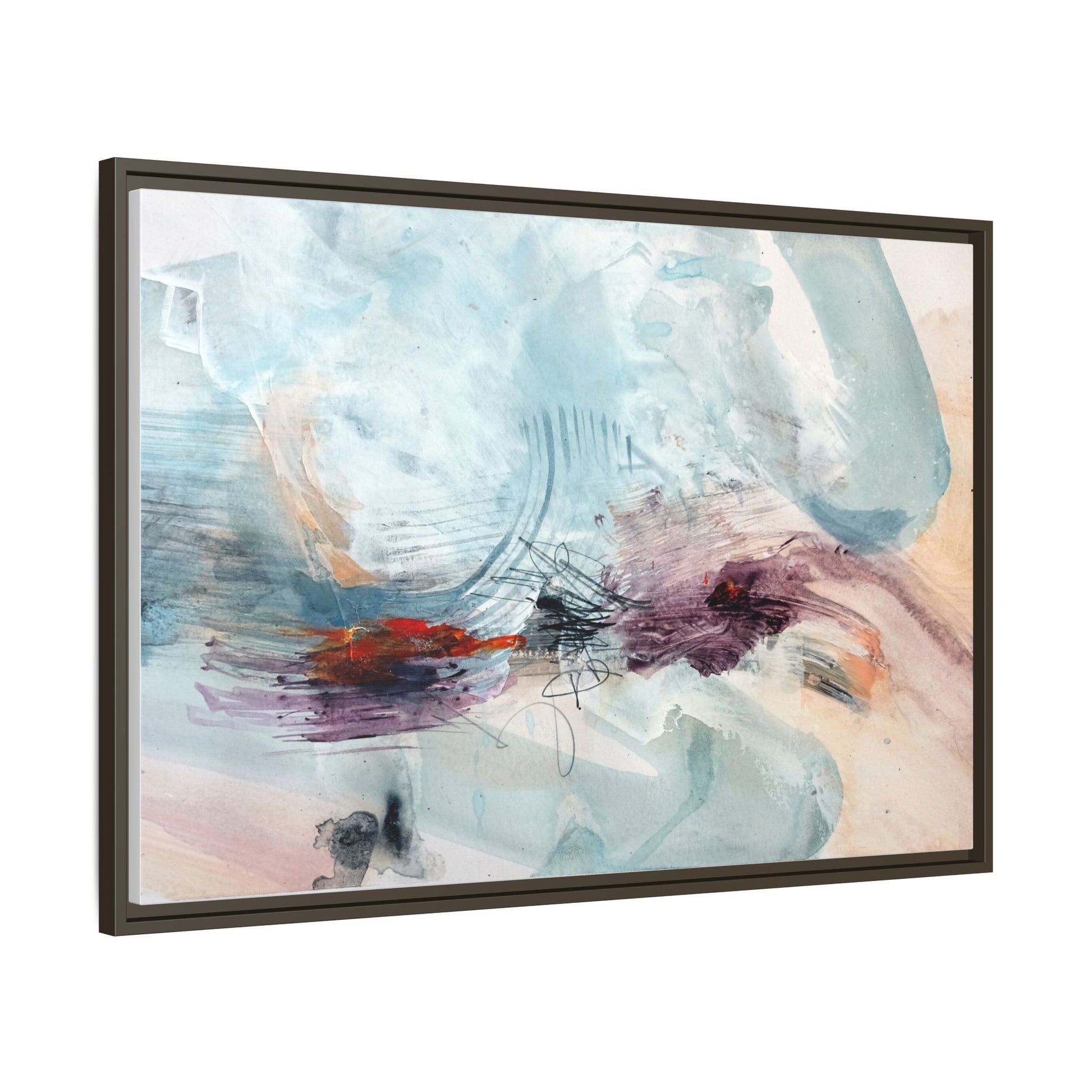 This captivating abstract watercolor painting features a delicate composition of soft blue, white, and blush tones intermingled with vibrant touches of red and purple. The artwork showcases fluid, organic brushstrokes that create a sense of movement and ethereal depth across the canvas. Textured layers of translucent watercolor blend and overlap, creating intricate visual passages that draw the viewer's eye through the composition. Bold splashes of crimson and deep purple provide striking contrast against the predominantly cool, pastel background. Gestural line work and subtle graphite marks add additional texture and visual interest to this evocative, contemporary abstract piece.