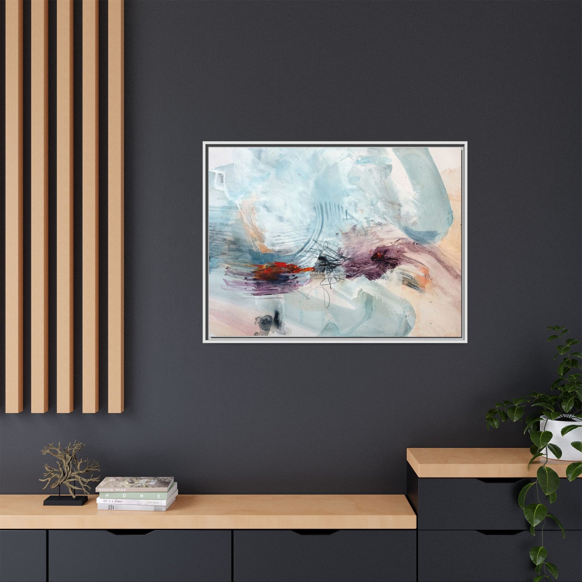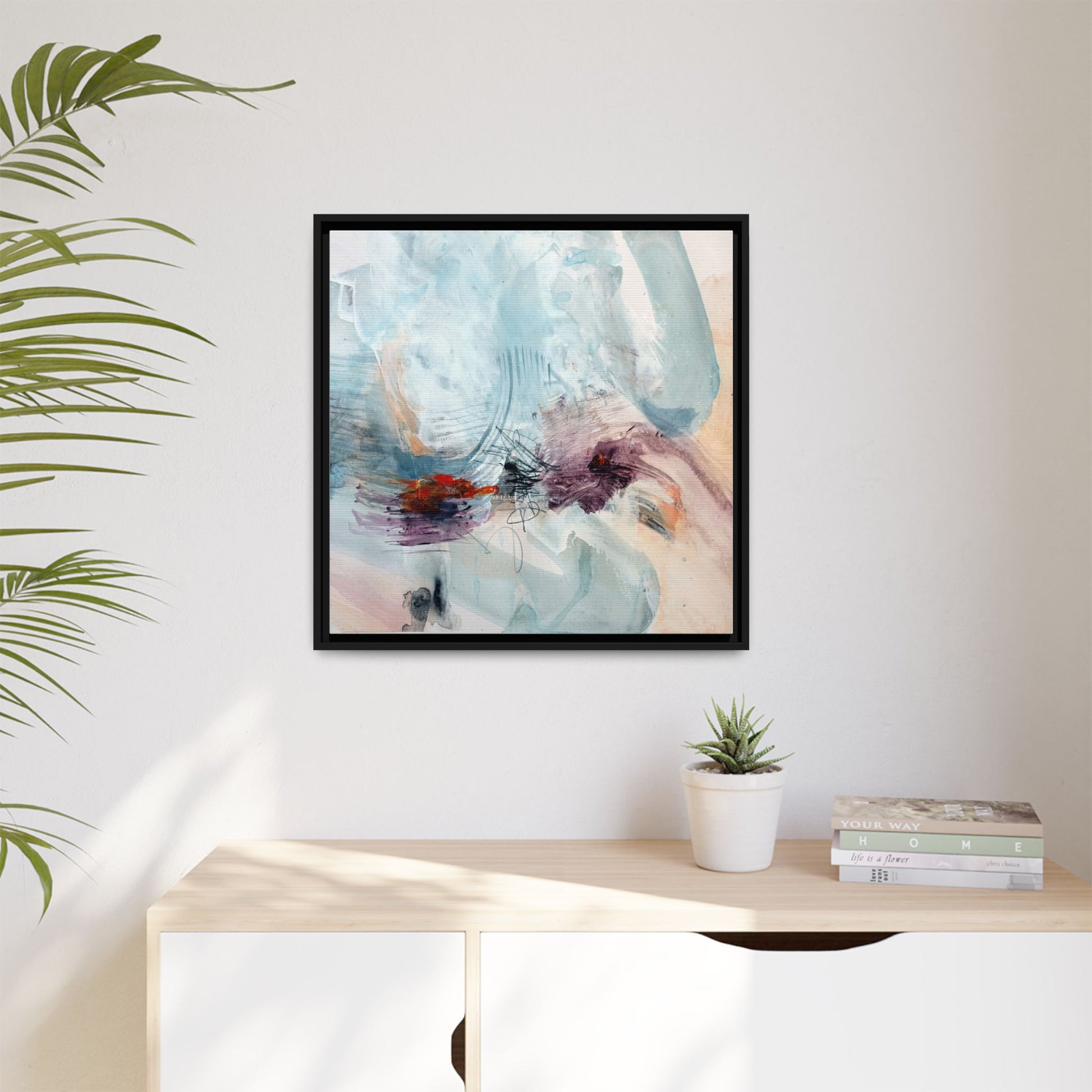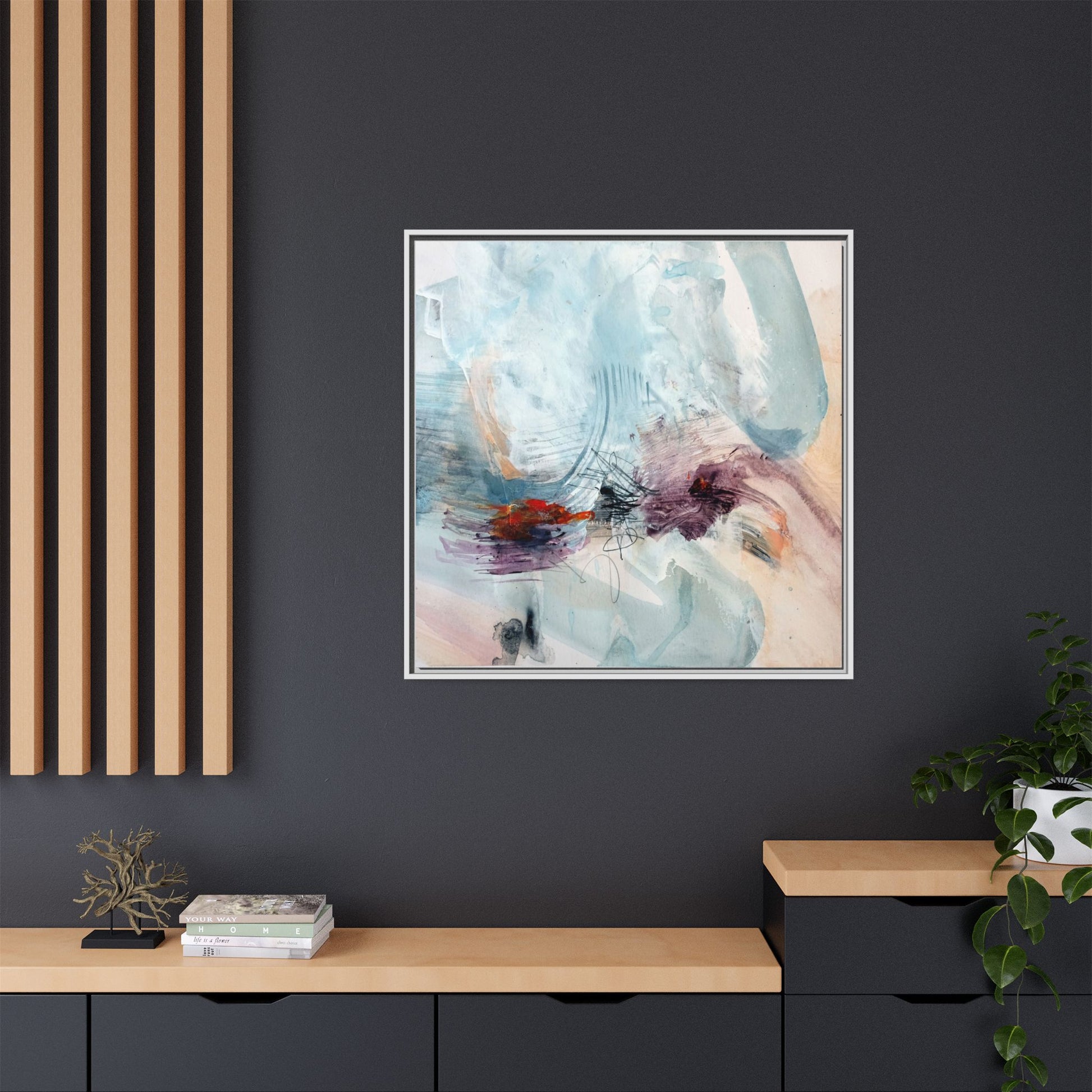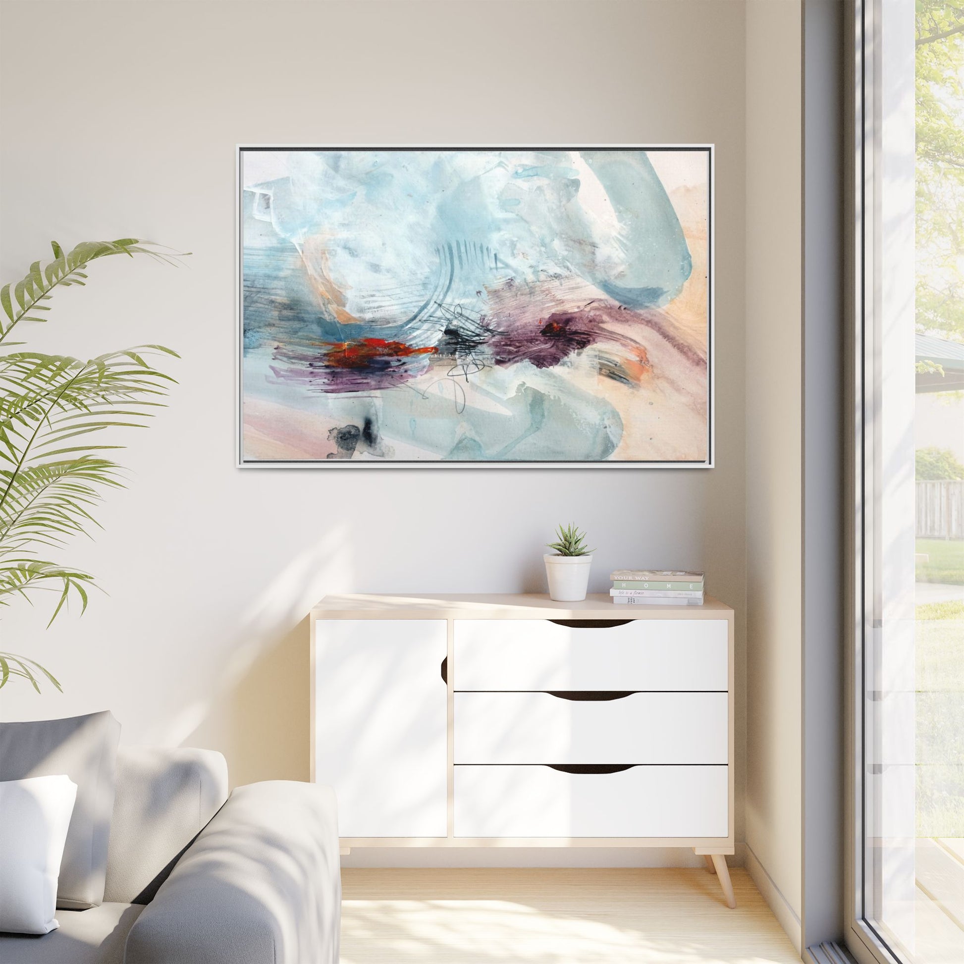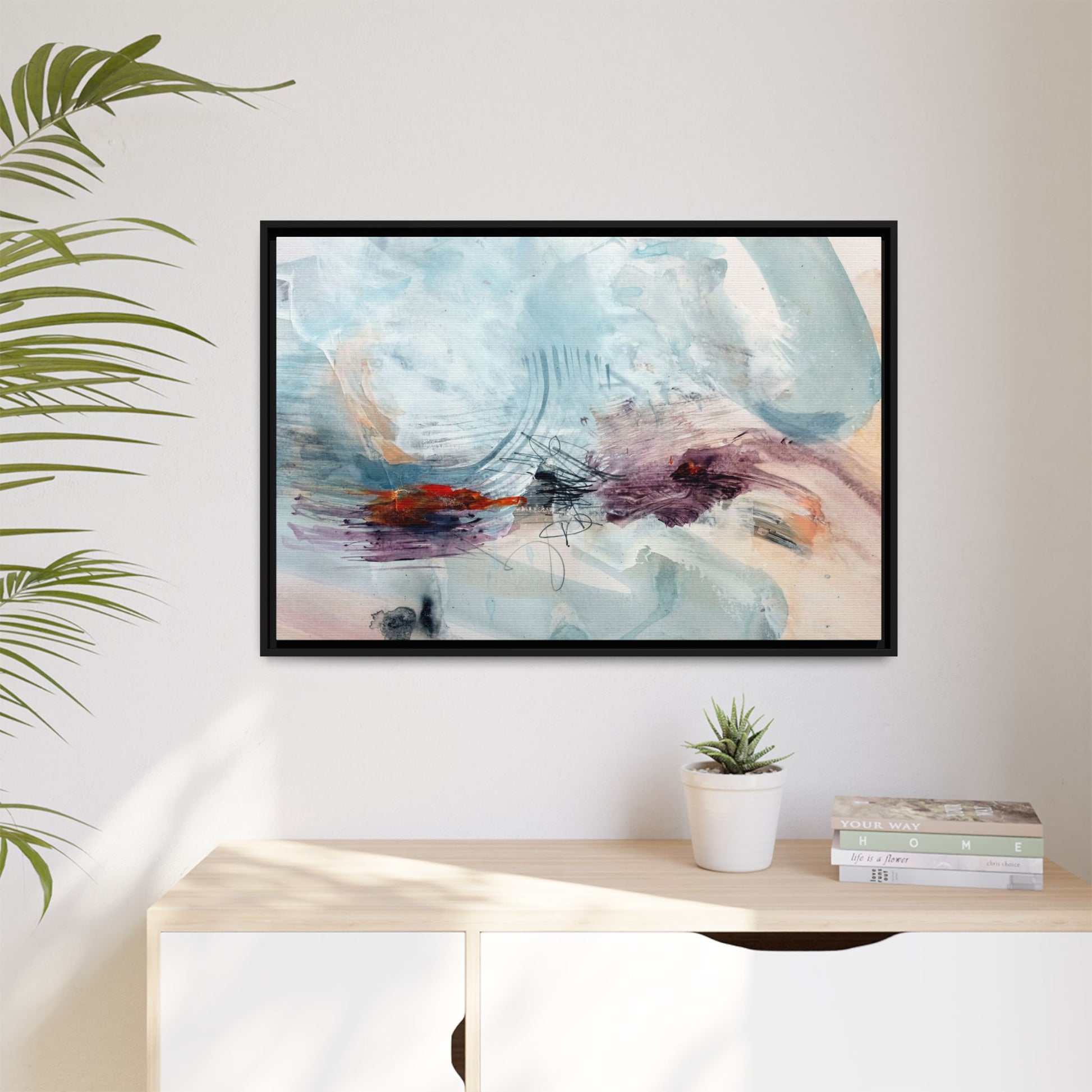 This captivating abstract watercolor painting features a delicate composition of soft blue, white, and blush tones intermingled with vibrant touches of red and purple. The artwork showcases fluid, organic brushstrokes that create a sense of movement and ethereal depth across the canvas. Textured layers of translucent watercolor blend and overlap, creating intricate visual passages that draw the viewer's eye through the composition. Bold splashes of crimson and deep purple provide striking contrast against the predominantly cool, pastel background. Gestural line work and subtle graphite marks add additional texture and visual interest to this evocative, contemporary abstract piece.