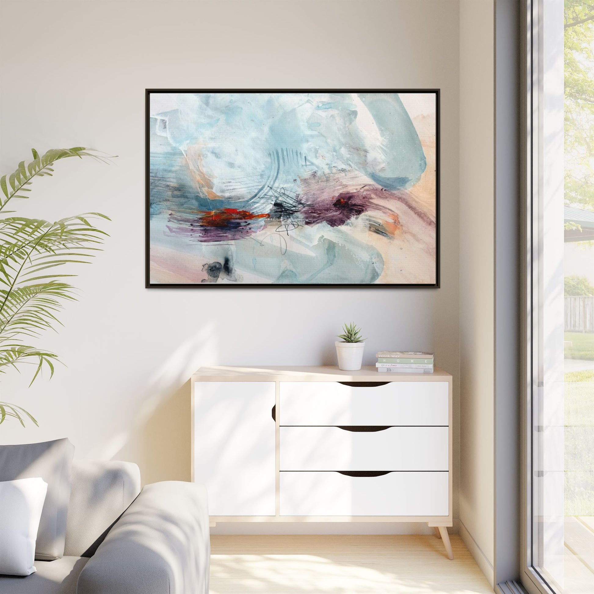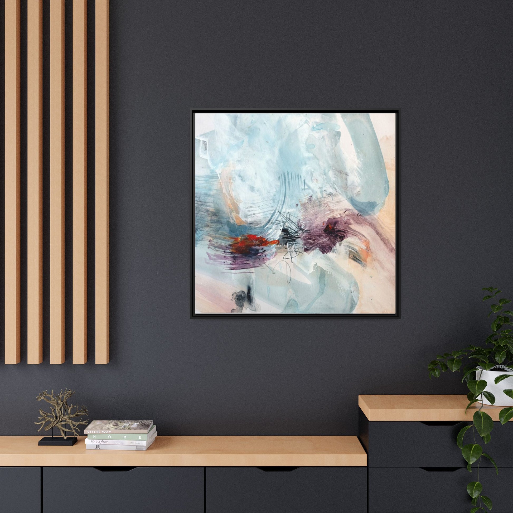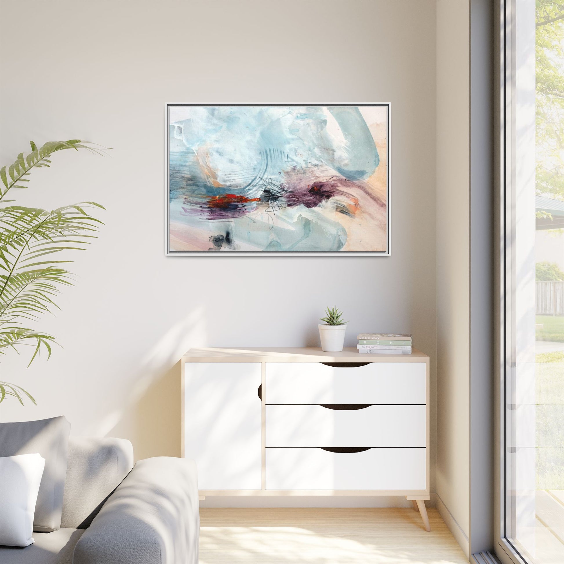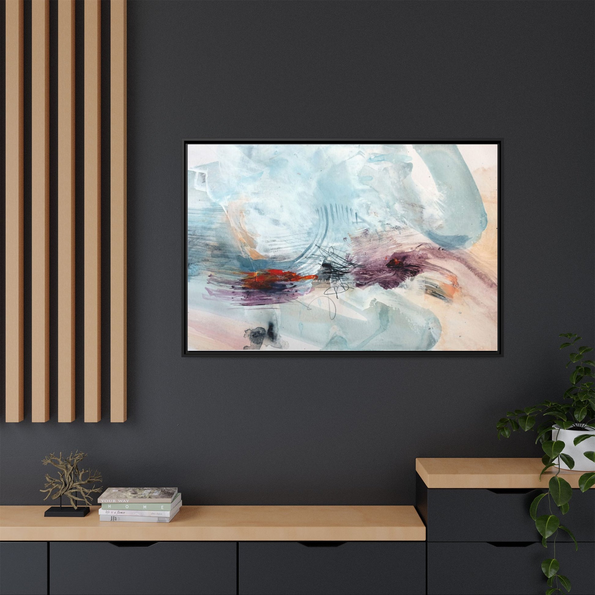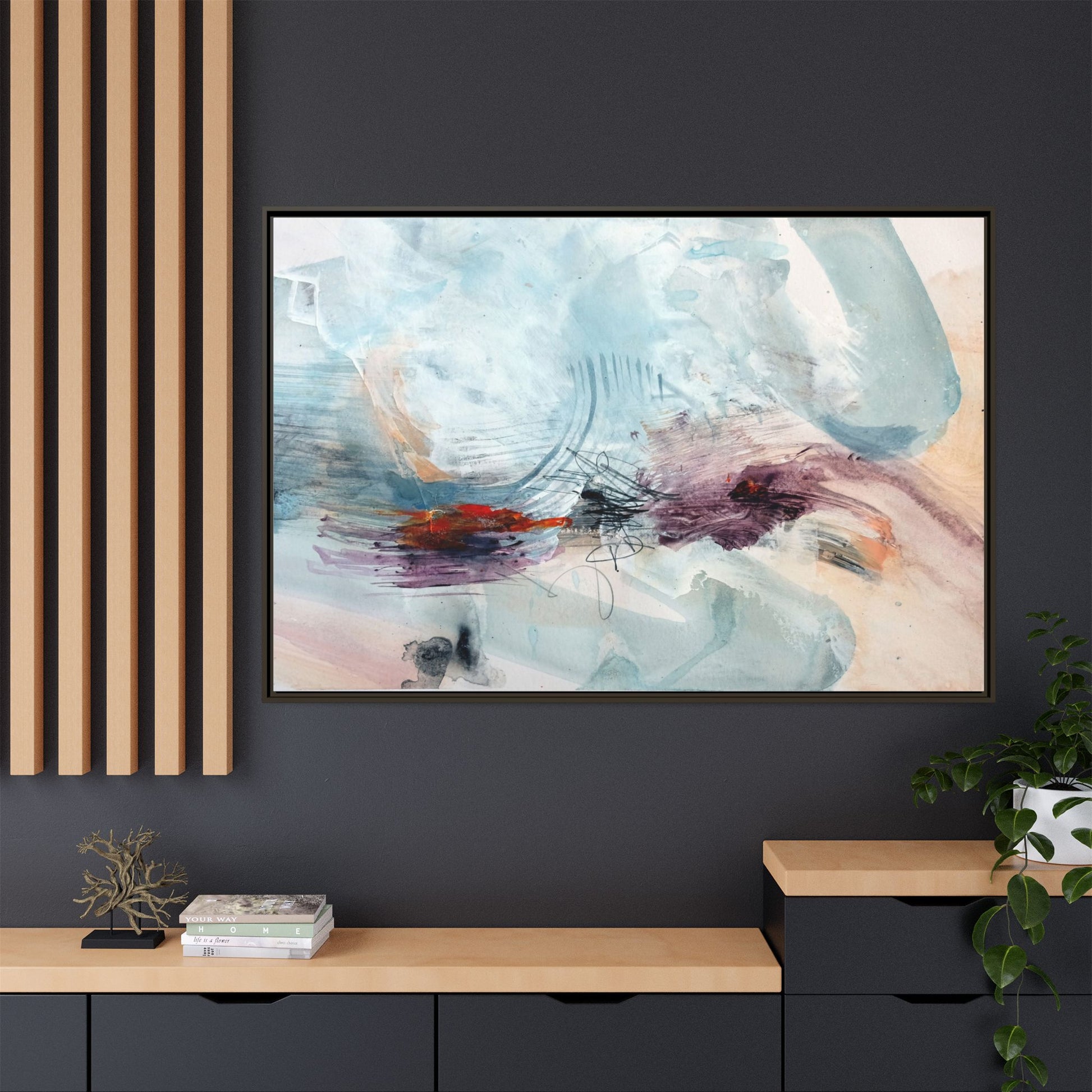 This captivating abstract watercolor painting features a delicate composition of soft blue, white, and blush tones intermingled with vibrant touches of red and purple. The artwork showcases fluid, organic brushstrokes that create a sense of movement and ethereal depth across the canvas. Textured layers of translucent watercolor blend and overlap, creating intricate visual passages that draw the viewer's eye through the composition. Bold splashes of crimson and deep purple provide striking contrast against the predominantly cool, pastel background. Gestural line work and subtle graphite marks add additional texture and visual interest to this evocative, contemporary abstract piece.