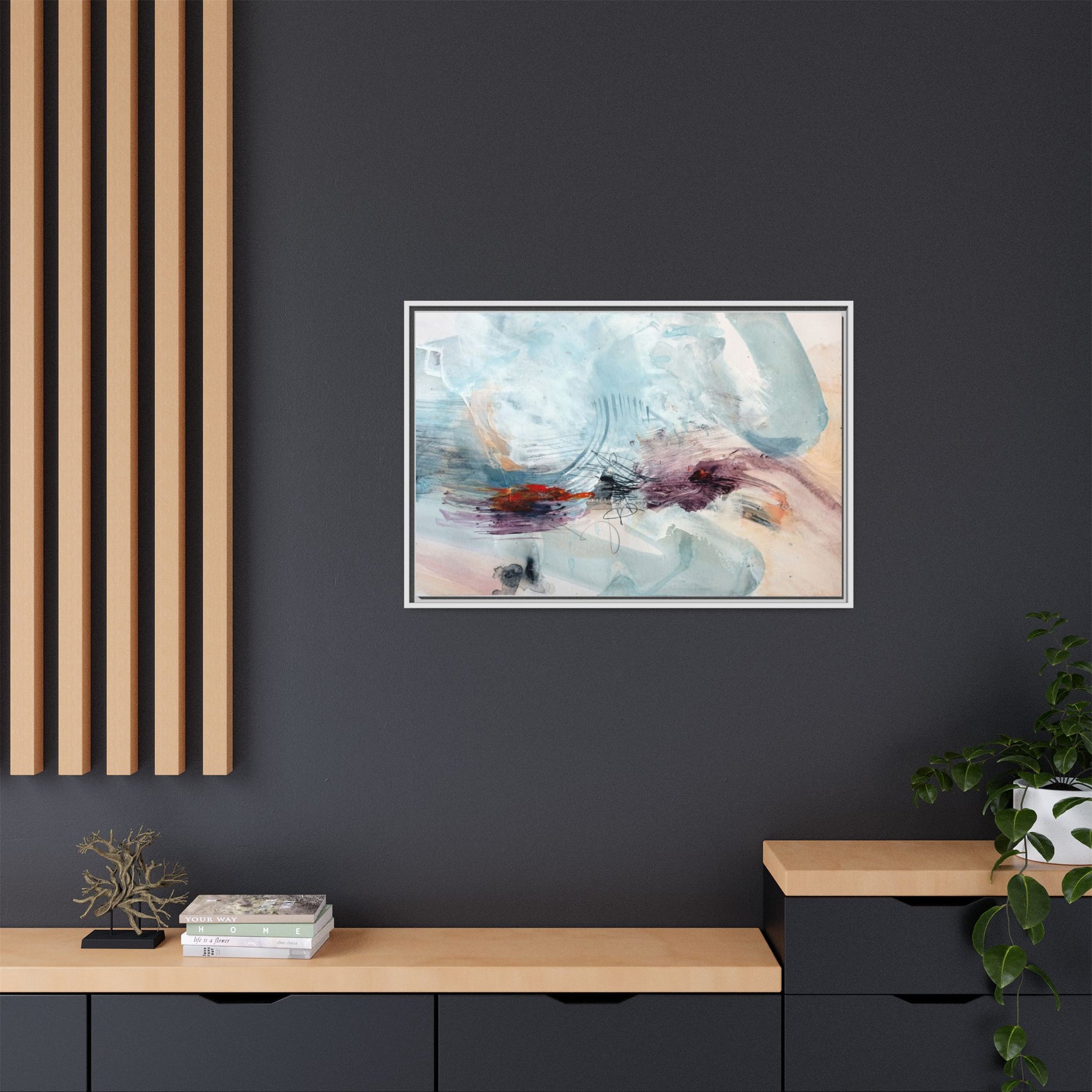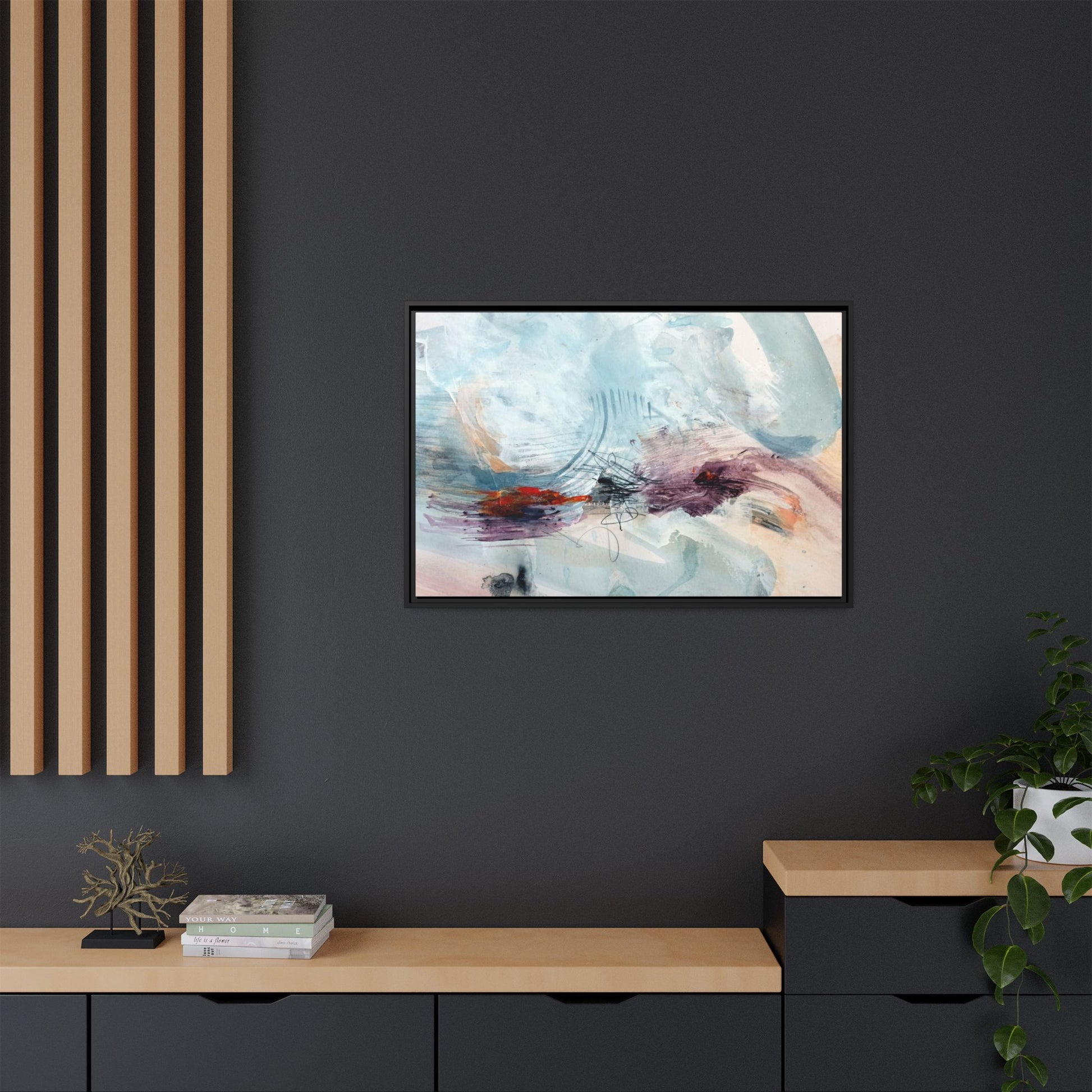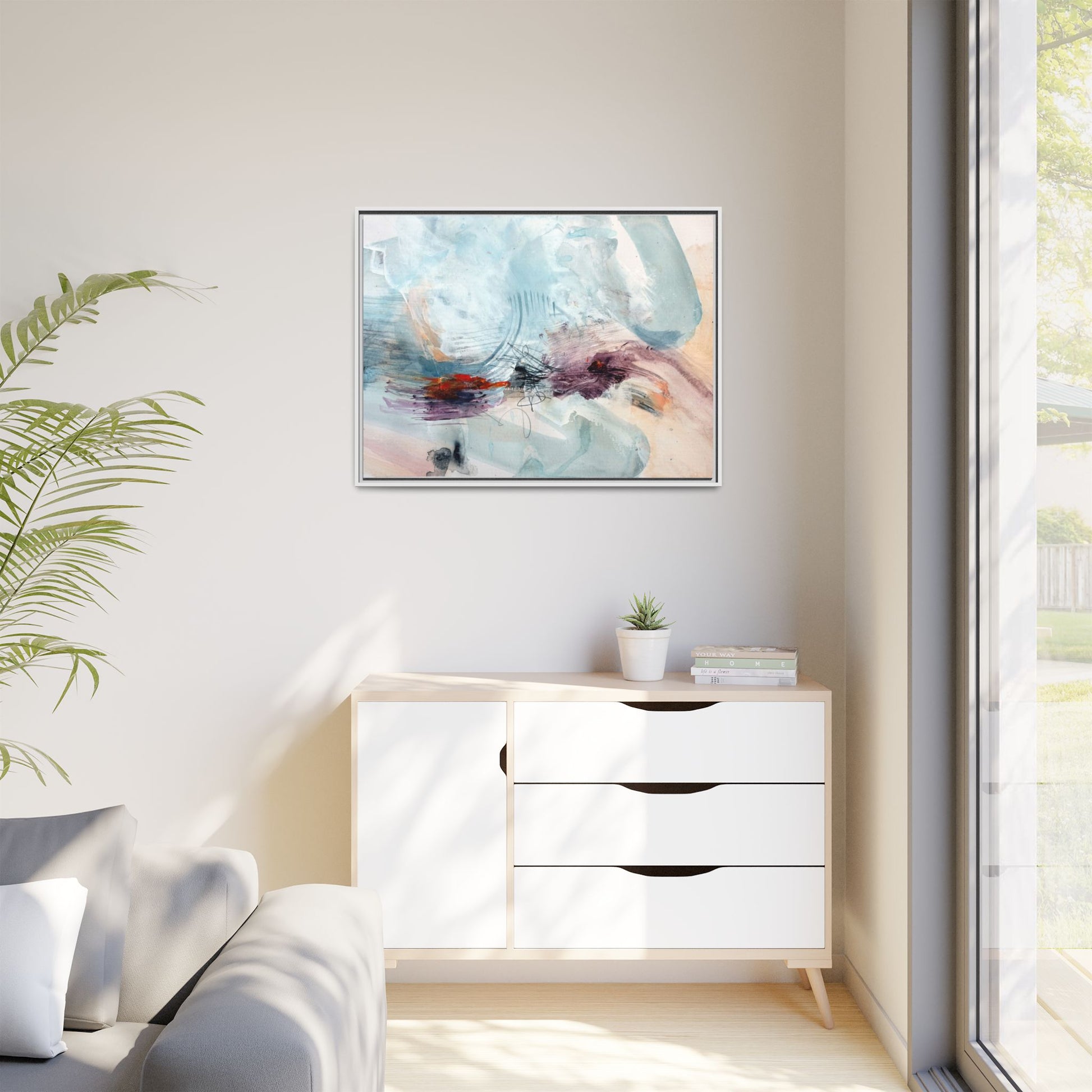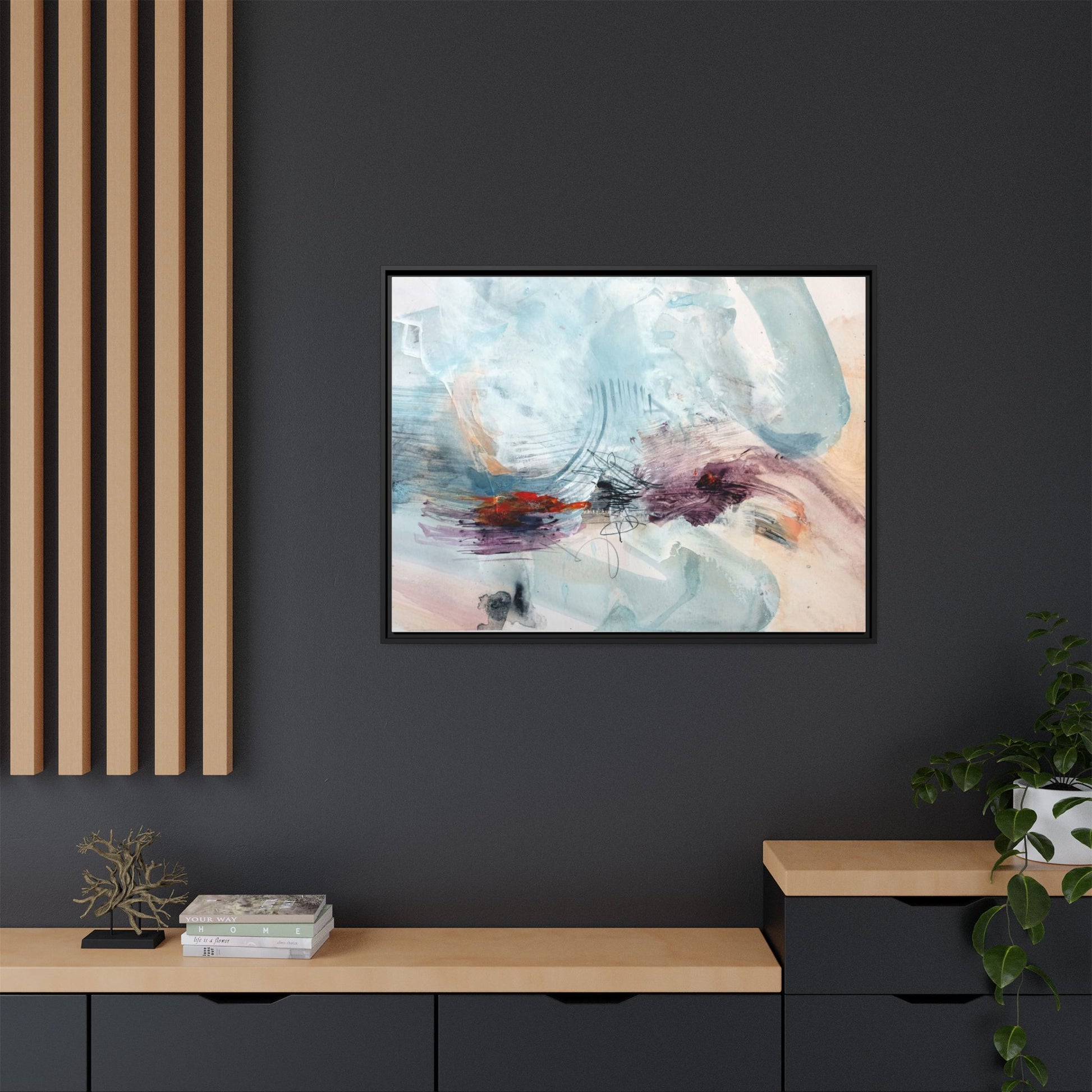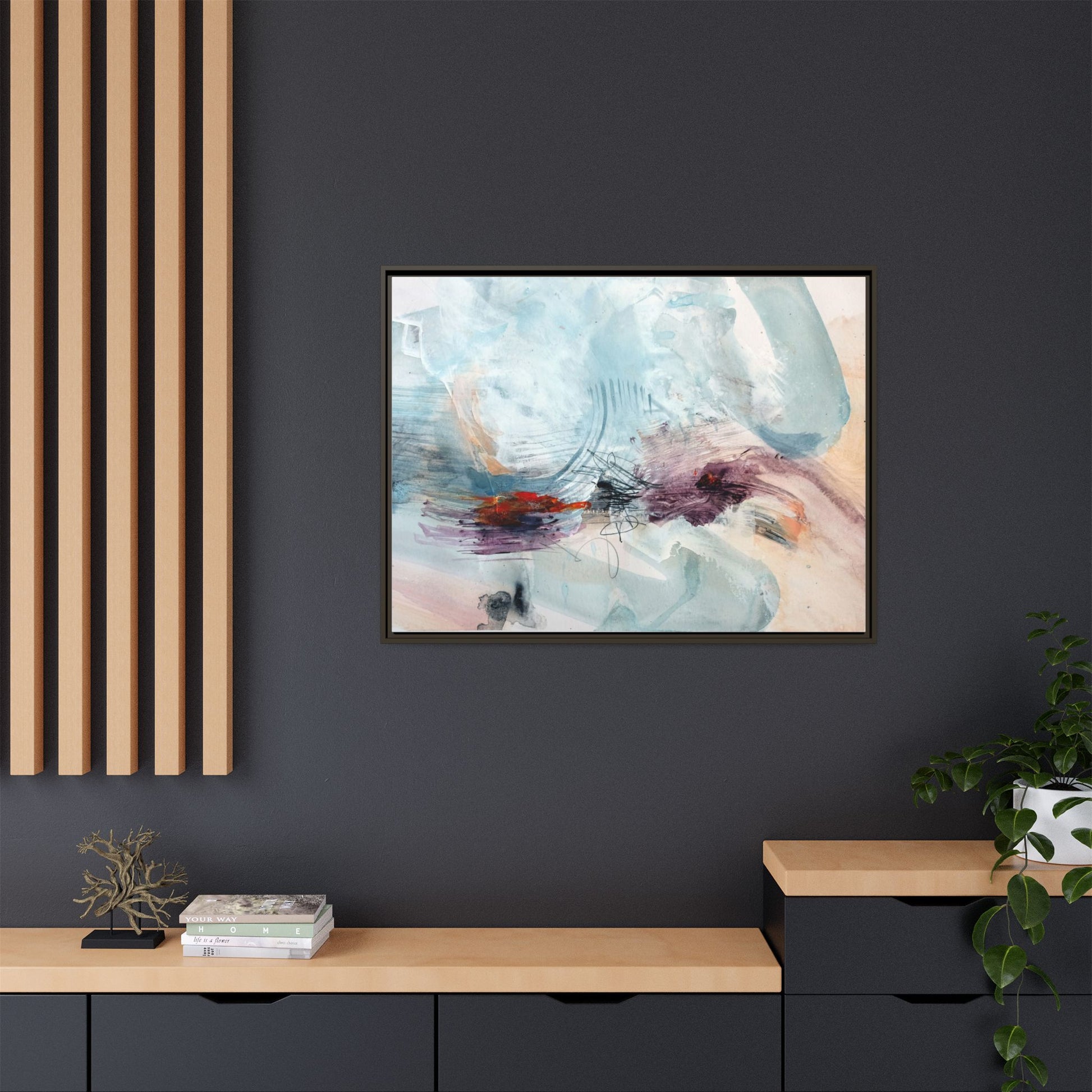 This captivating abstract watercolor painting features a delicate composition of soft blue, white, and blush tones intermingled with vibrant touches of red and purple. The artwork showcases fluid, organic brushstrokes that create a sense of movement and ethereal depth across the canvas. Textured layers of translucent watercolor blend and overlap, creating intricate visual passages that draw the viewer's eye through the composition. Bold splashes of crimson and deep purple provide striking contrast against the predominantly cool, pastel background. Gestural line work and subtle graphite marks add additional texture and visual interest to this evocative, contemporary abstract piece.