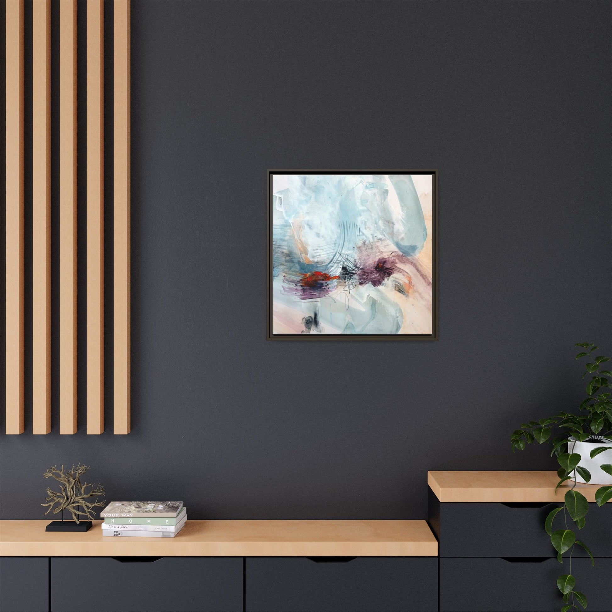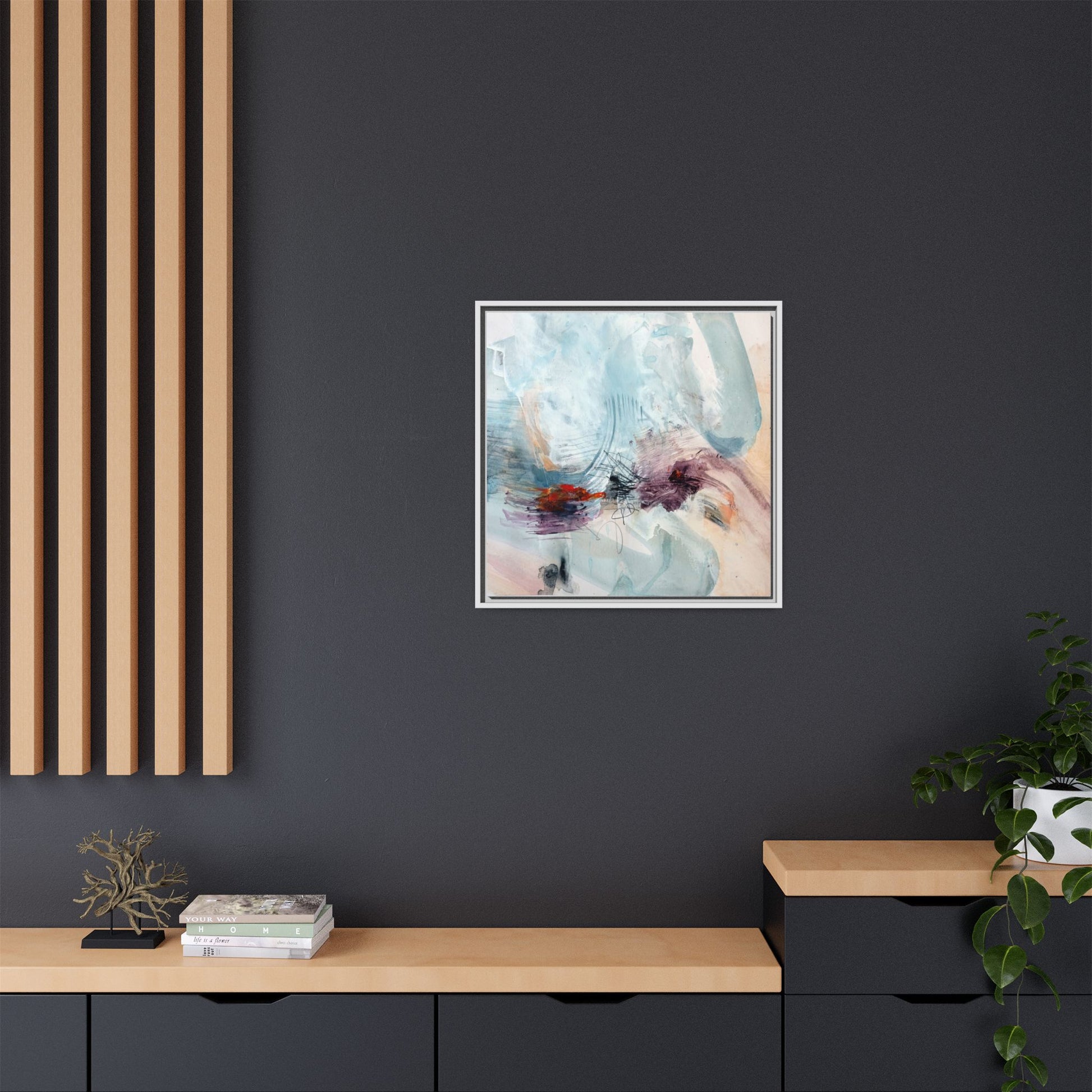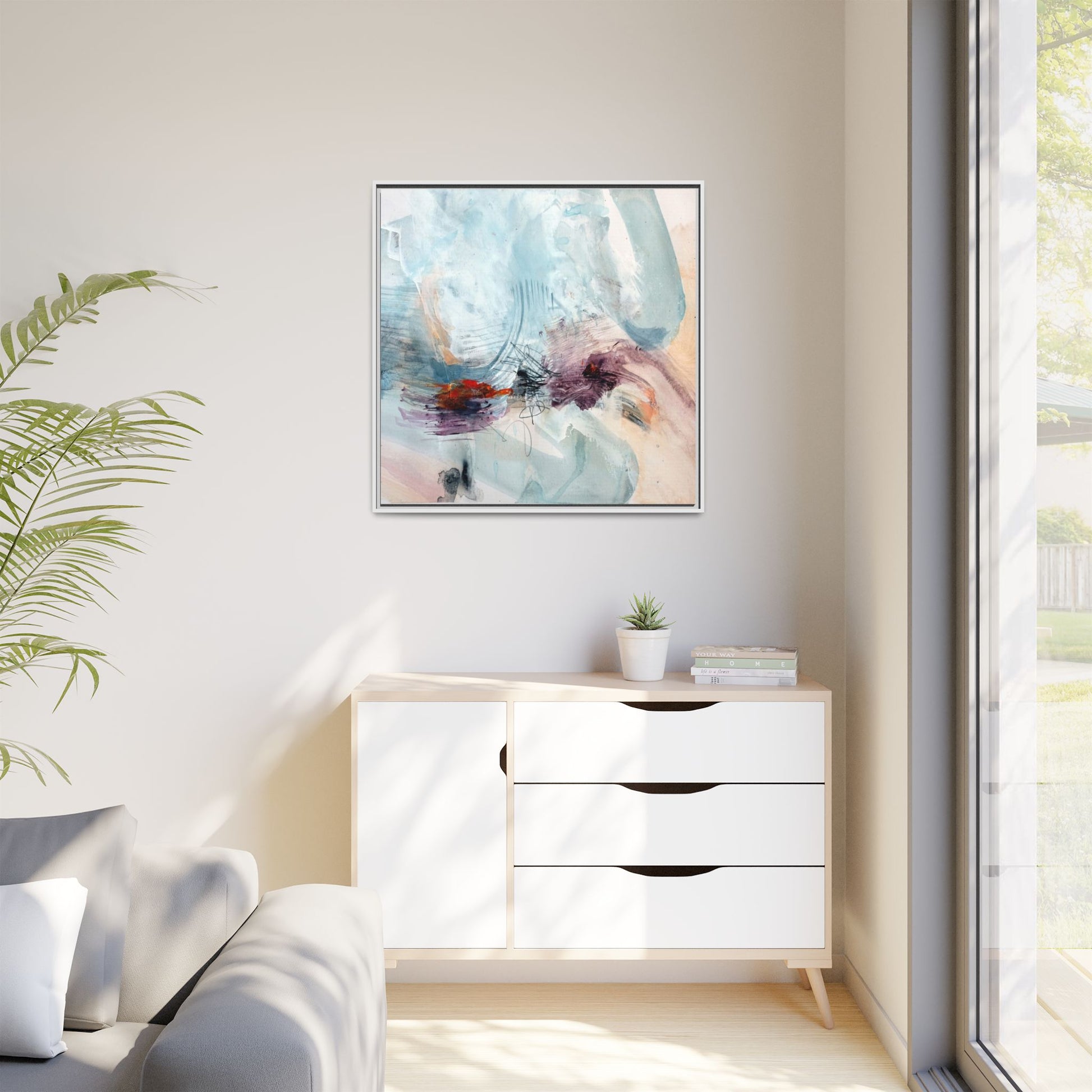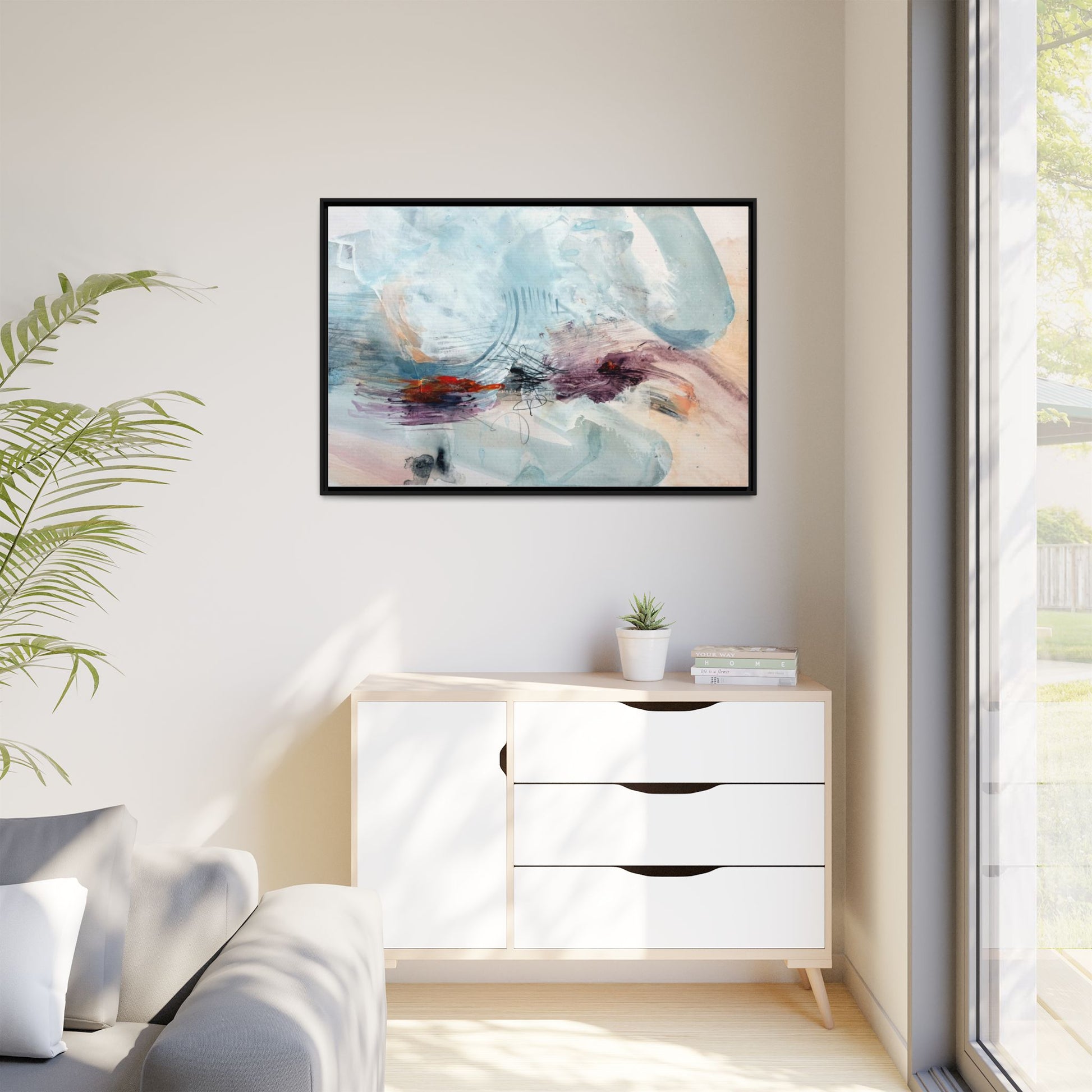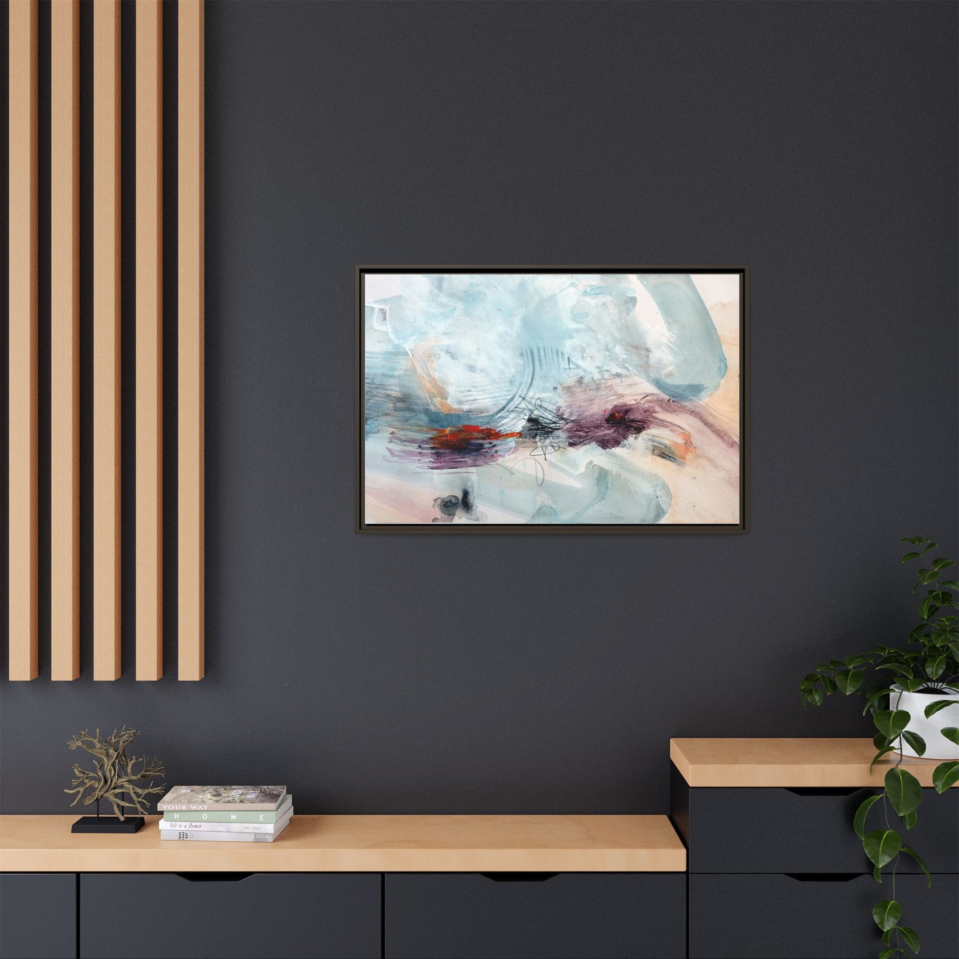 This captivating abstract watercolor painting features a delicate composition of soft blue, white, and blush tones intermingled with vibrant touches of red and purple. The artwork showcases fluid, organic brushstrokes that create a sense of movement and ethereal depth across the canvas. Textured layers of translucent watercolor blend and overlap, creating intricate visual passages that draw the viewer's eye through the composition. Bold splashes of crimson and deep purple provide striking contrast against the predominantly cool, pastel background. Gestural line work and subtle graphite marks add additional texture and visual interest to this evocative, contemporary abstract piece.