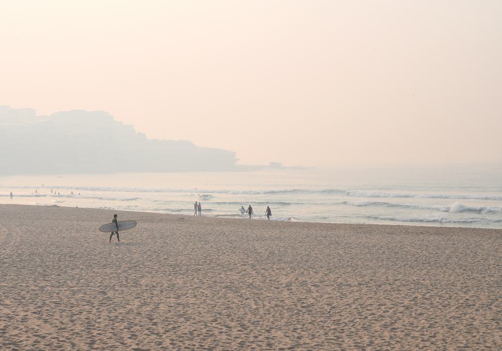 A lone surfer walks along the misty beach, where the hazy morning air whispers secrets to the gentle waves. Silhouettes of people merge with the soft, infinite horizon, evoking a serene dance between sand and sea.