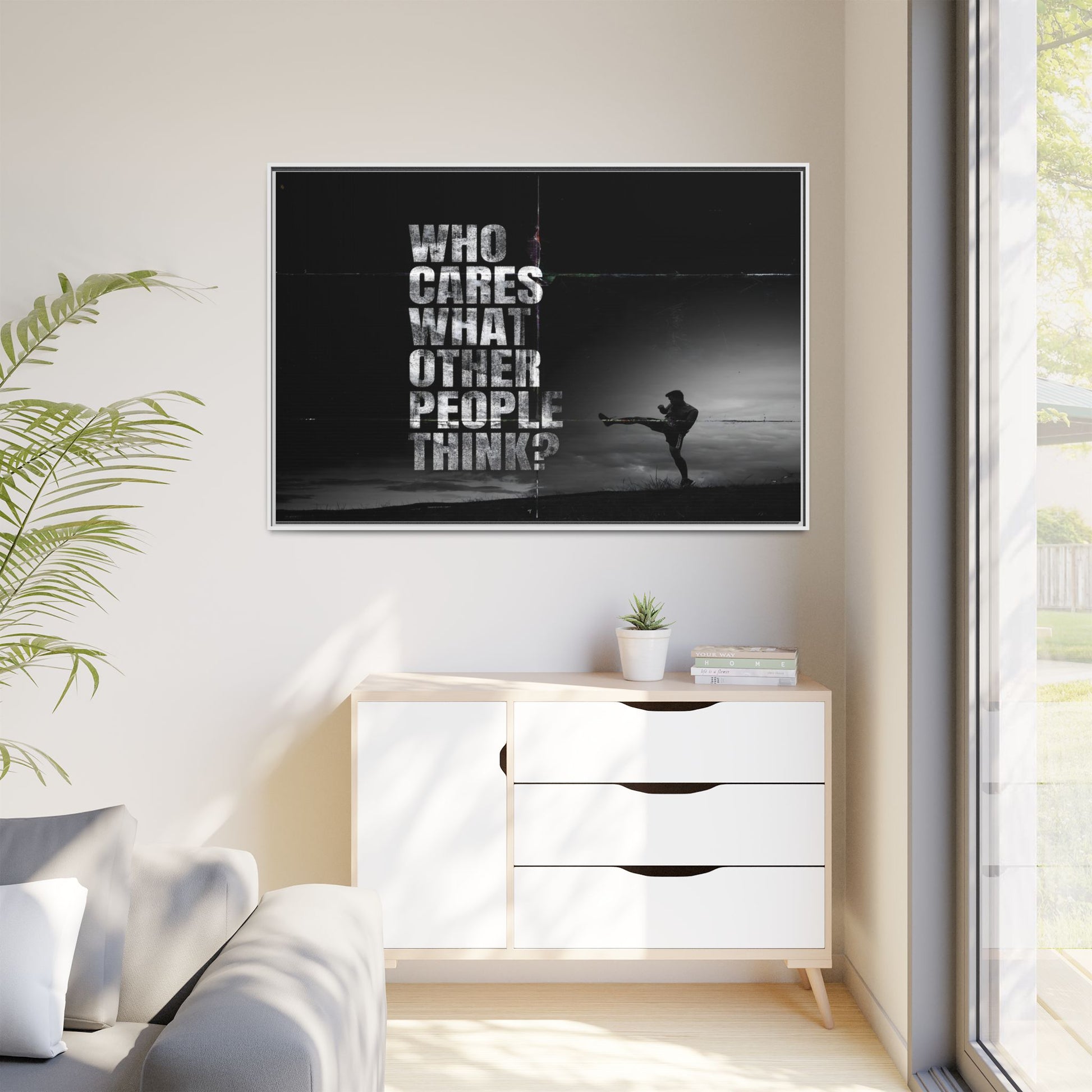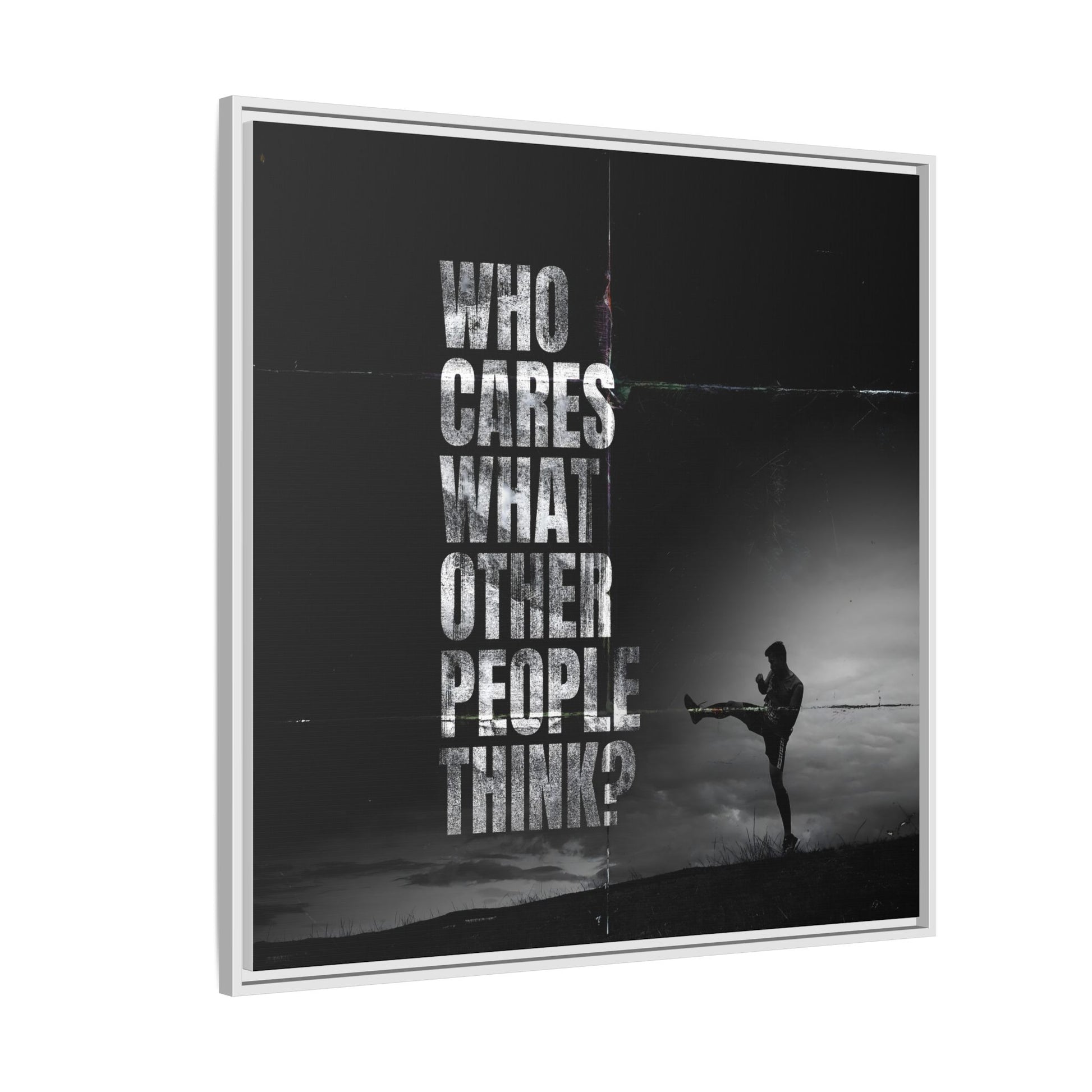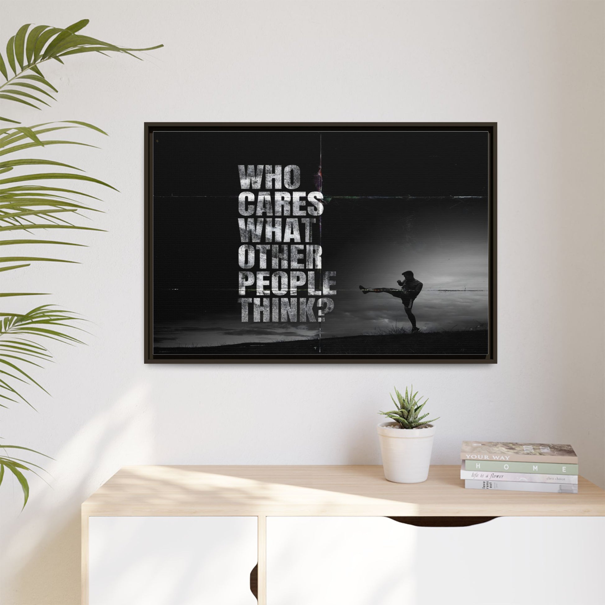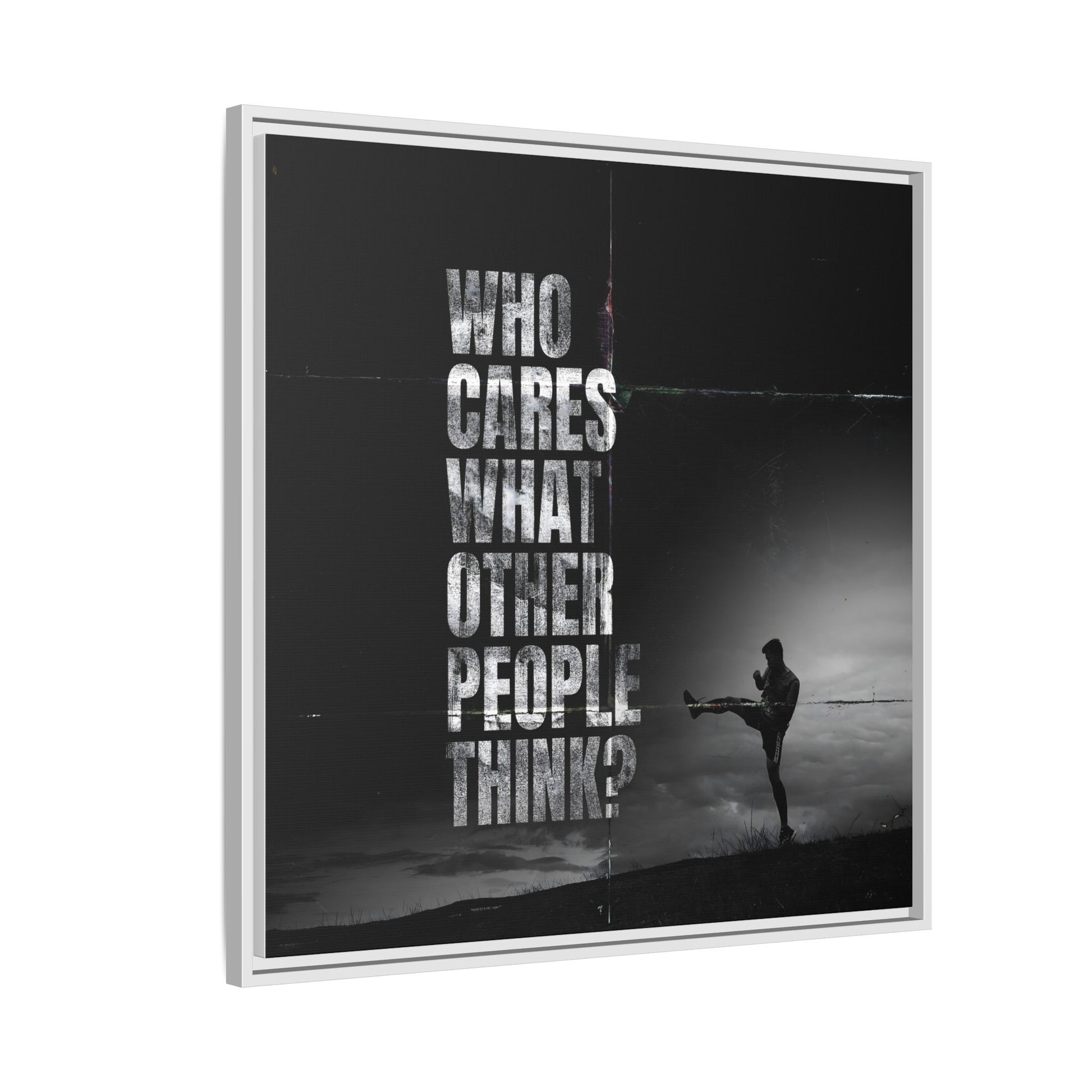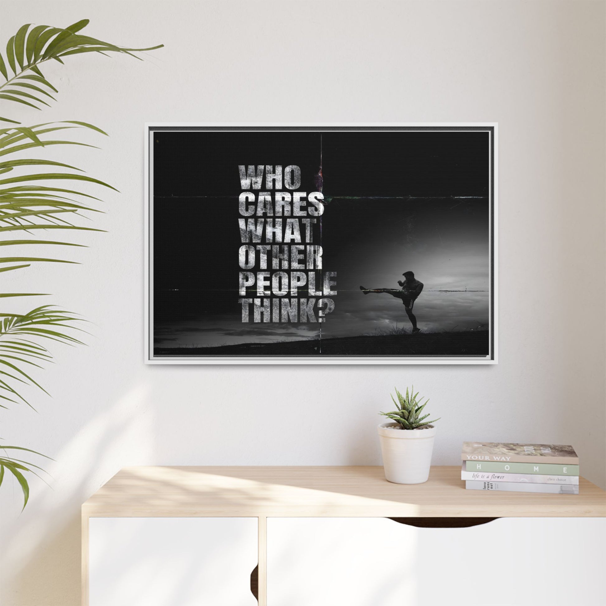 This powerful black and white graphic features the provocative text "WHO CARES WHAT OTHER PEOPLE THINK?" in large, distressed white letters against a dark, moody background. To the right of the text, a silhouetted figure is shown in a dynamic kicking pose, standing on a minimalist landscape with cloudy skies. The image conveys a strong message of individualism, independence, and defiance against social judgment or external expectations. The high-contrast design and dramatic positioning emphasize the rebellious spirit of the phrase. The overall aesthetic is stark, minimalist, and emotionally charged, using visual elements to reinforce the bold statement about personal authenticity.