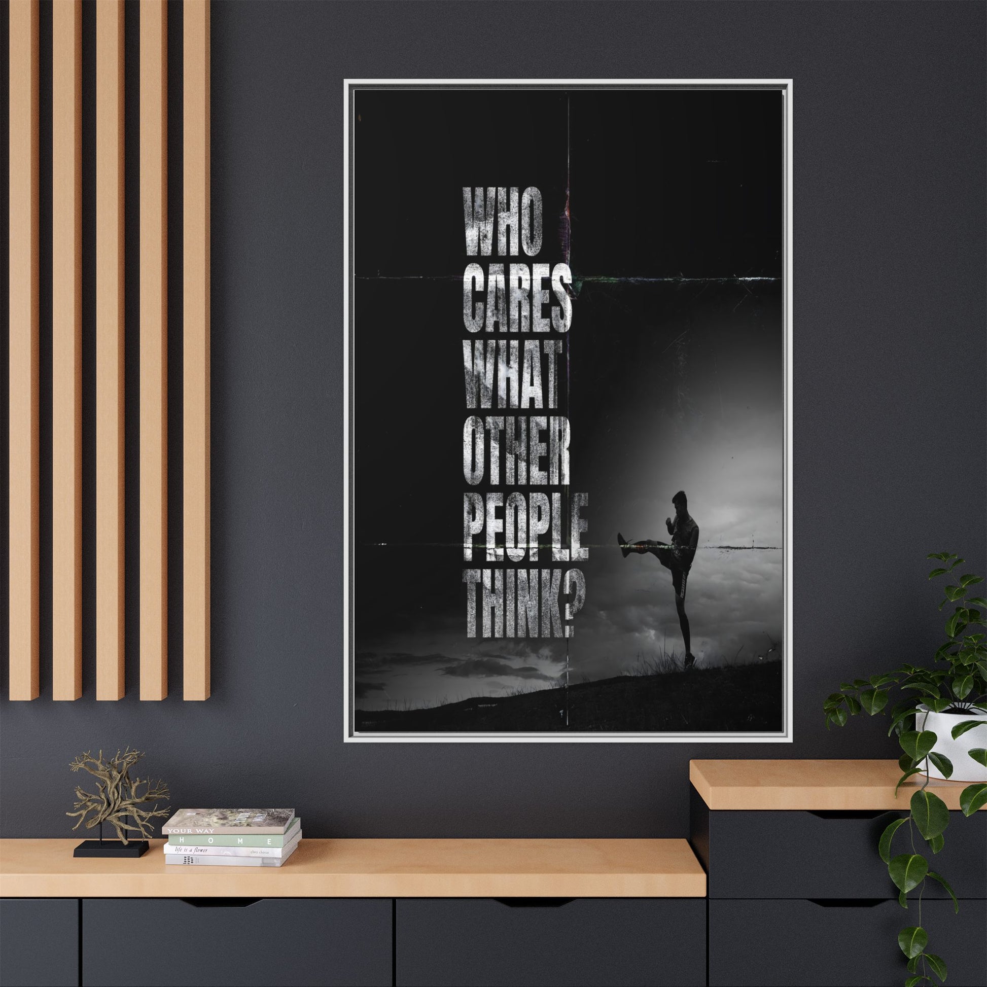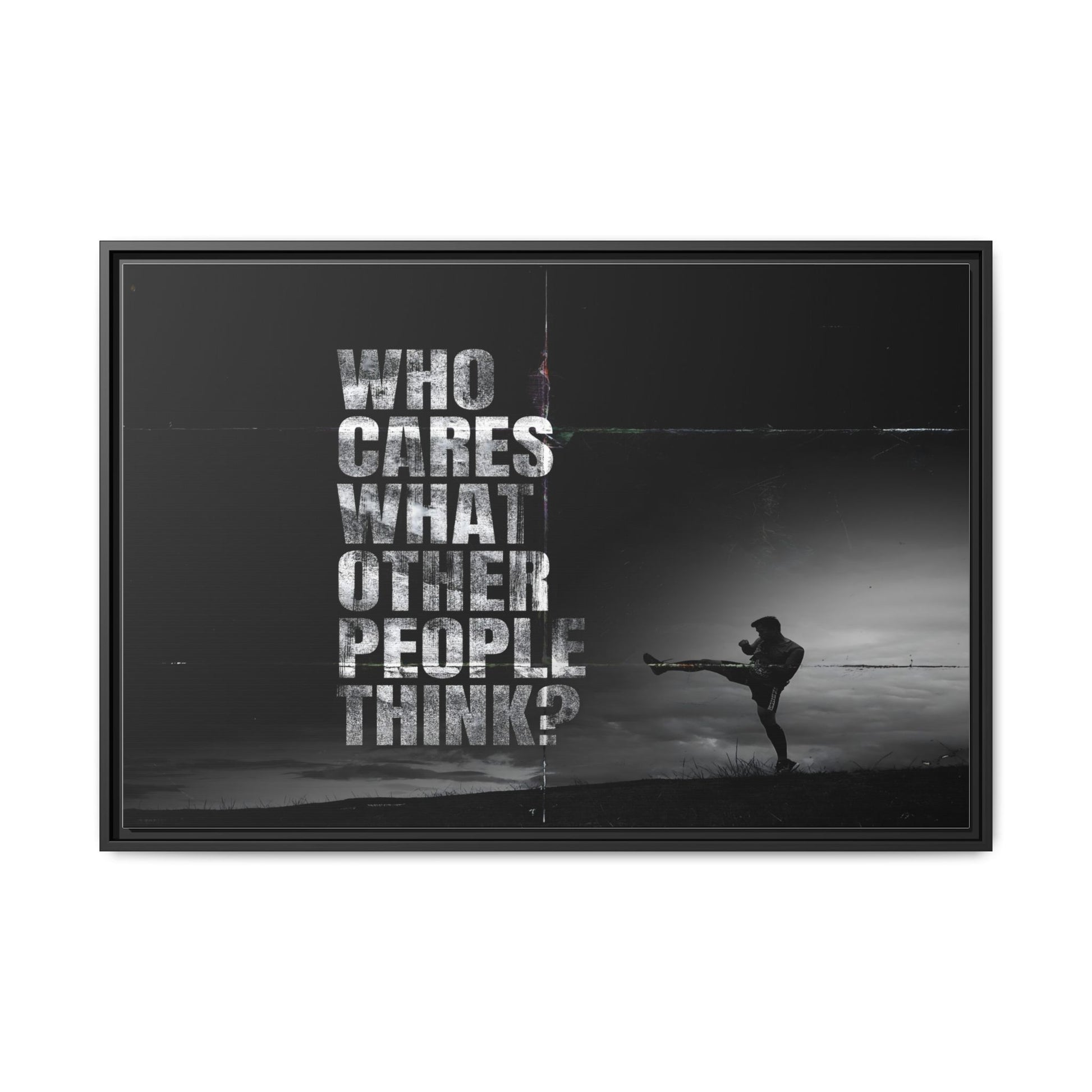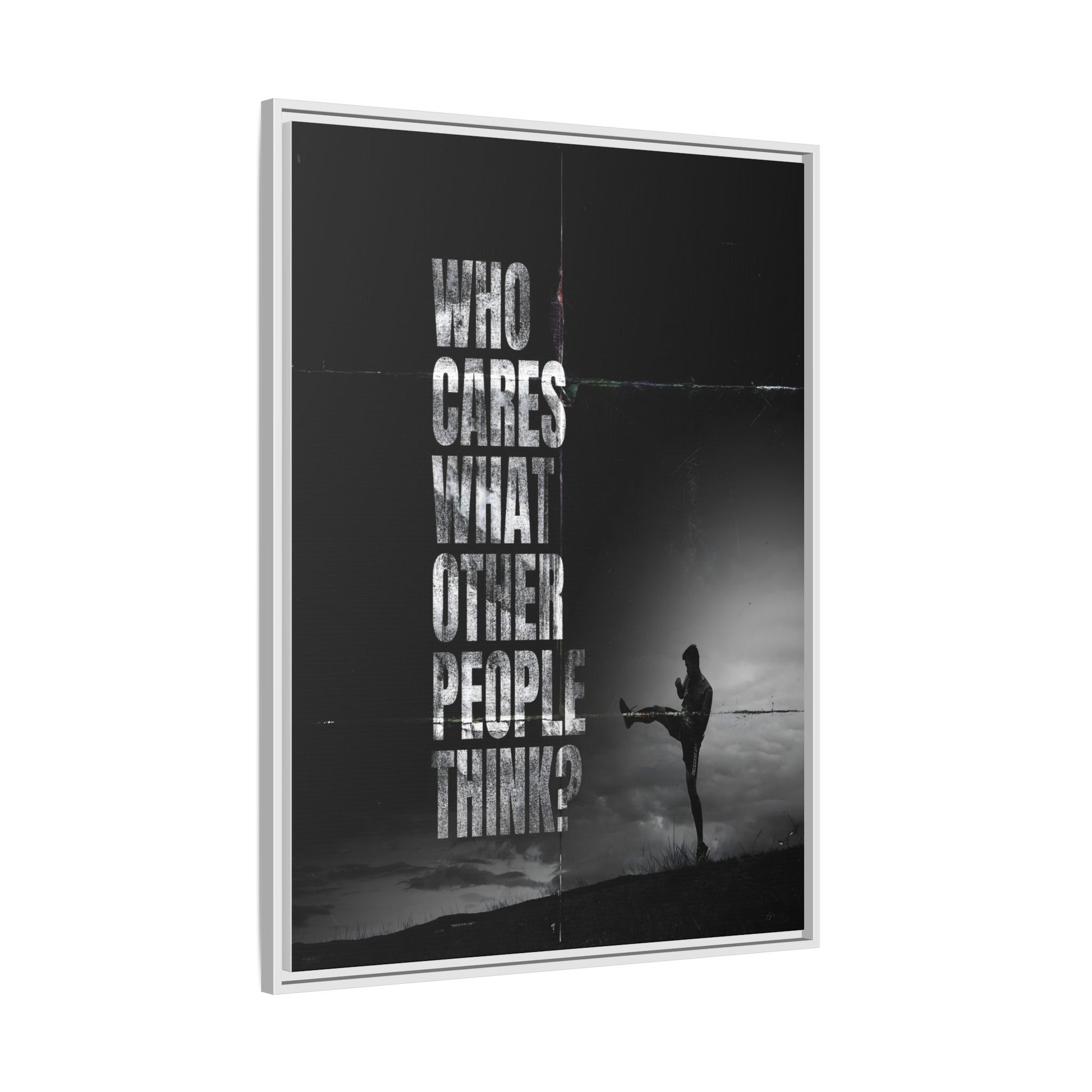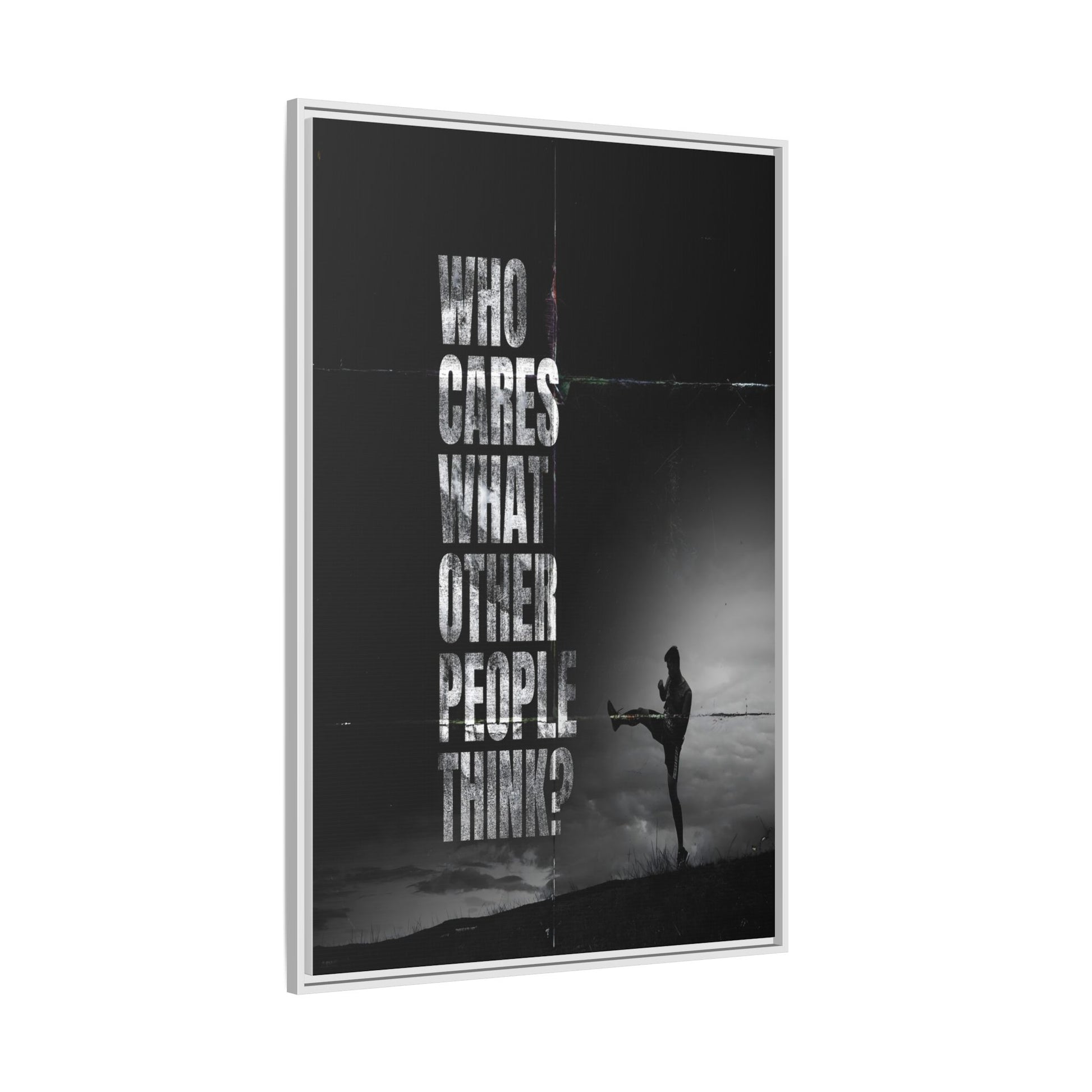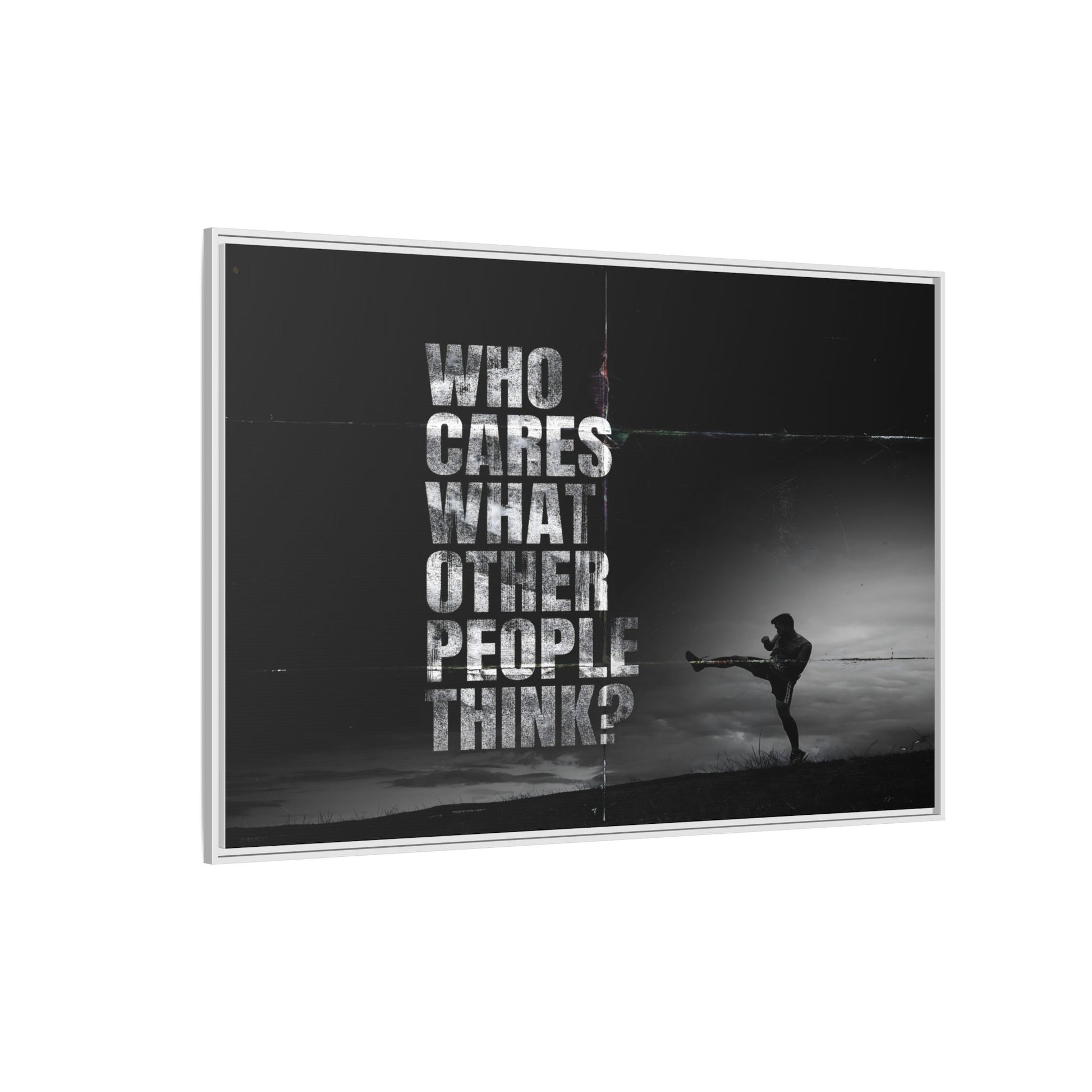 This powerful black and white graphic features the provocative text "WHO CARES WHAT OTHER PEOPLE THINK?" in large, distressed white letters against a dark, moody background. To the right of the text, a silhouetted figure is shown in a dynamic kicking pose, standing on a minimalist landscape with cloudy skies. The image conveys a strong message of individualism, independence, and defiance against social judgment or external expectations. The high-contrast design and dramatic positioning emphasize the rebellious spirit of the phrase. The overall aesthetic is stark, minimalist, and emotionally charged, using visual elements to reinforce the bold statement about personal authenticity.