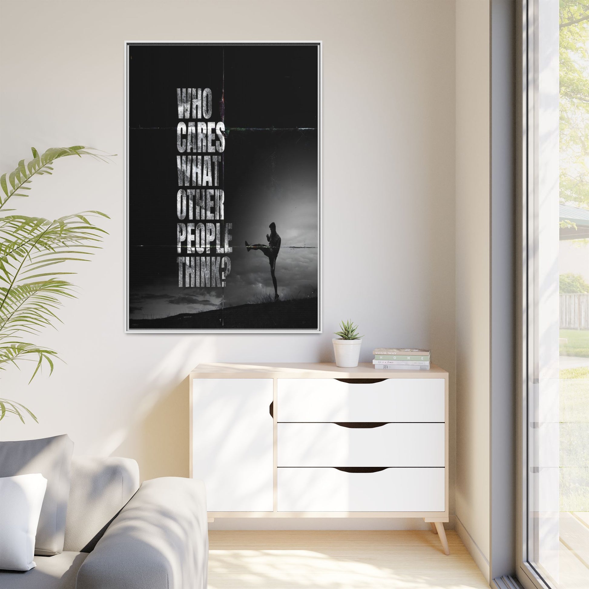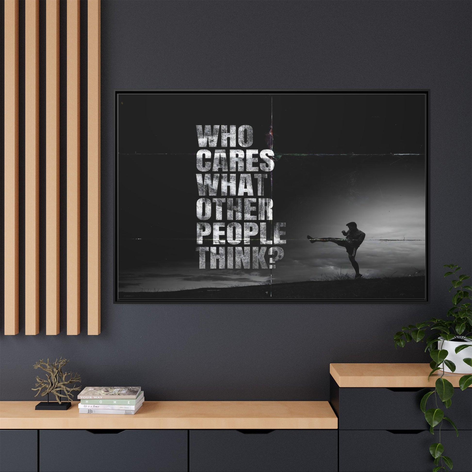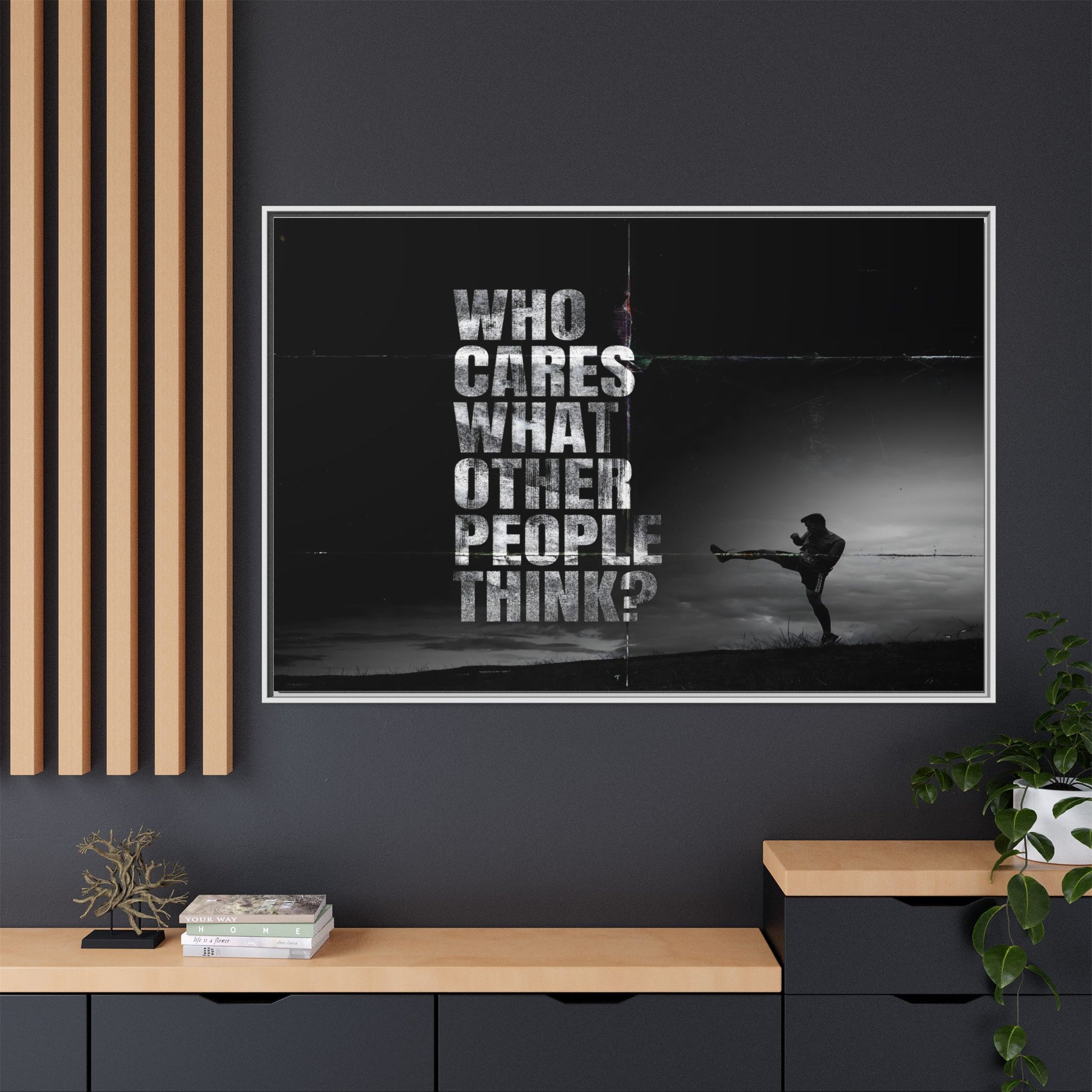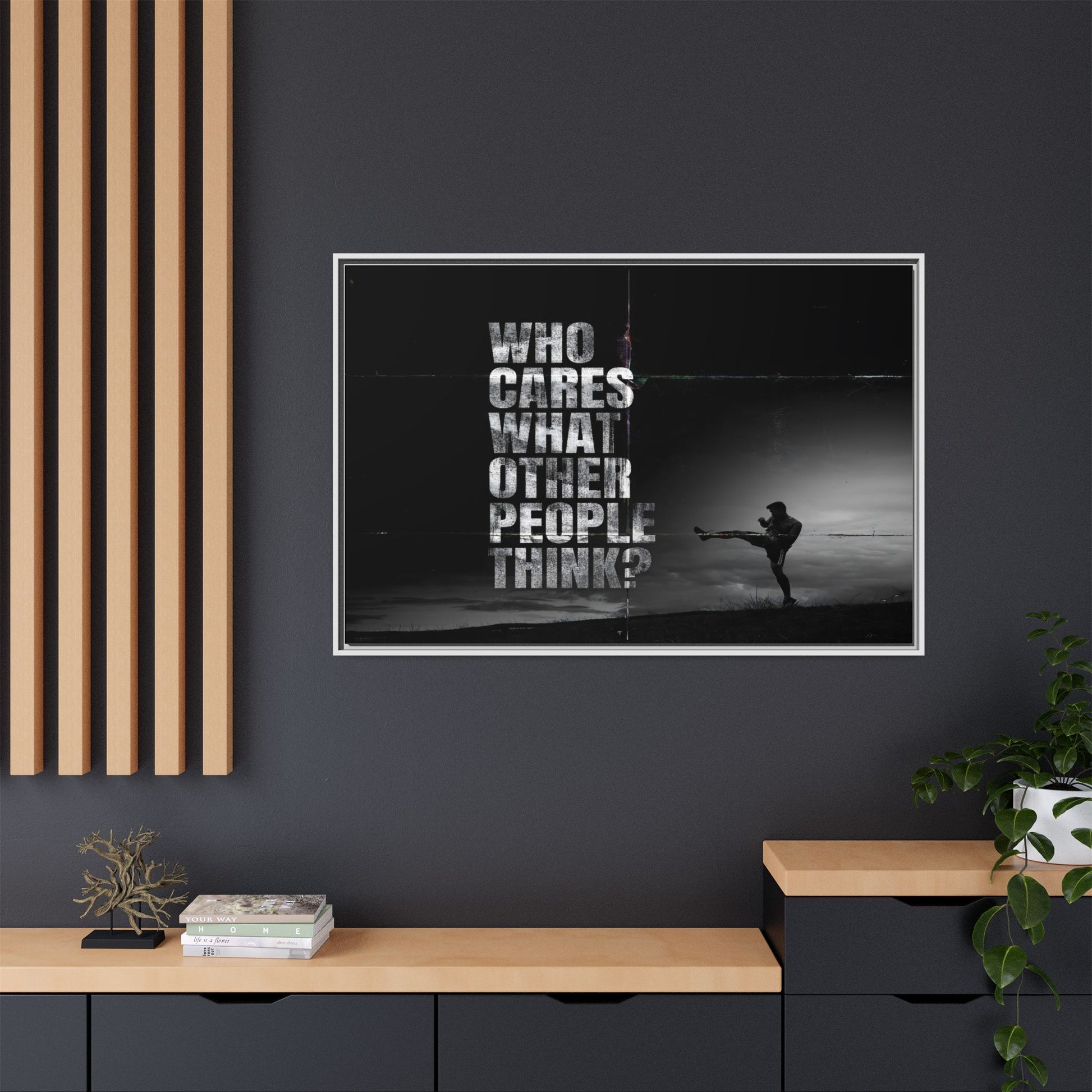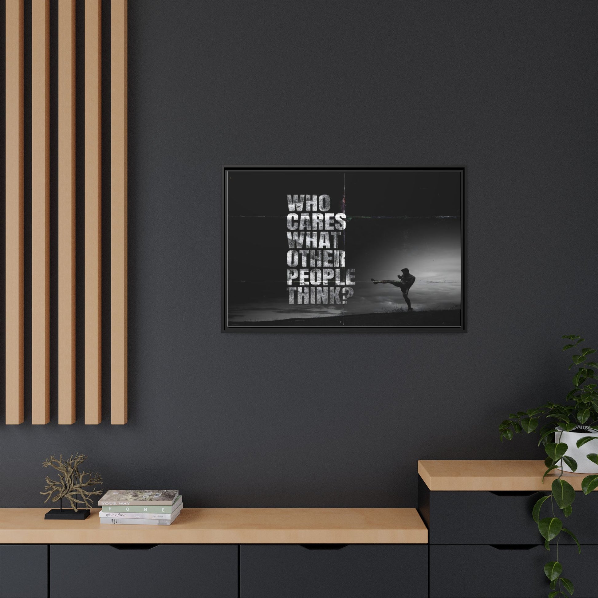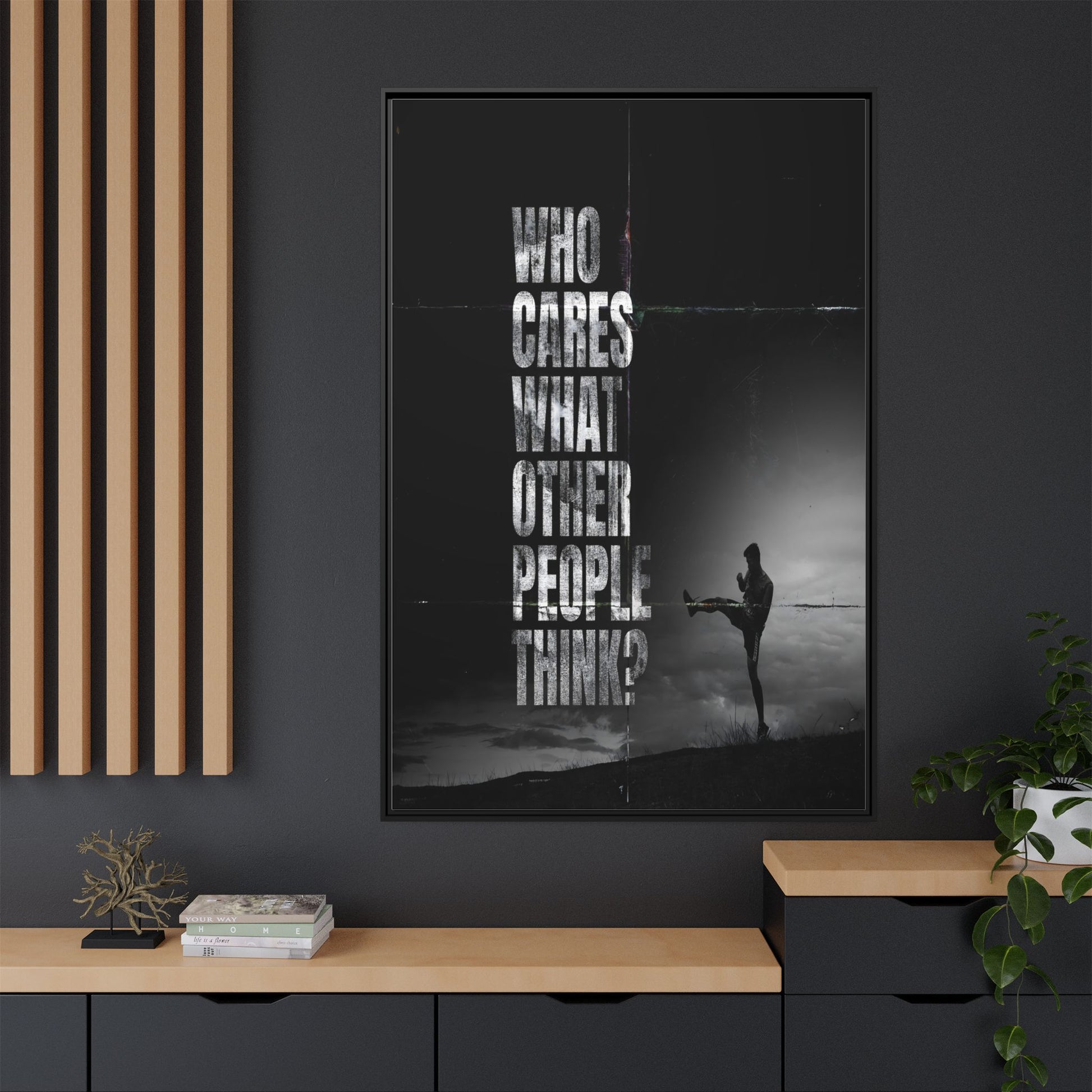 This powerful black and white graphic features the provocative text "WHO CARES WHAT OTHER PEOPLE THINK?" in large, distressed white letters against a dark, moody background. To the right of the text, a silhouetted figure is shown in a dynamic kicking pose, standing on a minimalist landscape with cloudy skies. The image conveys a strong message of individualism, independence, and defiance against social judgment or external expectations. The high-contrast design and dramatic positioning emphasize the rebellious spirit of the phrase. The overall aesthetic is stark, minimalist, and emotionally charged, using visual elements to reinforce the bold statement about personal authenticity.