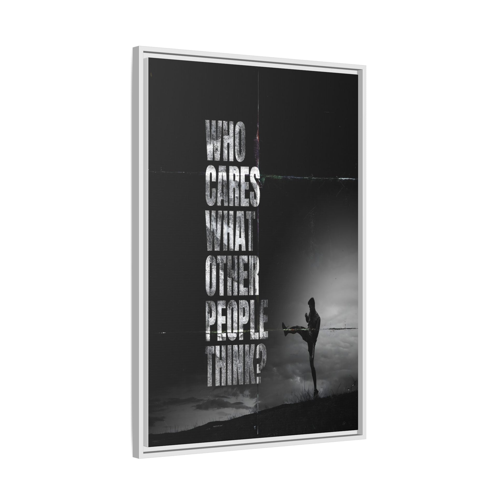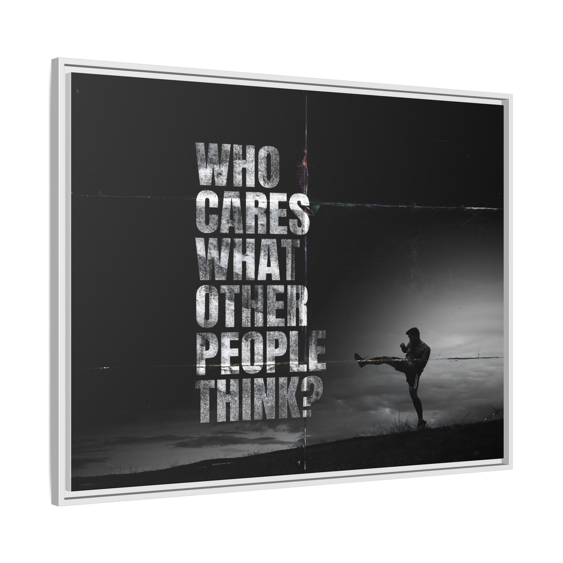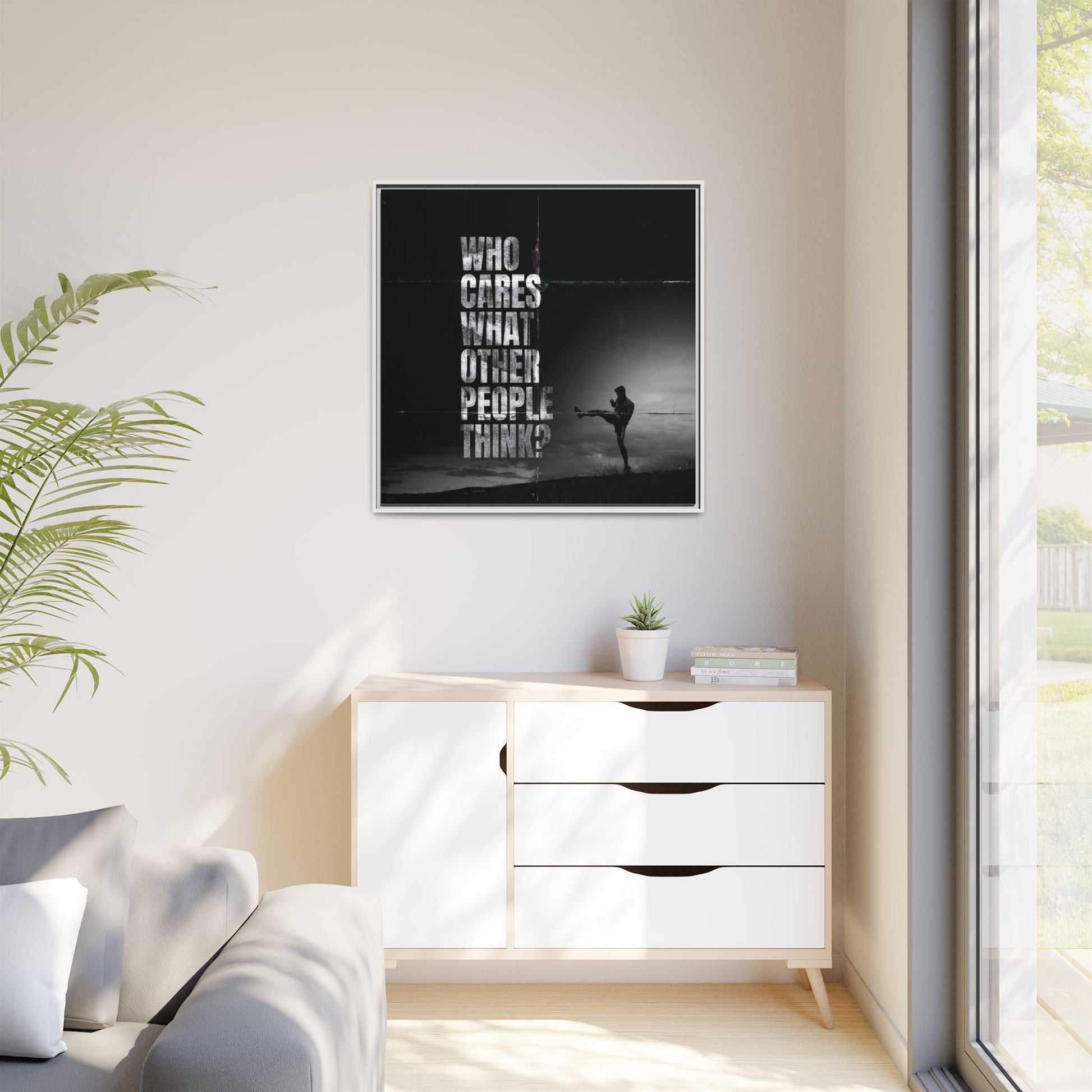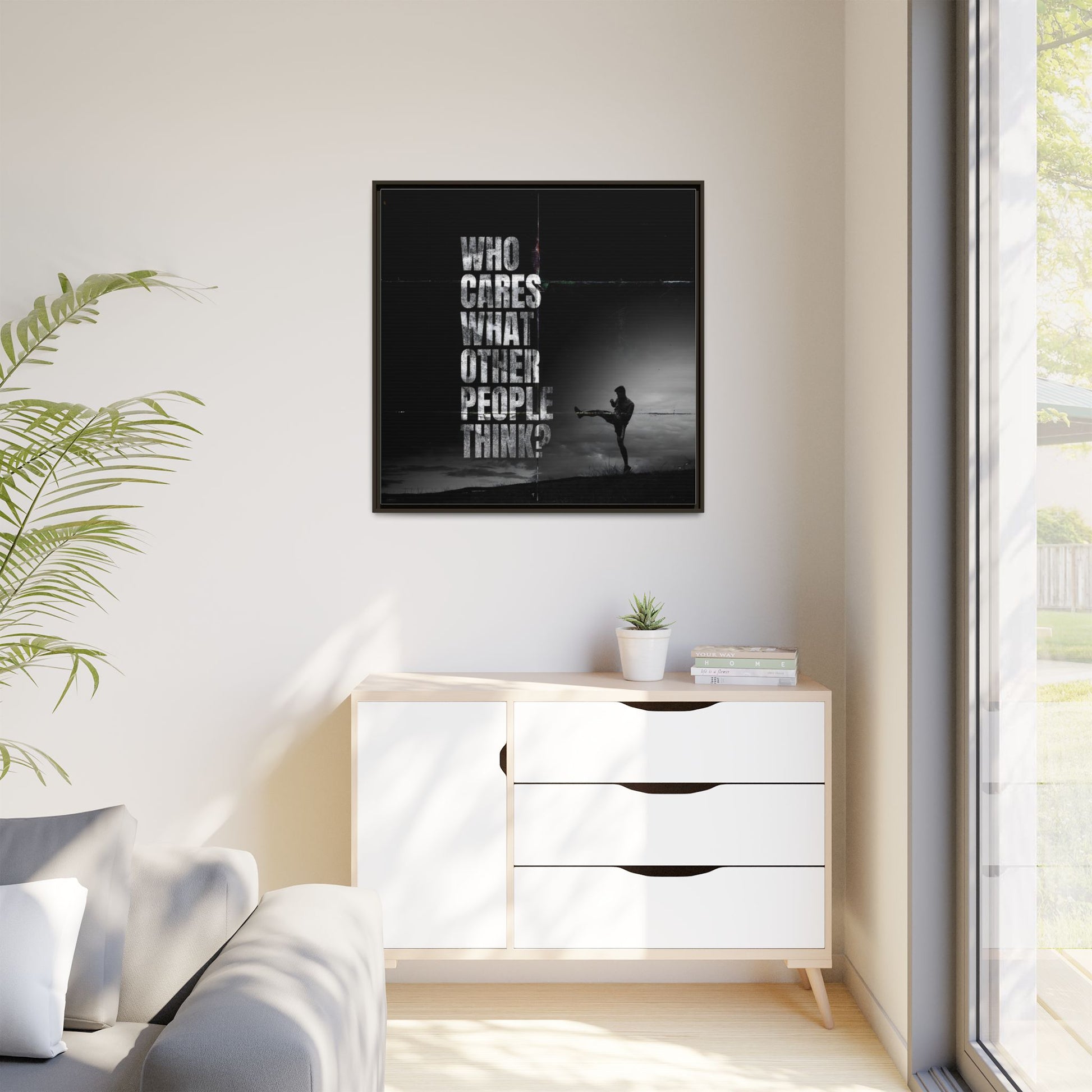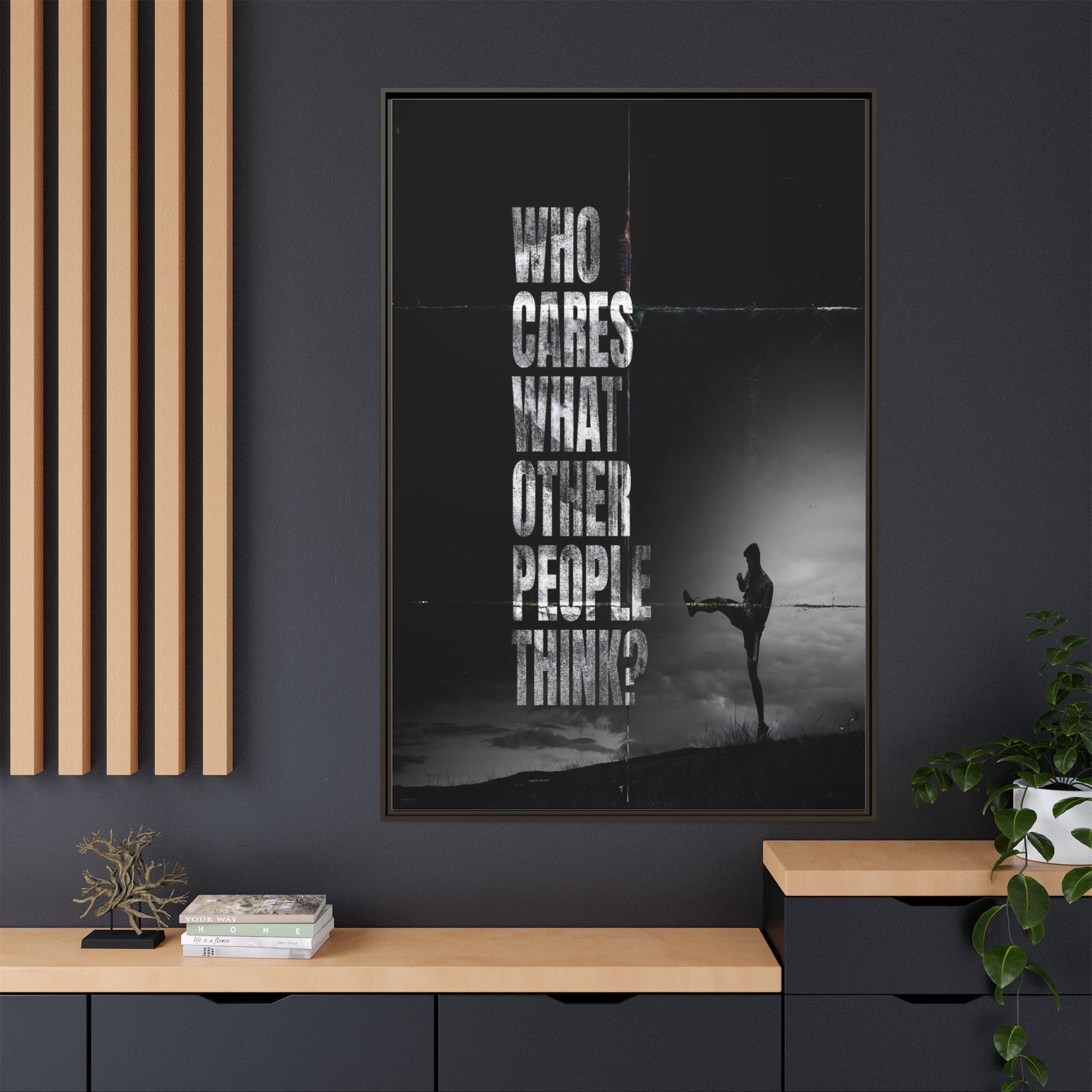 This powerful black and white graphic features the provocative text "WHO CARES WHAT OTHER PEOPLE THINK?" in large, distressed white letters against a dark, moody background. To the right of the text, a silhouetted figure is shown in a dynamic kicking pose, standing on a minimalist landscape with cloudy skies. The image conveys a strong message of individualism, independence, and defiance against social judgment or external expectations. The high-contrast design and dramatic positioning emphasize the rebellious spirit of the phrase. The overall aesthetic is stark, minimalist, and emotionally charged, using visual elements to reinforce the bold statement about personal authenticity.