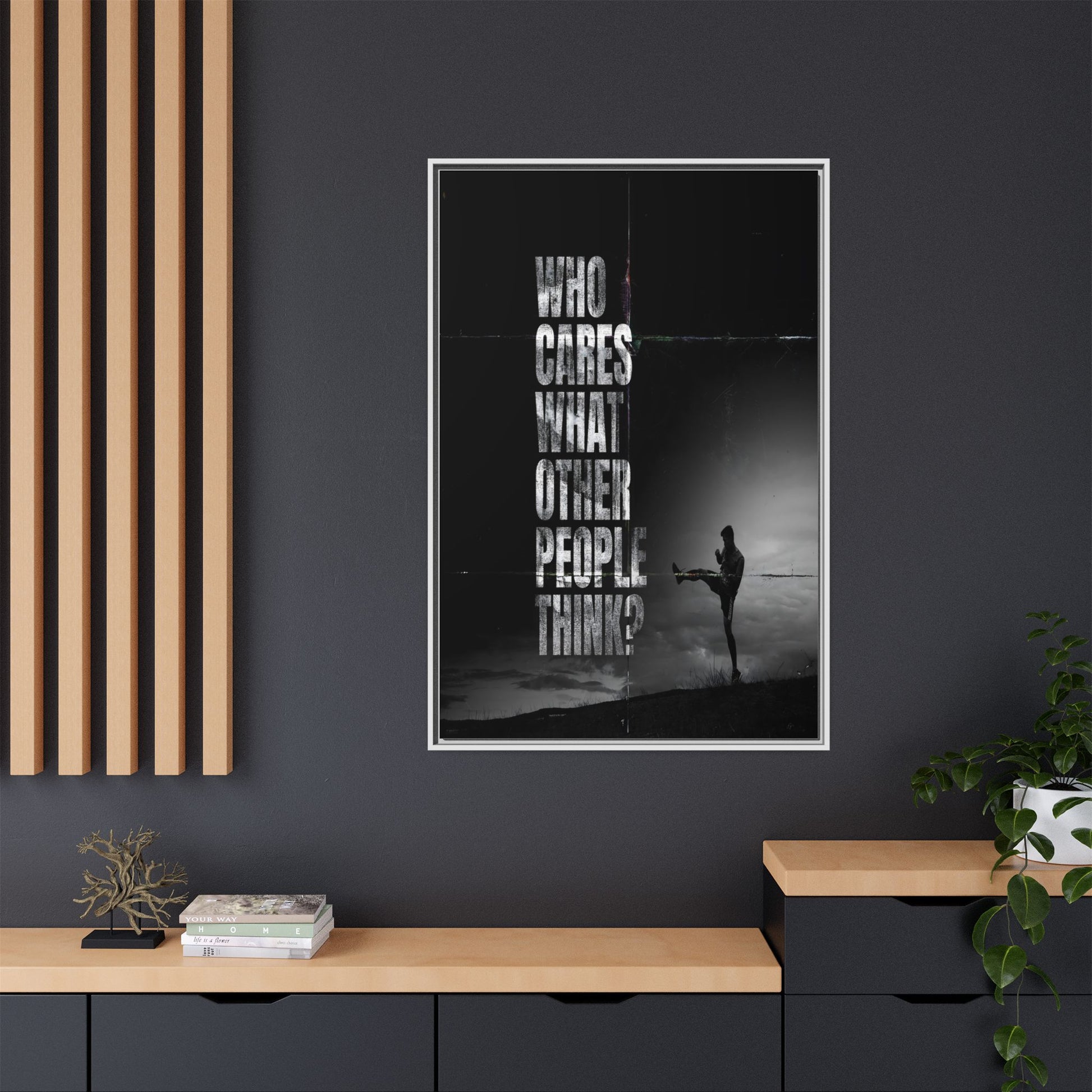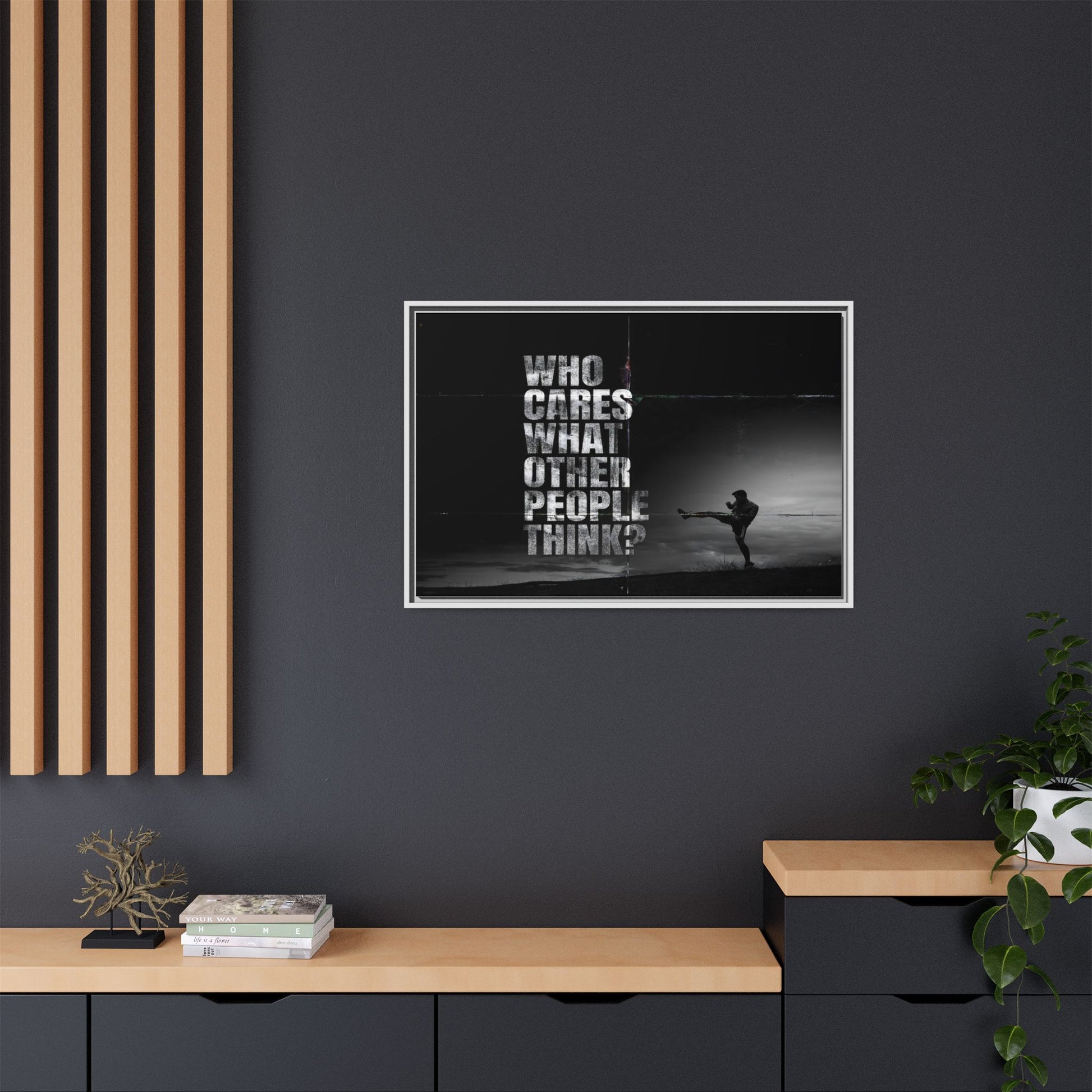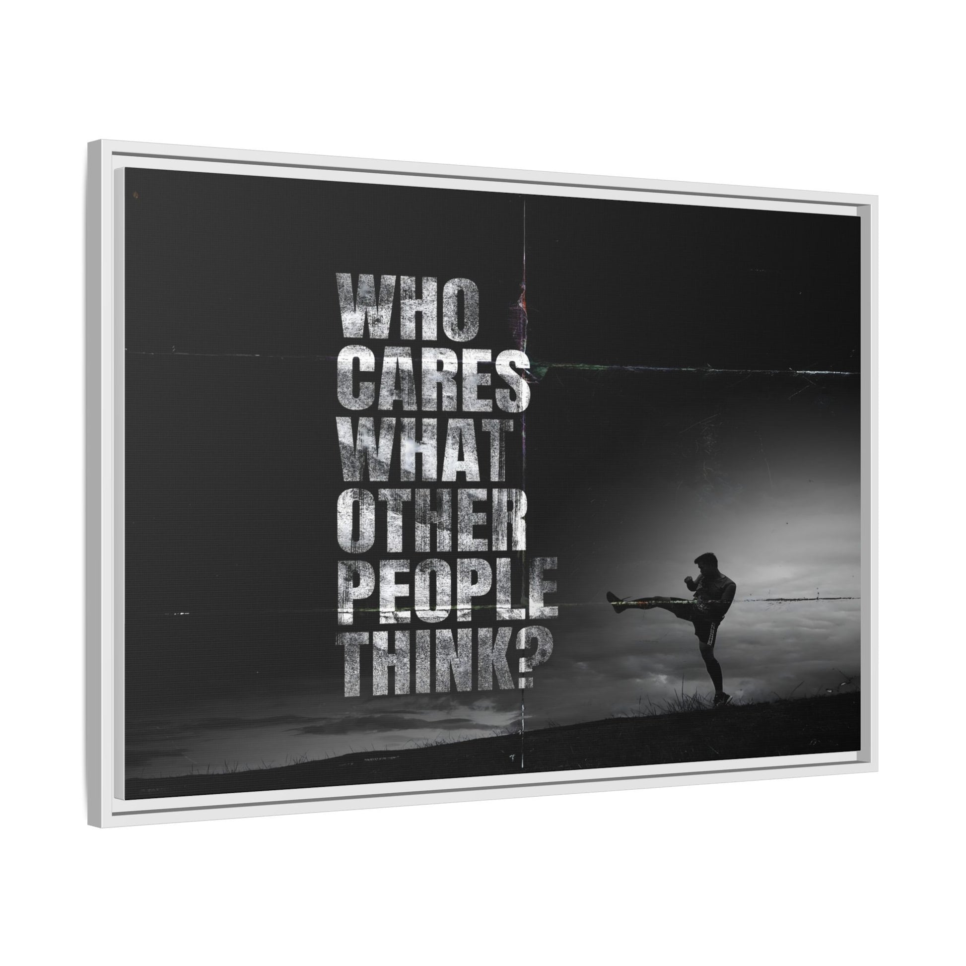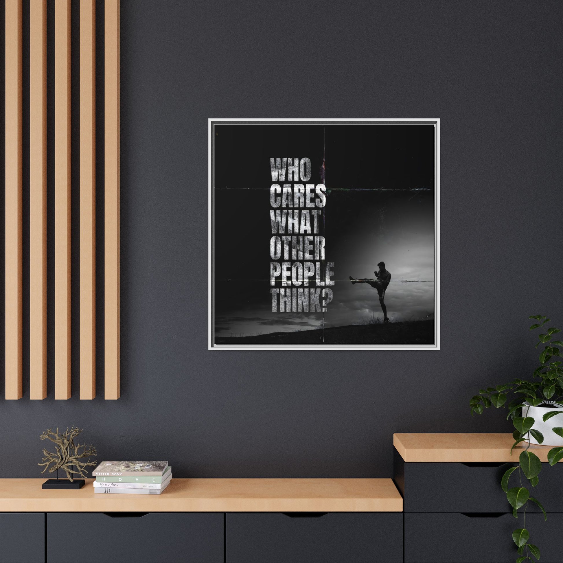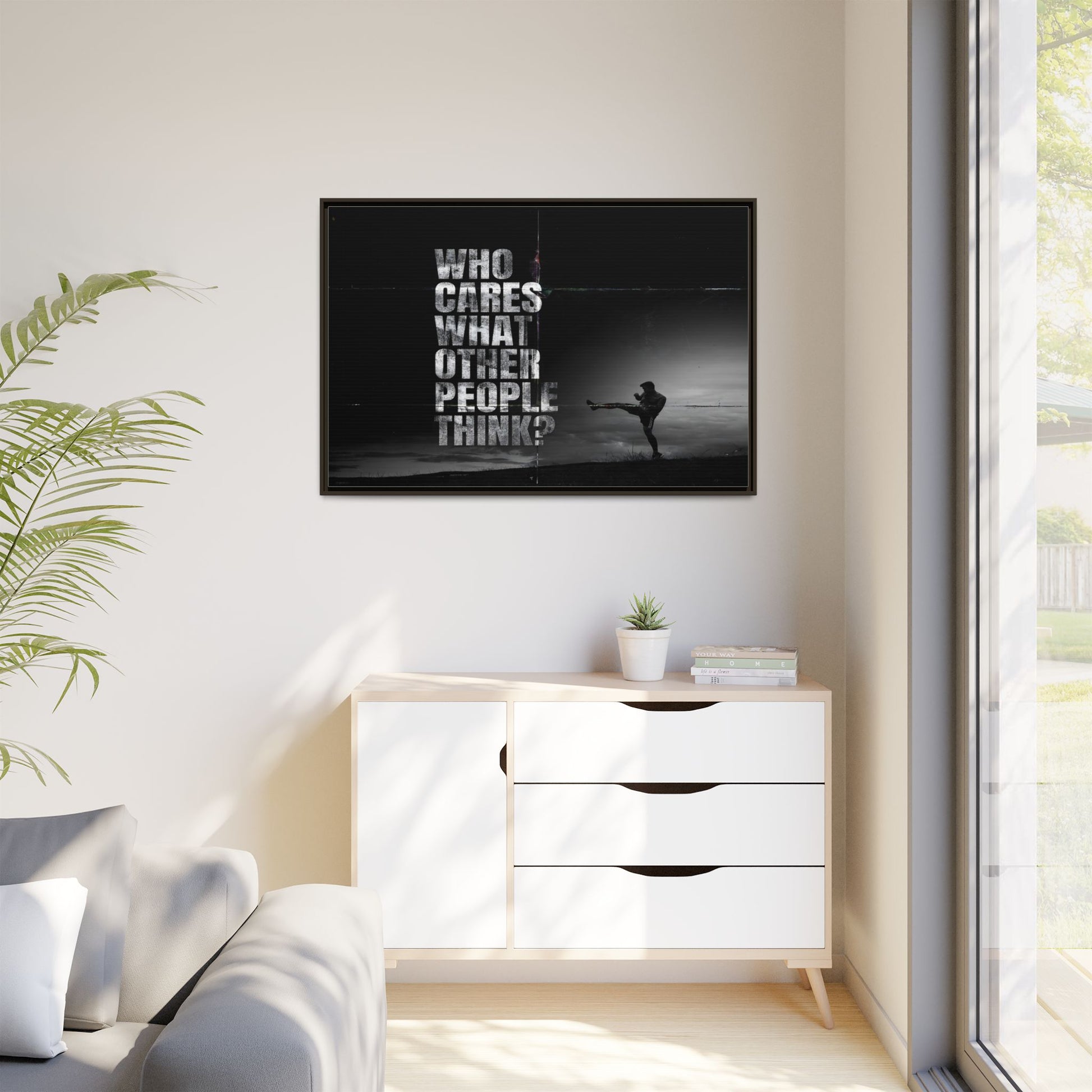 This powerful black and white graphic features the provocative text "WHO CARES WHAT OTHER PEOPLE THINK?" in large, distressed white letters against a dark, moody background. To the right of the text, a silhouetted figure is shown in a dynamic kicking pose, standing on a minimalist landscape with cloudy skies. The image conveys a strong message of individualism, independence, and defiance against social judgment or external expectations. The high-contrast design and dramatic positioning emphasize the rebellious spirit of the phrase. The overall aesthetic is stark, minimalist, and emotionally charged, using visual elements to reinforce the bold statement about personal authenticity.