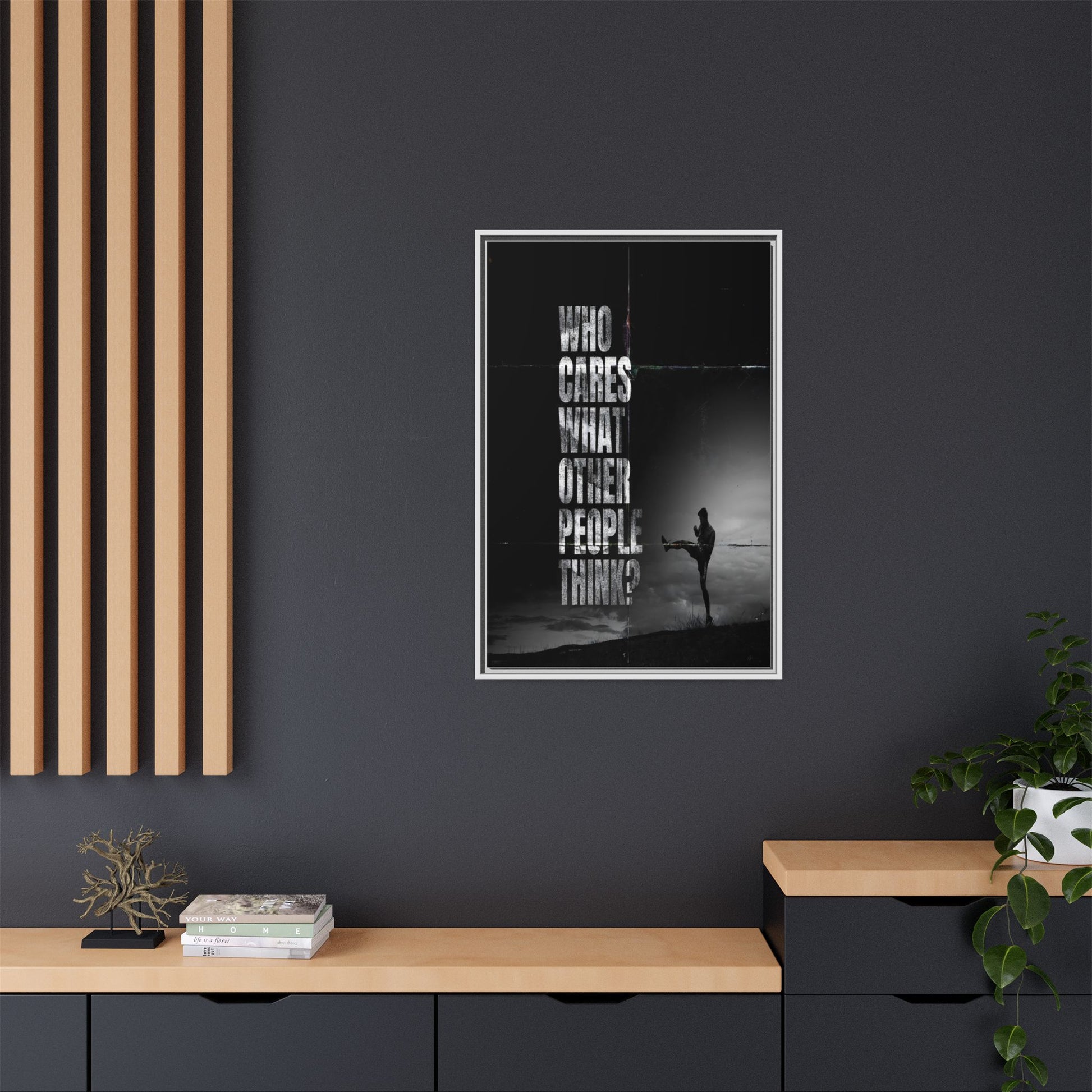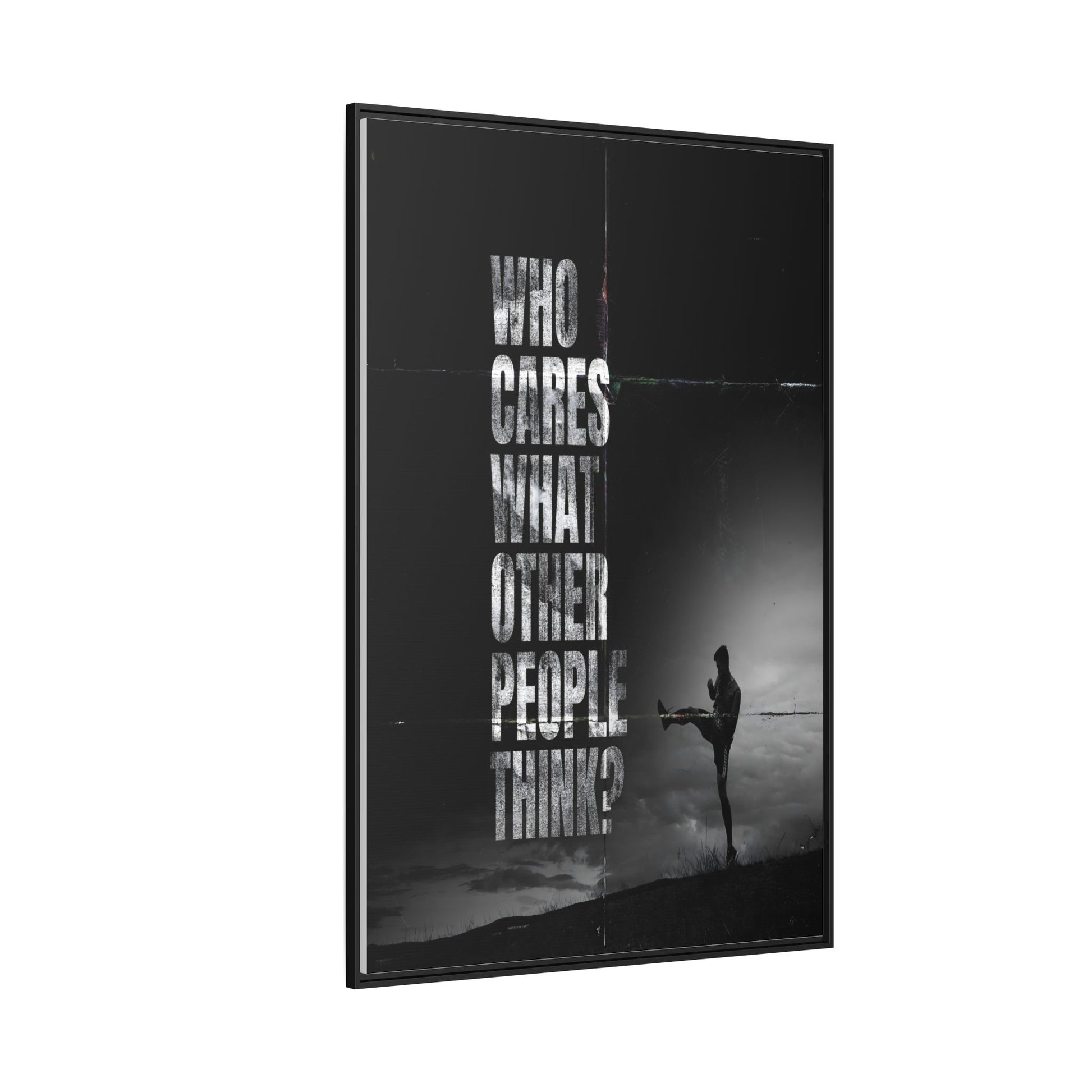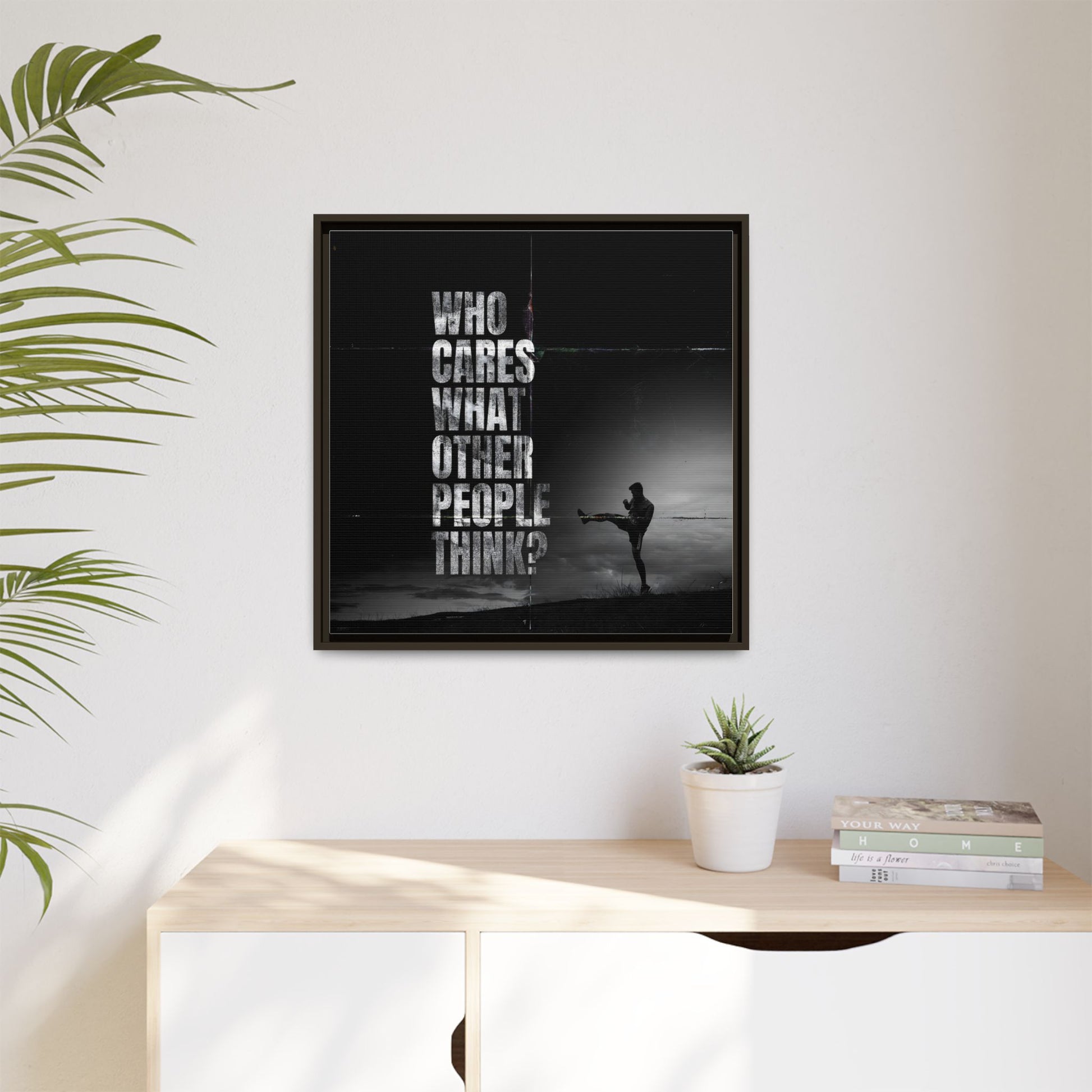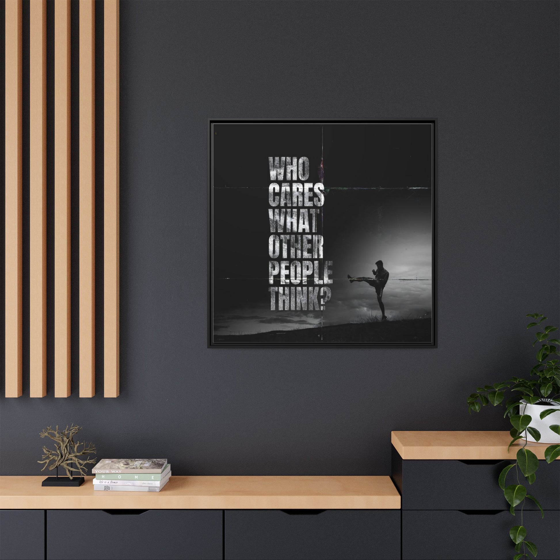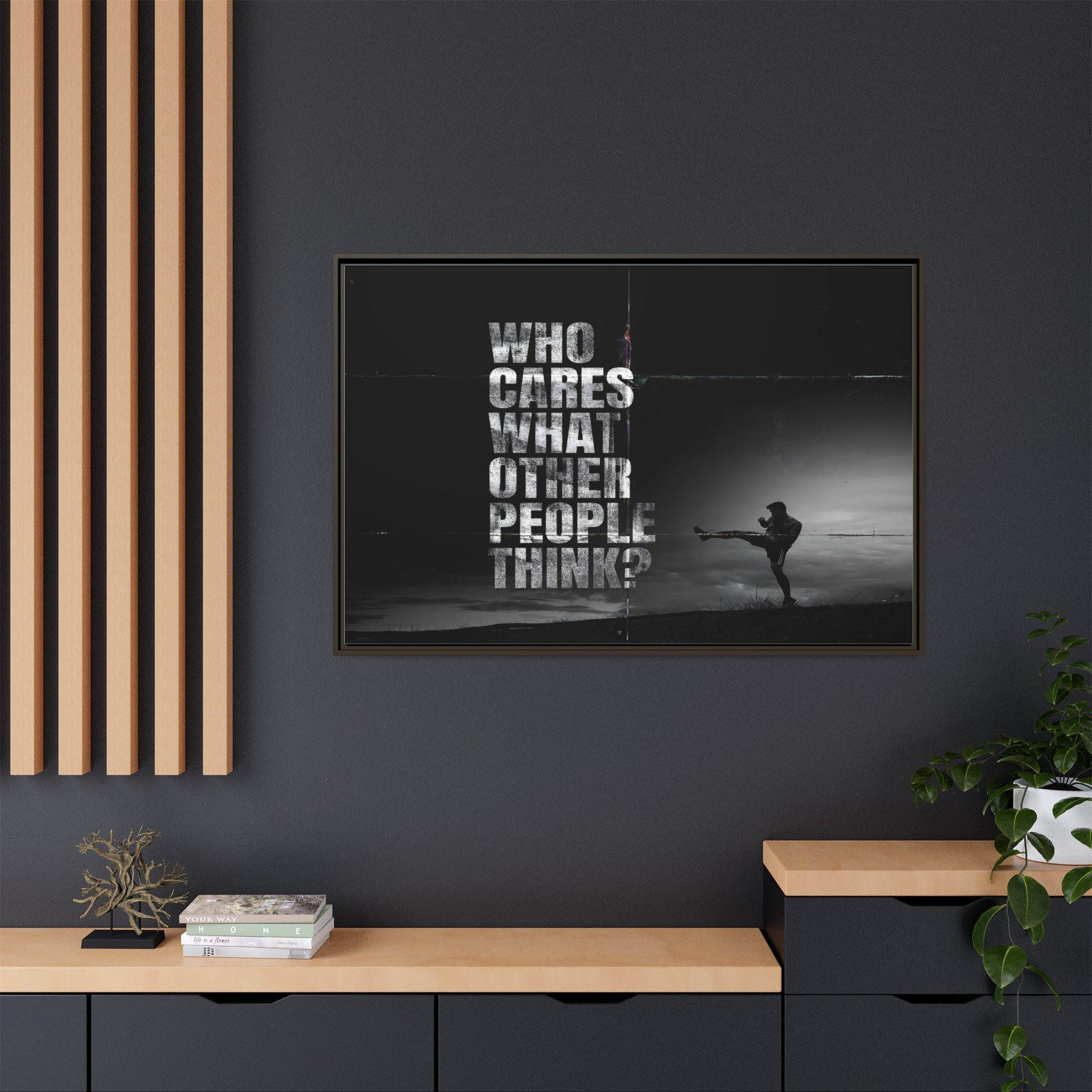 This powerful black and white graphic features the provocative text "WHO CARES WHAT OTHER PEOPLE THINK?" in large, distressed white letters against a dark, moody background. To the right of the text, a silhouetted figure is shown in a dynamic kicking pose, standing on a minimalist landscape with cloudy skies. The image conveys a strong message of individualism, independence, and defiance against social judgment or external expectations. The high-contrast design and dramatic positioning emphasize the rebellious spirit of the phrase. The overall aesthetic is stark, minimalist, and emotionally charged, using visual elements to reinforce the bold statement about personal authenticity.