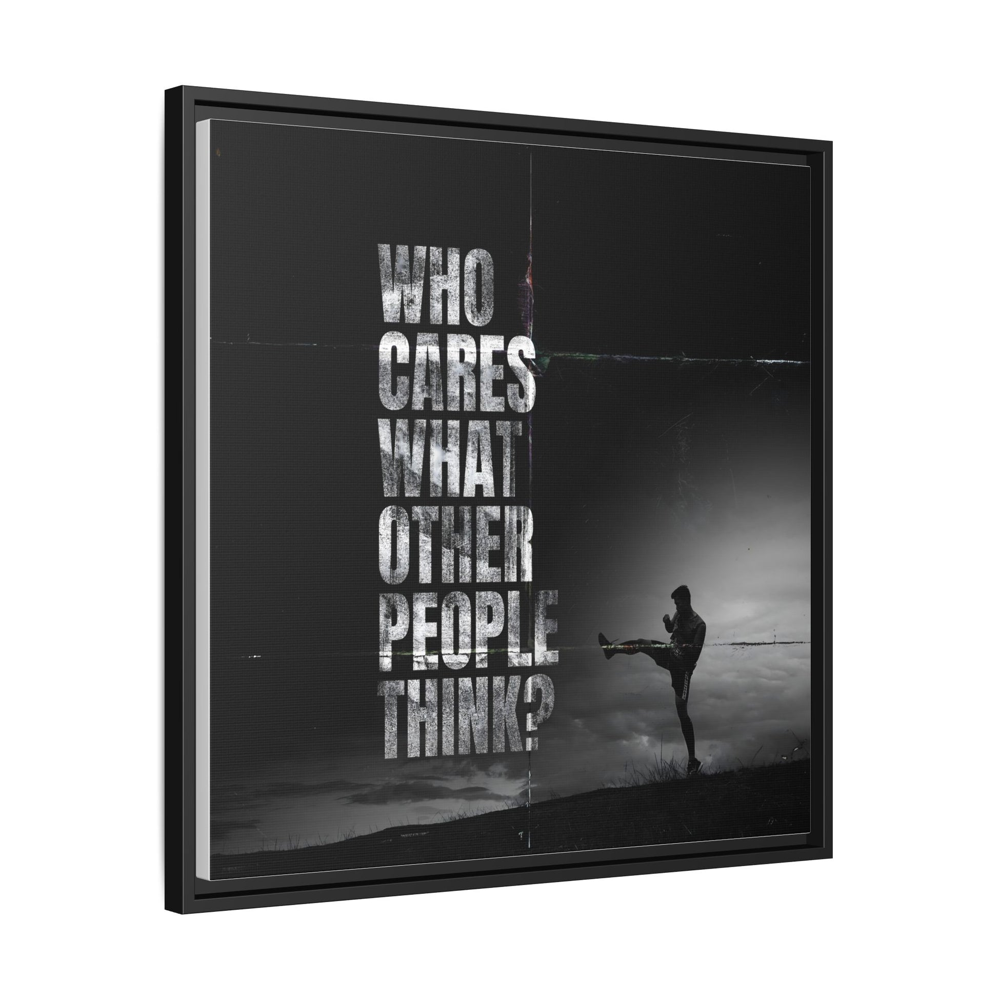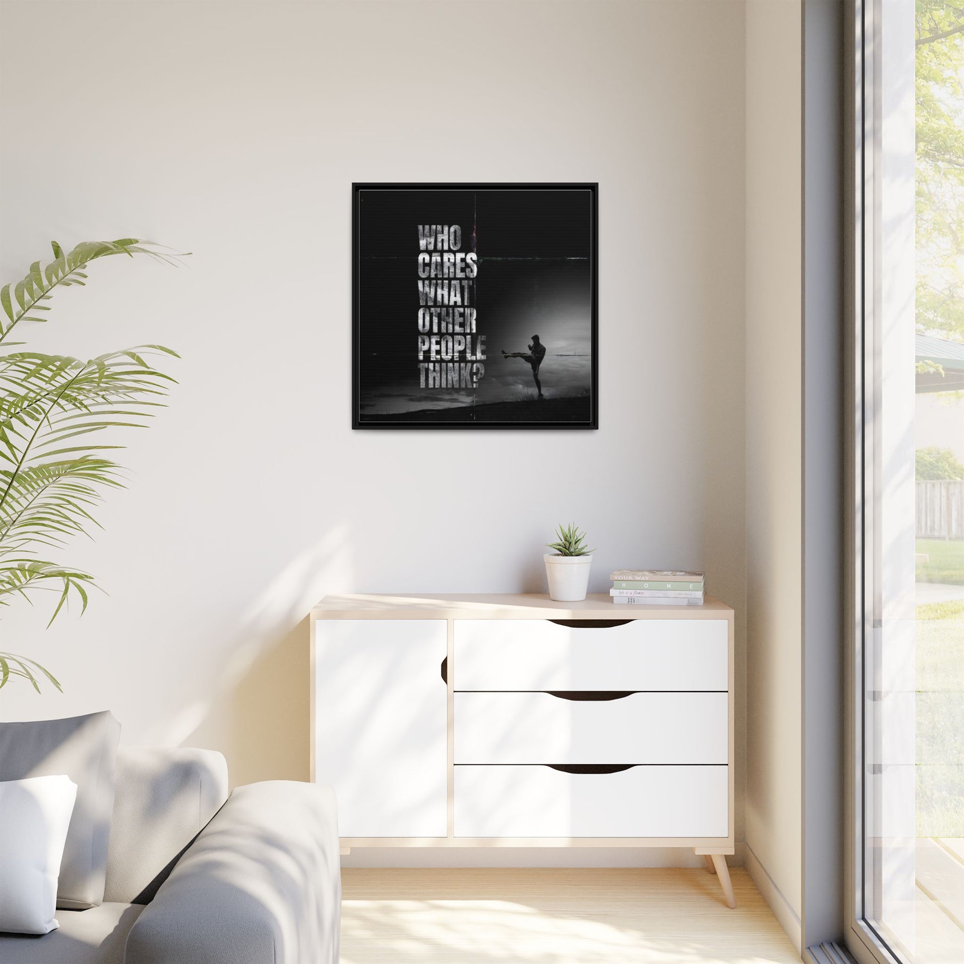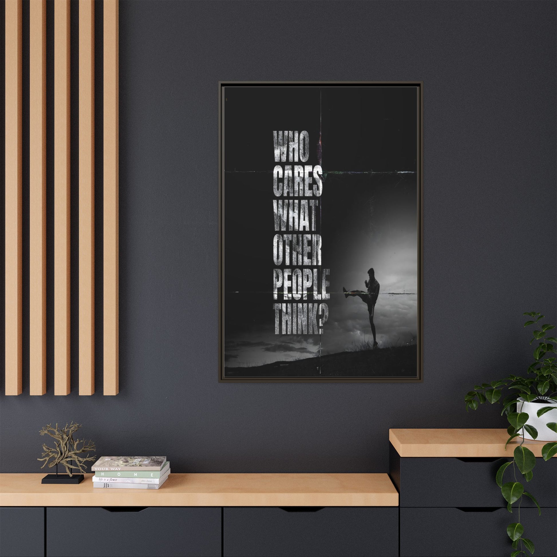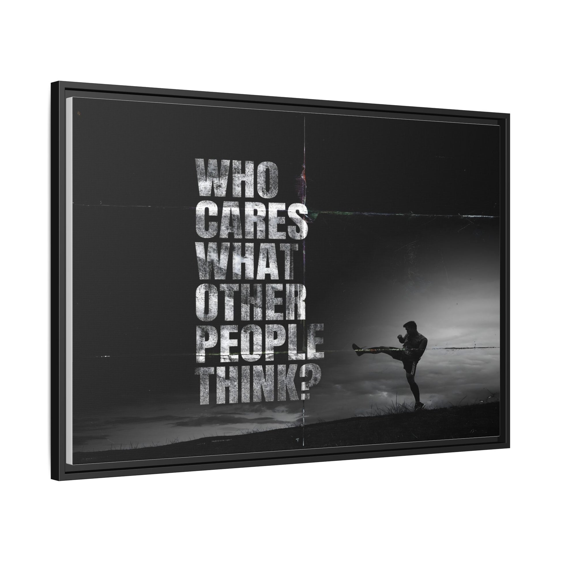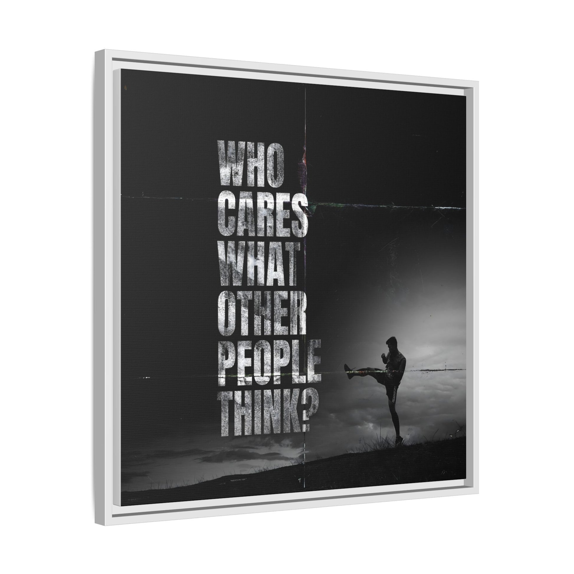 This powerful black and white graphic features the provocative text "WHO CARES WHAT OTHER PEOPLE THINK?" in large, distressed white letters against a dark, moody background. To the right of the text, a silhouetted figure is shown in a dynamic kicking pose, standing on a minimalist landscape with cloudy skies. The image conveys a strong message of individualism, independence, and defiance against social judgment or external expectations. The high-contrast design and dramatic positioning emphasize the rebellious spirit of the phrase. The overall aesthetic is stark, minimalist, and emotionally charged, using visual elements to reinforce the bold statement about personal authenticity.
