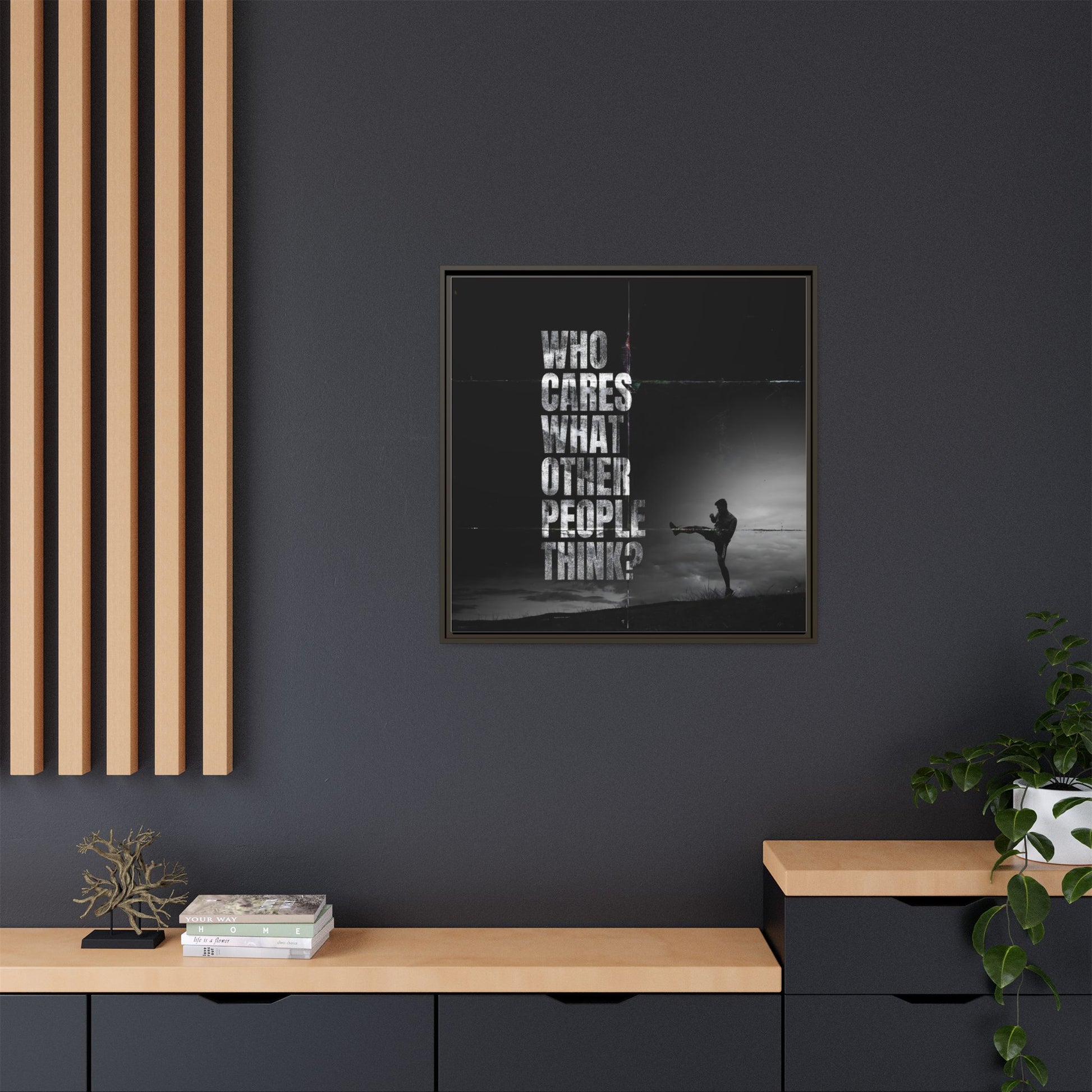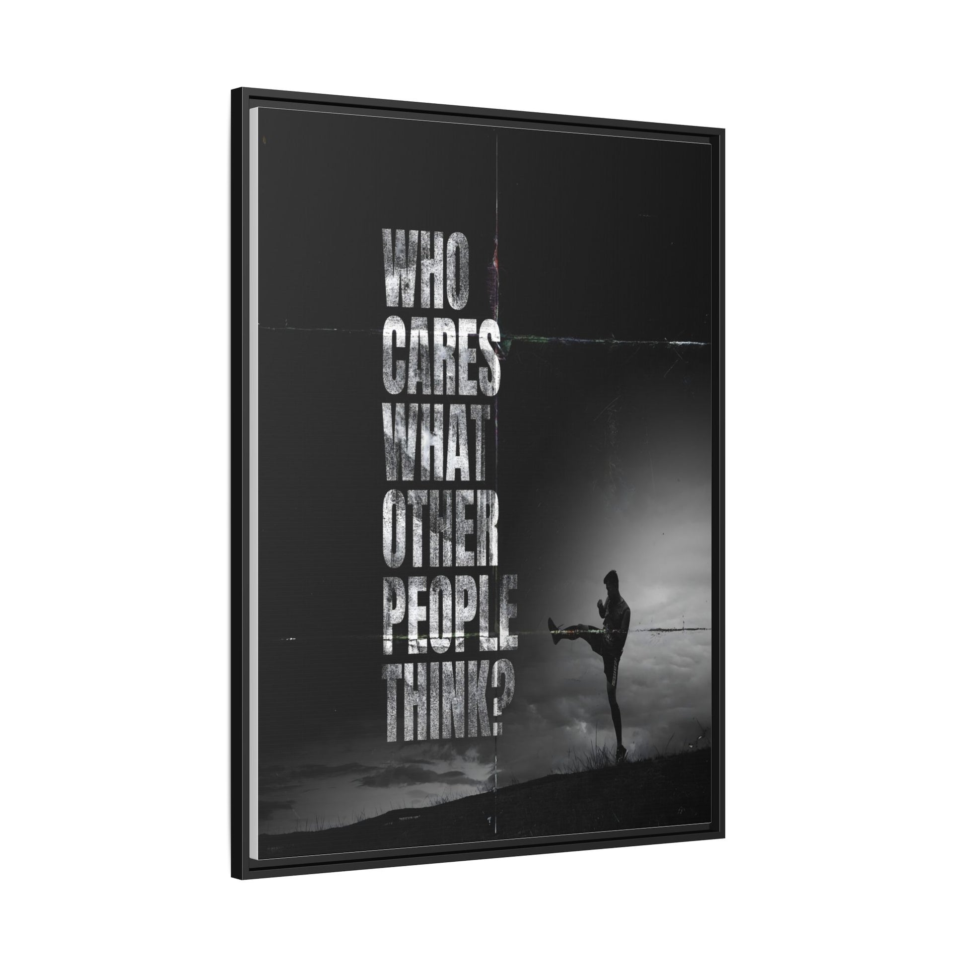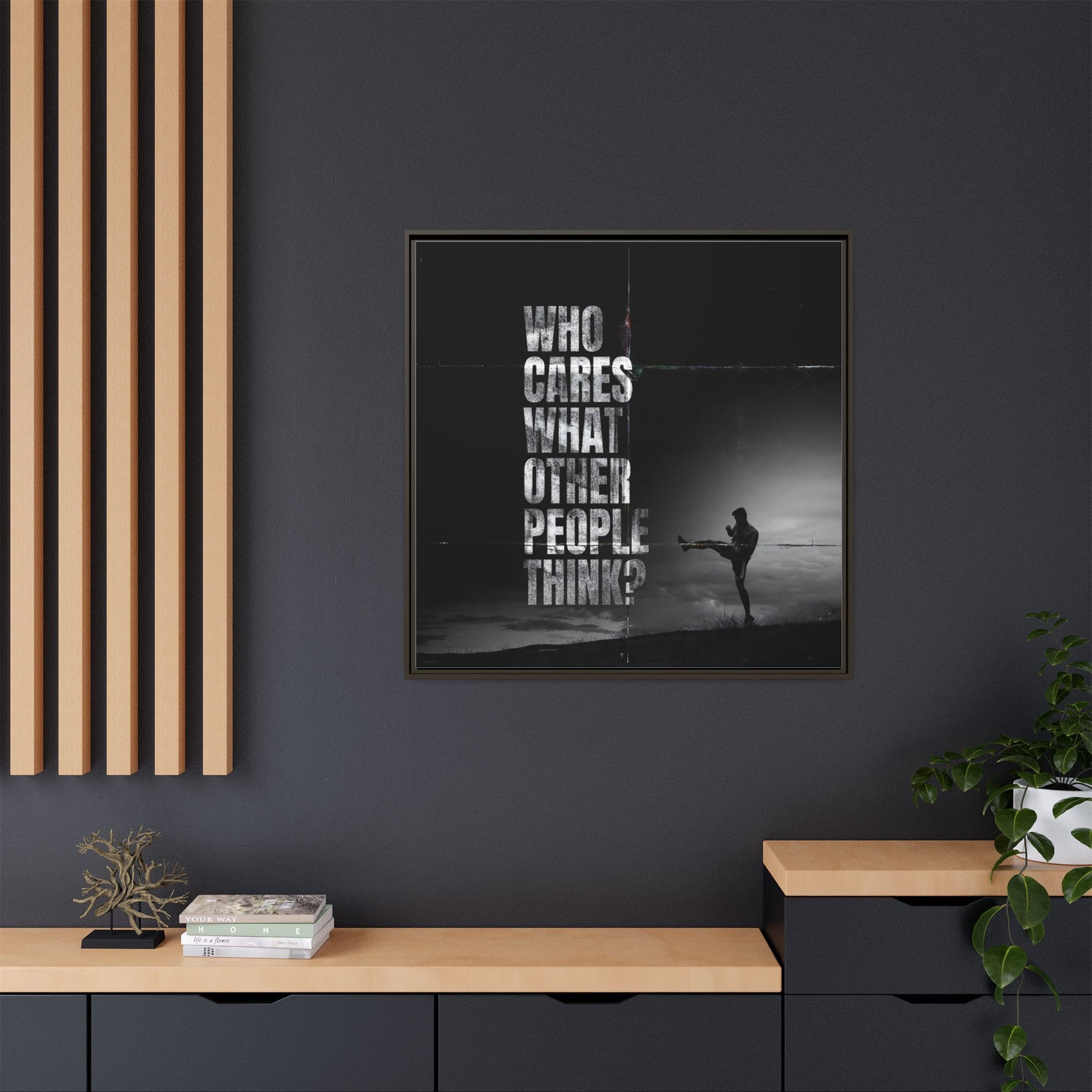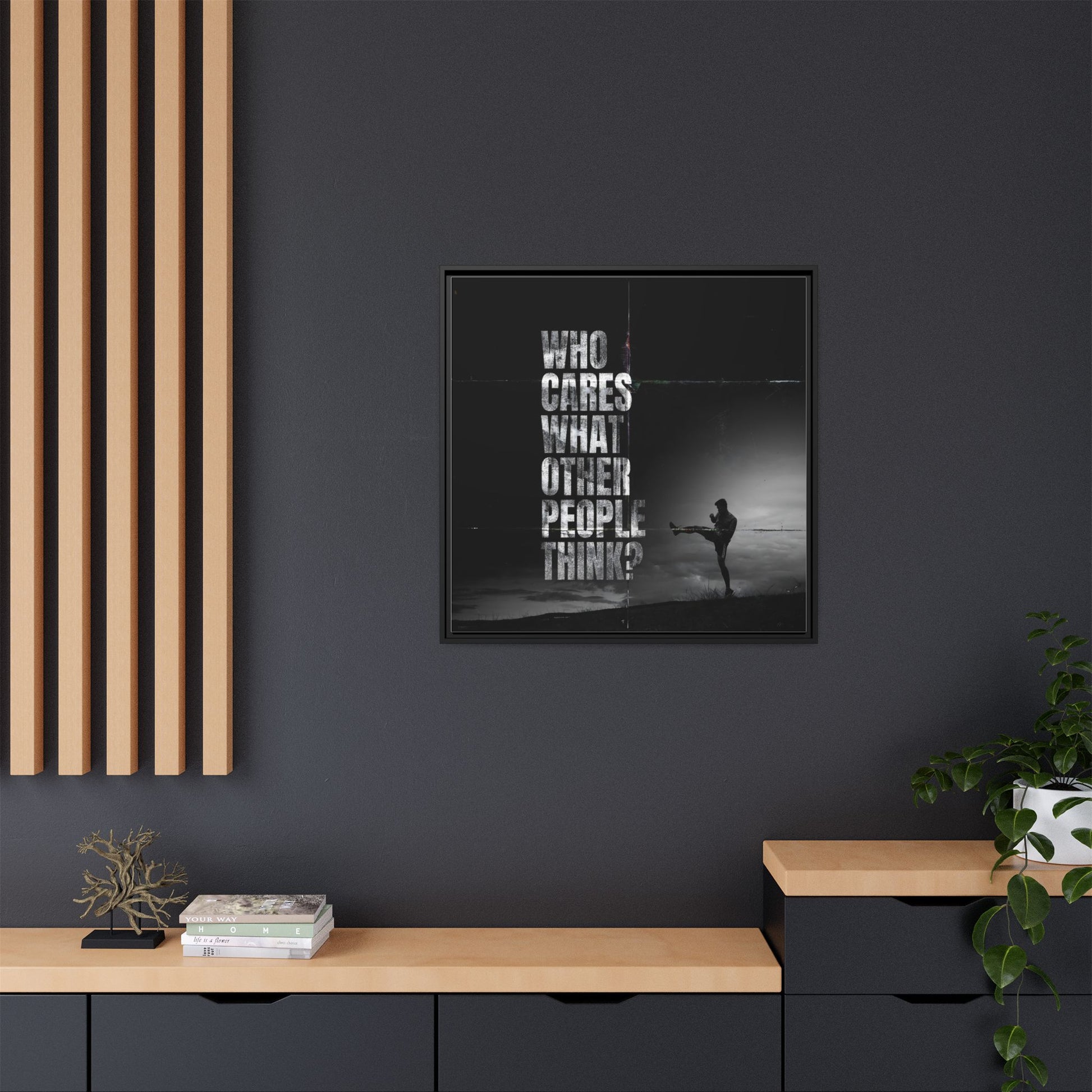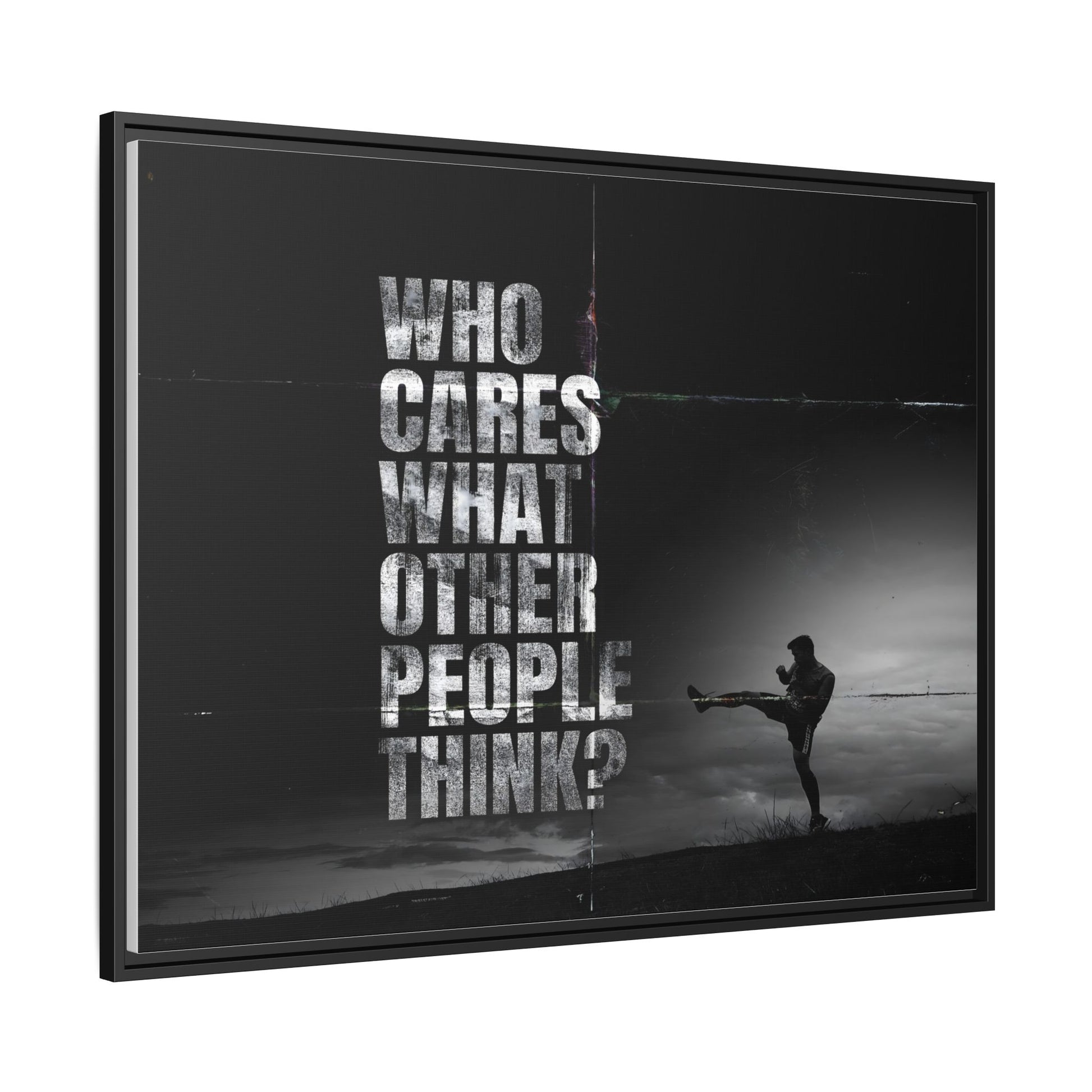 This powerful black and white graphic features the provocative text "WHO CARES WHAT OTHER PEOPLE THINK?" in large, distressed white letters against a dark, moody background. To the right of the text, a silhouetted figure is shown in a dynamic kicking pose, standing on a minimalist landscape with cloudy skies. The image conveys a strong message of individualism, independence, and defiance against social judgment or external expectations. The high-contrast design and dramatic positioning emphasize the rebellious spirit of the phrase. The overall aesthetic is stark, minimalist, and emotionally charged, using visual elements to reinforce the bold statement about personal authenticity.