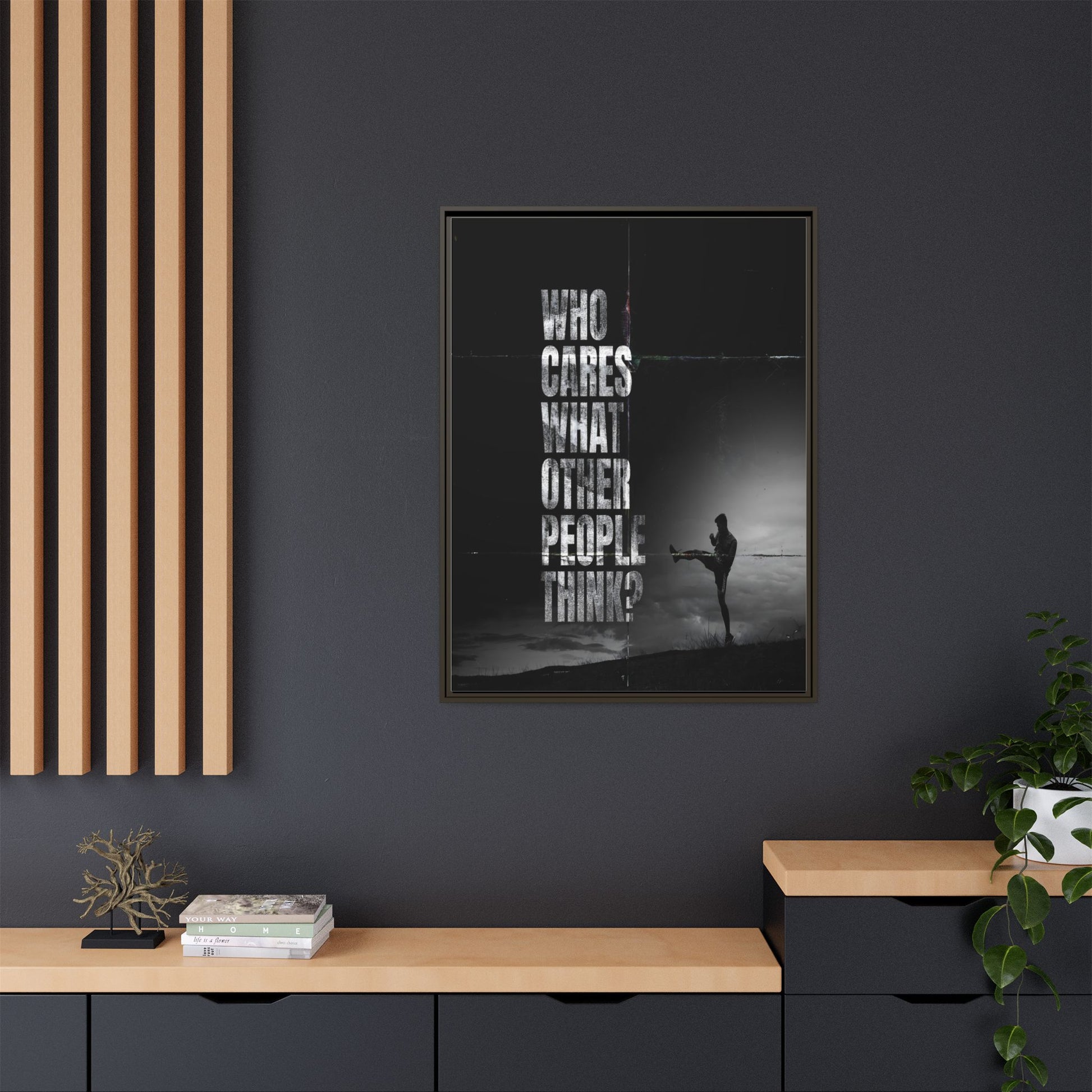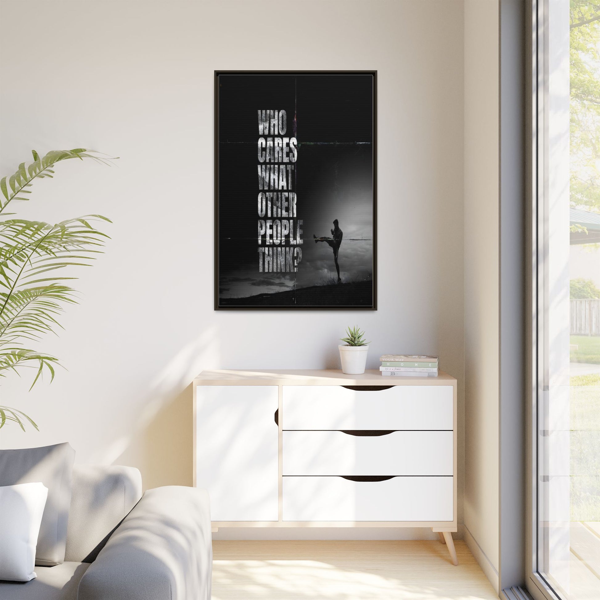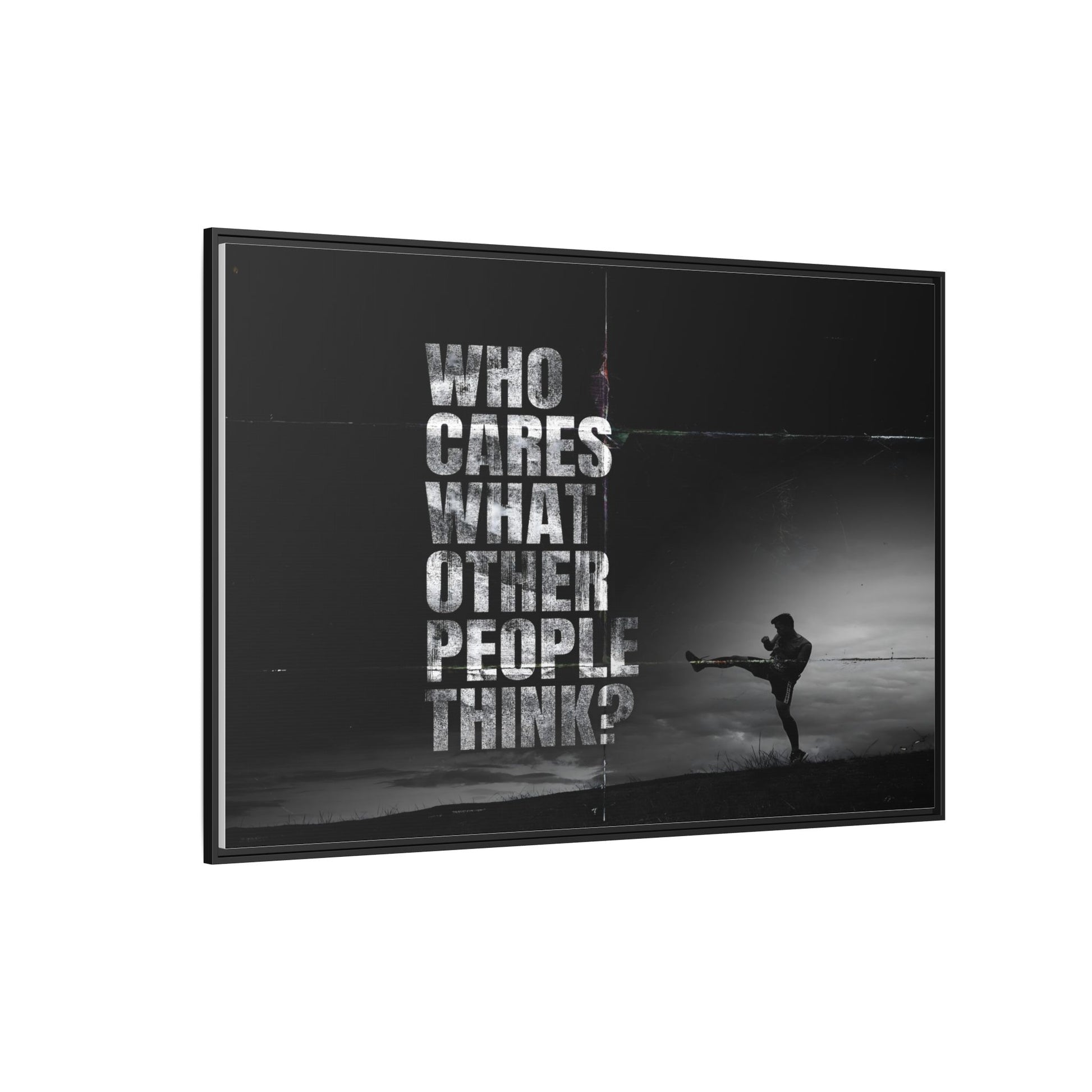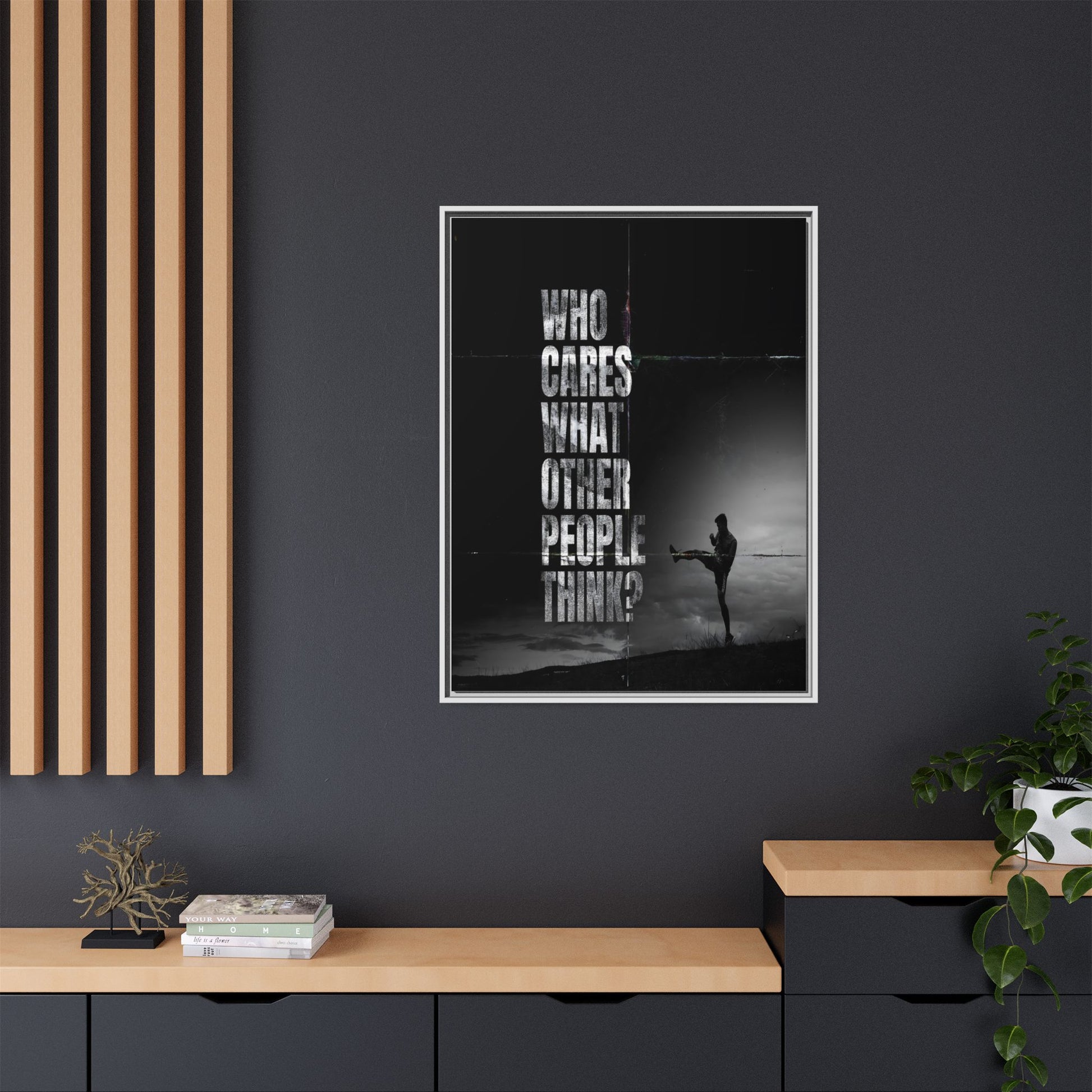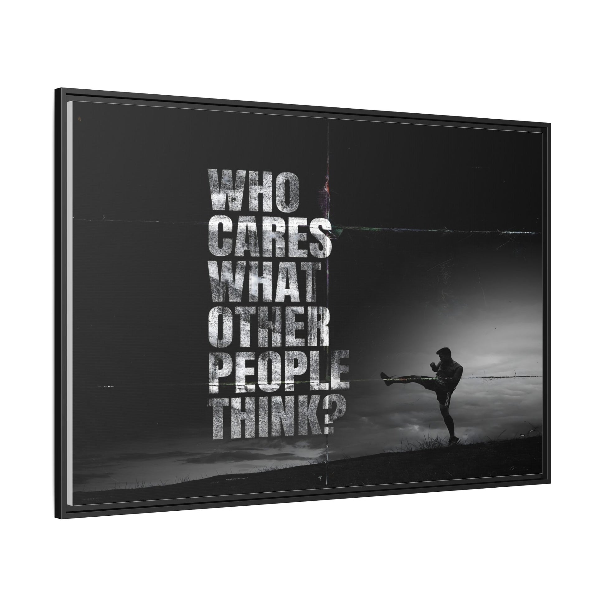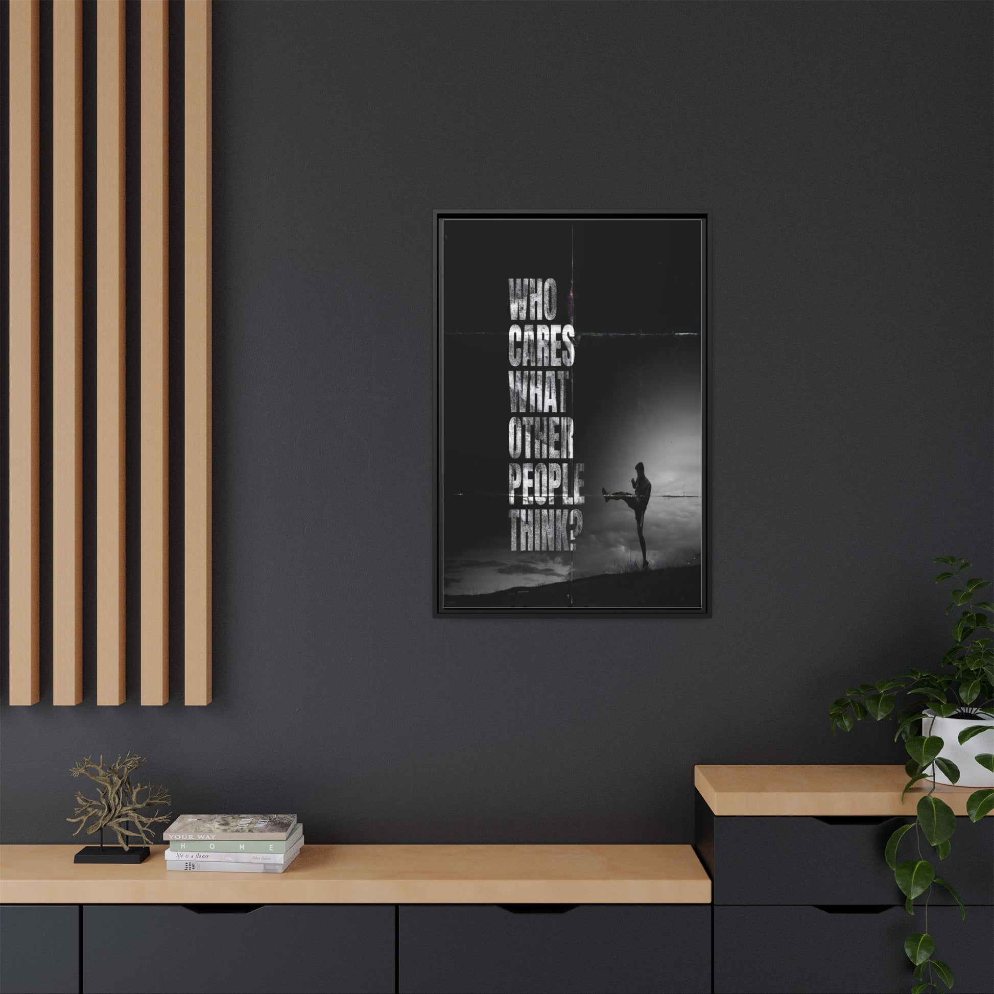 This powerful black and white graphic features the provocative text "WHO CARES WHAT OTHER PEOPLE THINK?" in large, distressed white letters against a dark, moody background. To the right of the text, a silhouetted figure is shown in a dynamic kicking pose, standing on a minimalist landscape with cloudy skies. The image conveys a strong message of individualism, independence, and defiance against social judgment or external expectations. The high-contrast design and dramatic positioning emphasize the rebellious spirit of the phrase. The overall aesthetic is stark, minimalist, and emotionally charged, using visual elements to reinforce the bold statement about personal authenticity.