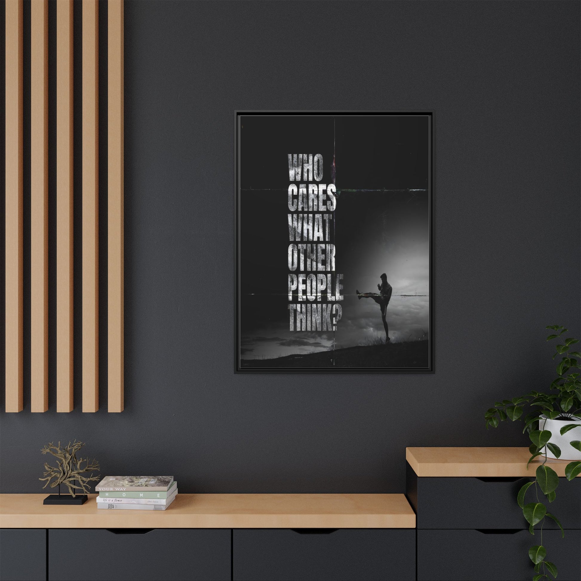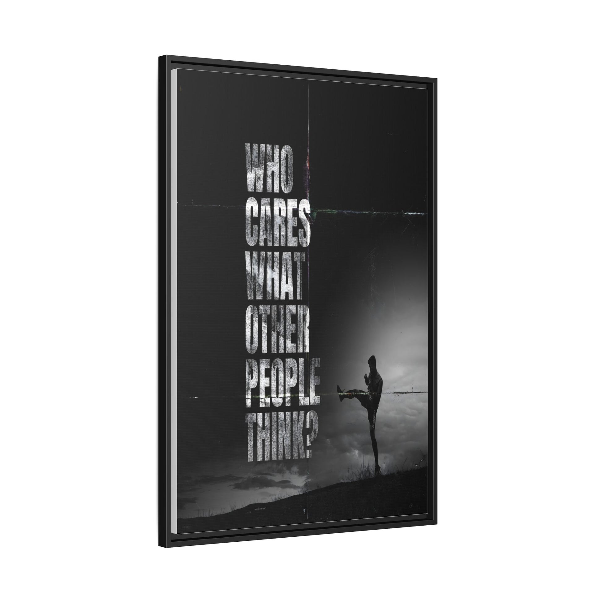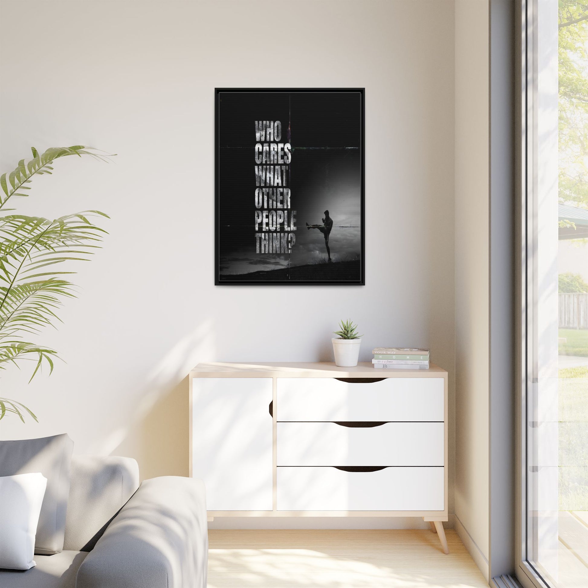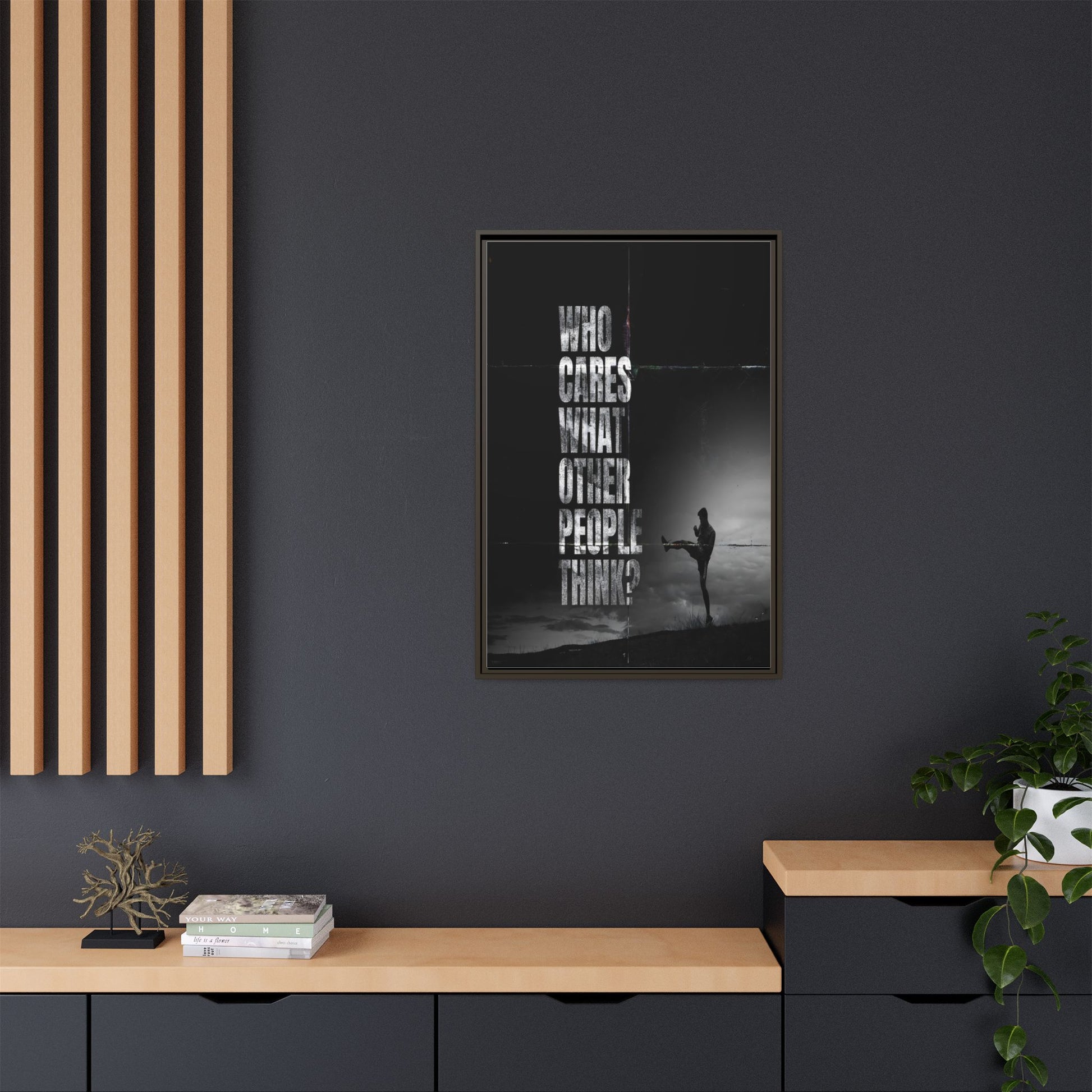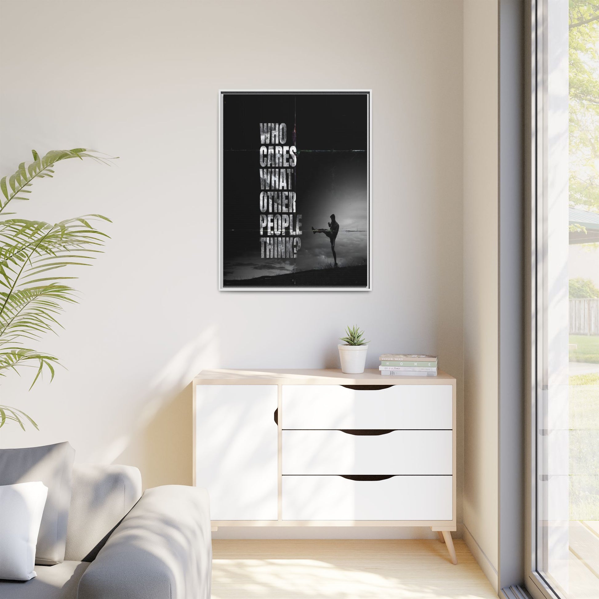 This powerful black and white graphic features the provocative text "WHO CARES WHAT OTHER PEOPLE THINK?" in large, distressed white letters against a dark, moody background. To the right of the text, a silhouetted figure is shown in a dynamic kicking pose, standing on a minimalist landscape with cloudy skies. The image conveys a strong message of individualism, independence, and defiance against social judgment or external expectations. The high-contrast design and dramatic positioning emphasize the rebellious spirit of the phrase. The overall aesthetic is stark, minimalist, and emotionally charged, using visual elements to reinforce the bold statement about personal authenticity.