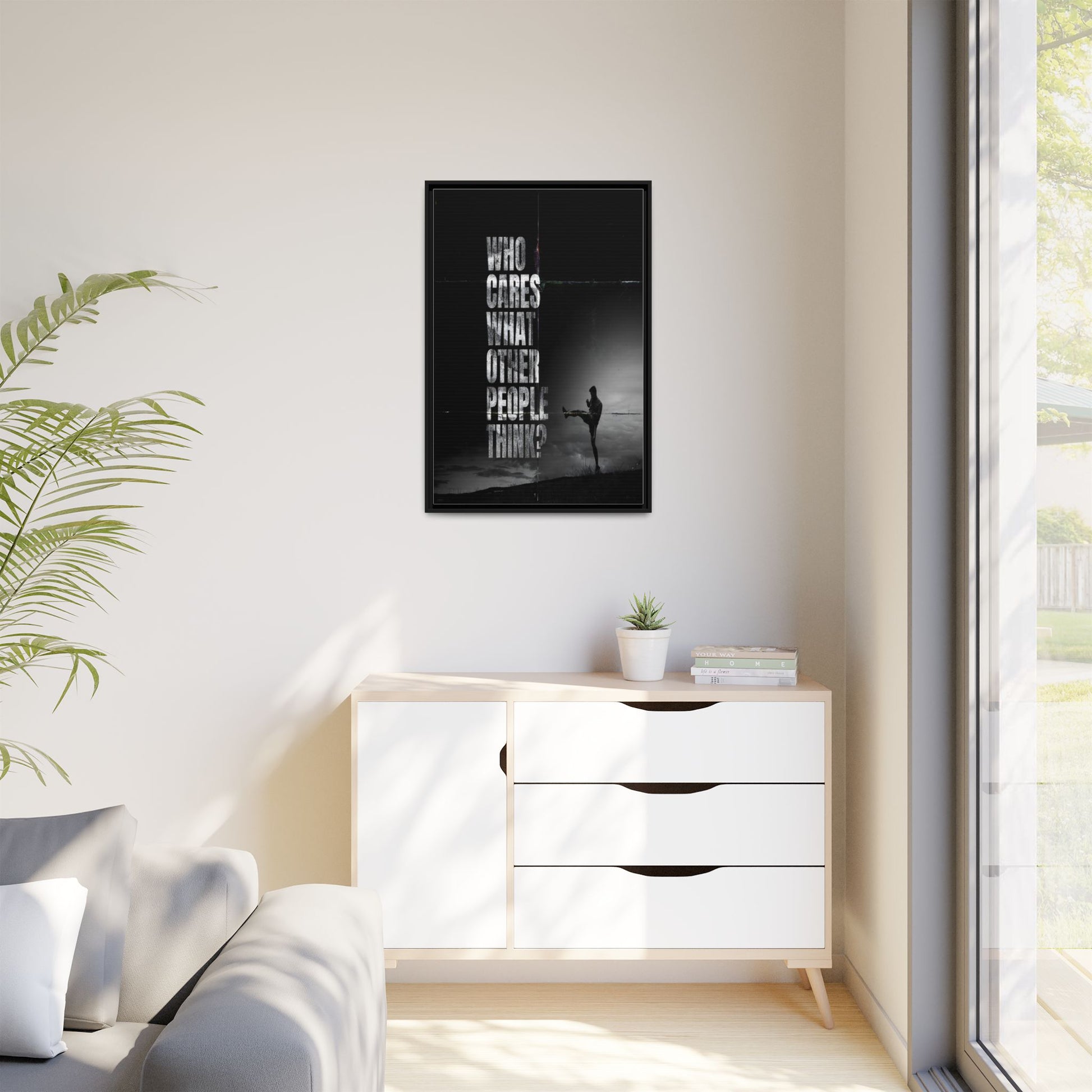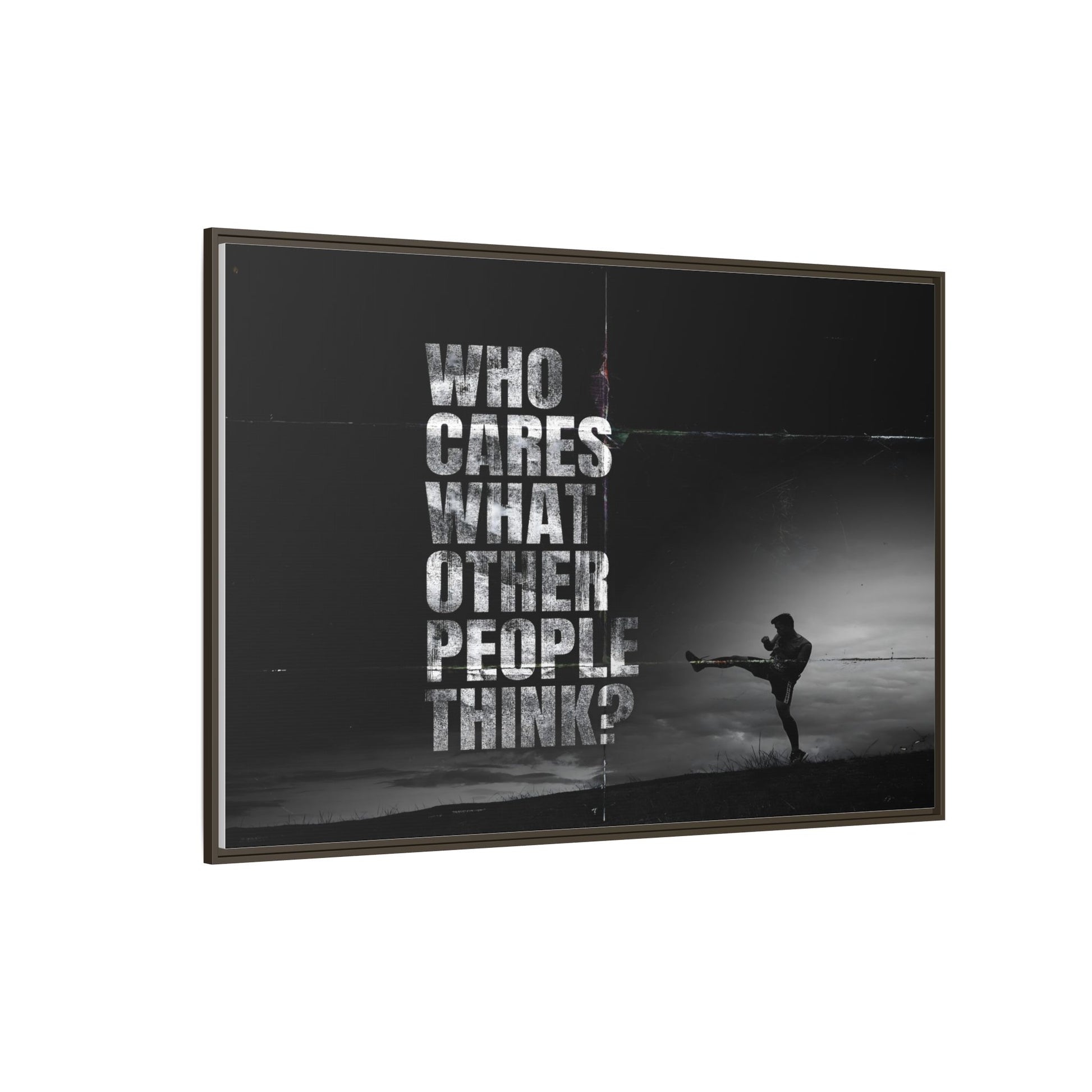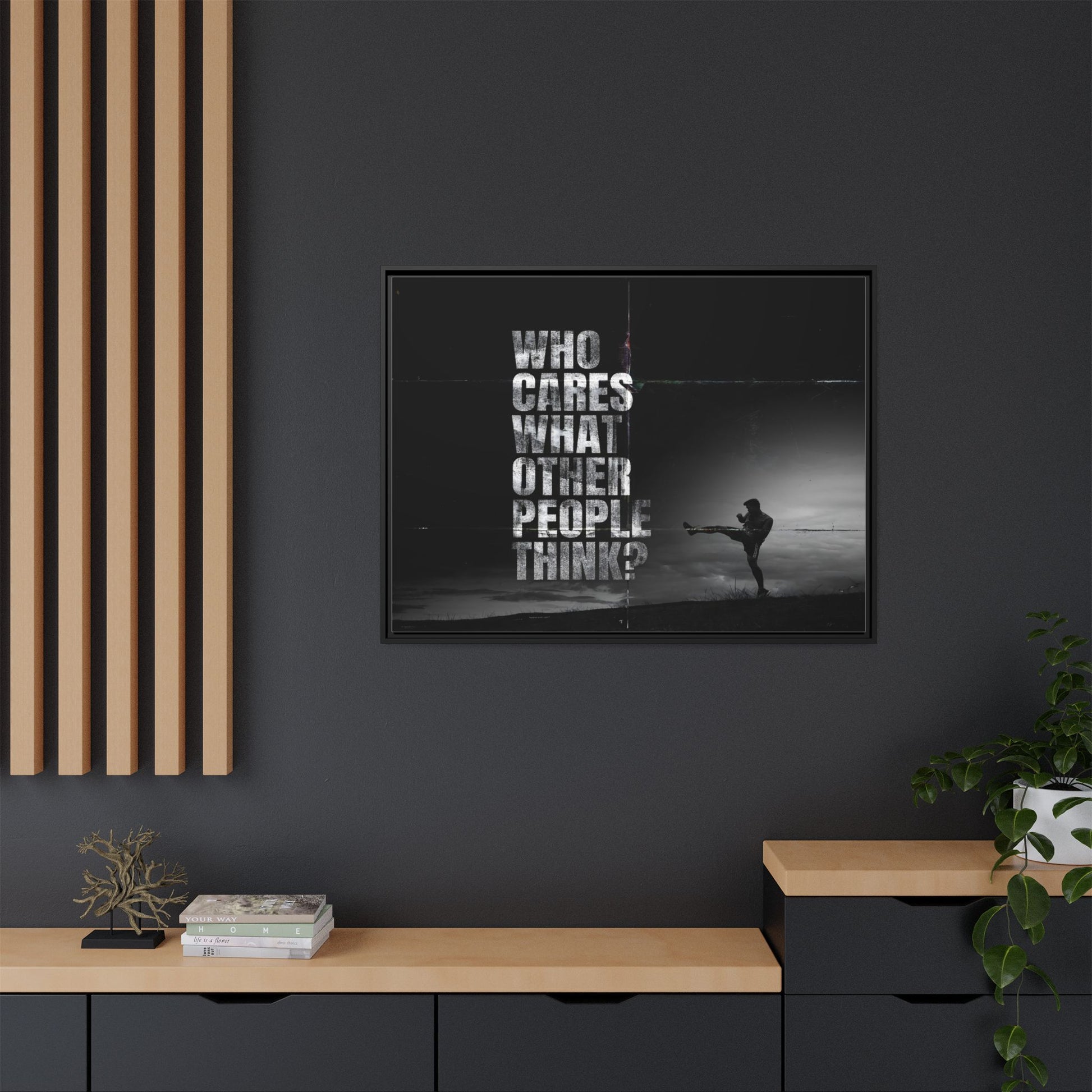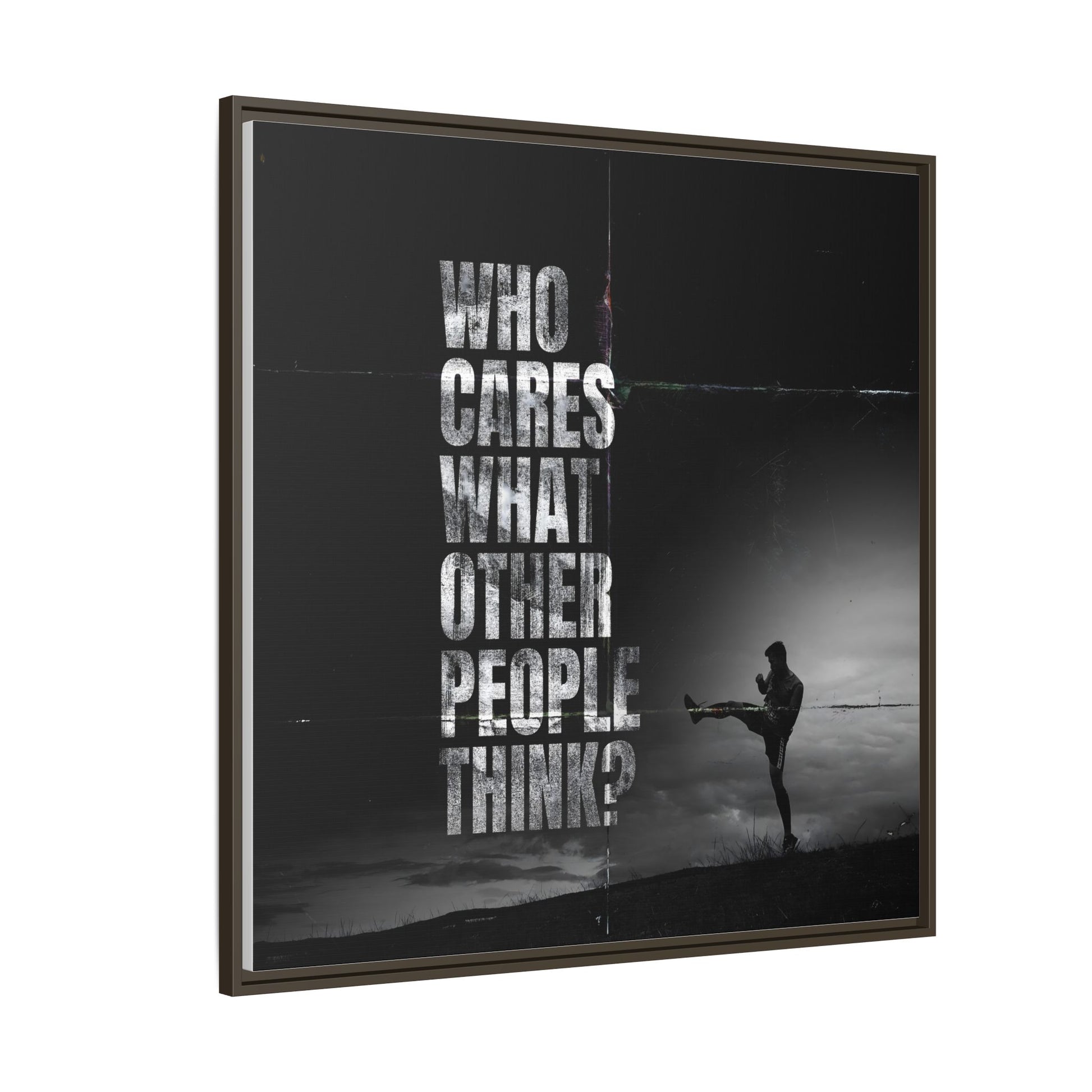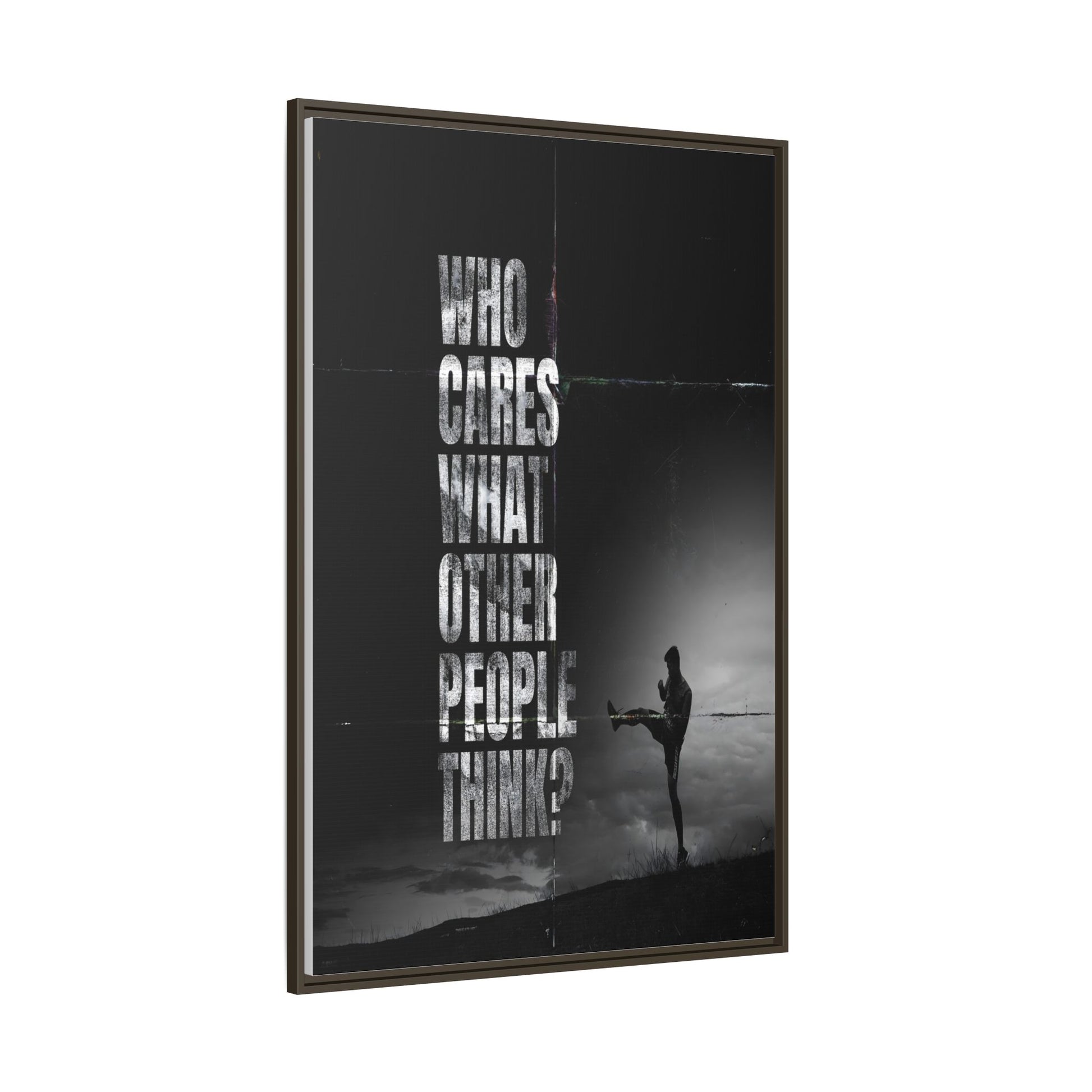 This powerful black and white graphic features the provocative text "WHO CARES WHAT OTHER PEOPLE THINK?" in large, distressed white letters against a dark, moody background. To the right of the text, a silhouetted figure is shown in a dynamic kicking pose, standing on a minimalist landscape with cloudy skies. The image conveys a strong message of individualism, independence, and defiance against social judgment or external expectations. The high-contrast design and dramatic positioning emphasize the rebellious spirit of the phrase. The overall aesthetic is stark, minimalist, and emotionally charged, using visual elements to reinforce the bold statement about personal authenticity.