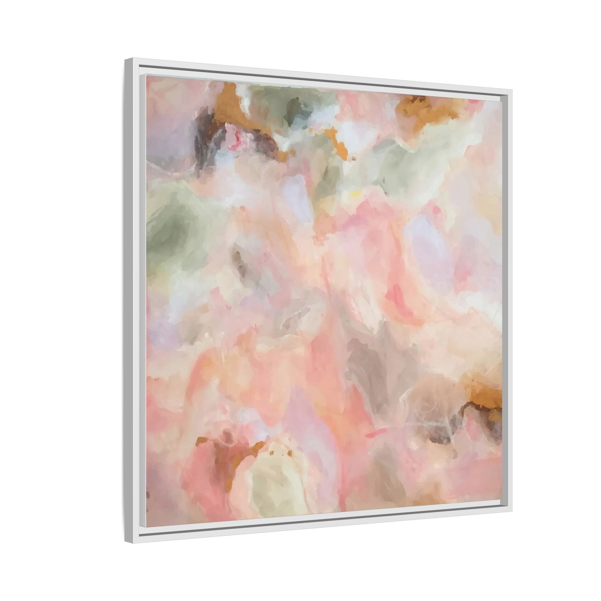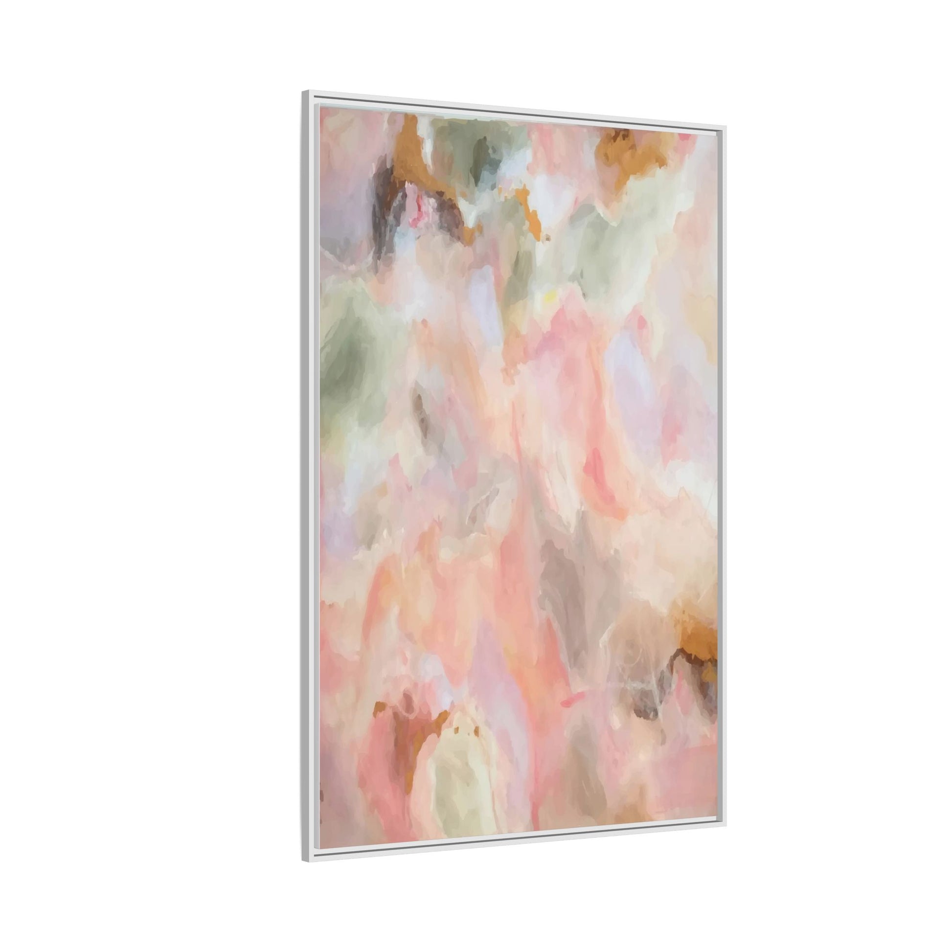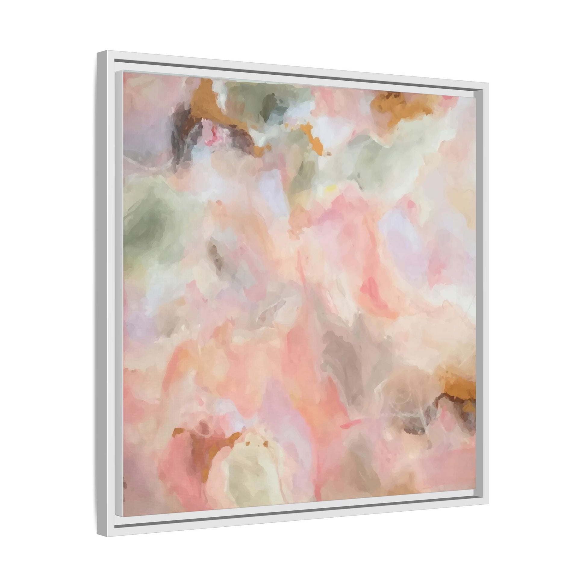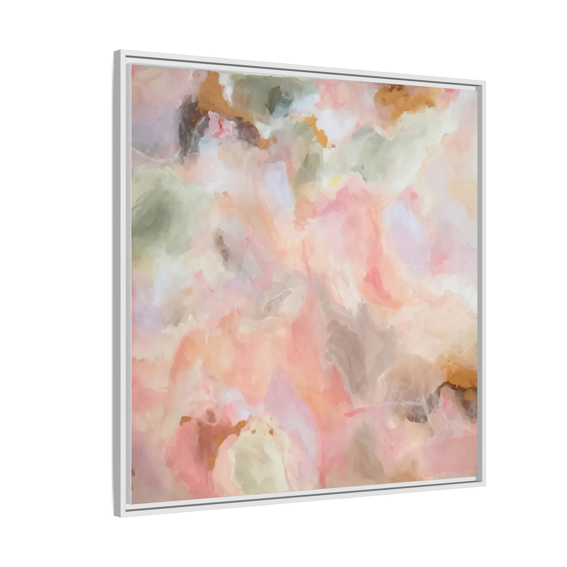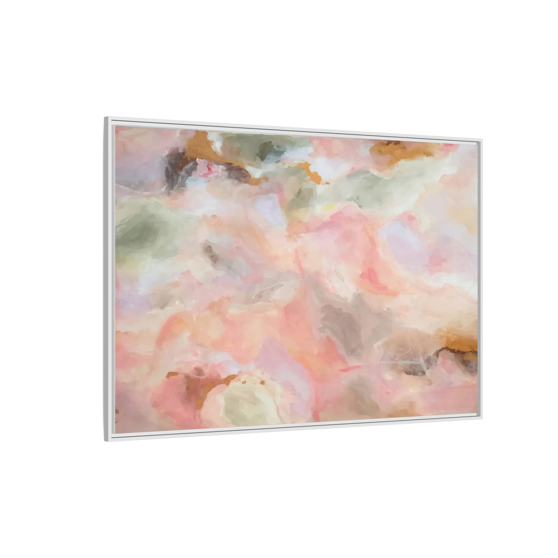 This ethereal abstract artwork showcases a delicate watercolor-style composition featuring soft, blended colors reminiscent of a dreamy cloudscape. The palette is predominantly composed of muted pinks, gentle greens, warm yellows, and subtle grays, creating a harmonious and soothing visual experience. Fluid brush strokes and translucent layers give the image a sense of depth and movement, with colors bleeding and blending into each other in organic, cloud-like formations. The painting appears to have a watercolor or digital painting technique, with edges that are soft and undefined, allowing colors to merge and create subtle transitions. The overall effect is calming and contemplative, evoking the sensation of gazing into a pastel-tinted sky or a abstract landscape viewed through a soft, diffused lens.