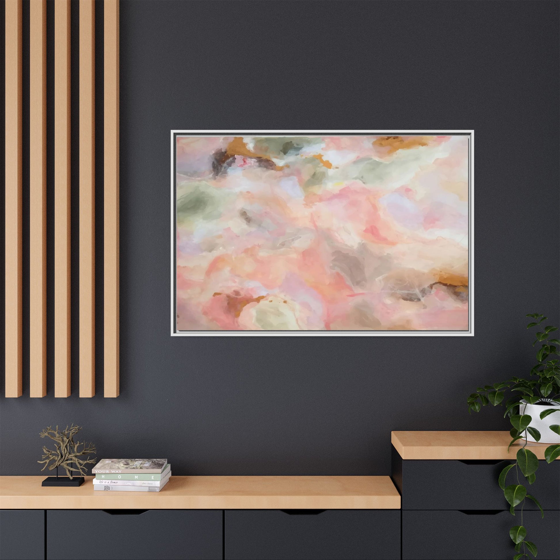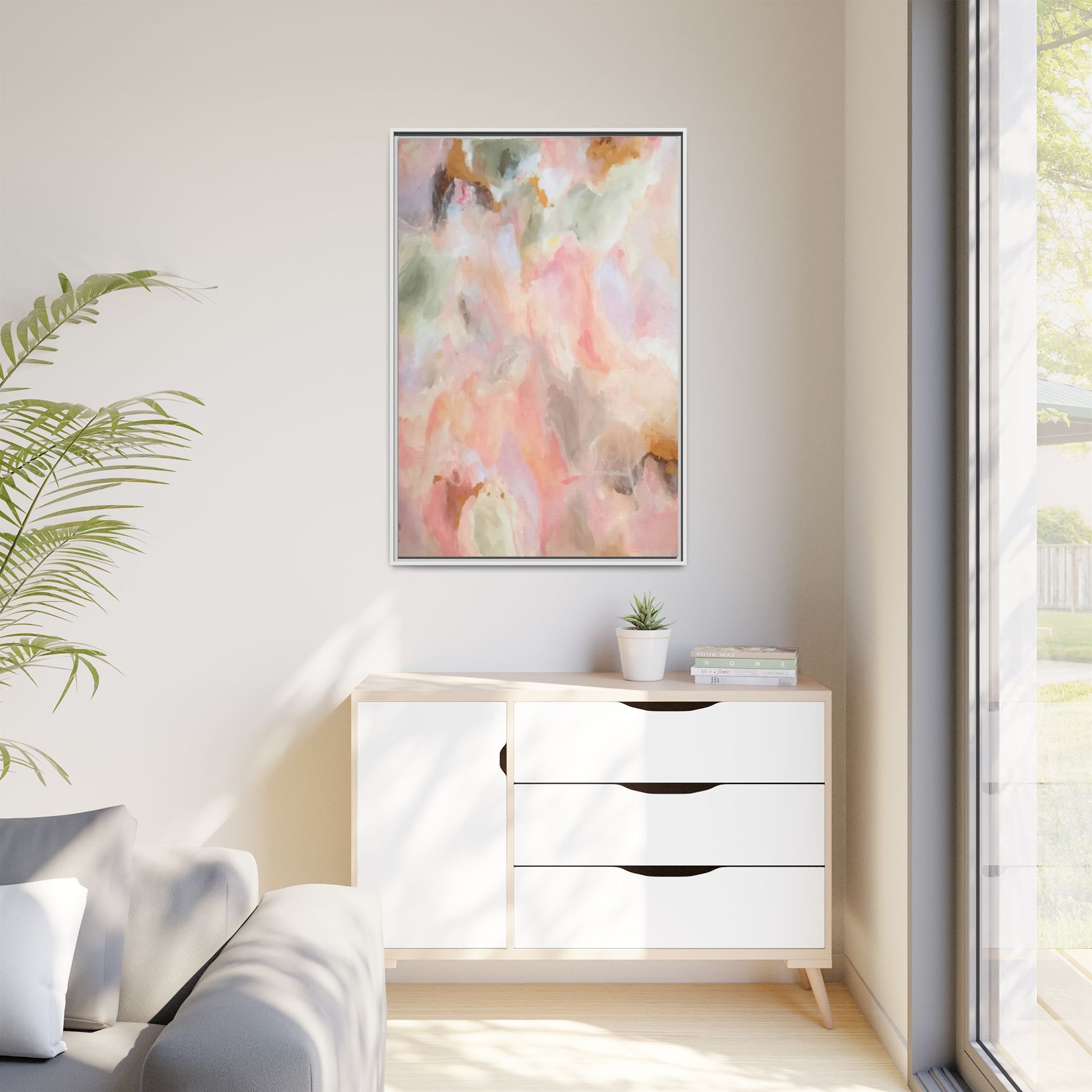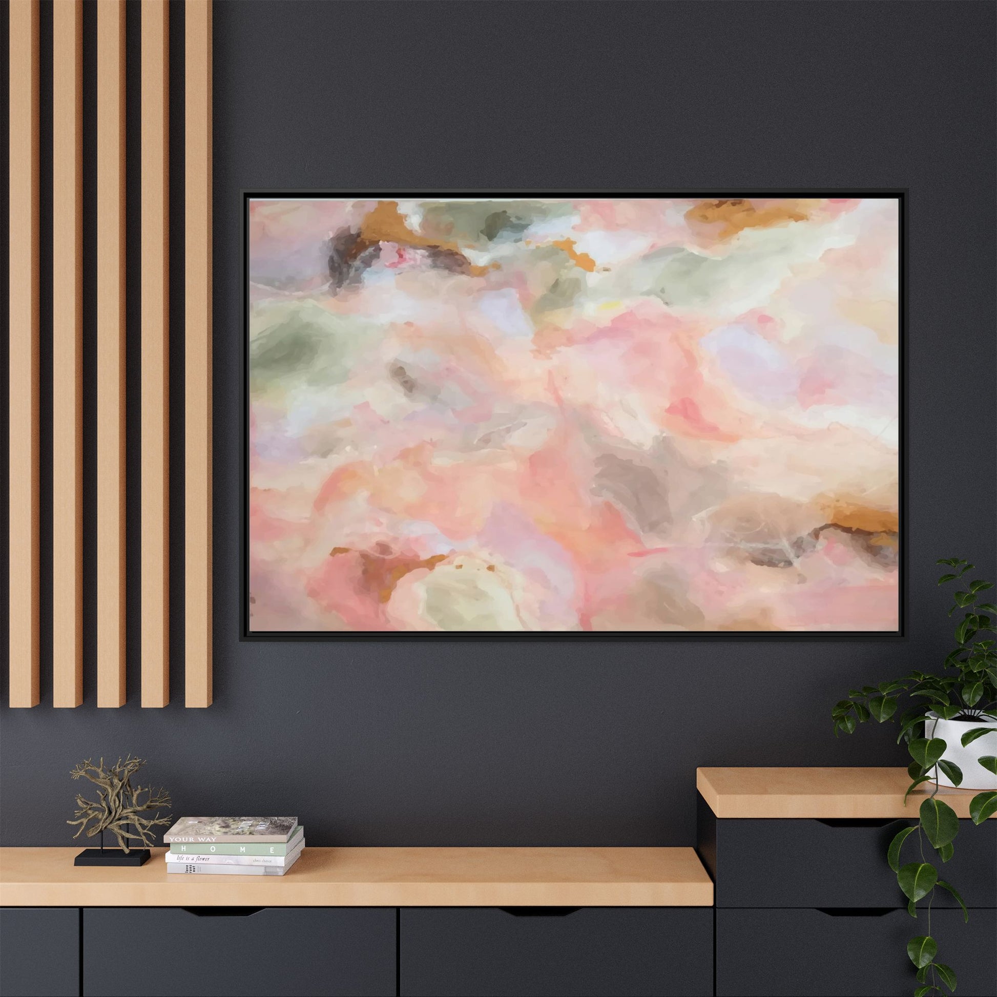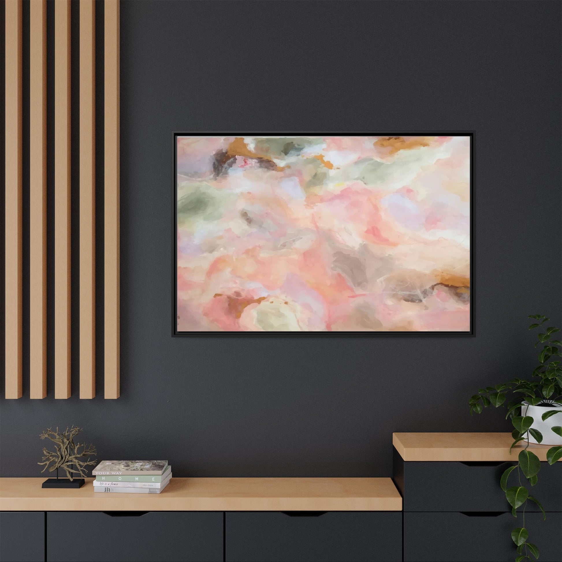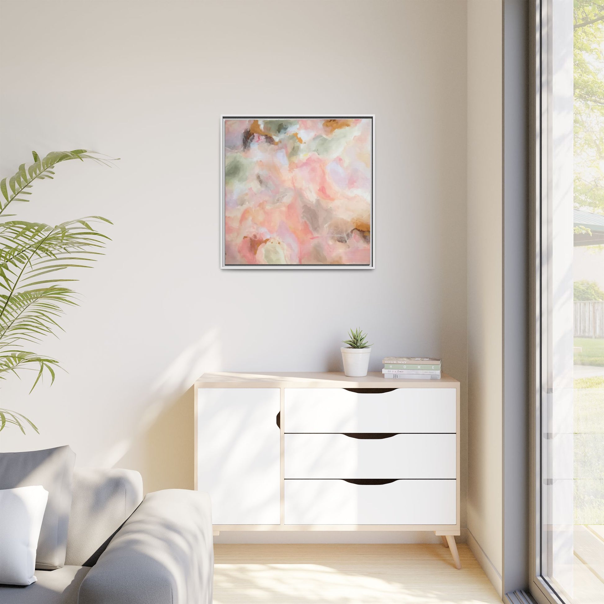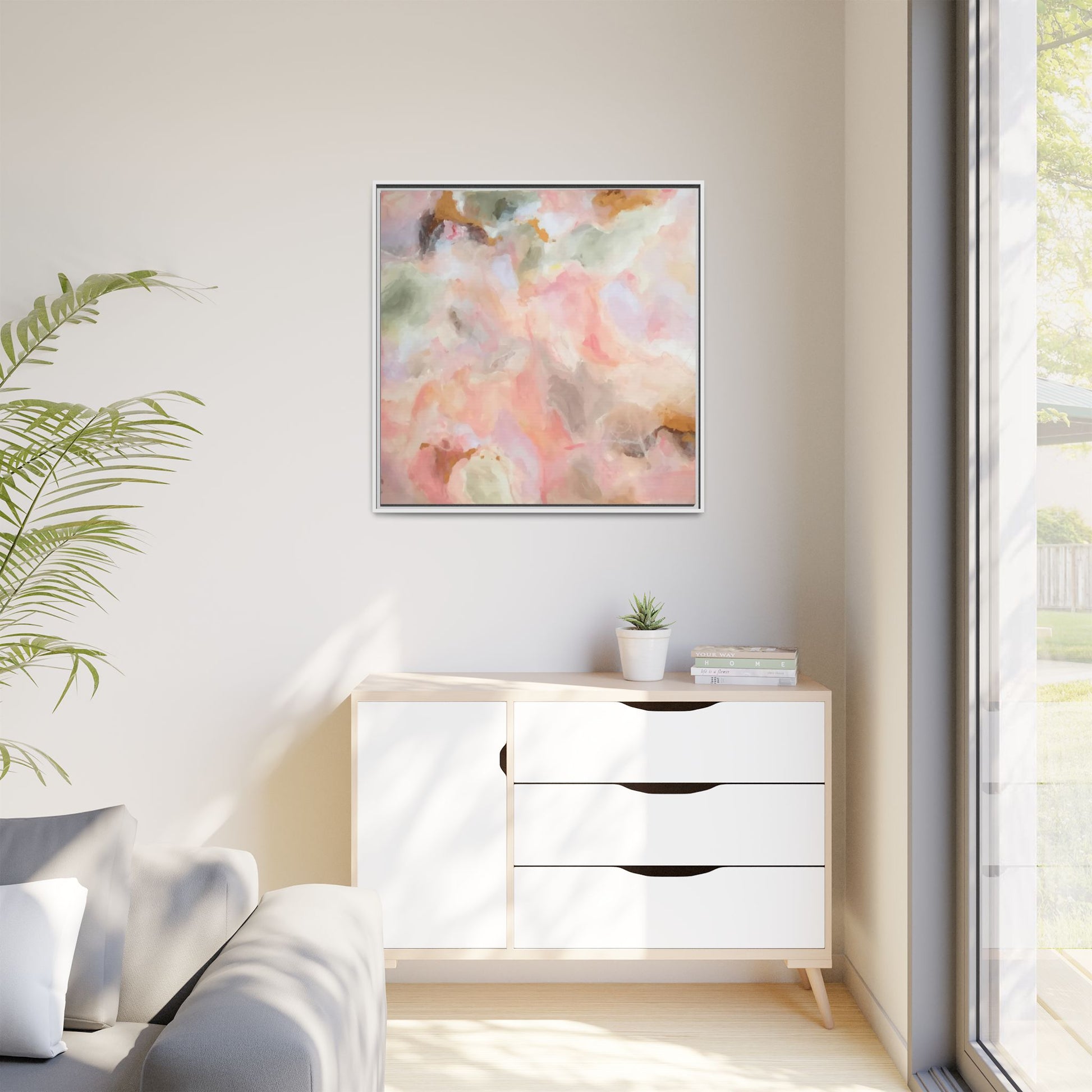 This ethereal abstract artwork showcases a delicate watercolor-style composition featuring soft, blended colors reminiscent of a dreamy cloudscape. The palette is predominantly composed of muted pinks, gentle greens, warm yellows, and subtle grays, creating a harmonious and soothing visual experience. Fluid brush strokes and translucent layers give the image a sense of depth and movement, with colors bleeding and blending into each other in organic, cloud-like formations. The painting appears to have a watercolor or digital painting technique, with edges that are soft and undefined, allowing colors to merge and create subtle transitions. The overall effect is calming and contemplative, evoking the sensation of gazing into a pastel-tinted sky or a abstract landscape viewed through a soft, diffused lens.