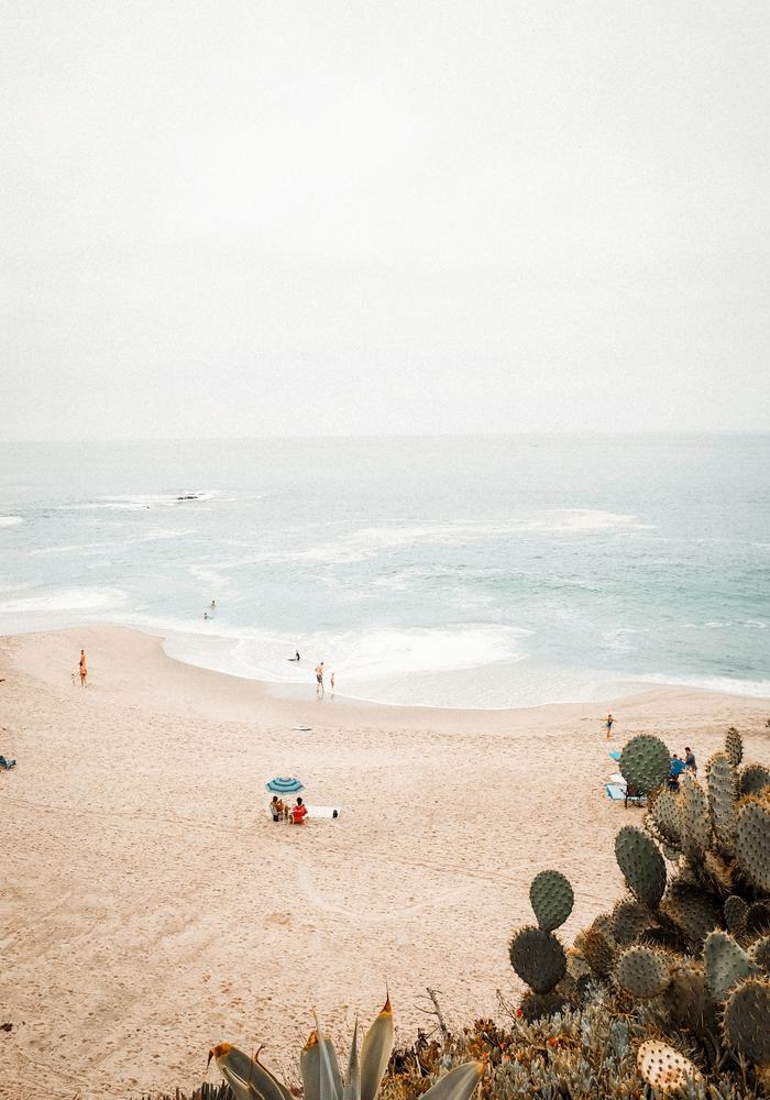 A serene beachscape unfolds, where gentle waves kiss the sandy shore. Sparse beachgoers dot the coastline, enveloped in the muted whispers of sea and sky. Cacti frame the scene, hinting at a quiet, reflective moment beneath an expansive horizon.