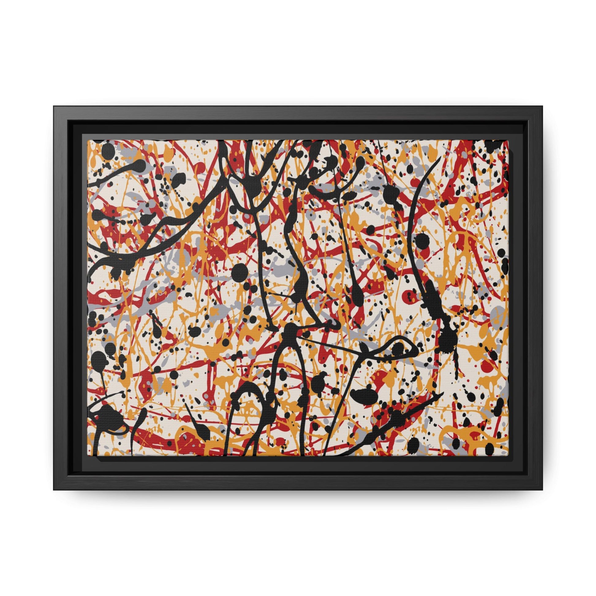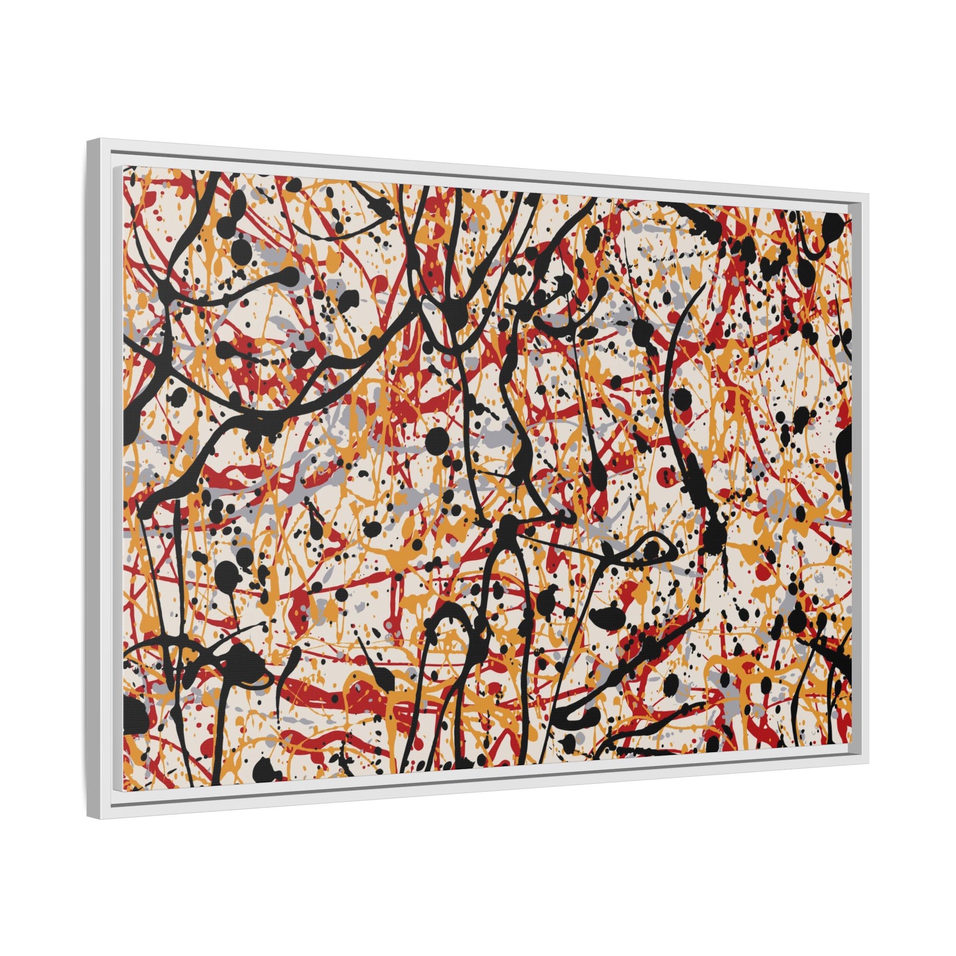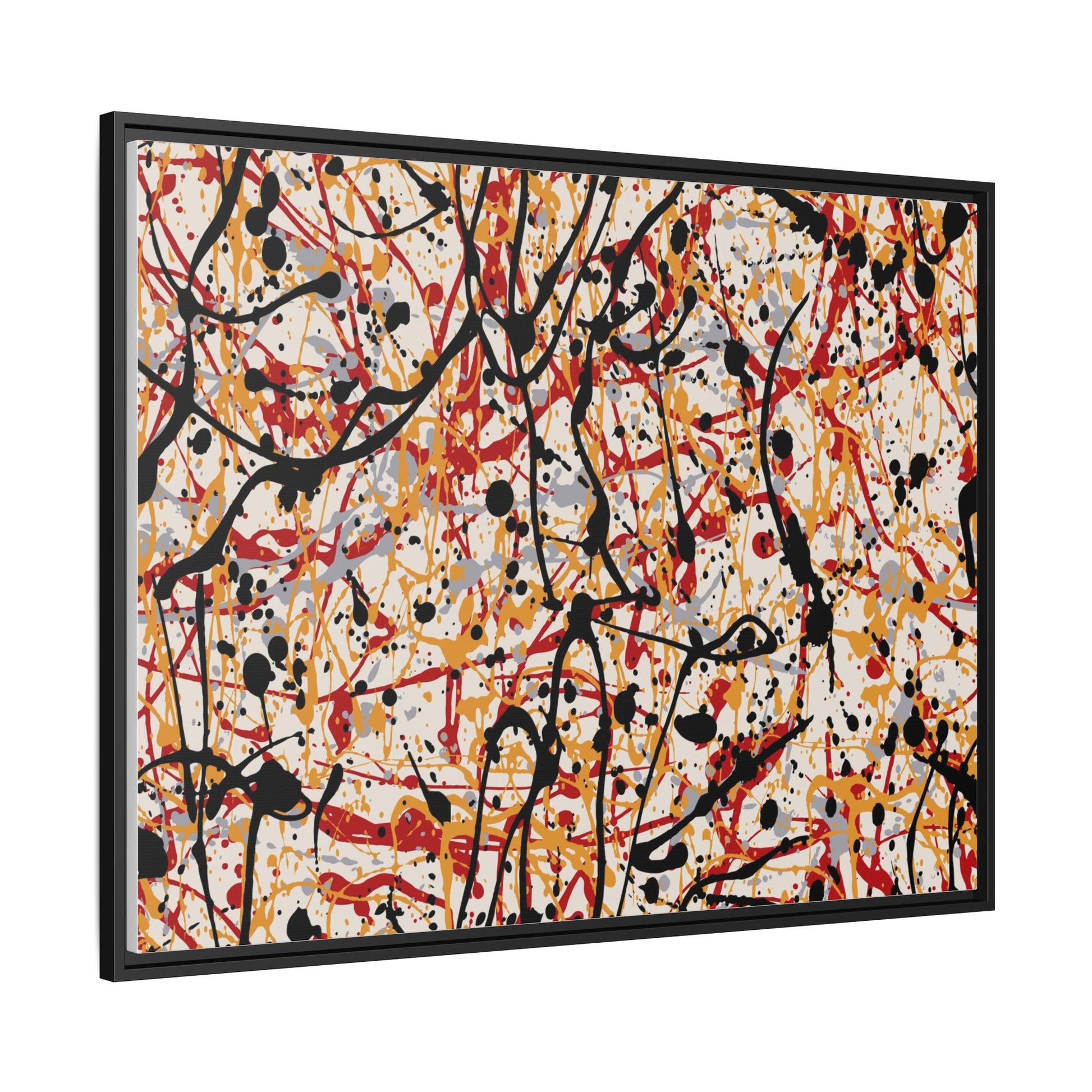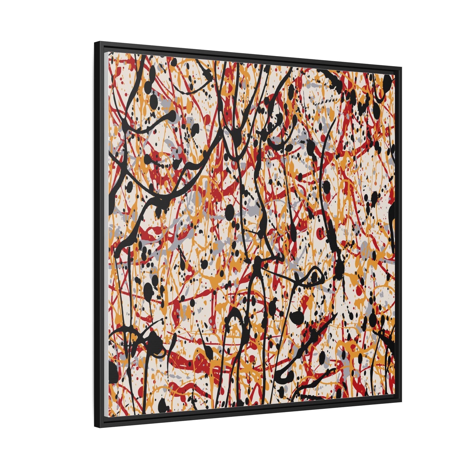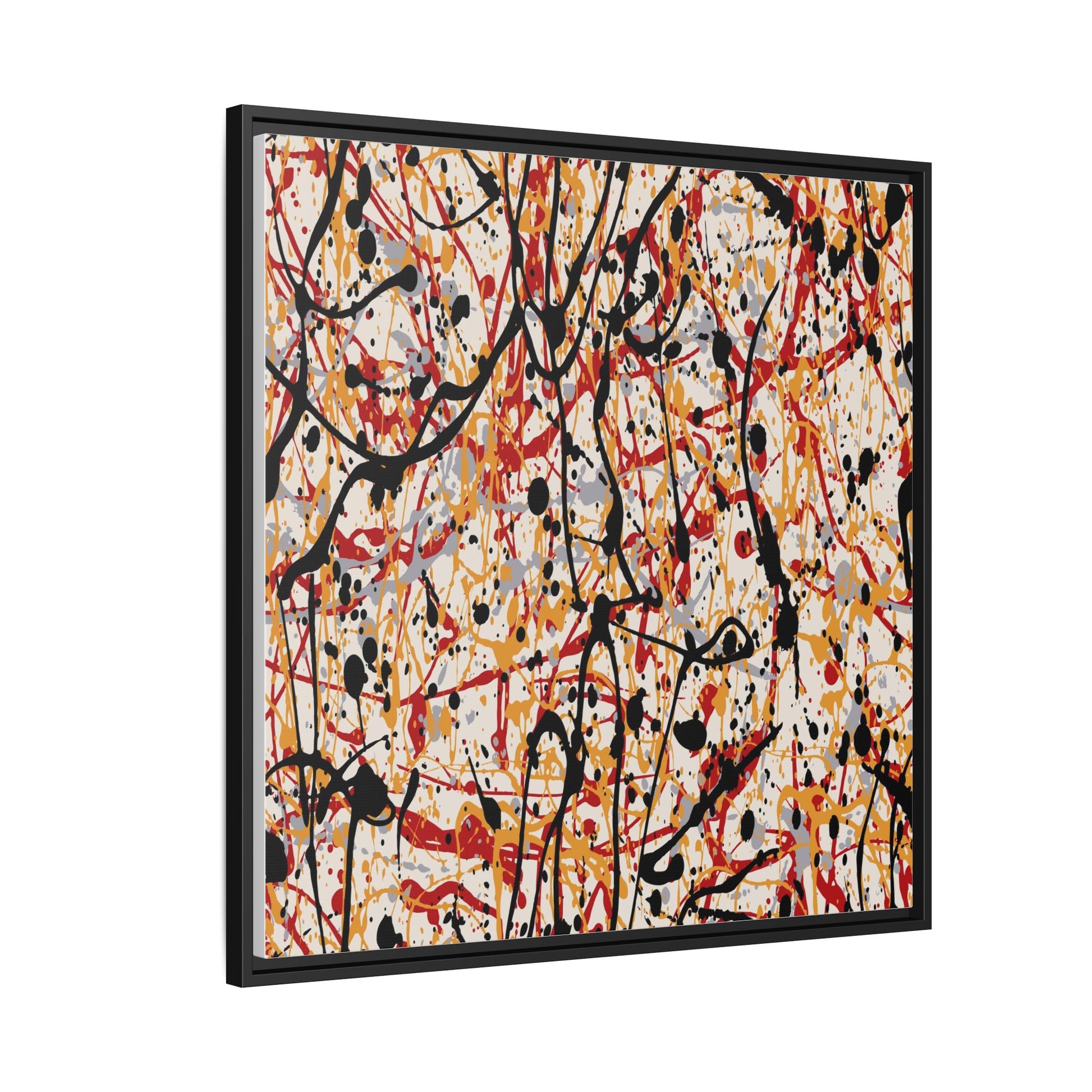 This dynamic abstract artwork showcases a vibrant Jackson Pollock-inspired drip painting technique, characterized by intricate layers of intertwining paint splatters and lines. The color palette consists of bold black, fiery red, warm yellow, and soft gray tones, creating a visually energetic and chaotic composition. Paint drips and splatters crisscross the canvas in multiple directions, forming a dense network of spontaneous and seemingly random marks that create a sense of movement and depth. The painting's style emphasizes action and emotional expression, with each color and line appearing to be applied with intense, gestural brushstrokes and techniques. The overall effect is a powerful, rhythmic abstract expressionist piece that invites viewers to explore its complex layers and find their own visual interpretations within the intricate pattern.