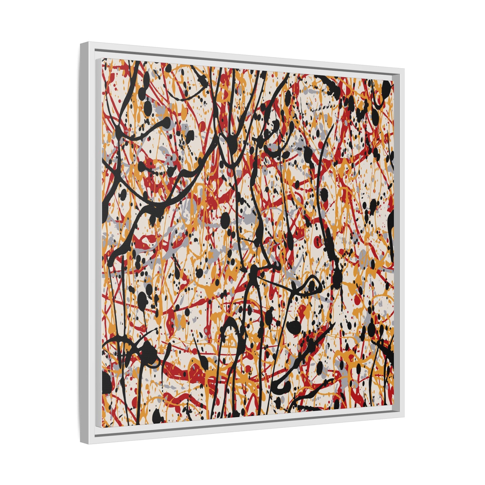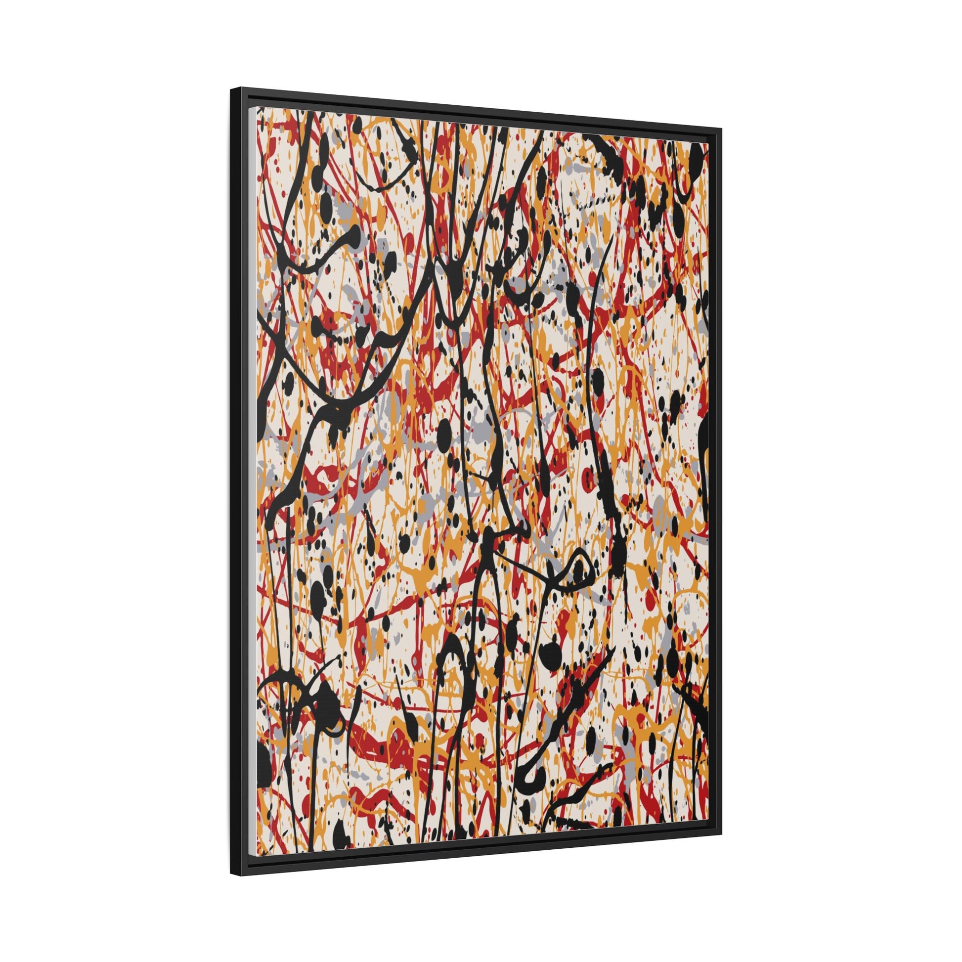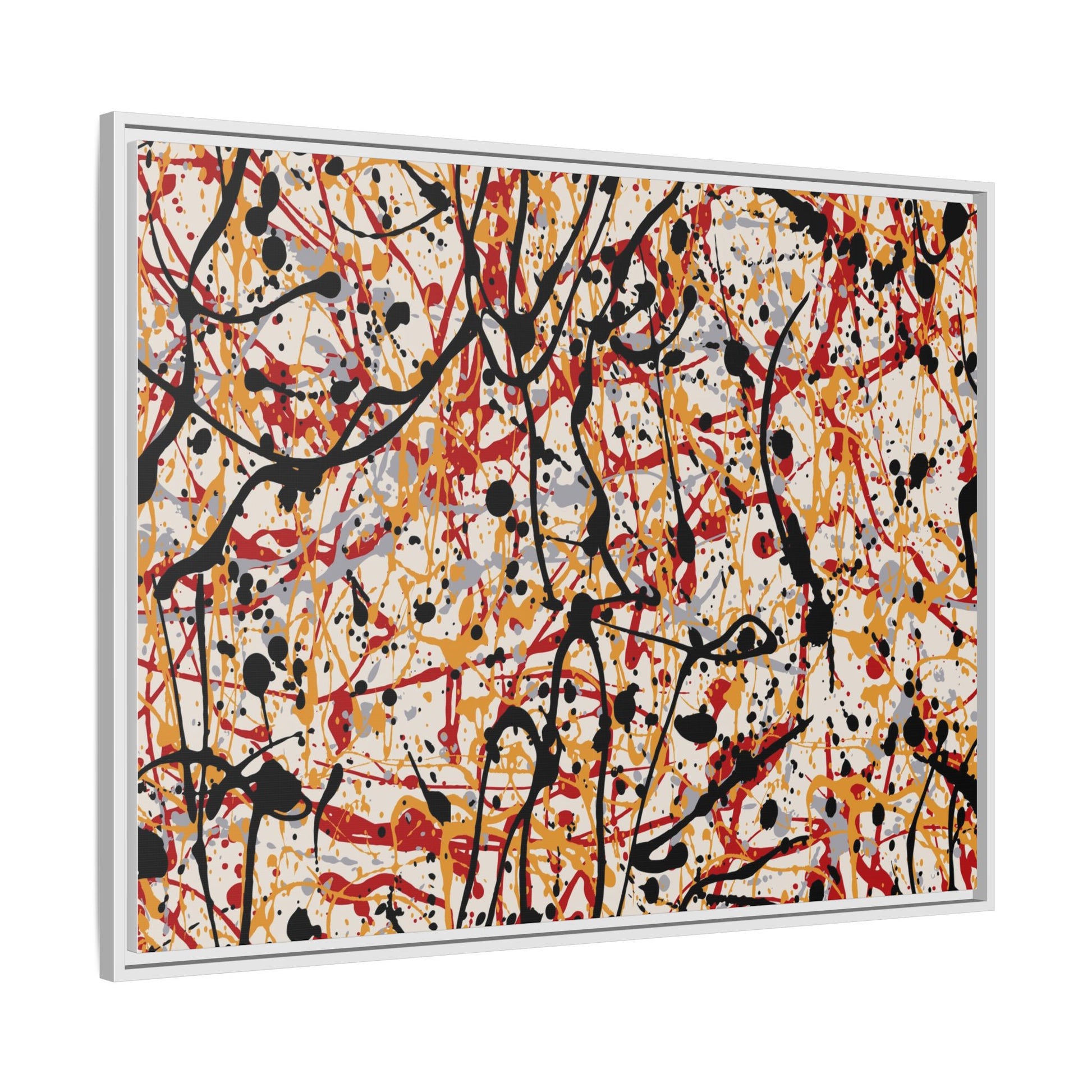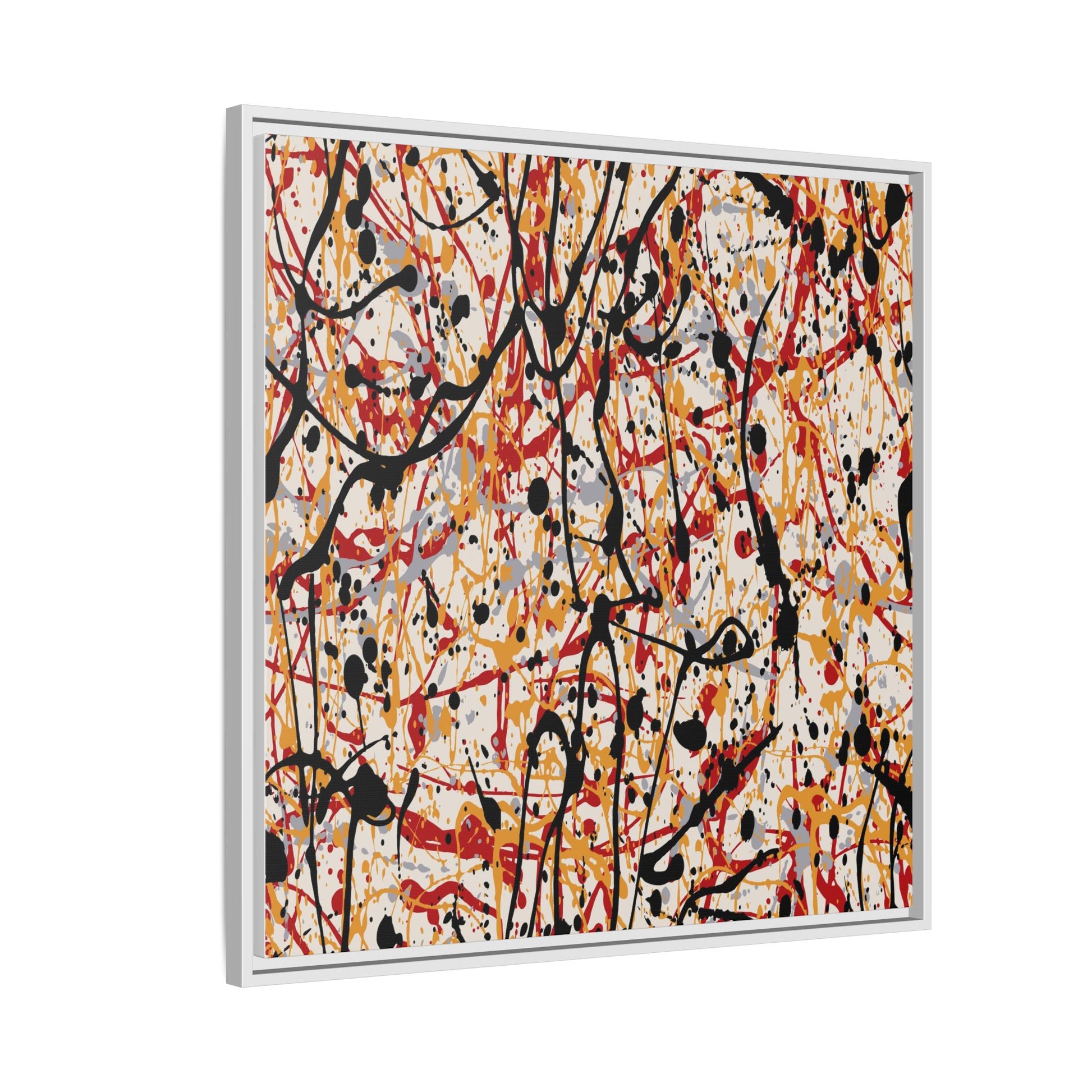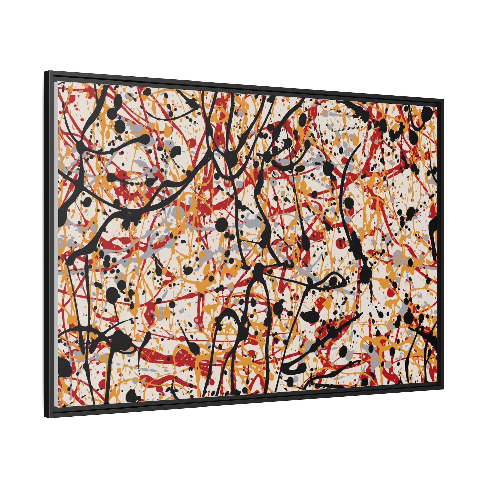 This dynamic abstract artwork showcases a vibrant Jackson Pollock-inspired drip painting technique, characterized by intricate layers of intertwining paint splatters and lines. The color palette consists of bold black, fiery red, warm yellow, and soft gray tones, creating a visually energetic and chaotic composition. Paint drips and splatters crisscross the canvas in multiple directions, forming a dense network of spontaneous and seemingly random marks that create a sense of movement and depth. The painting's style emphasizes action and emotional expression, with each color and line appearing to be applied with intense, gestural brushstrokes and techniques. The overall effect is a powerful, rhythmic abstract expressionist piece that invites viewers to explore its complex layers and find their own visual interpretations within the intricate pattern.
