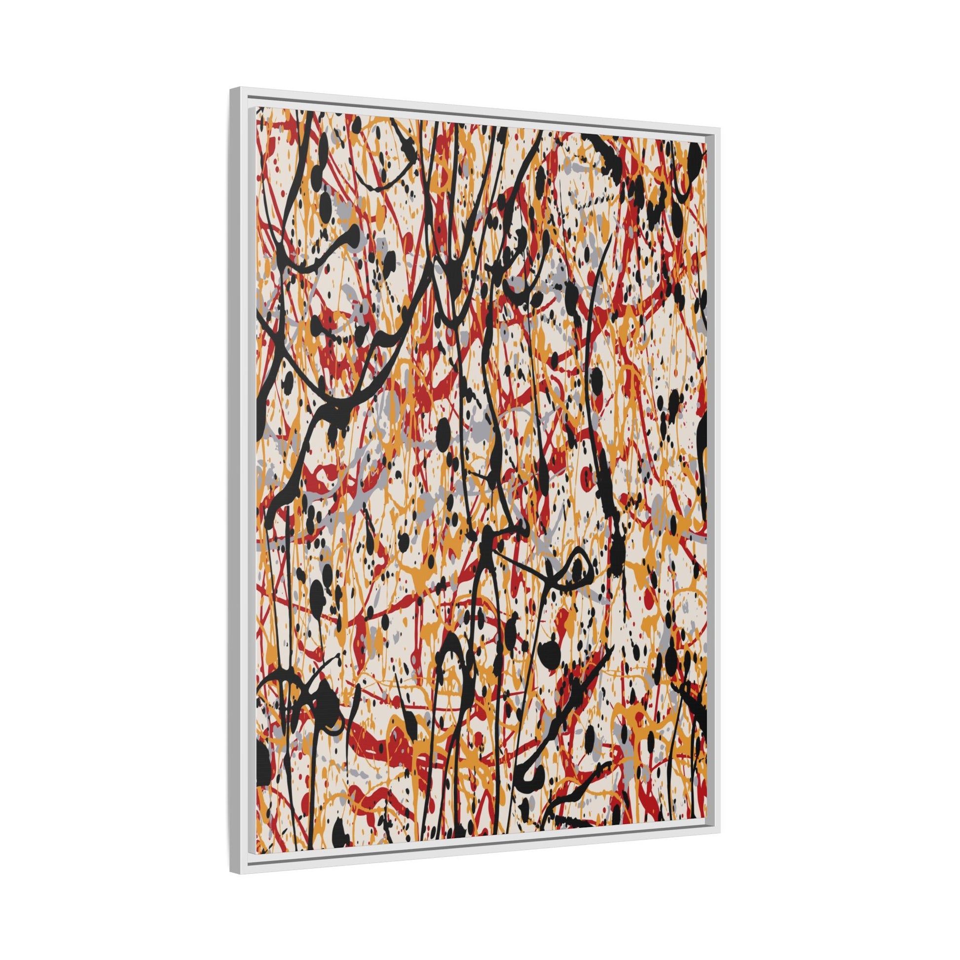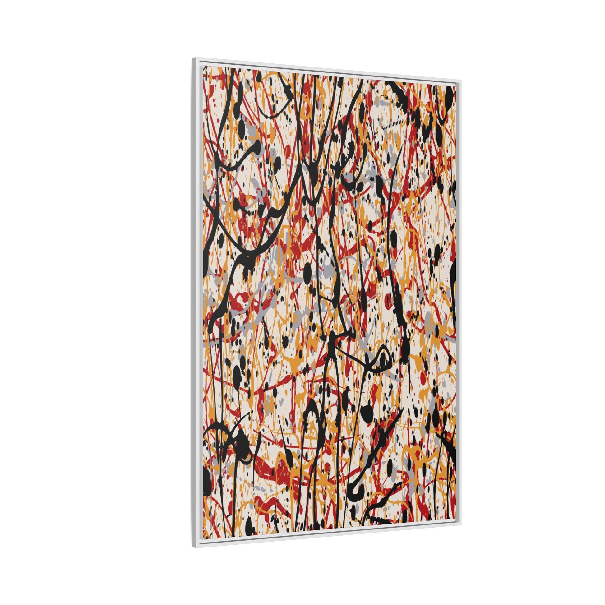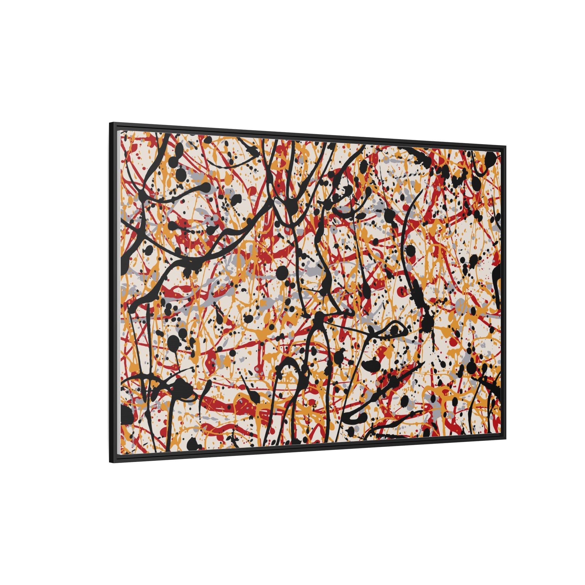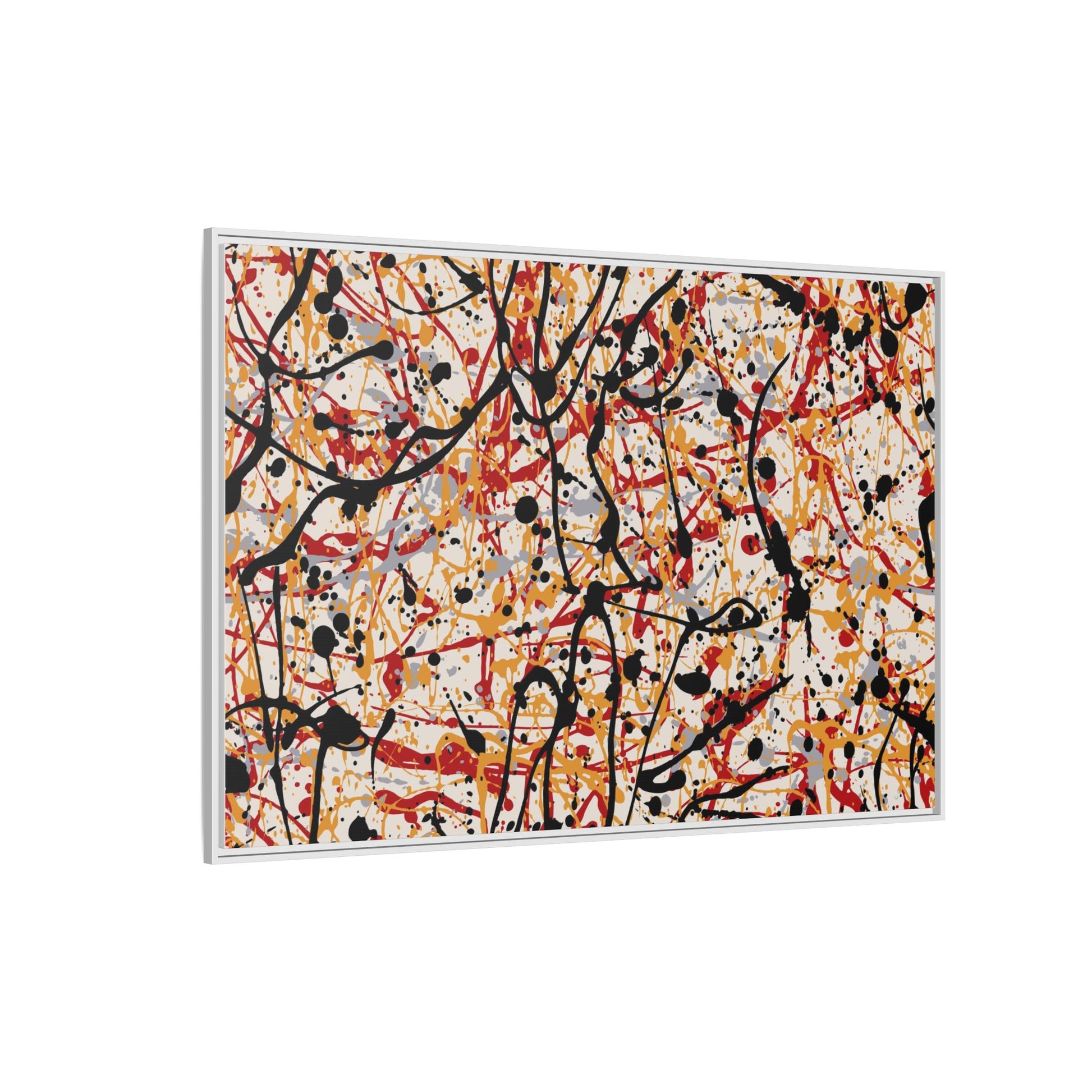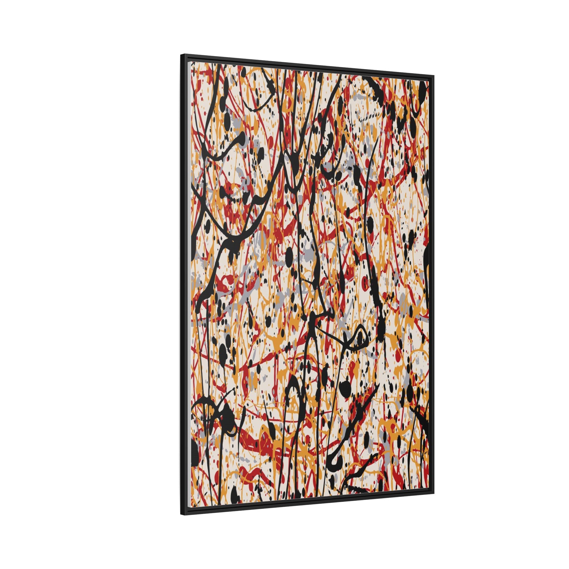 This dynamic abstract artwork showcases a vibrant Jackson Pollock-inspired drip painting technique, characterized by intricate layers of intertwining paint splatters and lines. The color palette consists of bold black, fiery red, warm yellow, and soft gray tones, creating a visually energetic and chaotic composition. Paint drips and splatters crisscross the canvas in multiple directions, forming a dense network of spontaneous and seemingly random marks that create a sense of movement and depth. The painting's style emphasizes action and emotional expression, with each color and line appearing to be applied with intense, gestural brushstrokes and techniques. The overall effect is a powerful, rhythmic abstract expressionist piece that invites viewers to explore its complex layers and find their own visual interpretations within the intricate pattern.