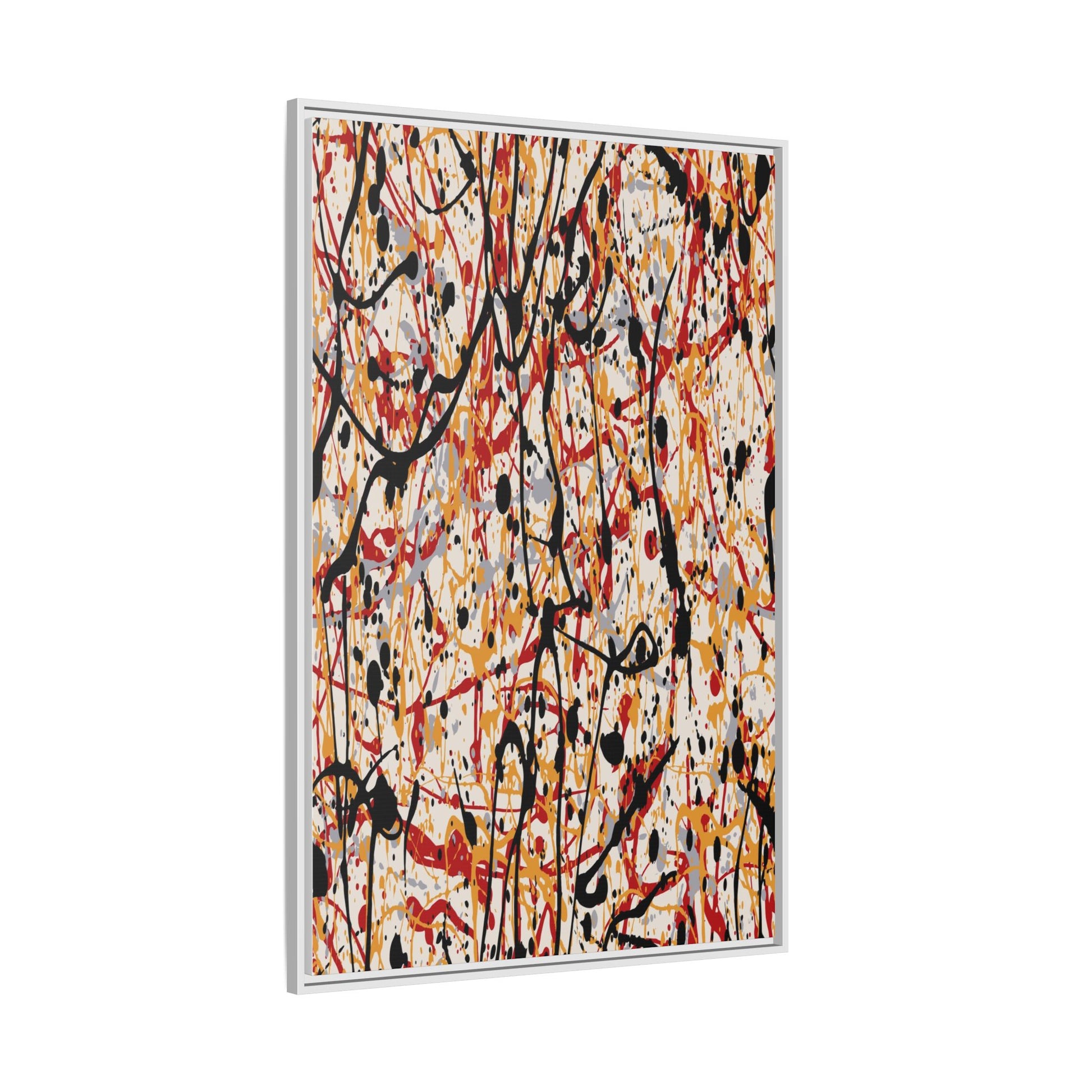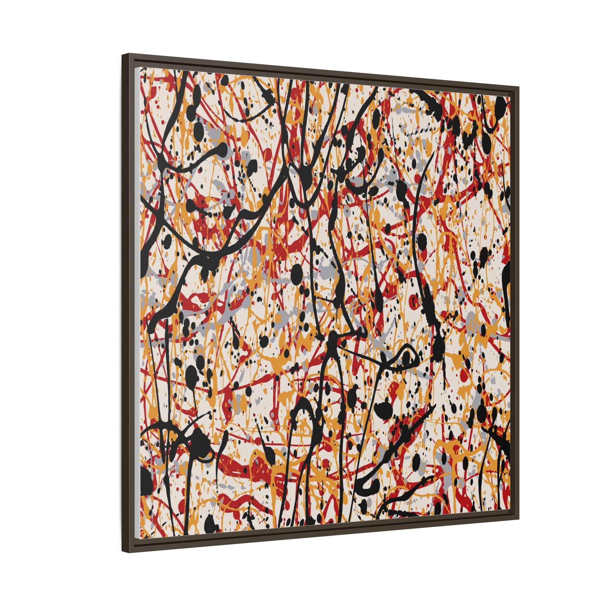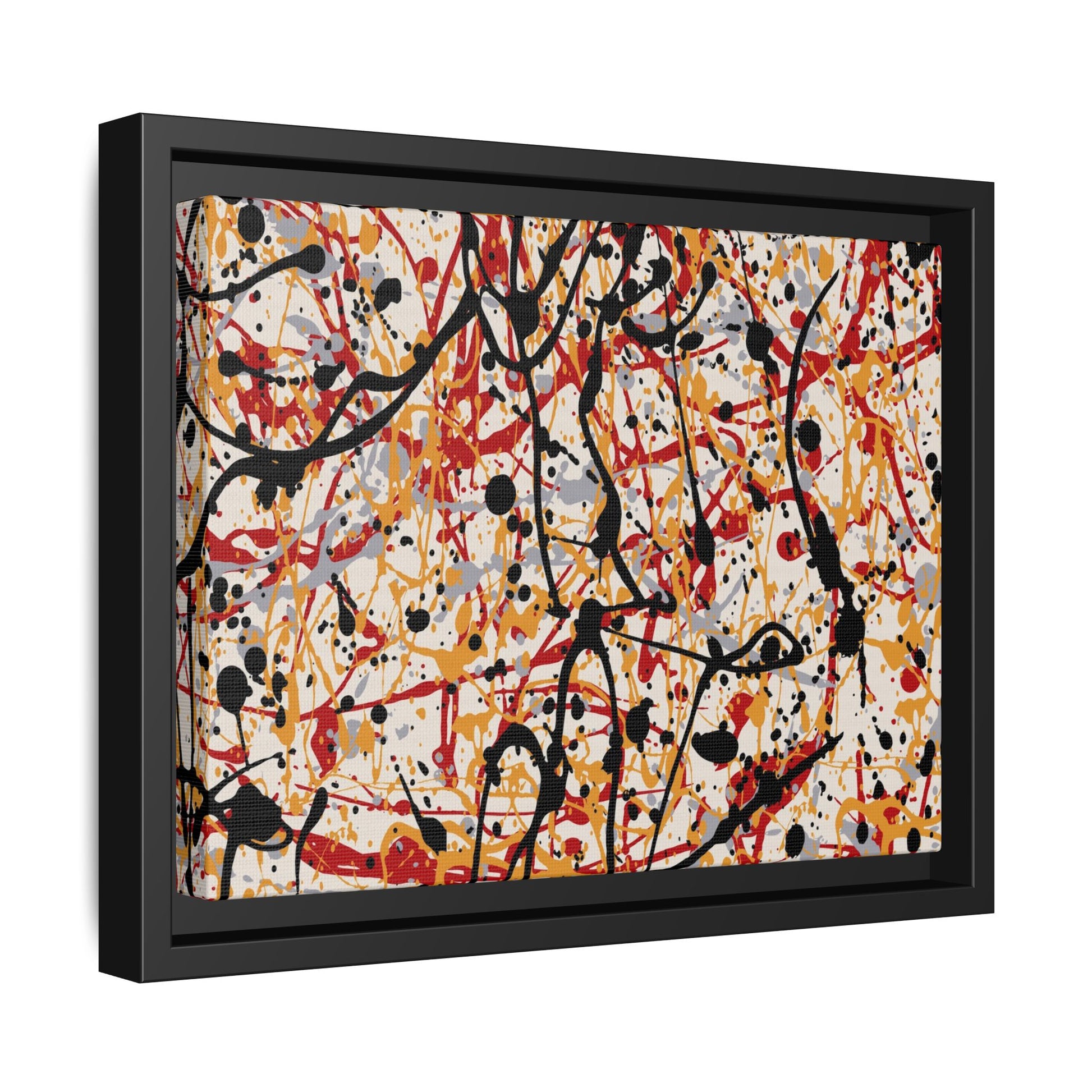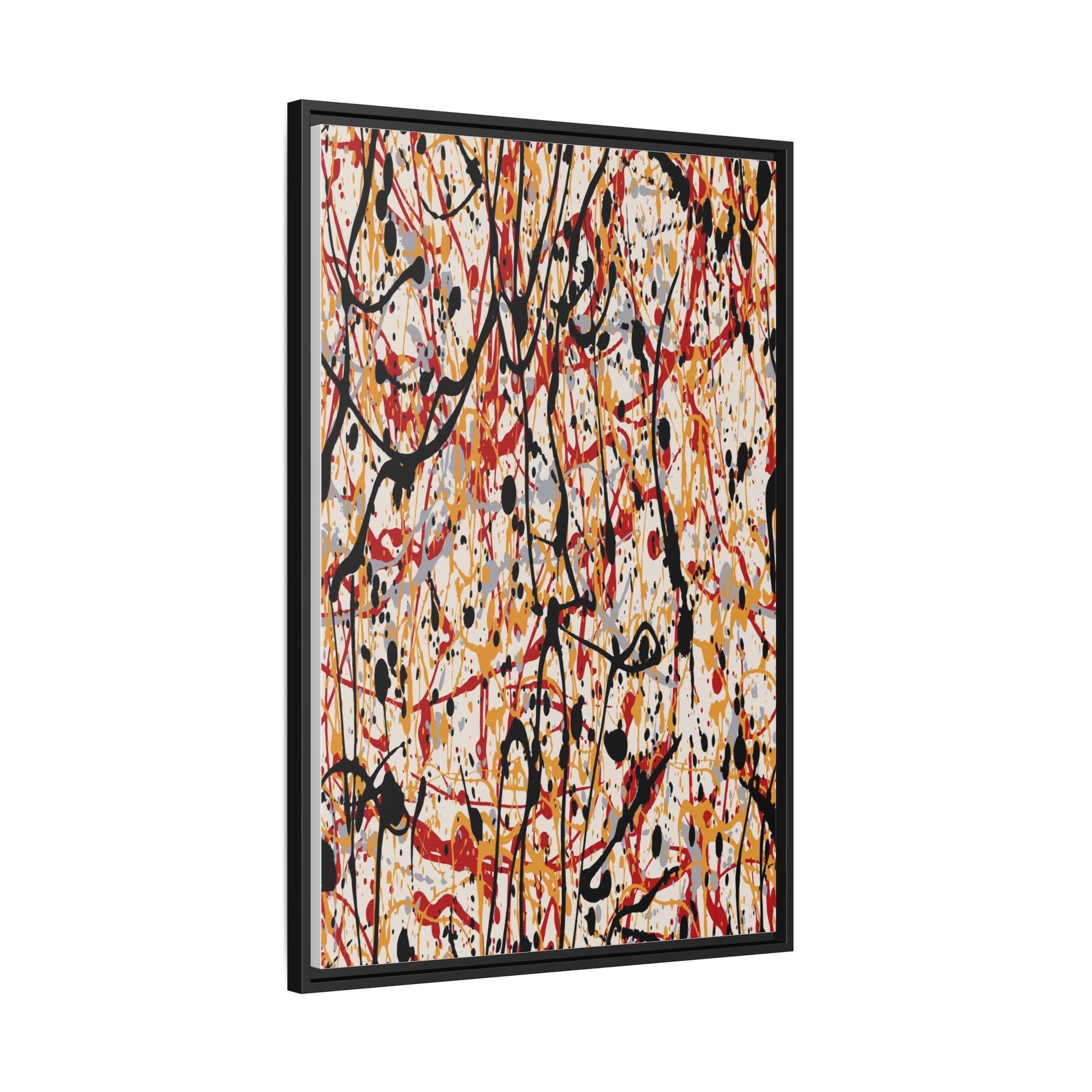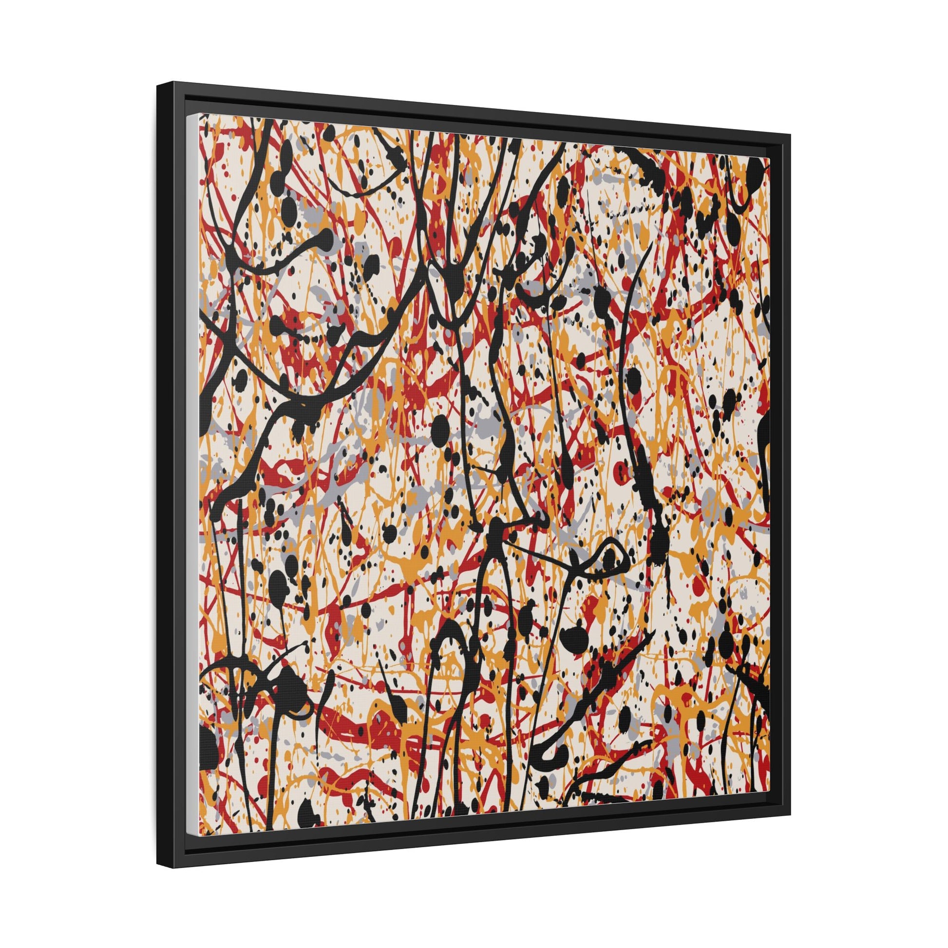 This dynamic abstract artwork showcases a vibrant Jackson Pollock-inspired drip painting technique, characterized by intricate layers of intertwining paint splatters and lines. The color palette consists of bold black, fiery red, warm yellow, and soft gray tones, creating a visually energetic and chaotic composition. Paint drips and splatters crisscross the canvas in multiple directions, forming a dense network of spontaneous and seemingly random marks that create a sense of movement and depth. The painting's style emphasizes action and emotional expression, with each color and line appearing to be applied with intense, gestural brushstrokes and techniques. The overall effect is a powerful, rhythmic abstract expressionist piece that invites viewers to explore its complex layers and find their own visual interpretations within the intricate pattern.