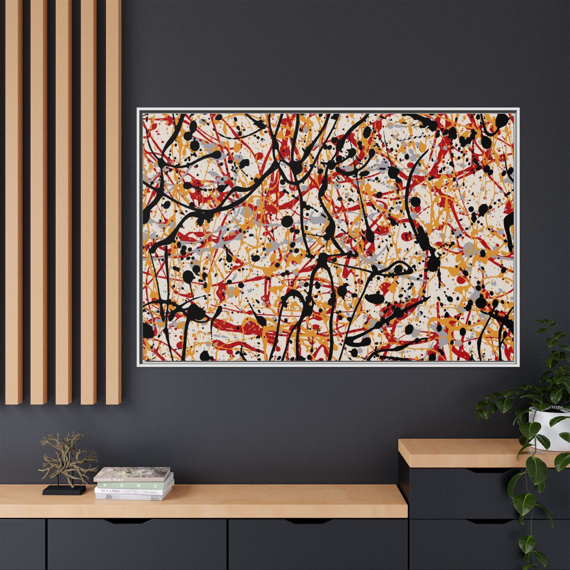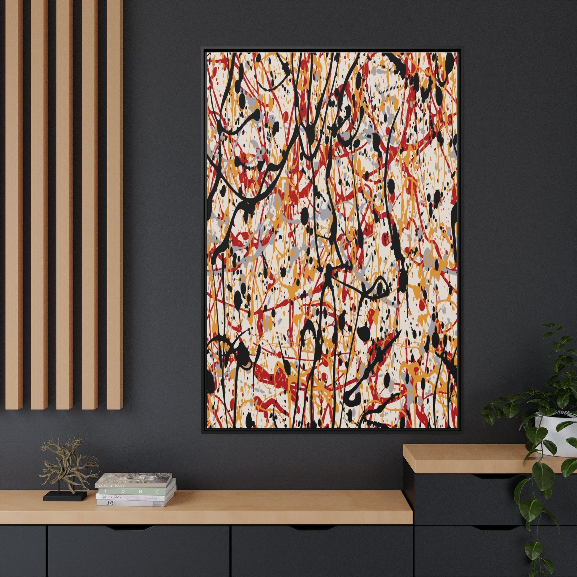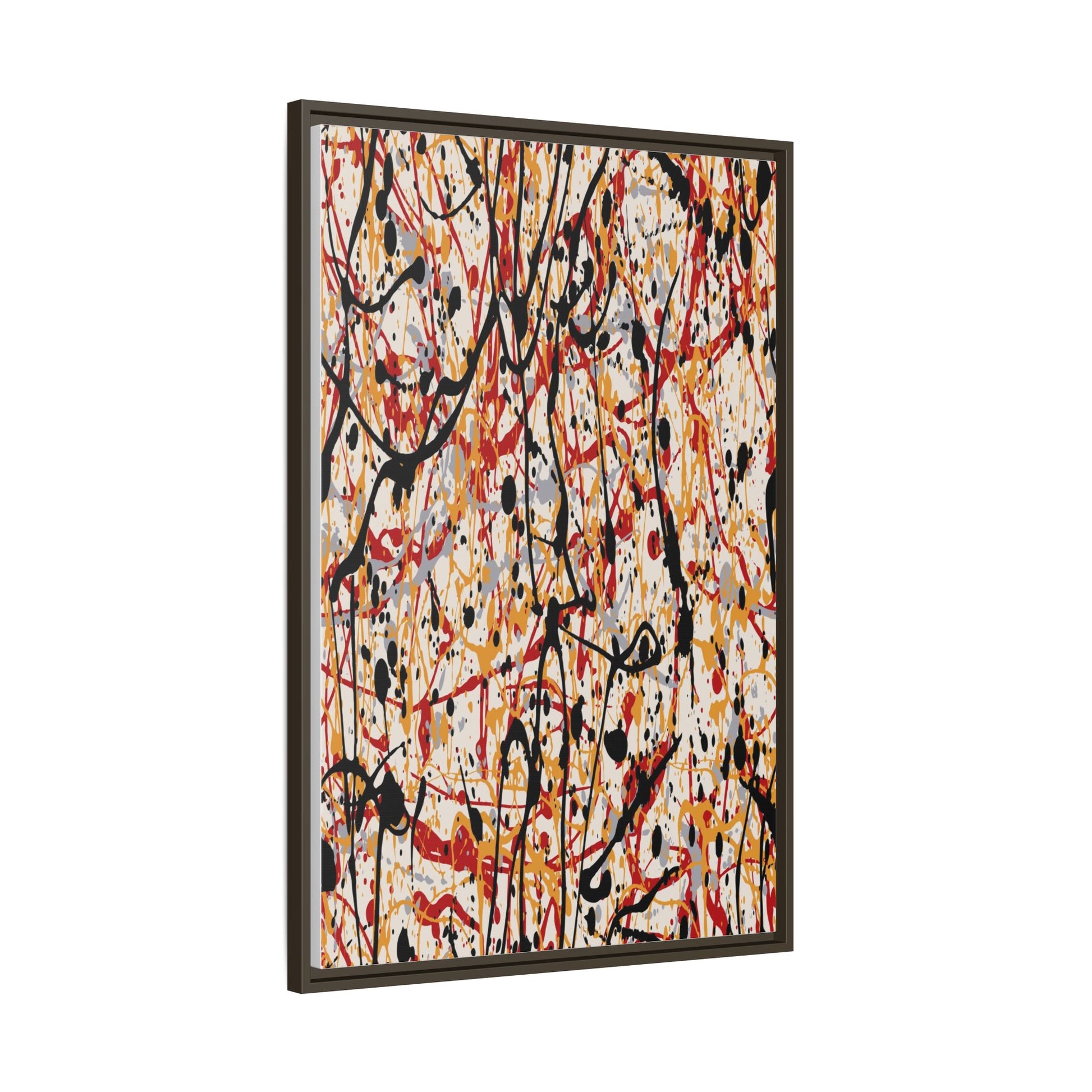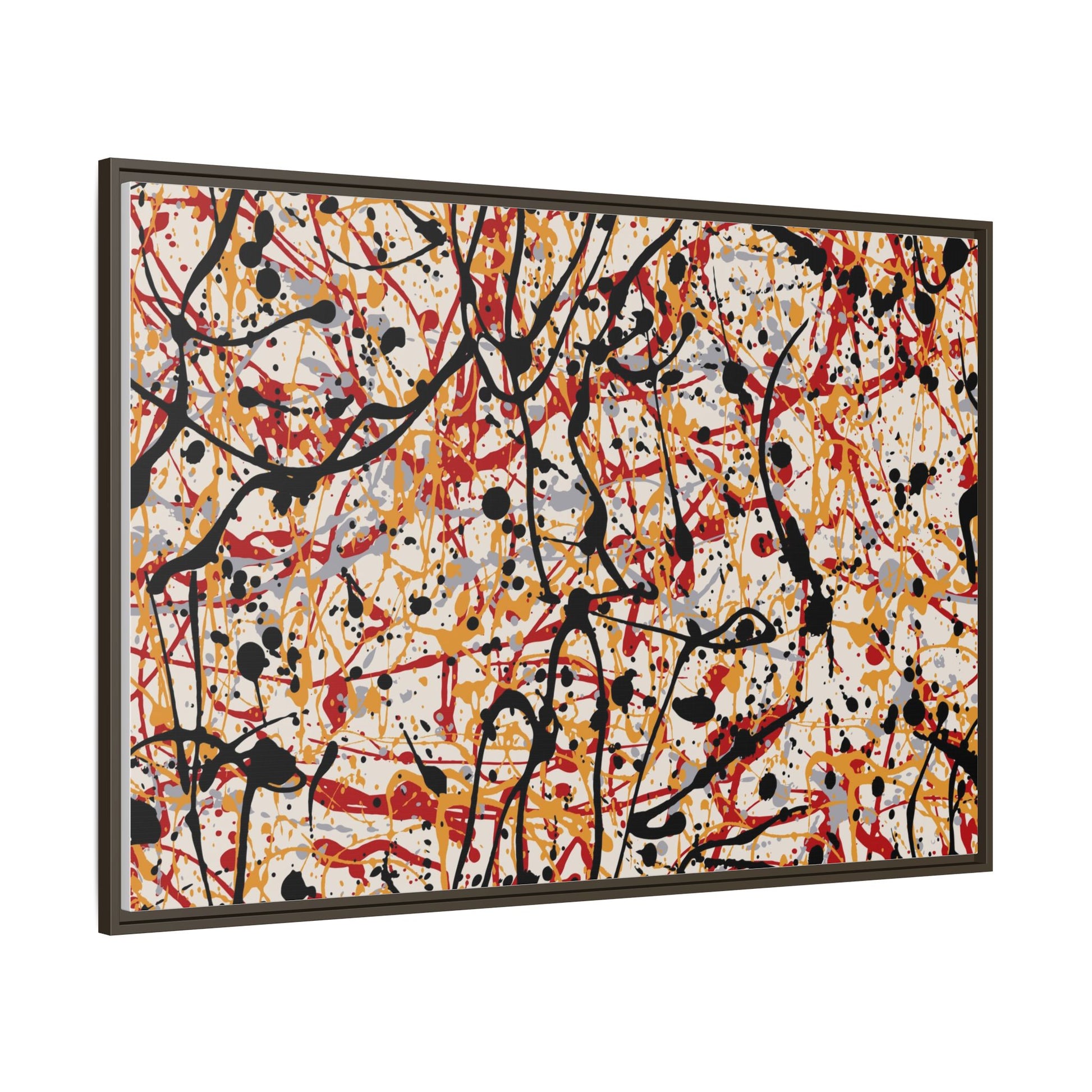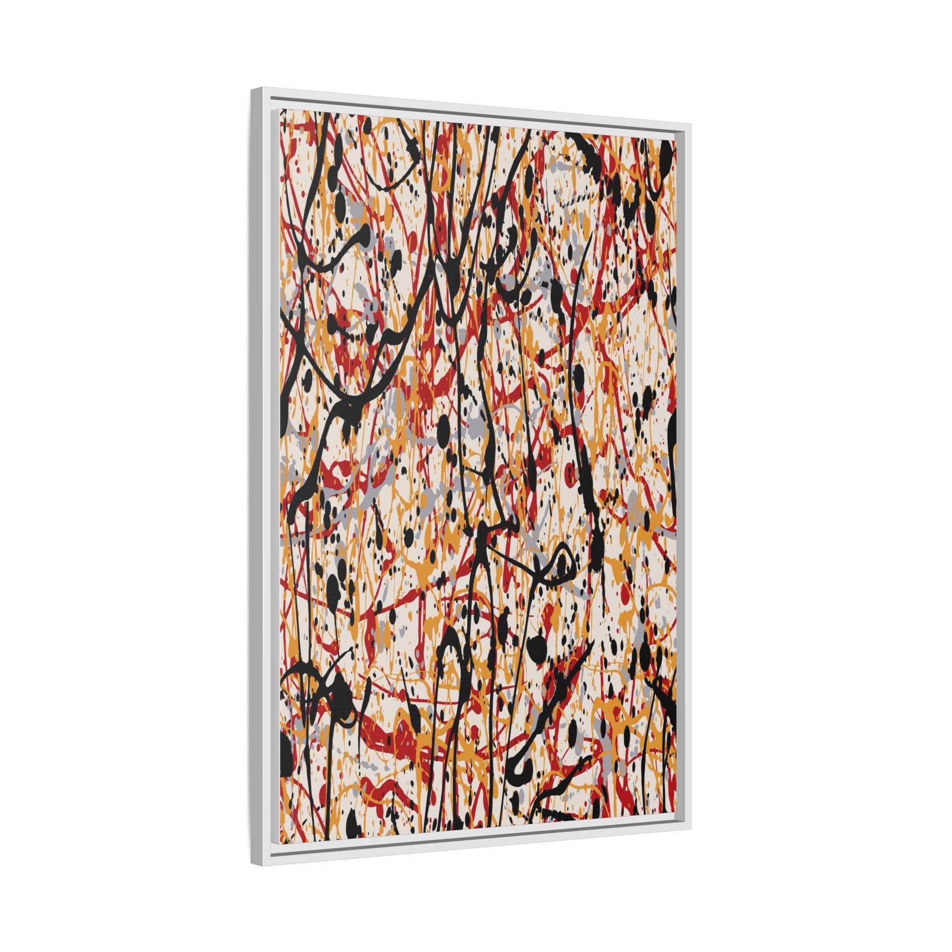 This dynamic abstract artwork showcases a vibrant Jackson Pollock-inspired drip painting technique, characterized by intricate layers of intertwining paint splatters and lines. The color palette consists of bold black, fiery red, warm yellow, and soft gray tones, creating a visually energetic and chaotic composition. Paint drips and splatters crisscross the canvas in multiple directions, forming a dense network of spontaneous and seemingly random marks that create a sense of movement and depth. The painting's style emphasizes action and emotional expression, with each color and line appearing to be applied with intense, gestural brushstrokes and techniques. The overall effect is a powerful, rhythmic abstract expressionist piece that invites viewers to explore its complex layers and find their own visual interpretations within the intricate pattern.
