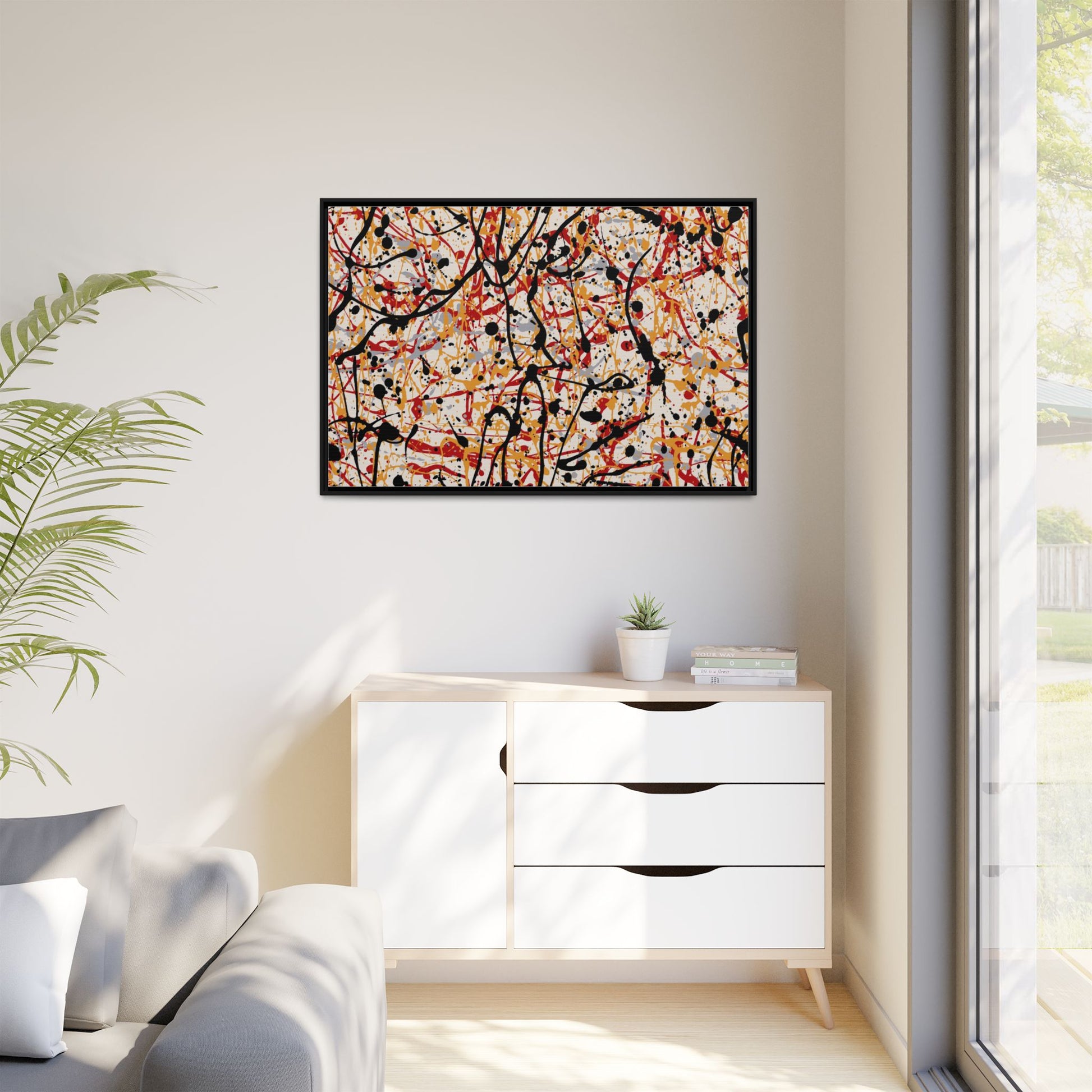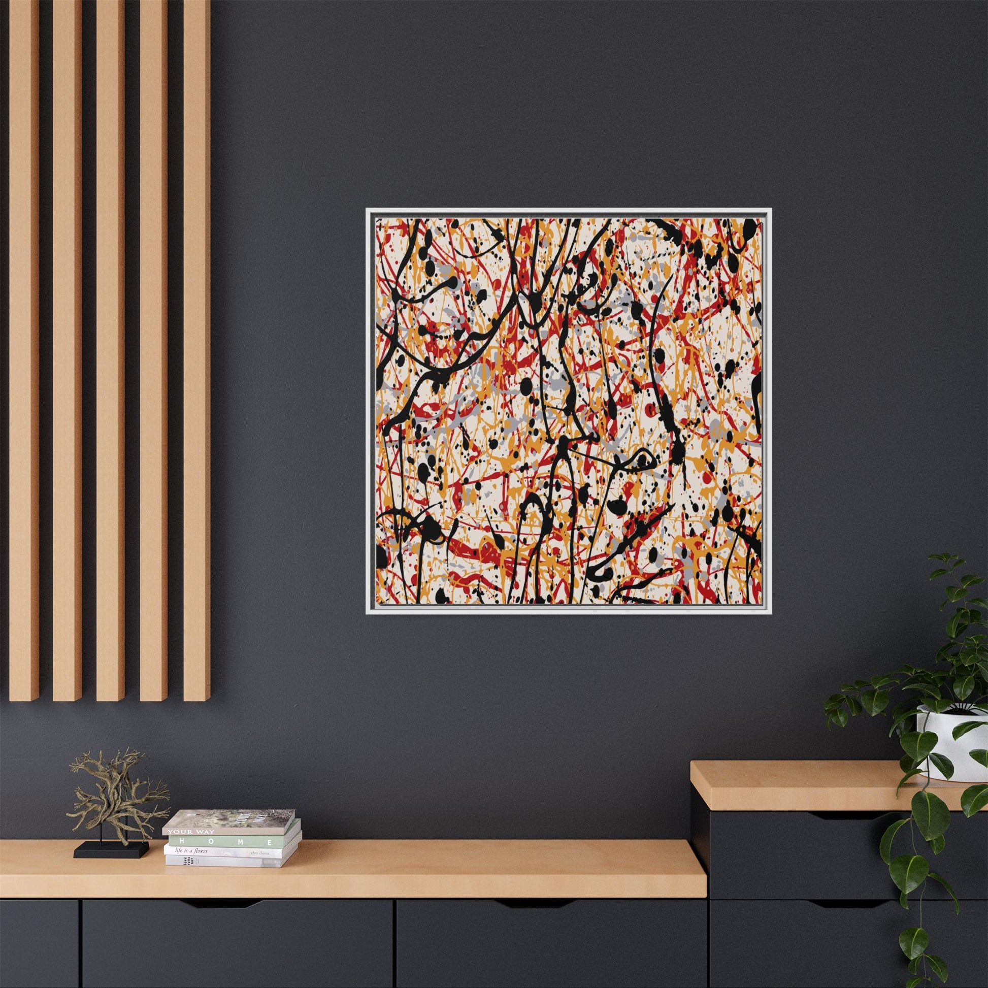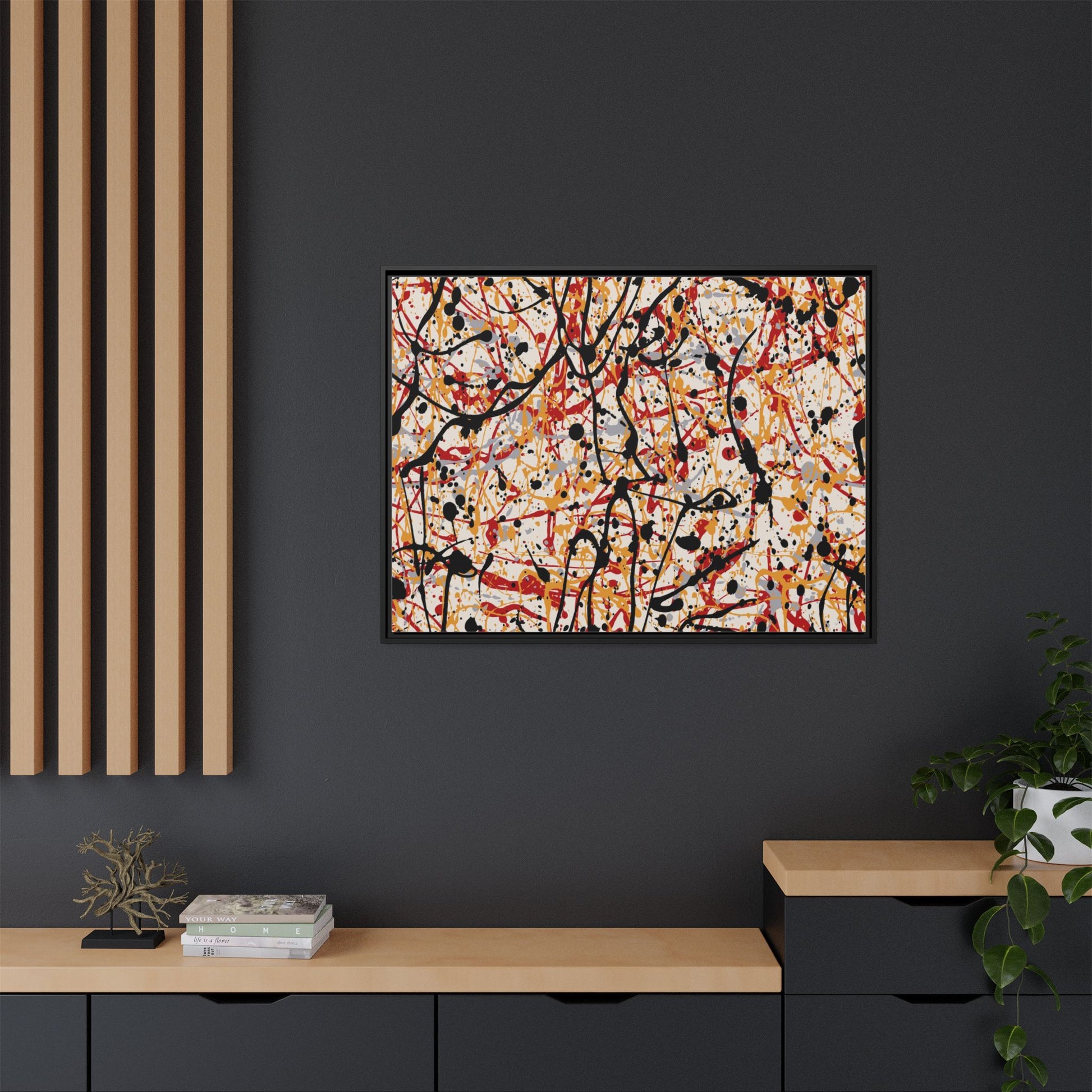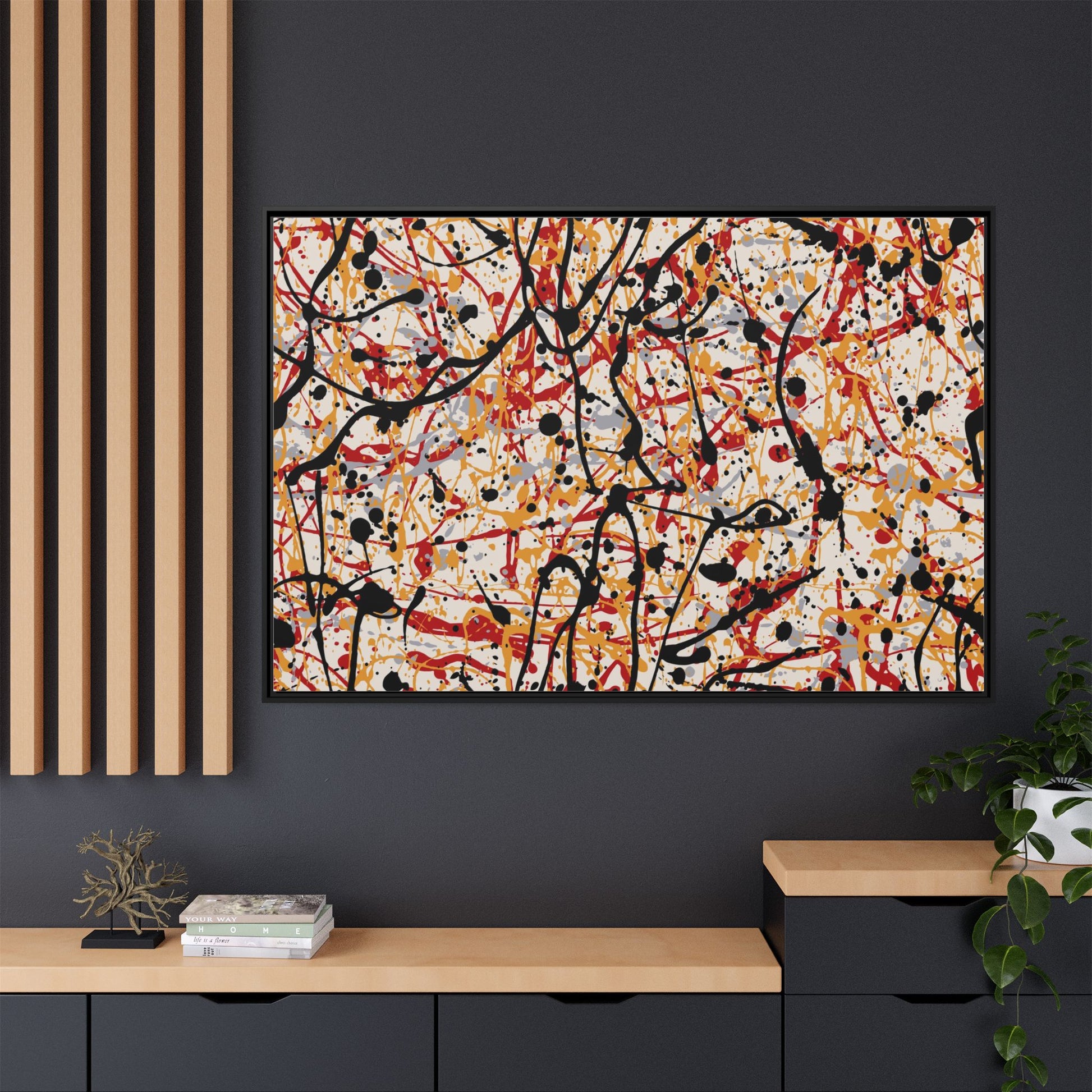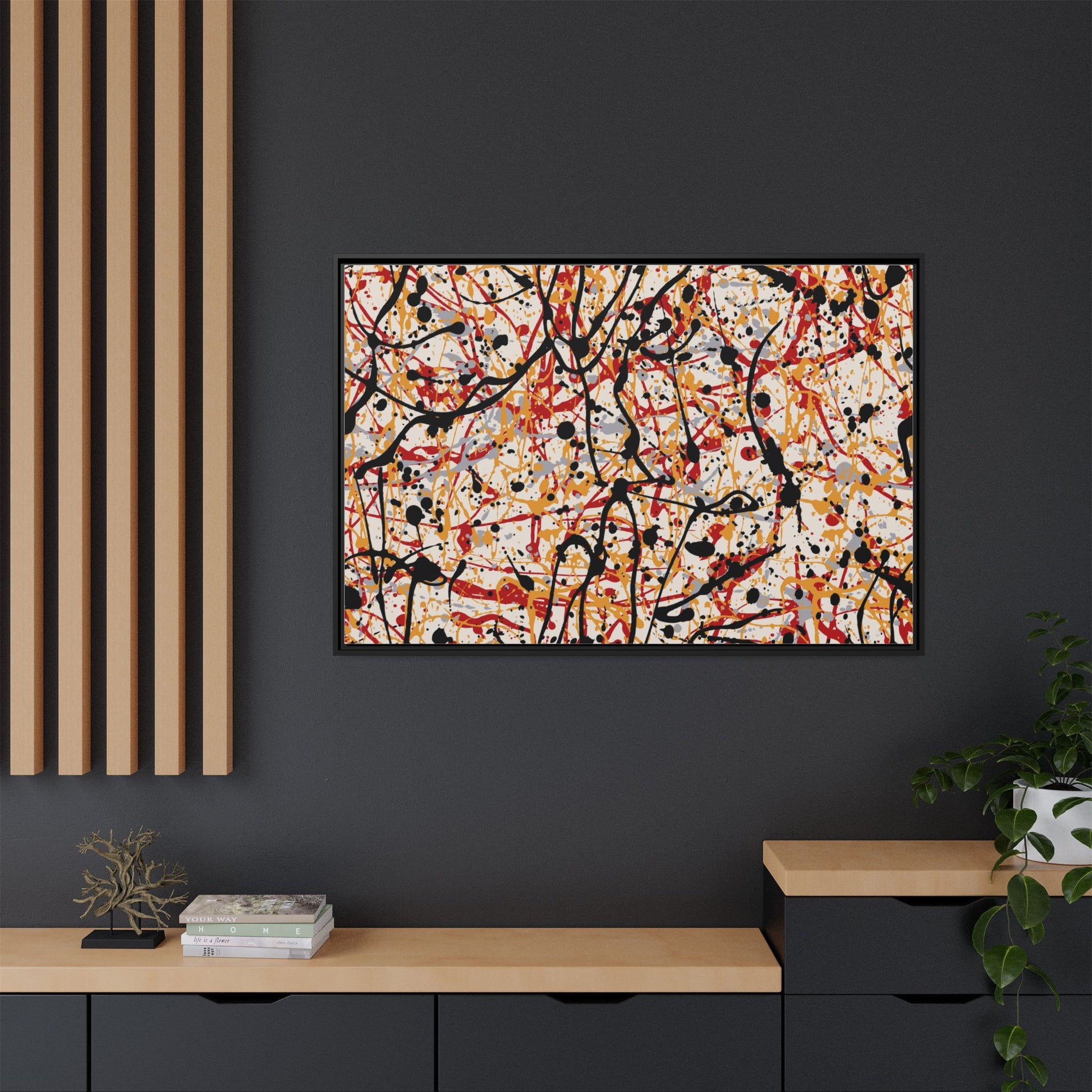 This dynamic abstract artwork showcases a vibrant Jackson Pollock-inspired drip painting technique, characterized by intricate layers of intertwining paint splatters and lines. The color palette consists of bold black, fiery red, warm yellow, and soft gray tones, creating a visually energetic and chaotic composition. Paint drips and splatters crisscross the canvas in multiple directions, forming a dense network of spontaneous and seemingly random marks that create a sense of movement and depth. The painting's style emphasizes action and emotional expression, with each color and line appearing to be applied with intense, gestural brushstrokes and techniques. The overall effect is a powerful, rhythmic abstract expressionist piece that invites viewers to explore its complex layers and find their own visual interpretations within the intricate pattern.