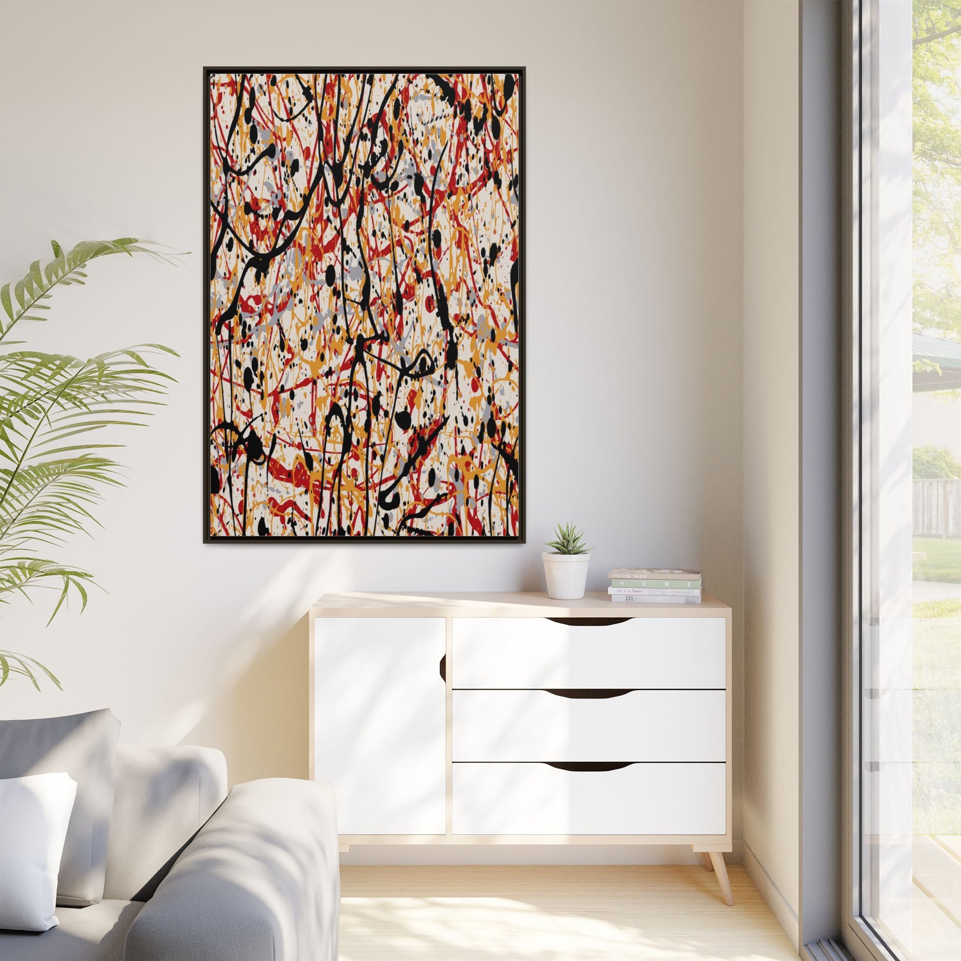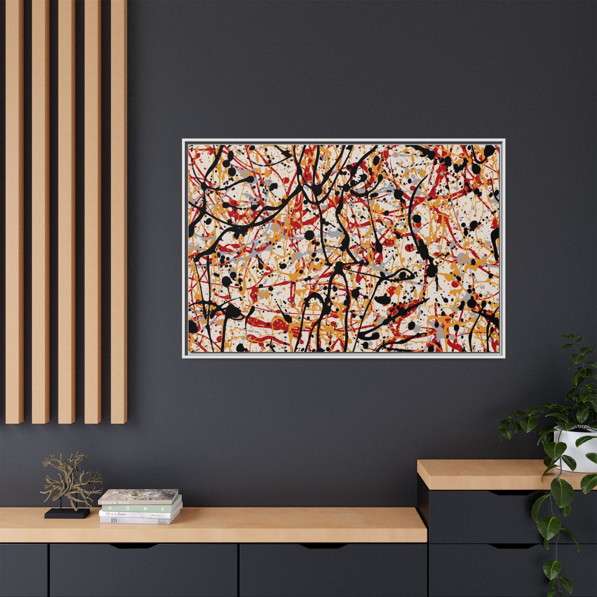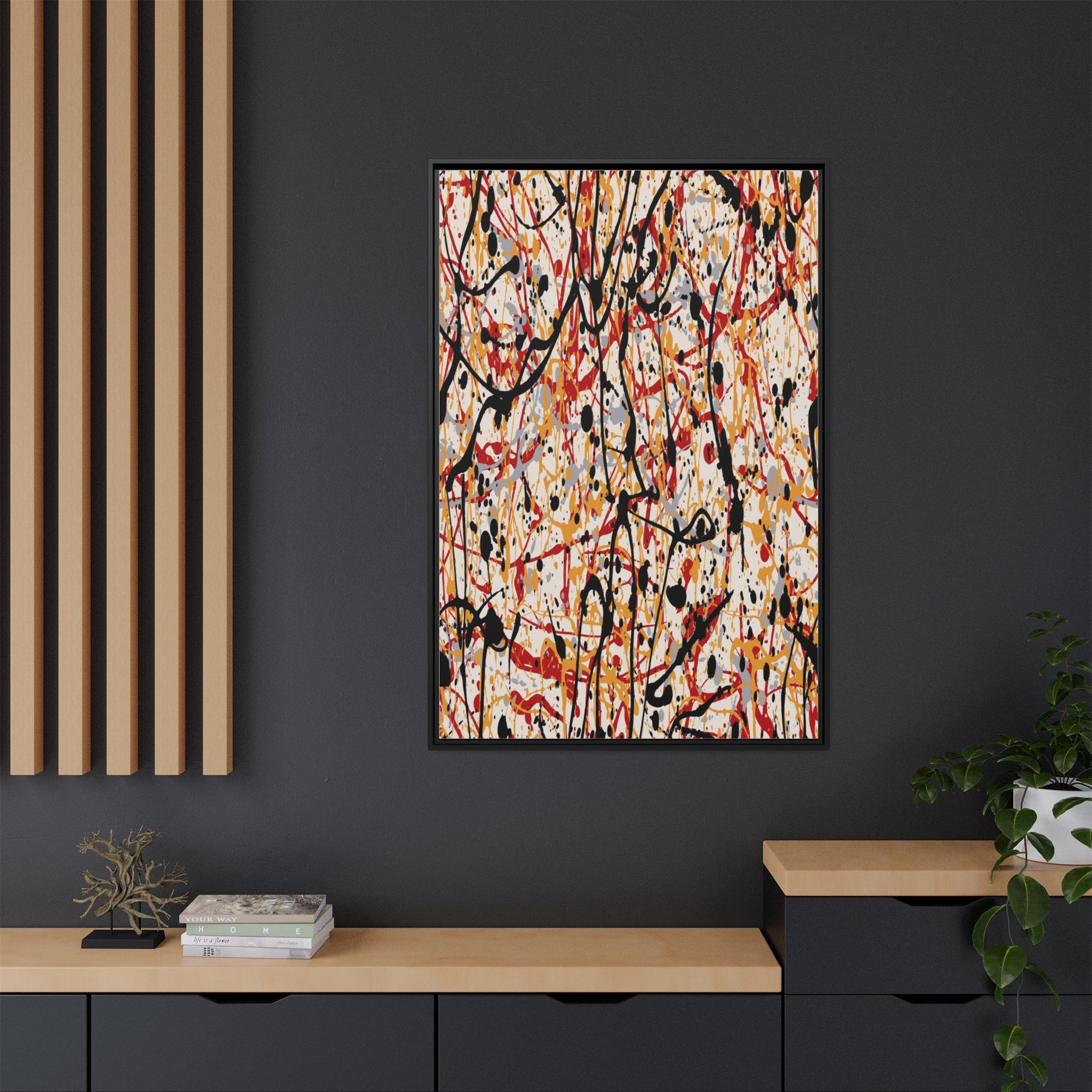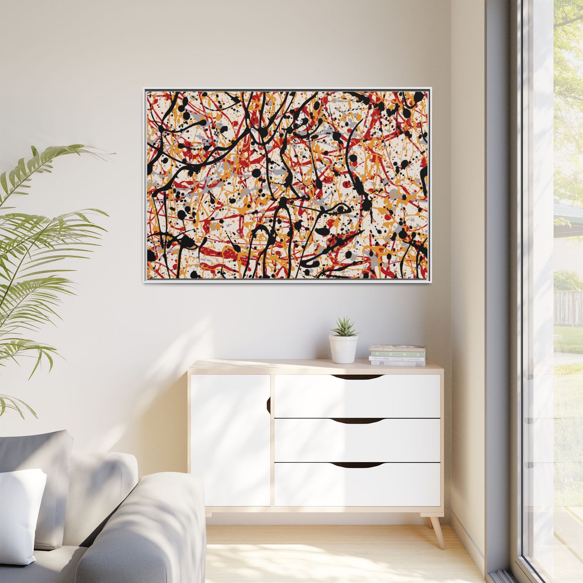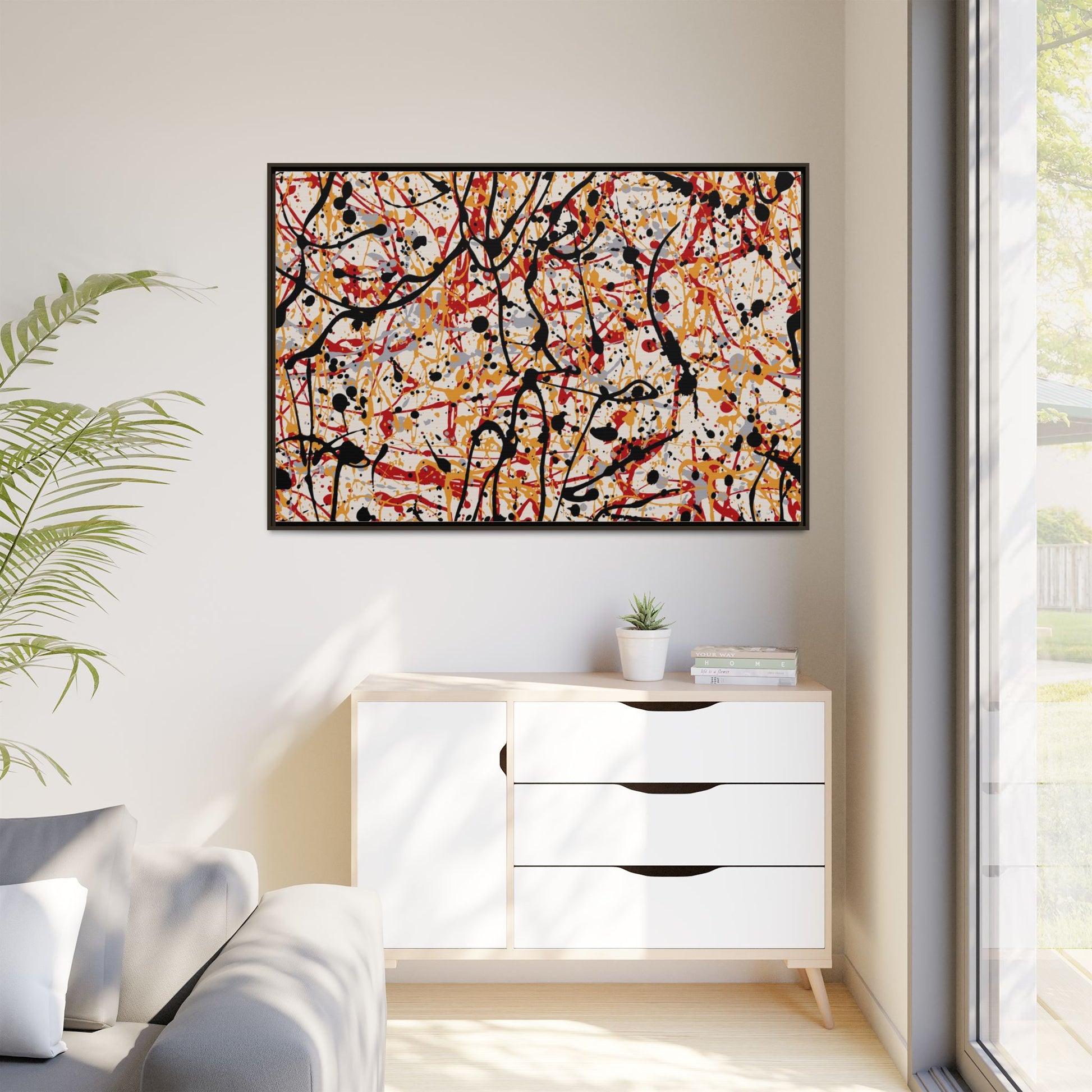 This dynamic abstract artwork showcases a vibrant Jackson Pollock-inspired drip painting technique, characterized by intricate layers of intertwining paint splatters and lines. The color palette consists of bold black, fiery red, warm yellow, and soft gray tones, creating a visually energetic and chaotic composition. Paint drips and splatters crisscross the canvas in multiple directions, forming a dense network of spontaneous and seemingly random marks that create a sense of movement and depth. The painting's style emphasizes action and emotional expression, with each color and line appearing to be applied with intense, gestural brushstrokes and techniques. The overall effect is a powerful, rhythmic abstract expressionist piece that invites viewers to explore its complex layers and find their own visual interpretations within the intricate pattern.