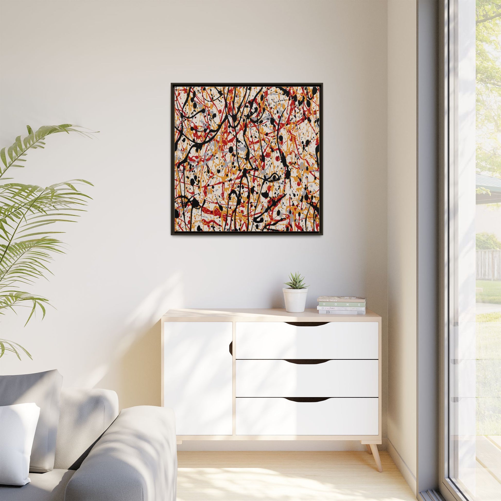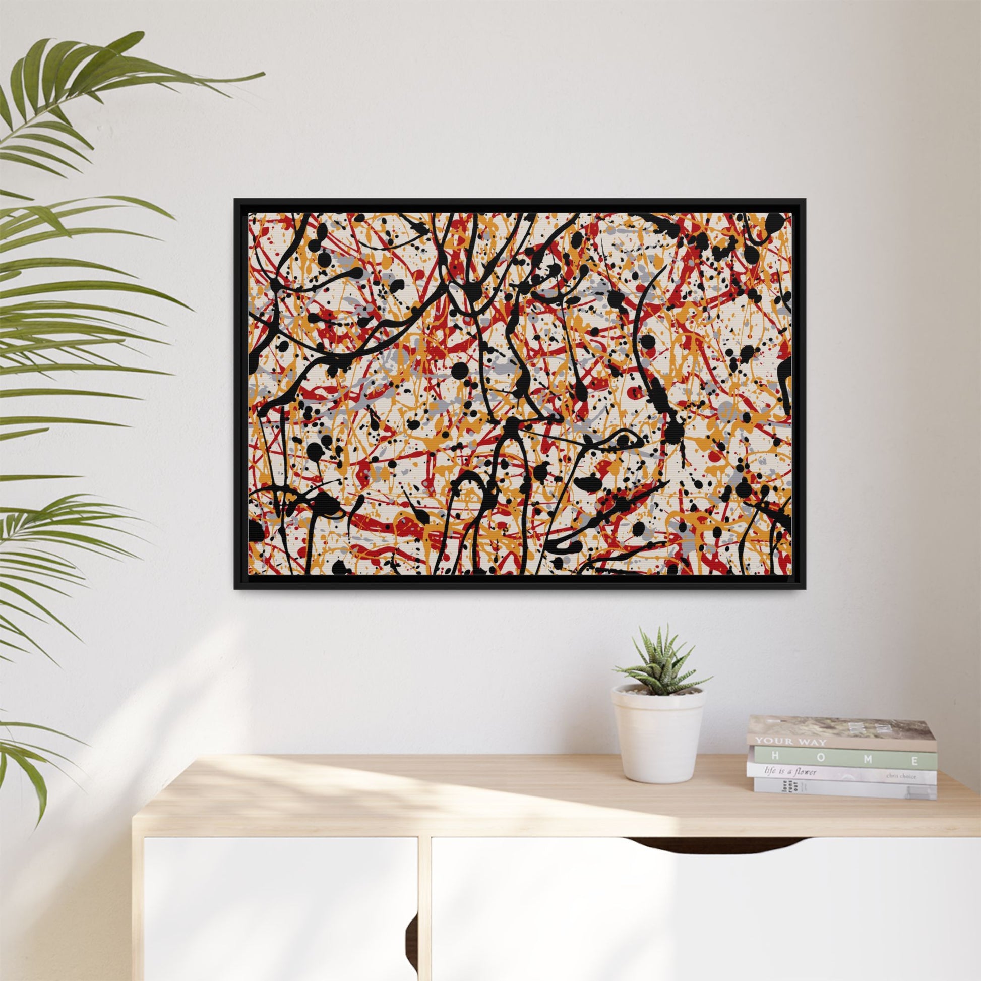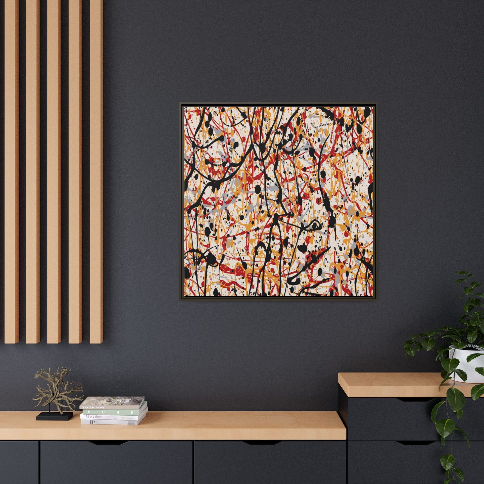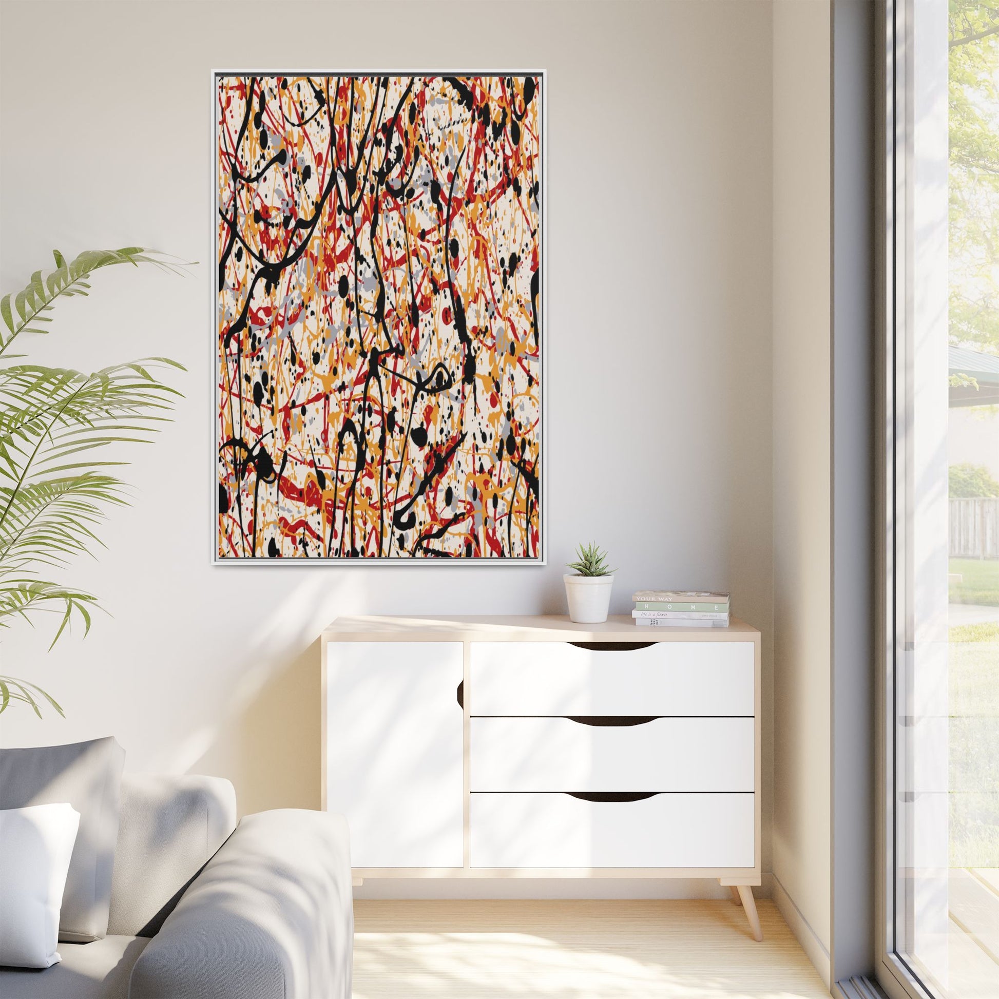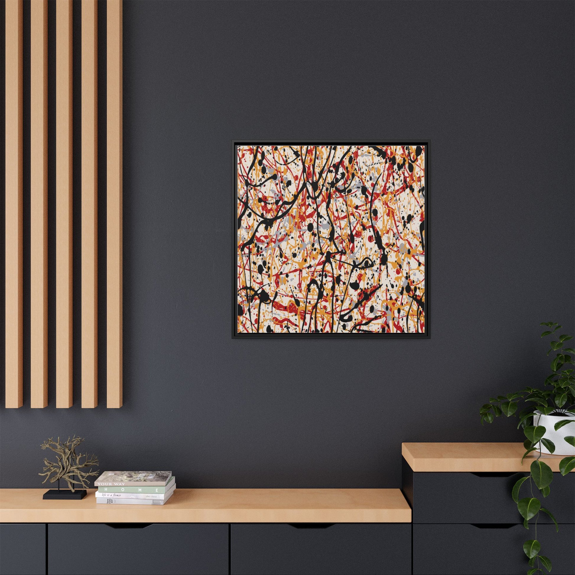 This dynamic abstract artwork showcases a vibrant Jackson Pollock-inspired drip painting technique, characterized by intricate layers of intertwining paint splatters and lines. The color palette consists of bold black, fiery red, warm yellow, and soft gray tones, creating a visually energetic and chaotic composition. Paint drips and splatters crisscross the canvas in multiple directions, forming a dense network of spontaneous and seemingly random marks that create a sense of movement and depth. The painting's style emphasizes action and emotional expression, with each color and line appearing to be applied with intense, gestural brushstrokes and techniques. The overall effect is a powerful, rhythmic abstract expressionist piece that invites viewers to explore its complex layers and find their own visual interpretations within the intricate pattern.