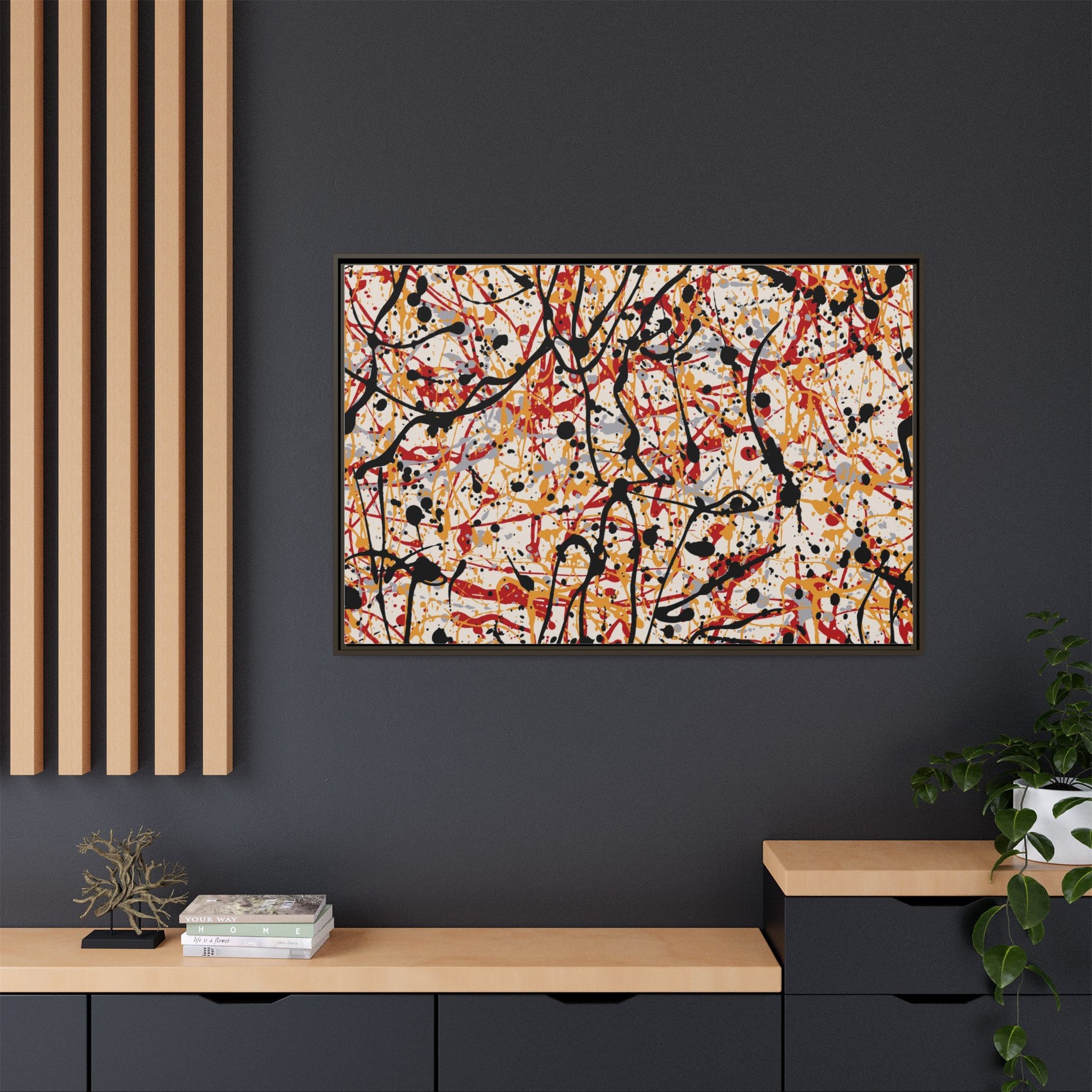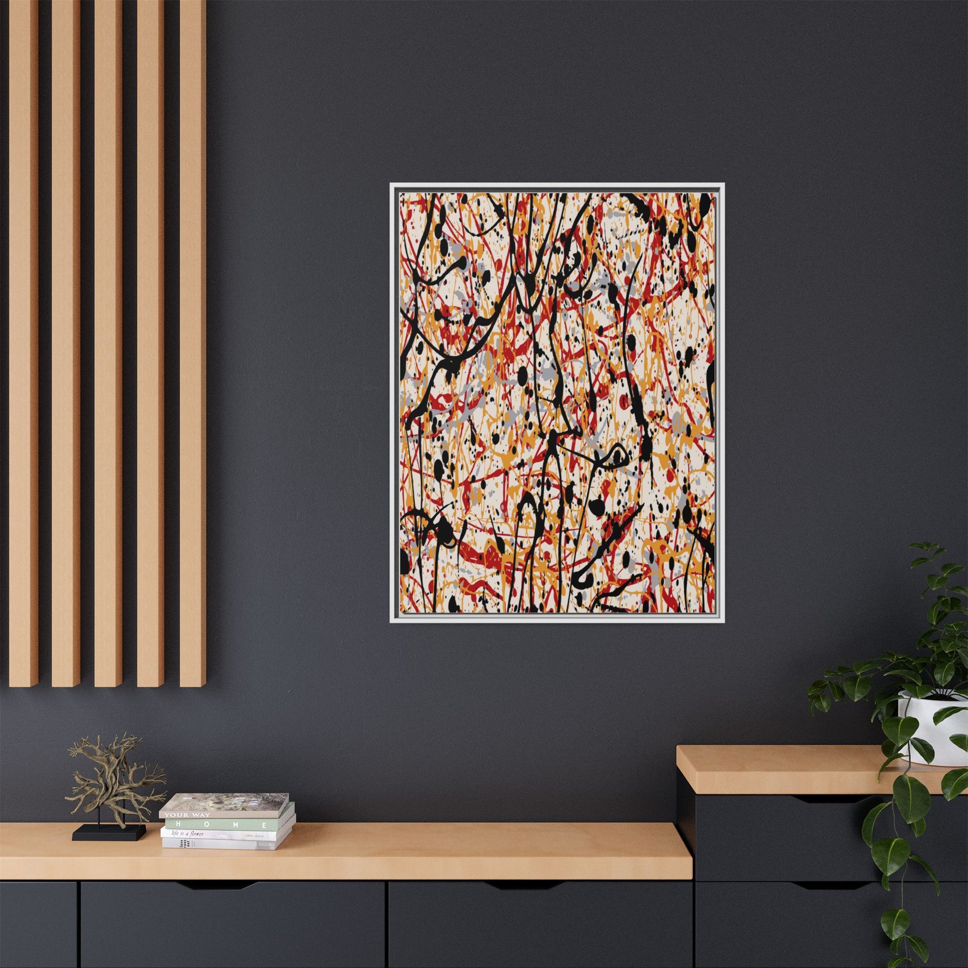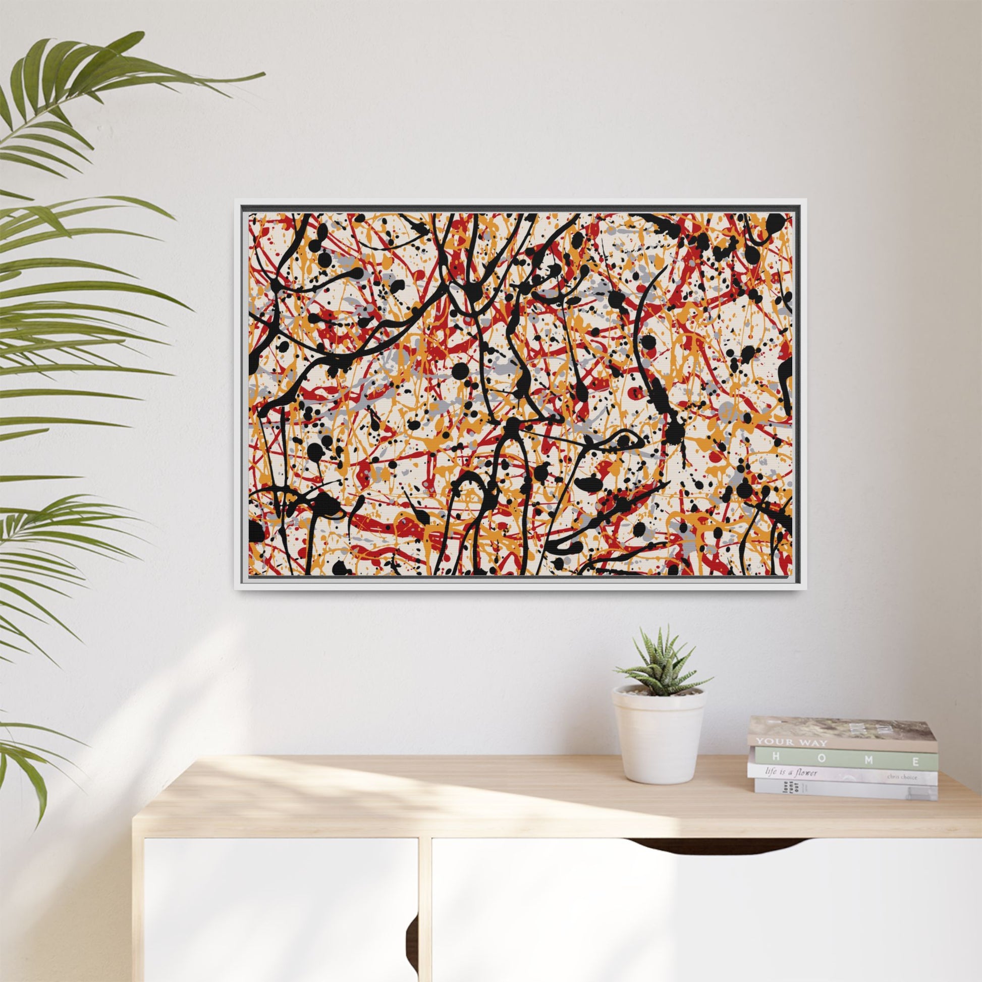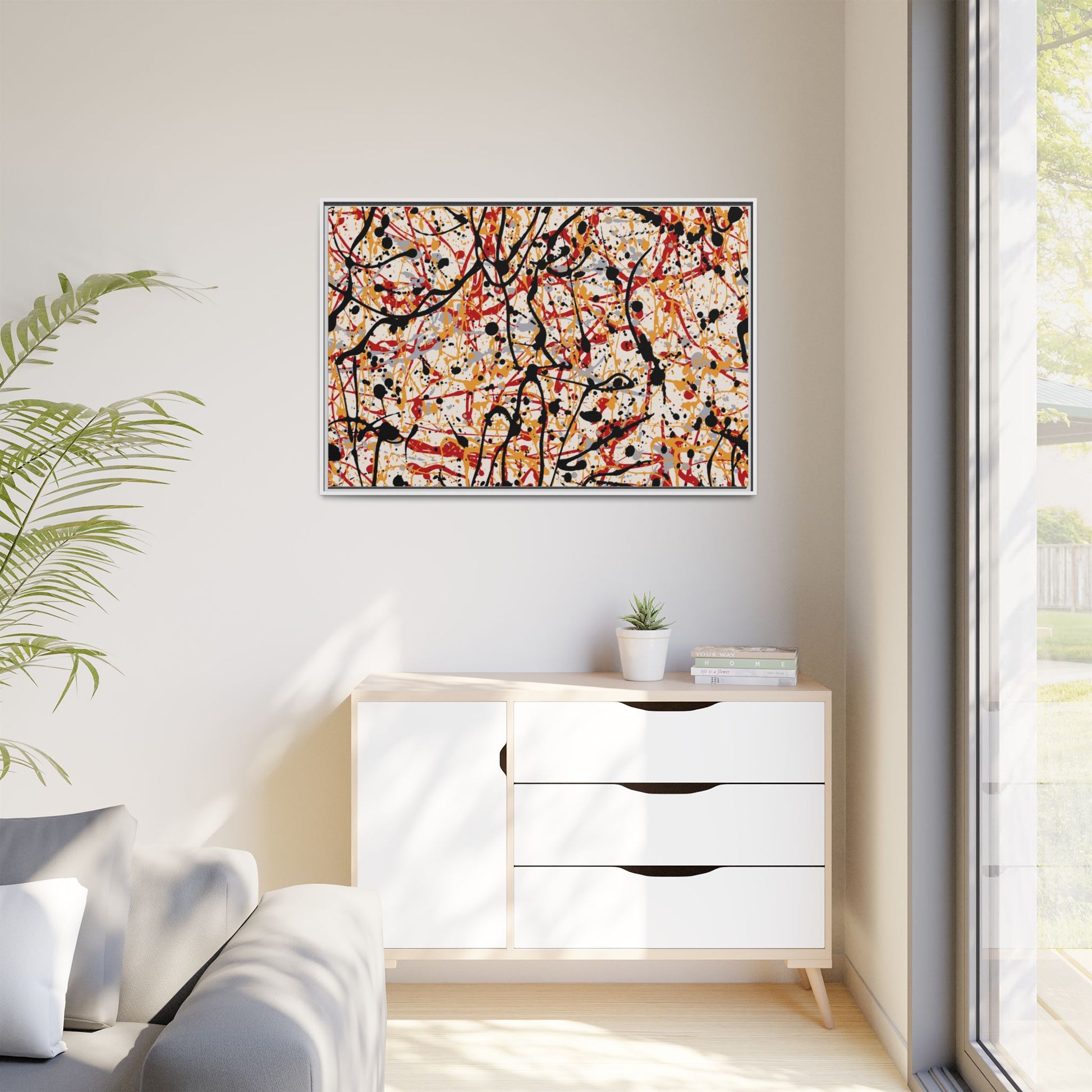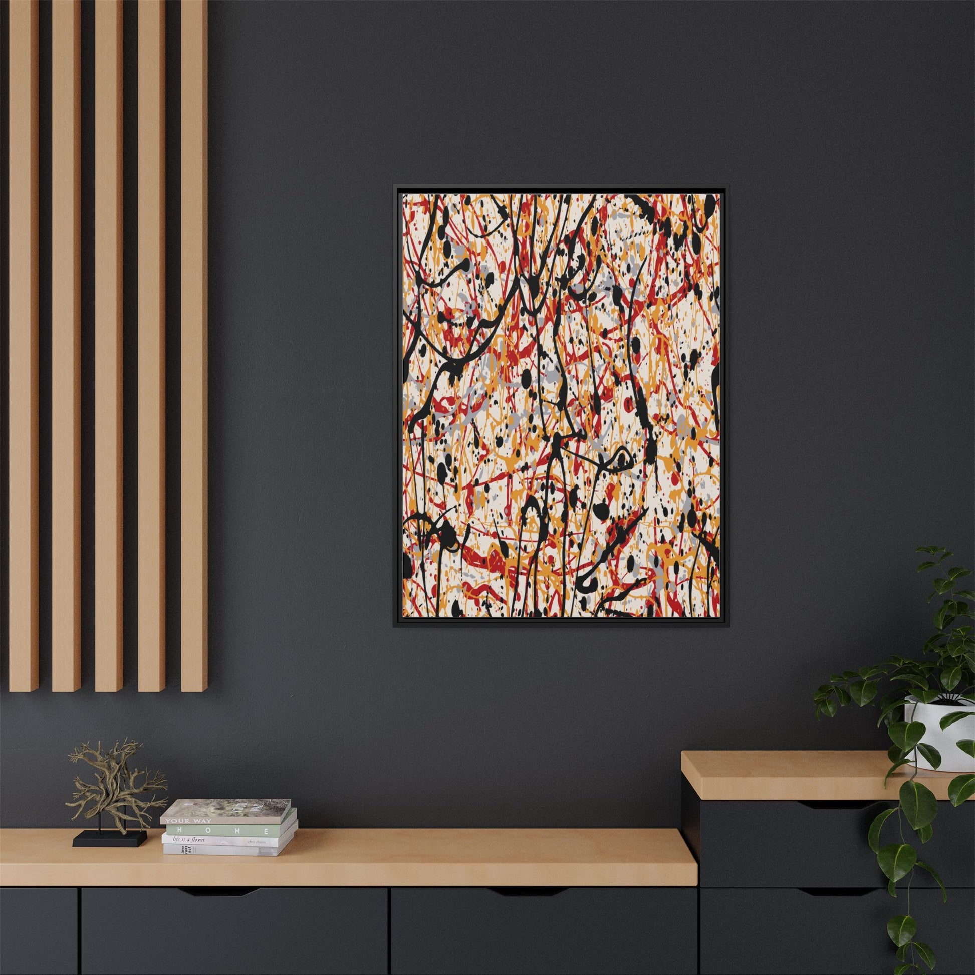 This dynamic abstract artwork showcases a vibrant Jackson Pollock-inspired drip painting technique, characterized by intricate layers of intertwining paint splatters and lines. The color palette consists of bold black, fiery red, warm yellow, and soft gray tones, creating a visually energetic and chaotic composition. Paint drips and splatters crisscross the canvas in multiple directions, forming a dense network of spontaneous and seemingly random marks that create a sense of movement and depth. The painting's style emphasizes action and emotional expression, with each color and line appearing to be applied with intense, gestural brushstrokes and techniques. The overall effect is a powerful, rhythmic abstract expressionist piece that invites viewers to explore its complex layers and find their own visual interpretations within the intricate pattern.