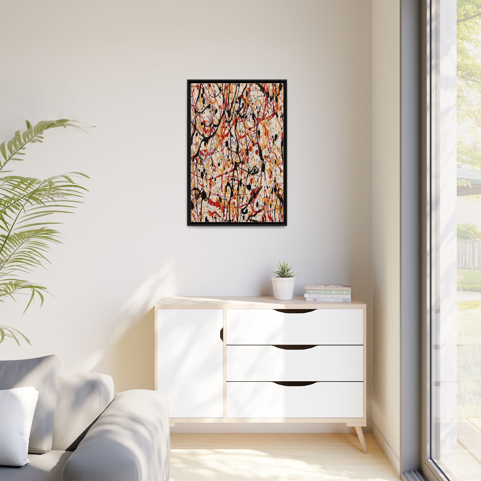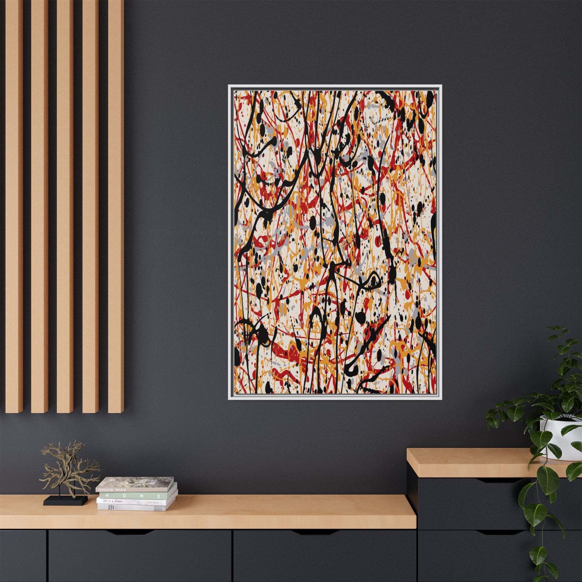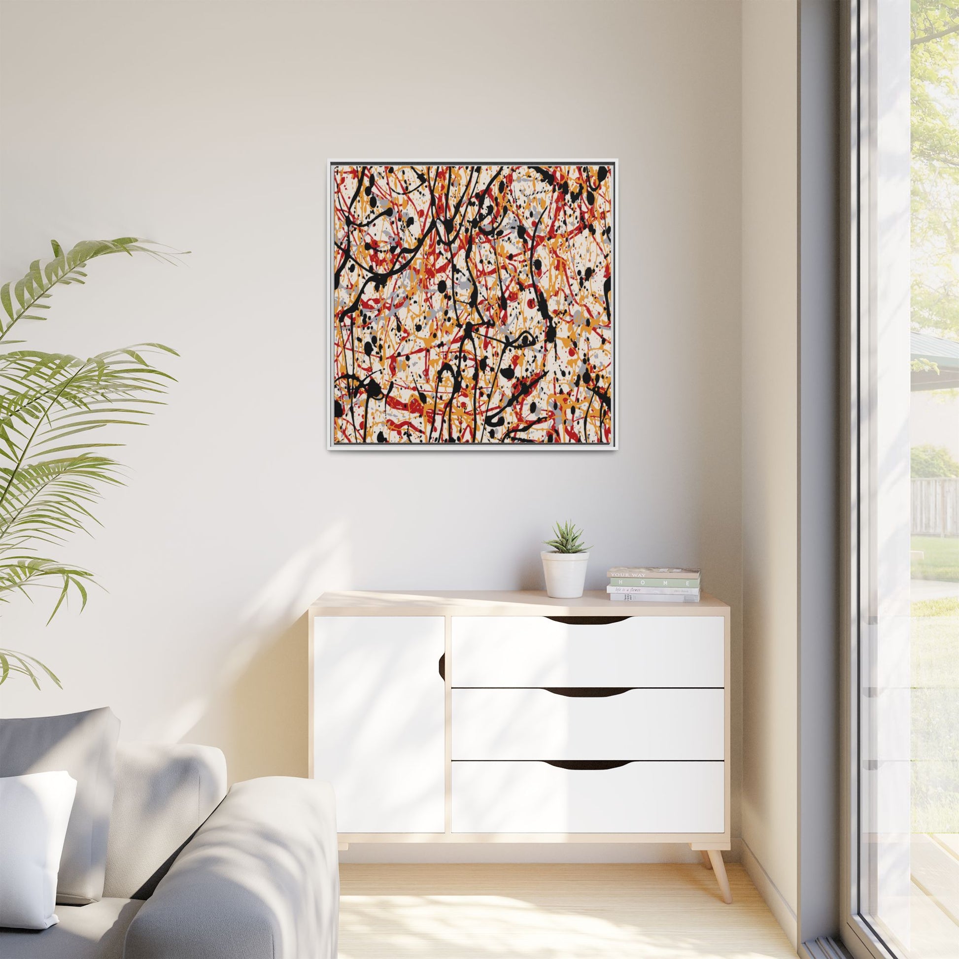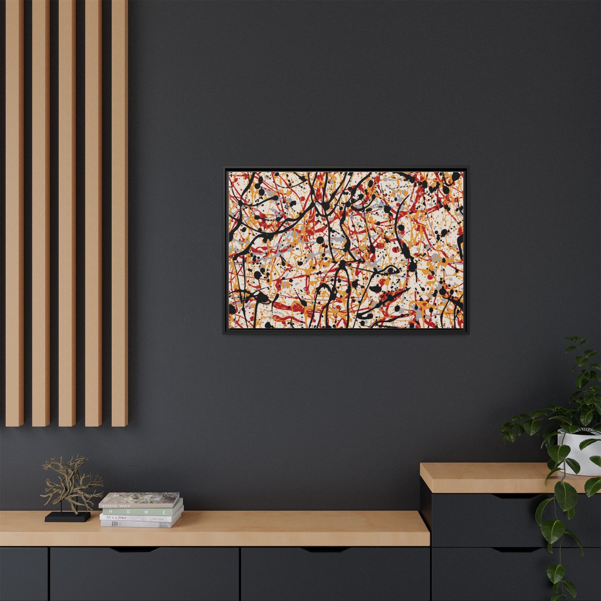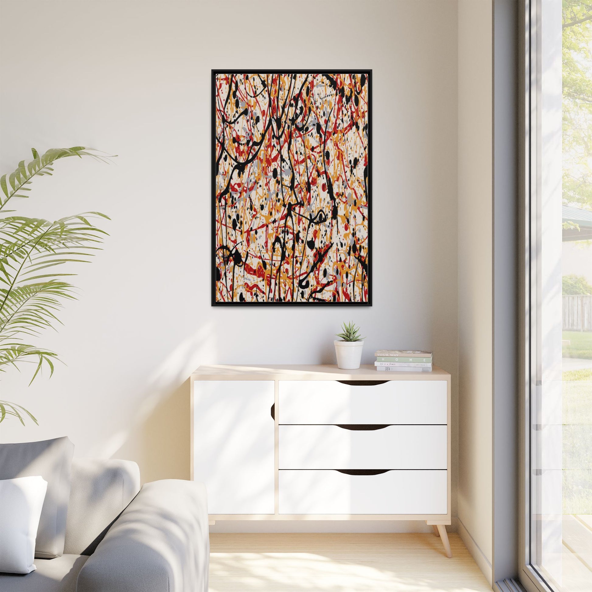 This dynamic abstract artwork showcases a vibrant Jackson Pollock-inspired drip painting technique, characterized by intricate layers of intertwining paint splatters and lines. The color palette consists of bold black, fiery red, warm yellow, and soft gray tones, creating a visually energetic and chaotic composition. Paint drips and splatters crisscross the canvas in multiple directions, forming a dense network of spontaneous and seemingly random marks that create a sense of movement and depth. The painting's style emphasizes action and emotional expression, with each color and line appearing to be applied with intense, gestural brushstrokes and techniques. The overall effect is a powerful, rhythmic abstract expressionist piece that invites viewers to explore its complex layers and find their own visual interpretations within the intricate pattern.