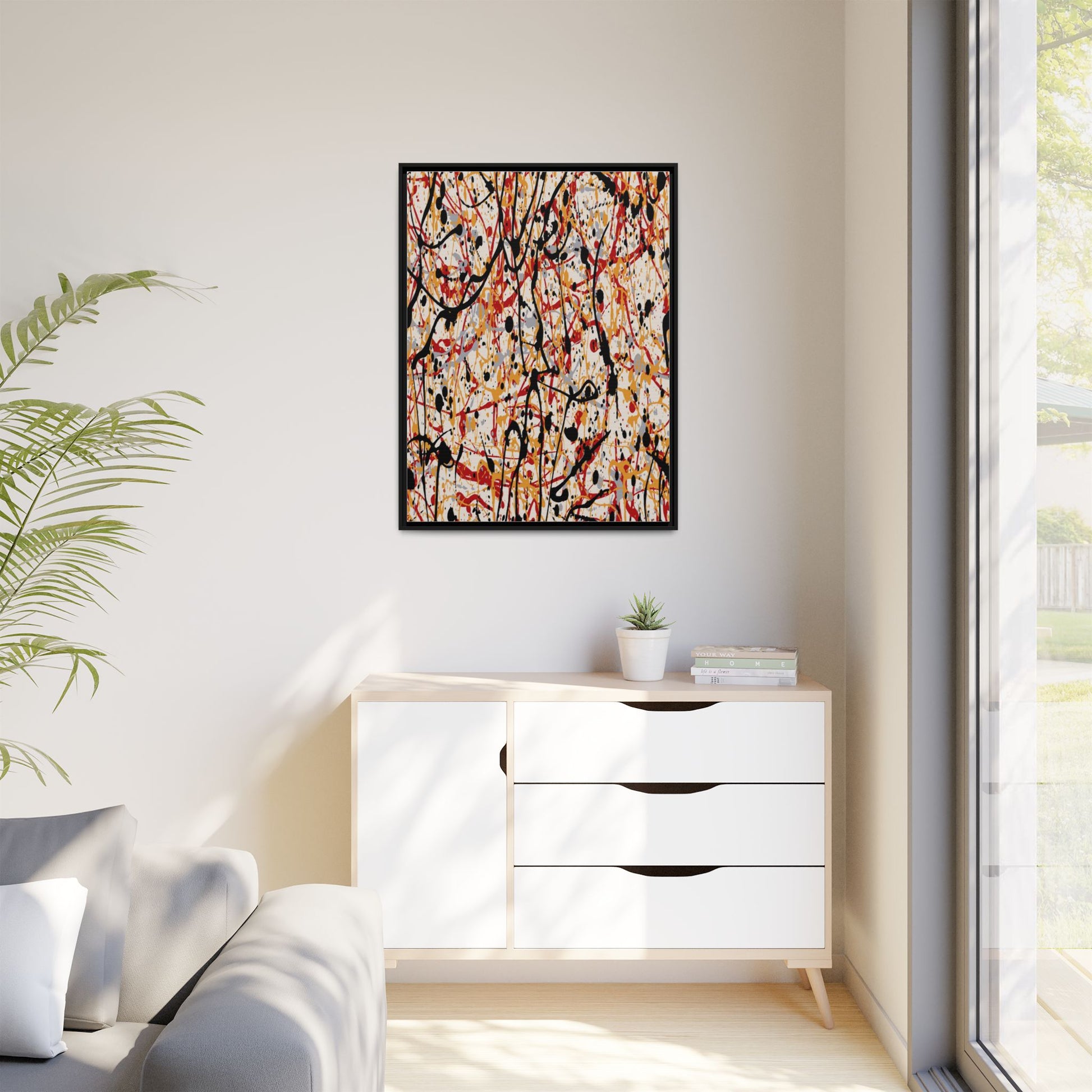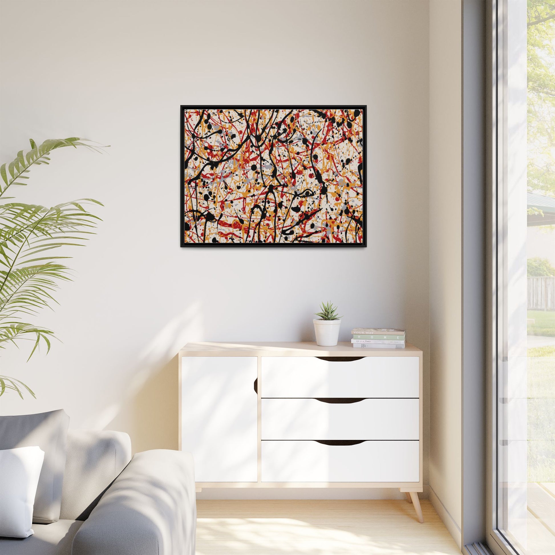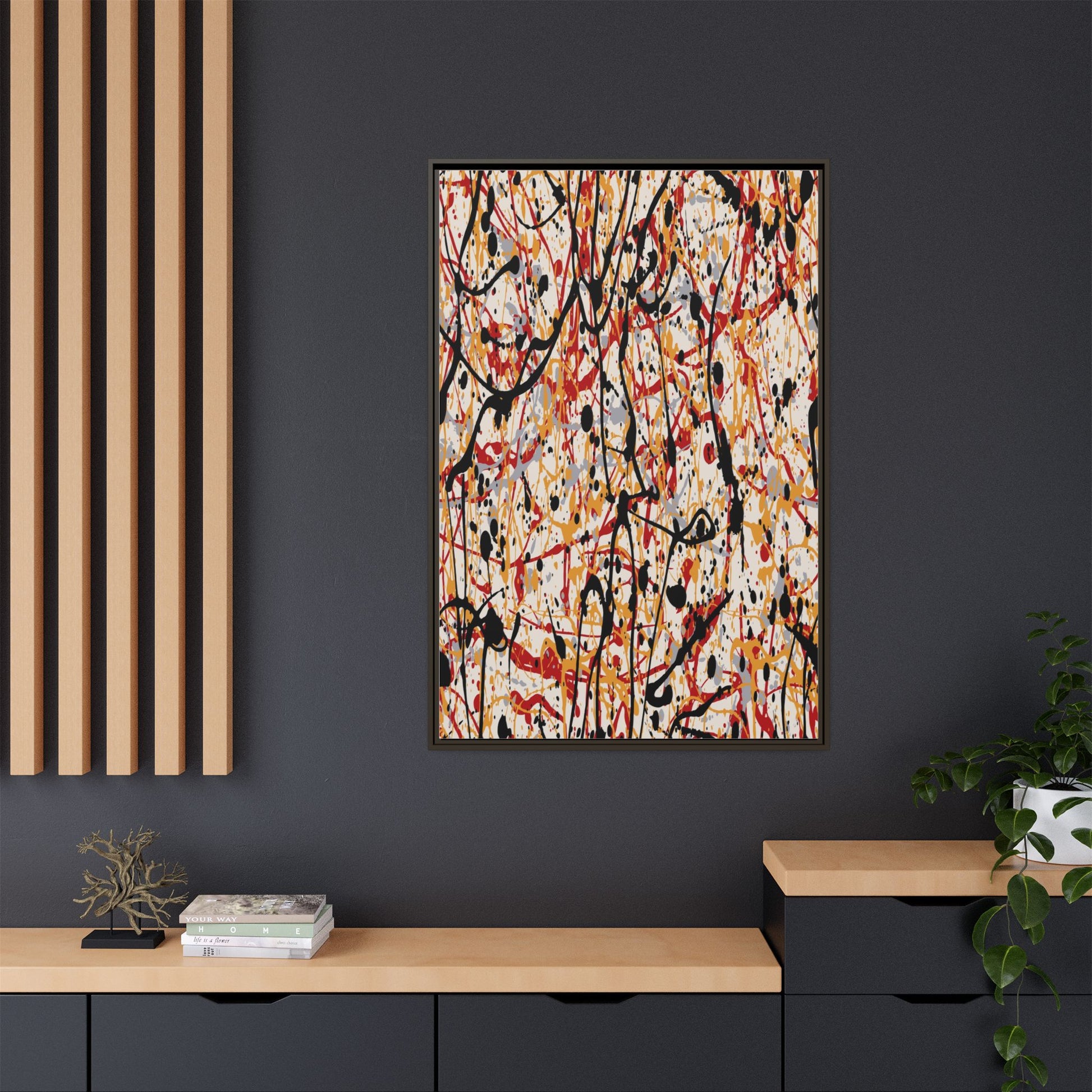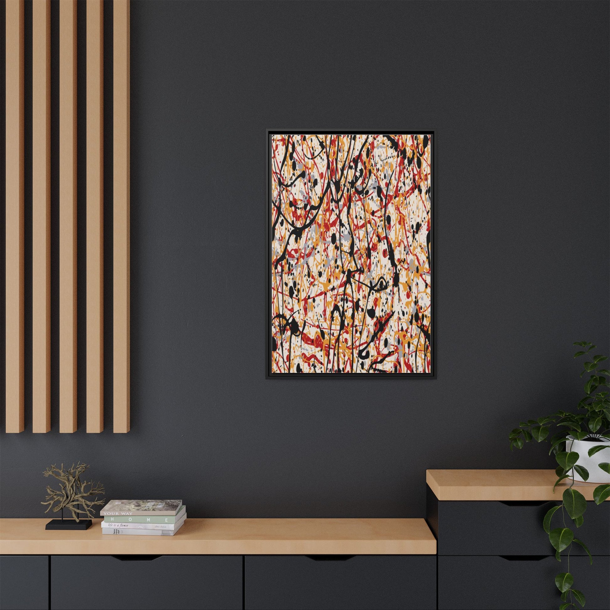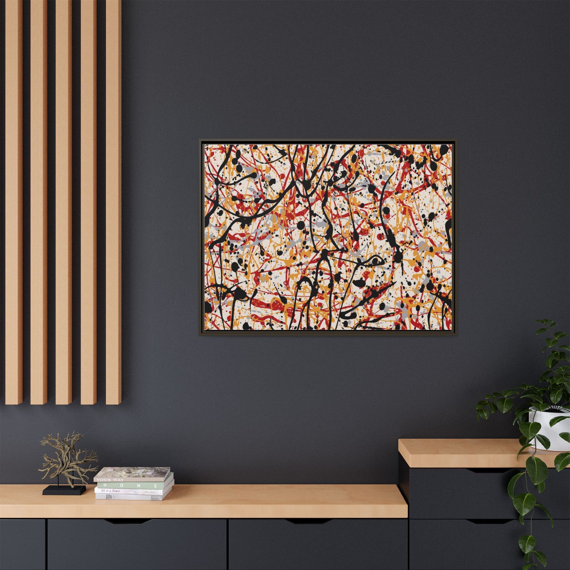 This dynamic abstract artwork showcases a vibrant Jackson Pollock-inspired drip painting technique, characterized by intricate layers of intertwining paint splatters and lines. The color palette consists of bold black, fiery red, warm yellow, and soft gray tones, creating a visually energetic and chaotic composition. Paint drips and splatters crisscross the canvas in multiple directions, forming a dense network of spontaneous and seemingly random marks that create a sense of movement and depth. The painting's style emphasizes action and emotional expression, with each color and line appearing to be applied with intense, gestural brushstrokes and techniques. The overall effect is a powerful, rhythmic abstract expressionist piece that invites viewers to explore its complex layers and find their own visual interpretations within the intricate pattern.