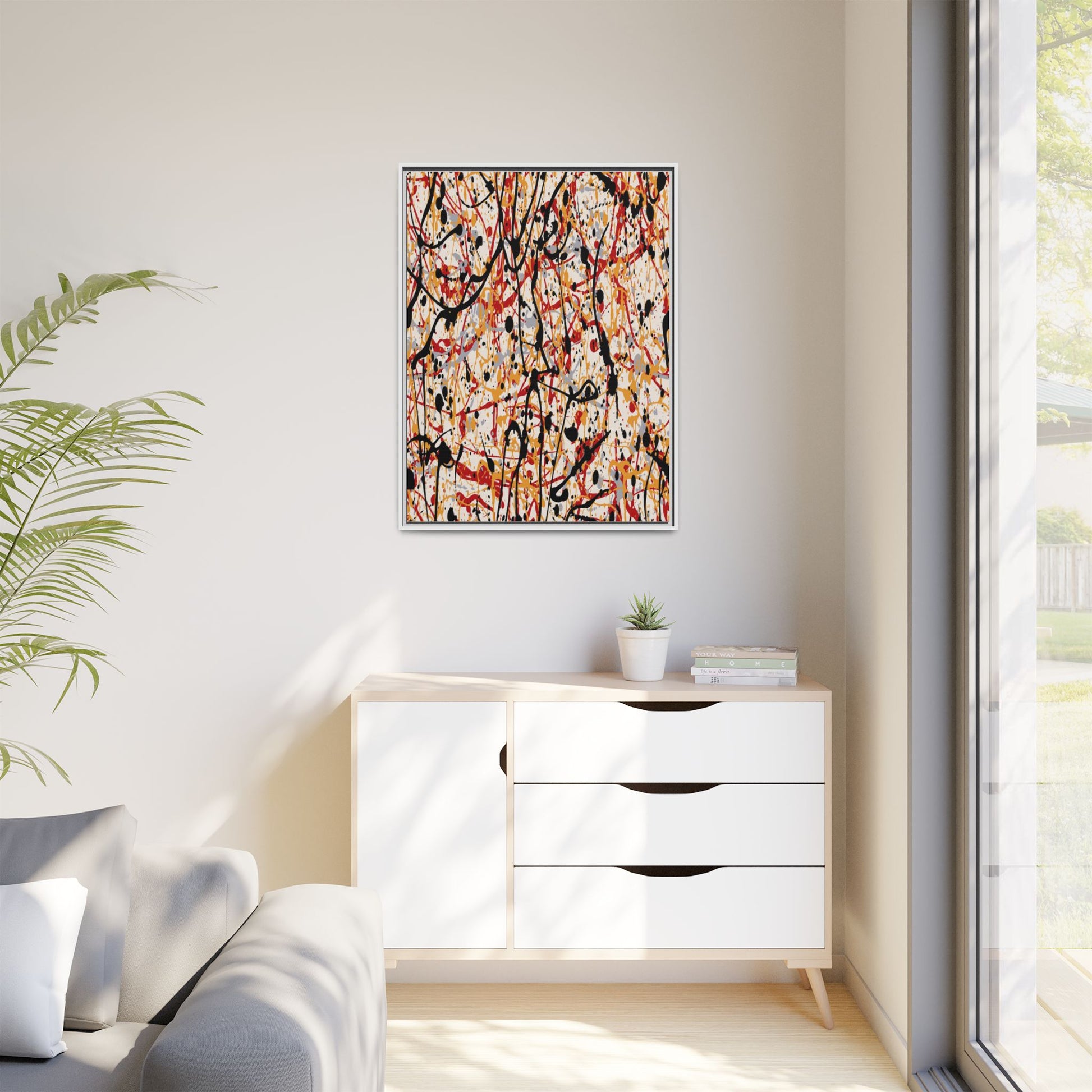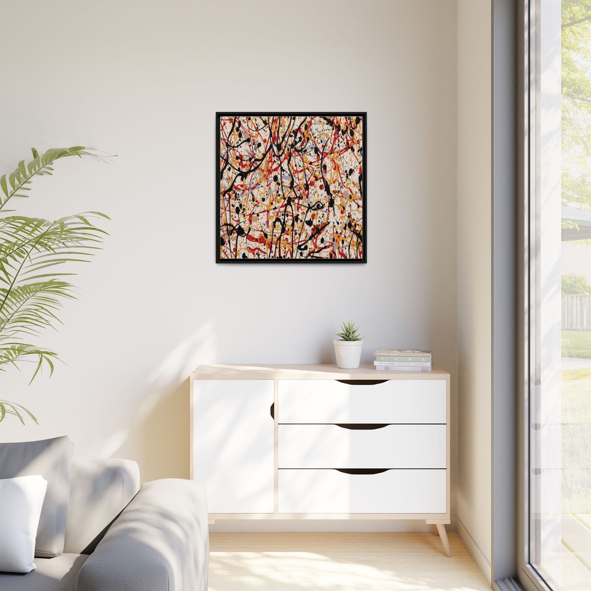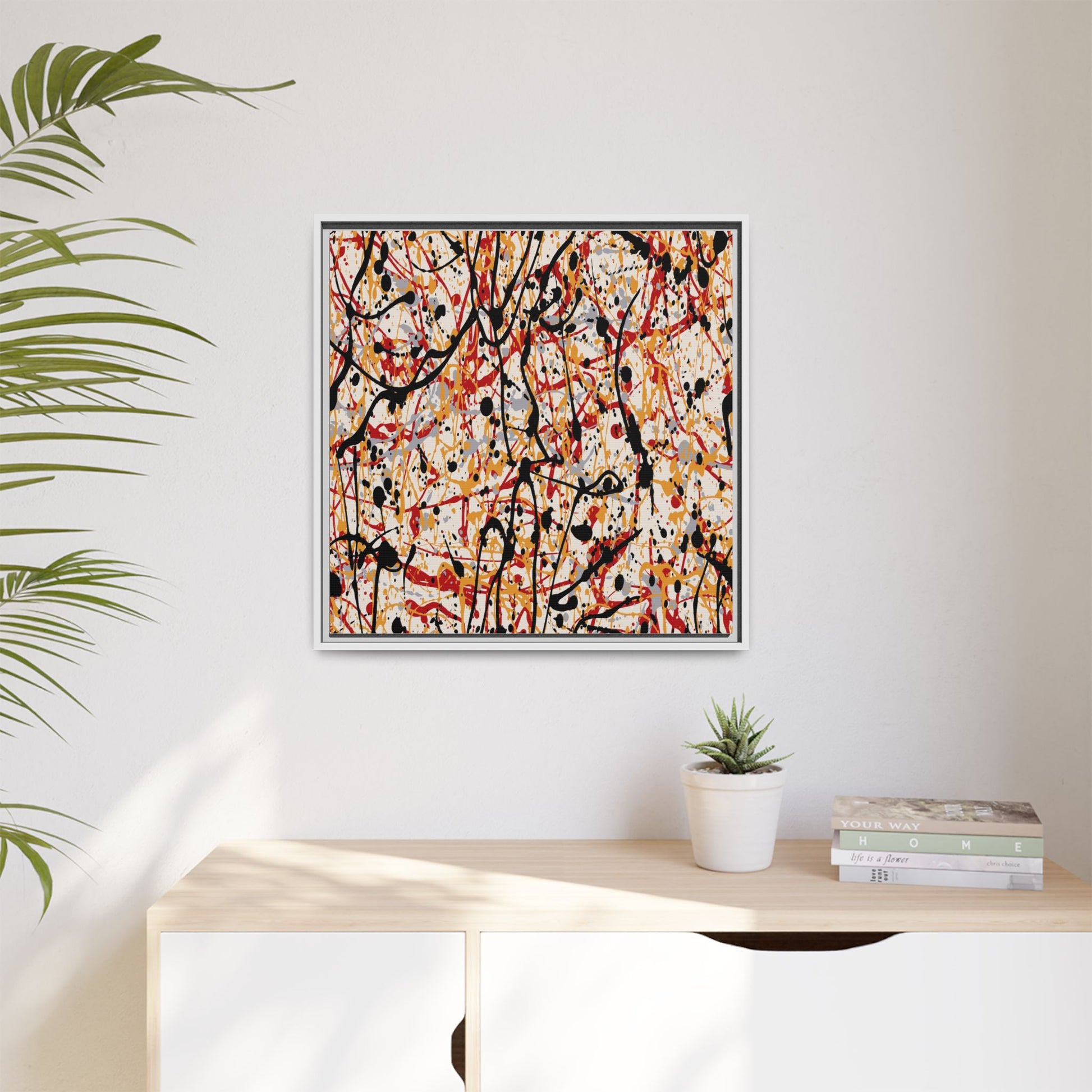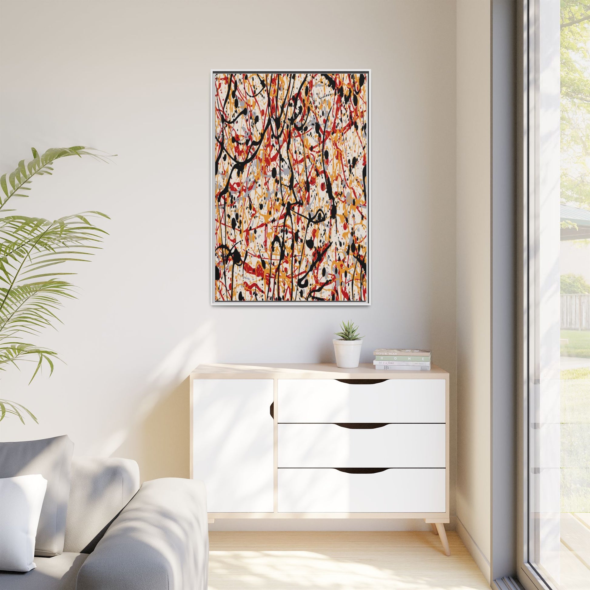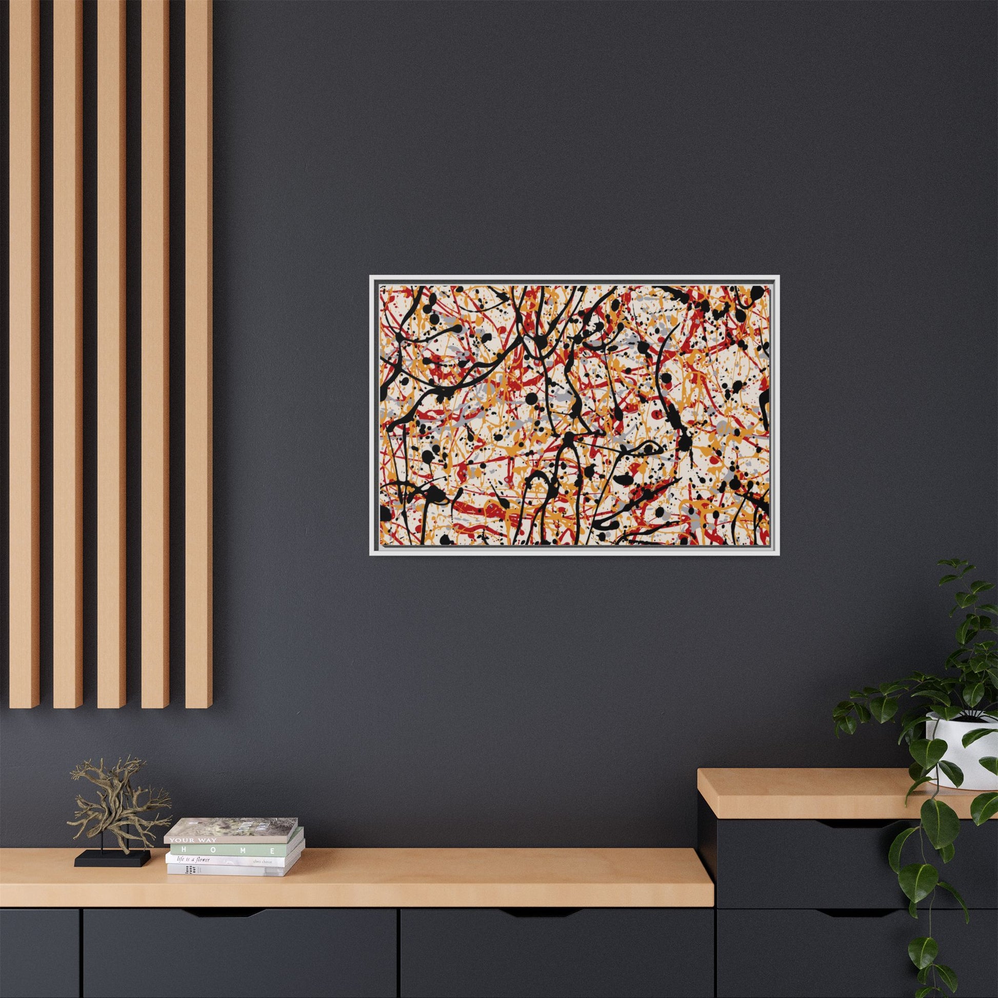 This dynamic abstract artwork showcases a vibrant Jackson Pollock-inspired drip painting technique, characterized by intricate layers of intertwining paint splatters and lines. The color palette consists of bold black, fiery red, warm yellow, and soft gray tones, creating a visually energetic and chaotic composition. Paint drips and splatters crisscross the canvas in multiple directions, forming a dense network of spontaneous and seemingly random marks that create a sense of movement and depth. The painting's style emphasizes action and emotional expression, with each color and line appearing to be applied with intense, gestural brushstrokes and techniques. The overall effect is a powerful, rhythmic abstract expressionist piece that invites viewers to explore its complex layers and find their own visual interpretations within the intricate pattern.