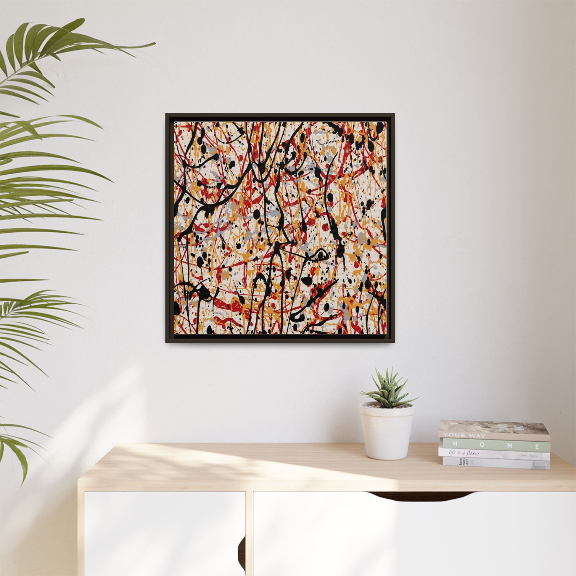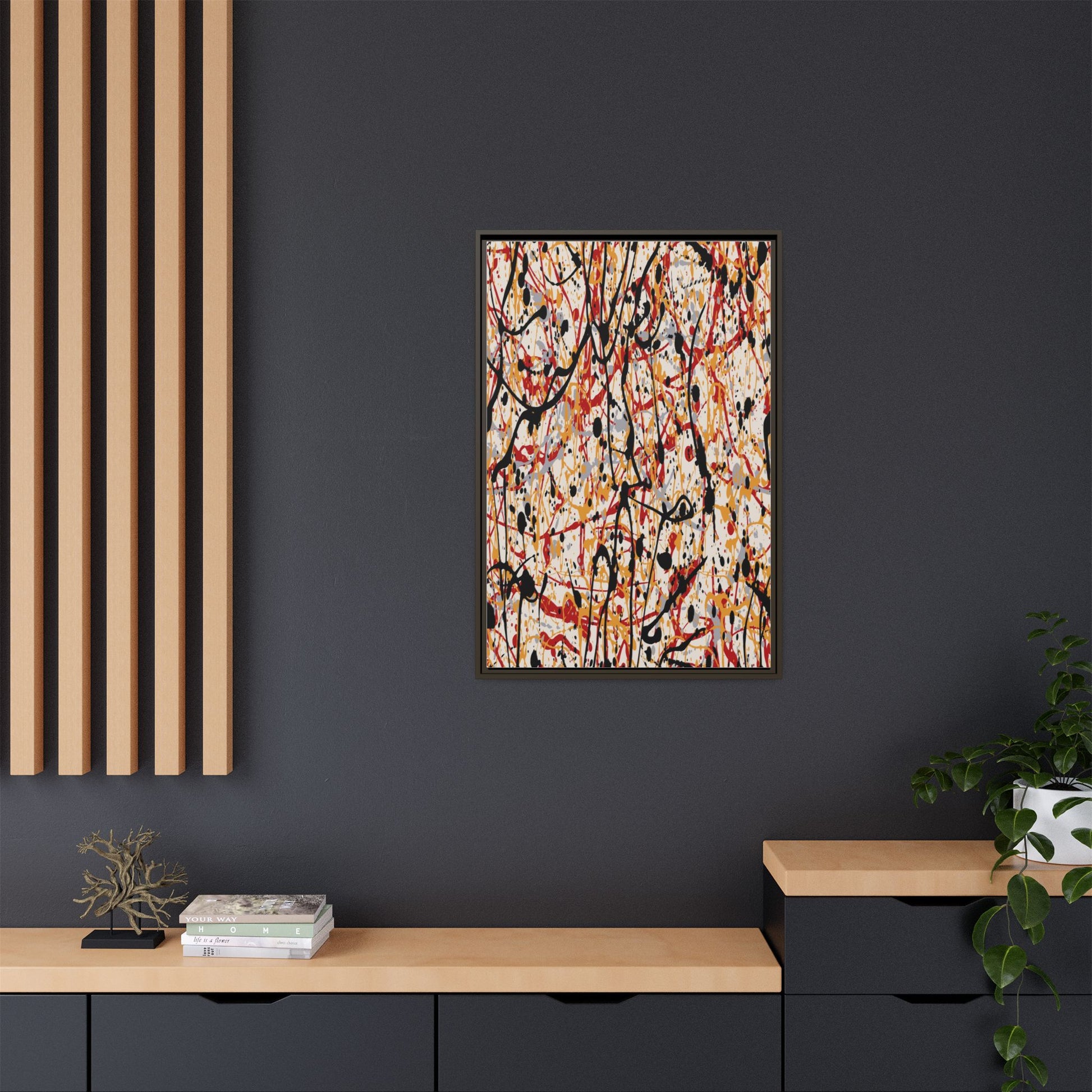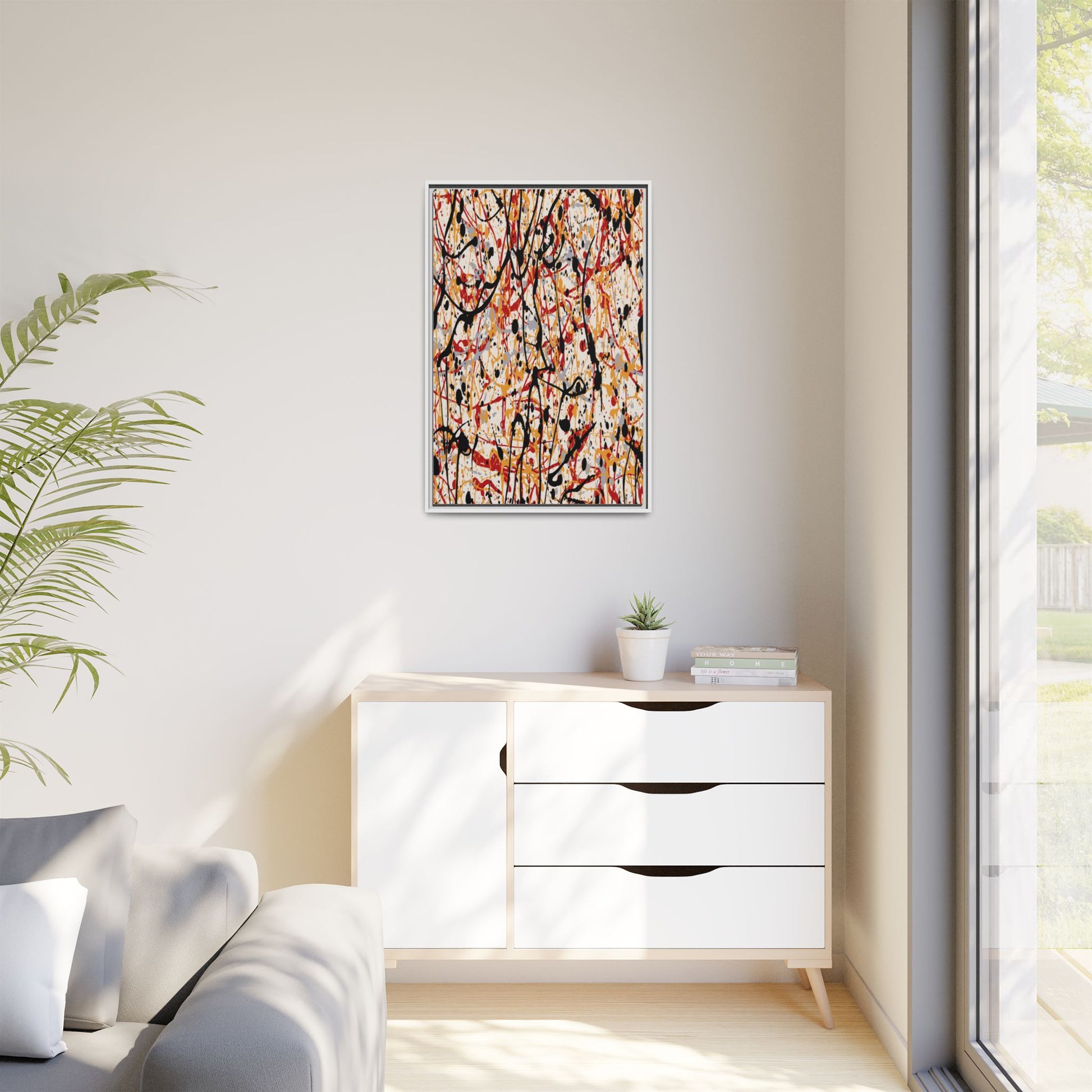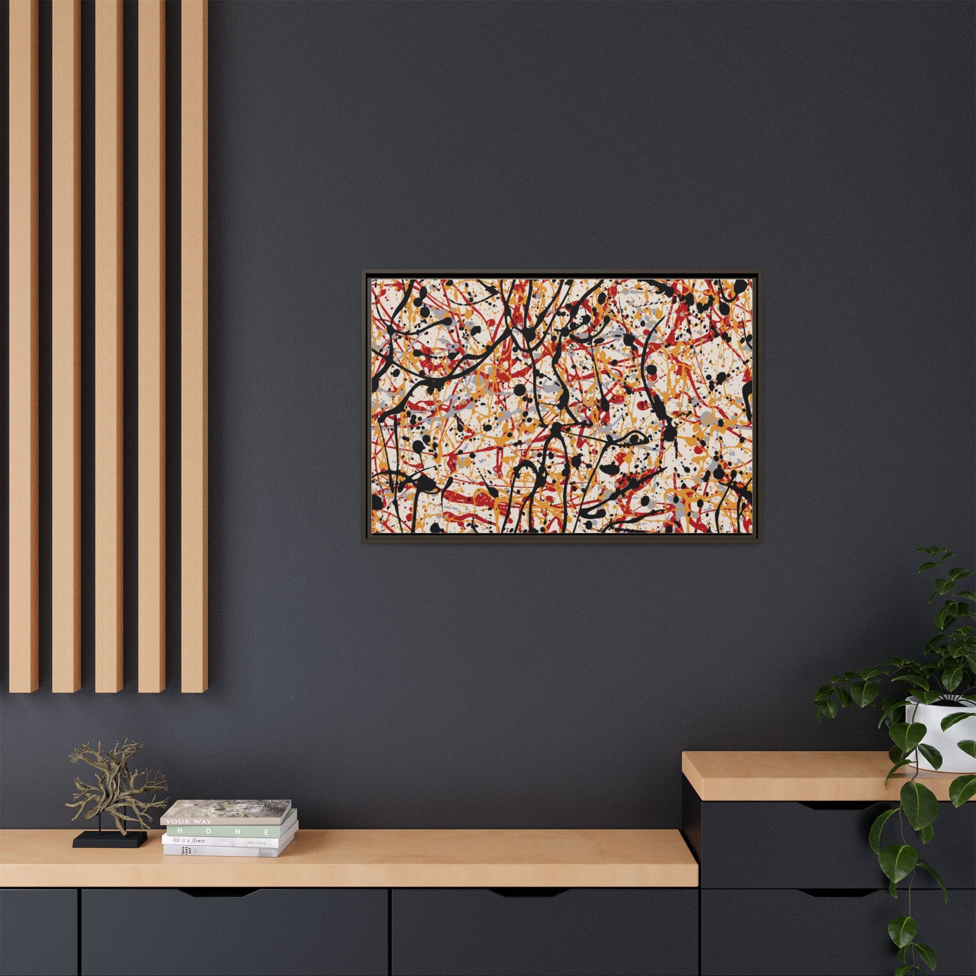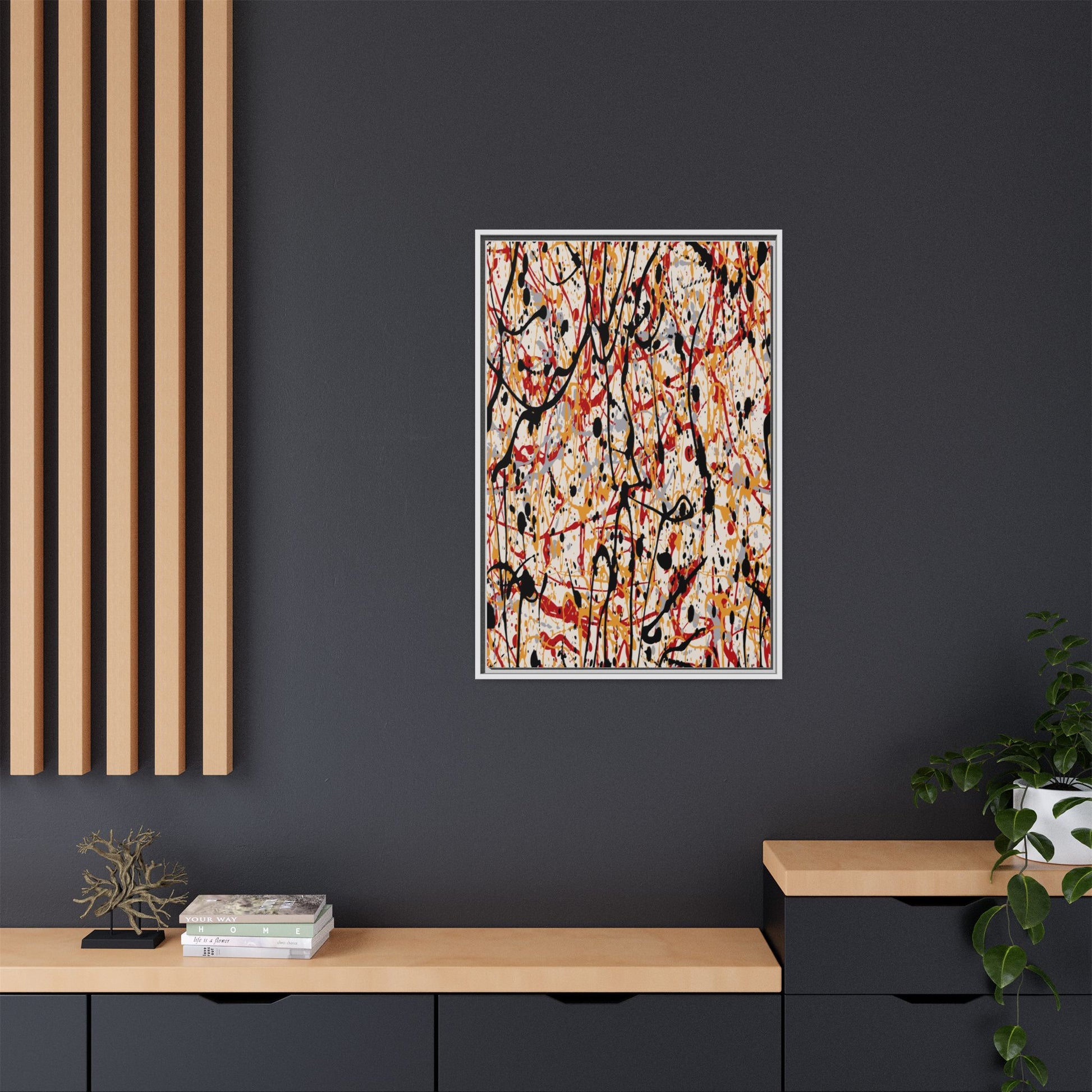 This dynamic abstract artwork showcases a vibrant Jackson Pollock-inspired drip painting technique, characterized by intricate layers of intertwining paint splatters and lines. The color palette consists of bold black, fiery red, warm yellow, and soft gray tones, creating a visually energetic and chaotic composition. Paint drips and splatters crisscross the canvas in multiple directions, forming a dense network of spontaneous and seemingly random marks that create a sense of movement and depth. The painting's style emphasizes action and emotional expression, with each color and line appearing to be applied with intense, gestural brushstrokes and techniques. The overall effect is a powerful, rhythmic abstract expressionist piece that invites viewers to explore its complex layers and find their own visual interpretations within the intricate pattern.