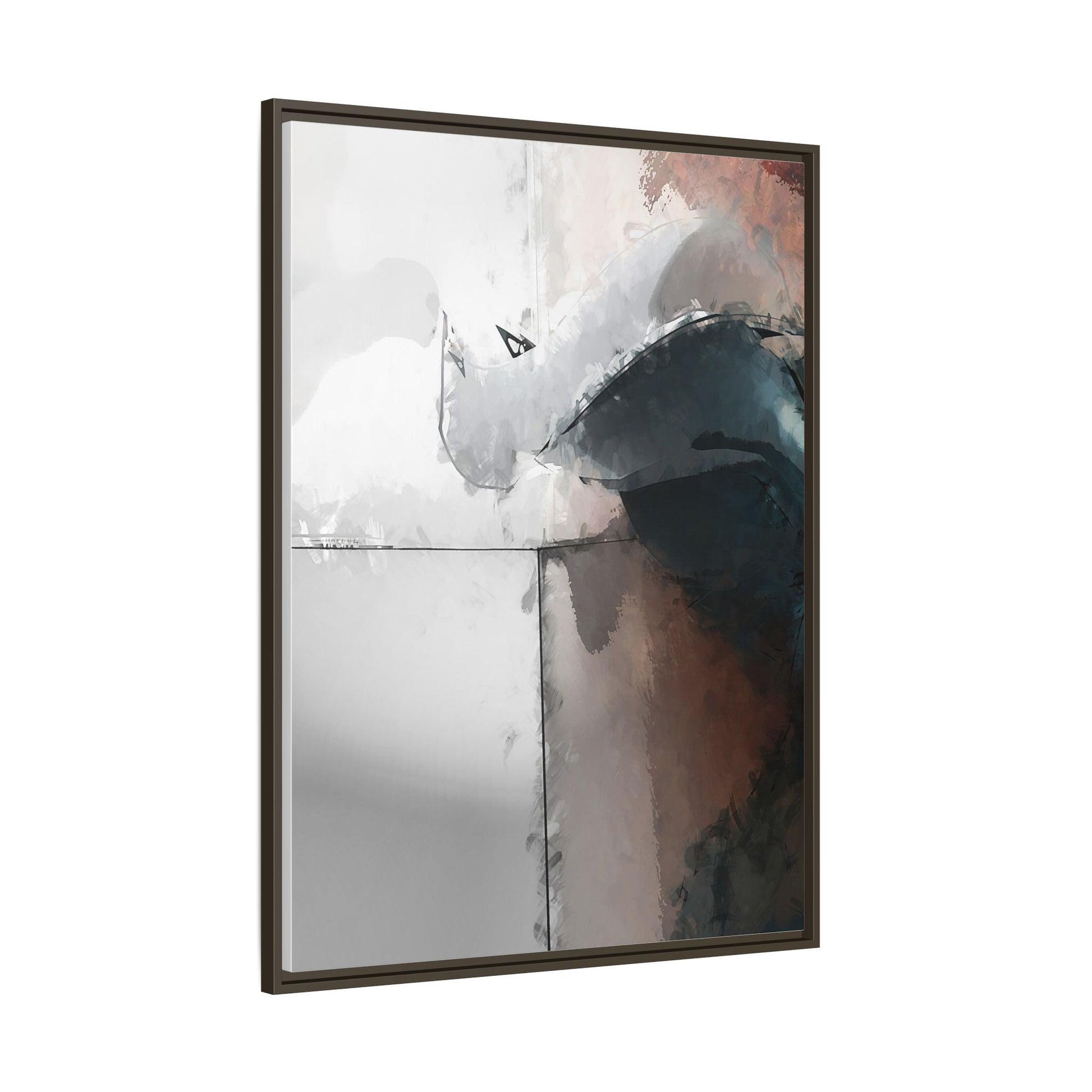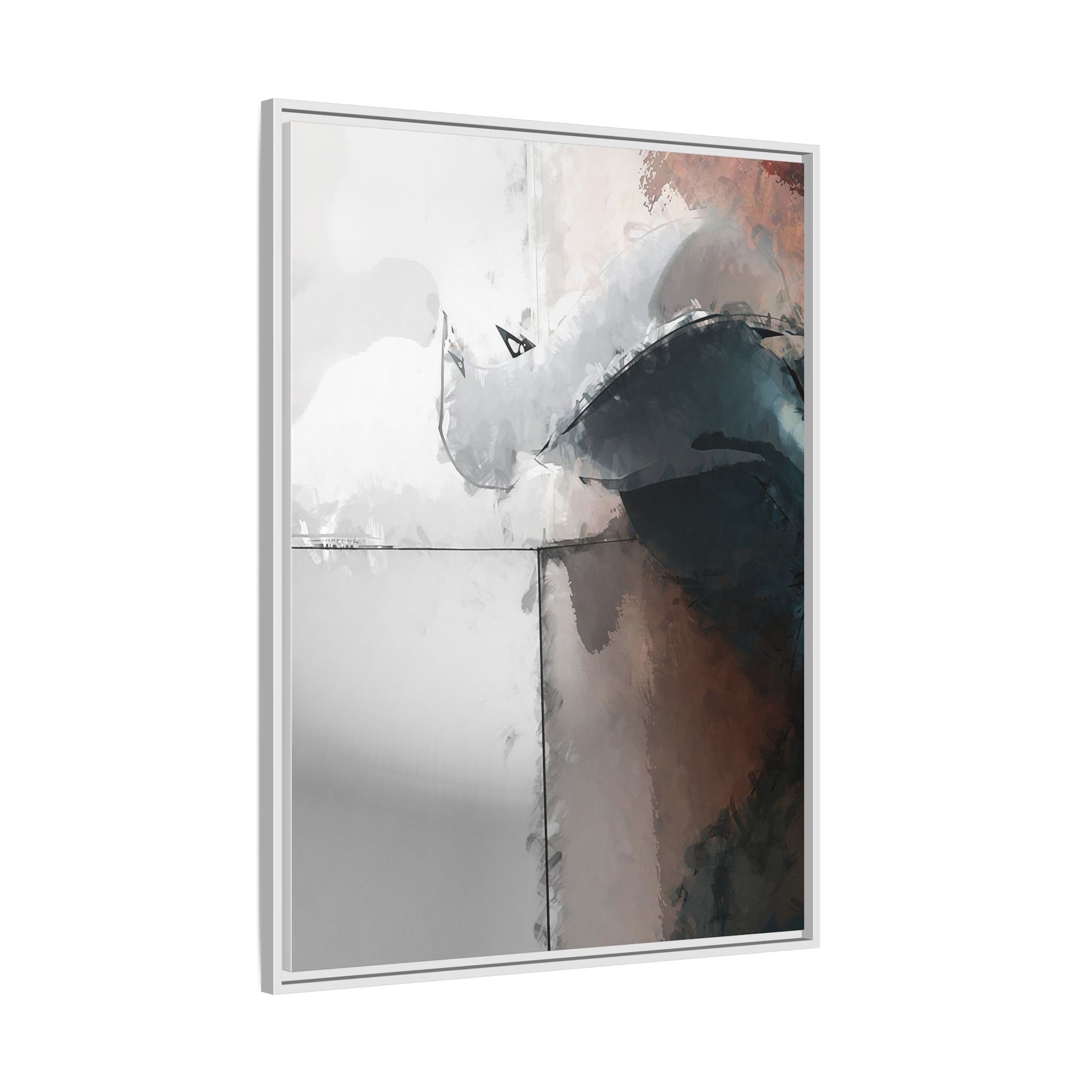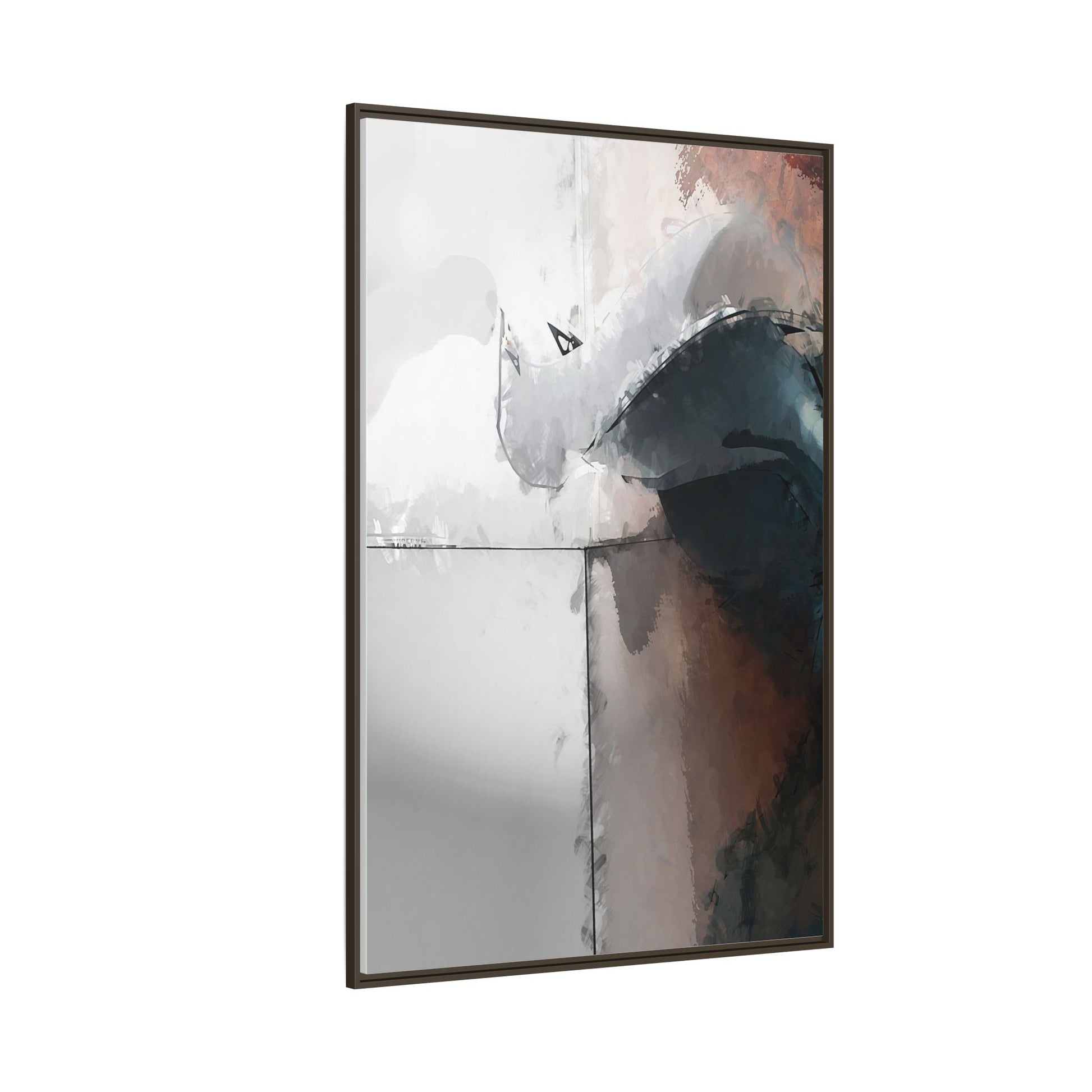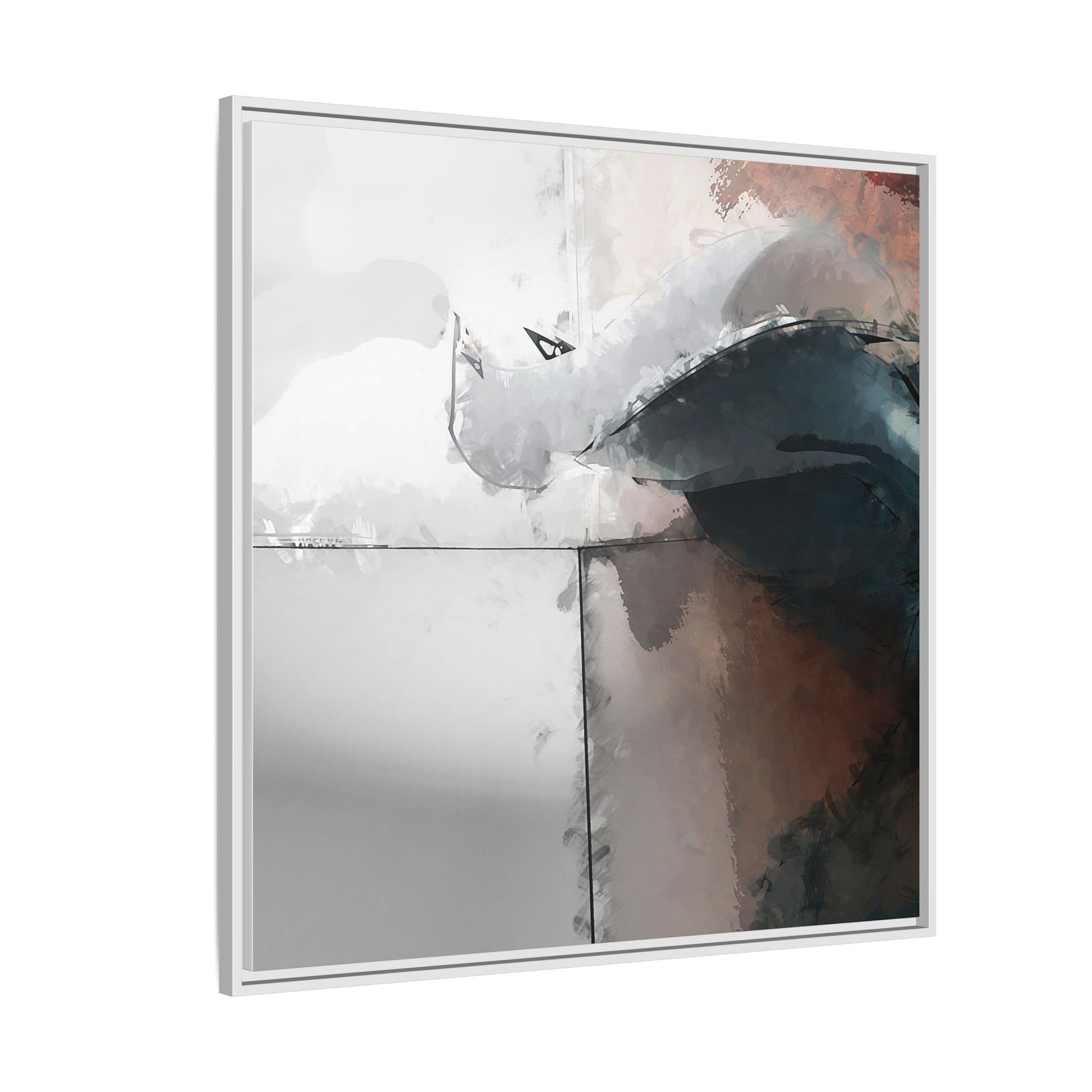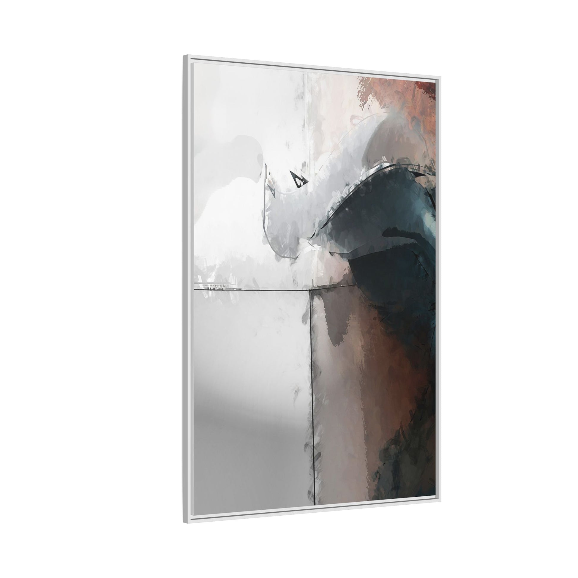 This abstract digital artwork features a minimalist, geometric composition with soft, blended colors ranging from cool grays to warm earth tones. The image is divided by sharp vertical lines, creating a segmented visual landscape with an ethereal, dreamlike quality. Subtle brushstrokes and watercolor-like textures give the piece a fluid, organic feel despite its angular structure. Darker blue-gray shapes dominate the lower right portion of the image, creating a sense of depth and contrast against the lighter background. The overall style suggests a modern, conceptual approach to digital painting, blending architectural elements with abstract expressionism.